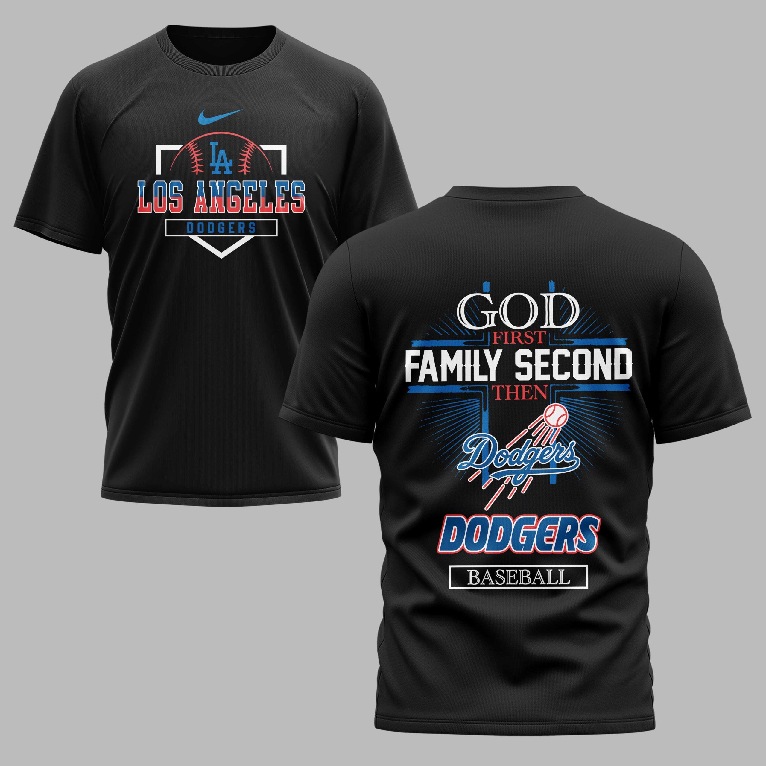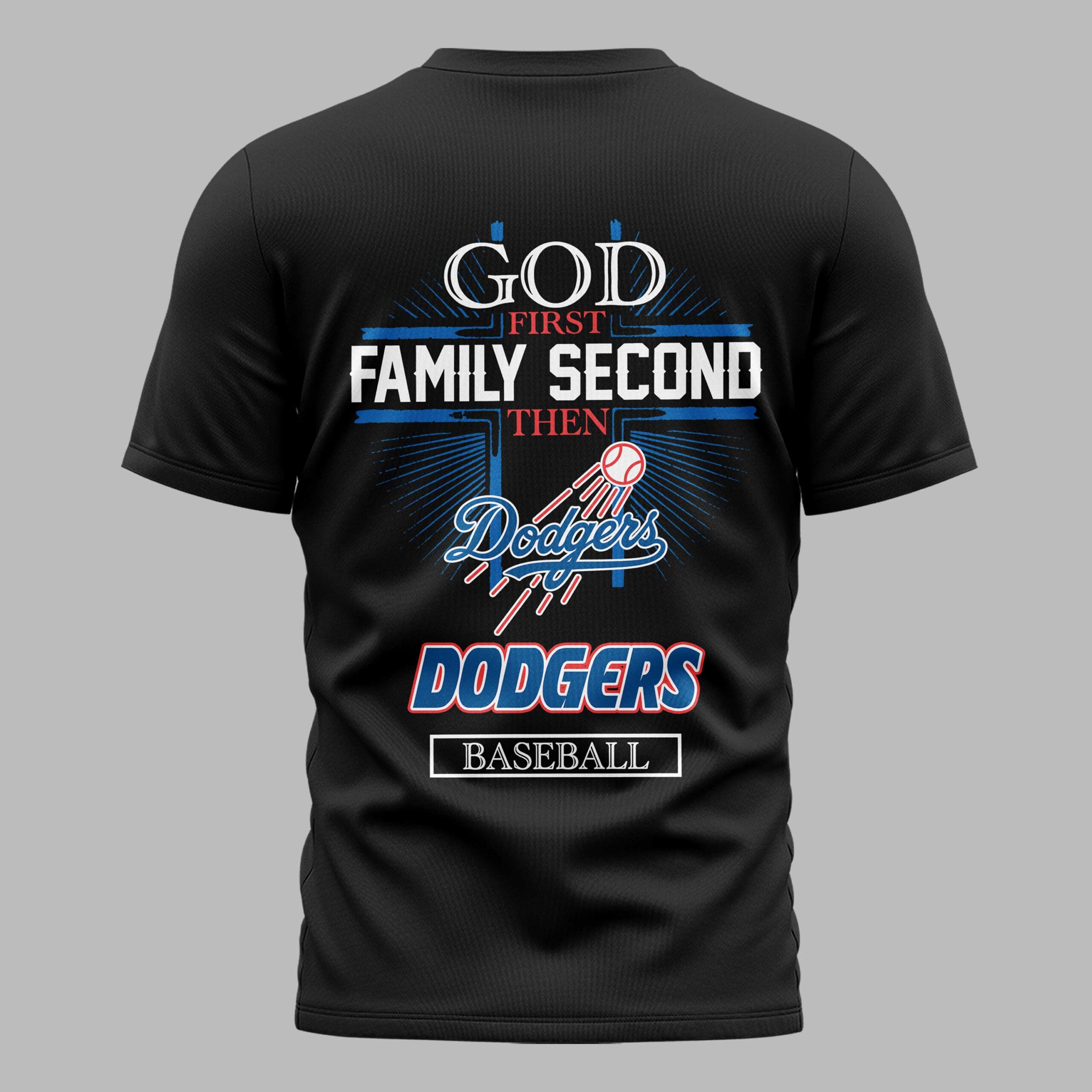 Show off your loyalty to the Boys in Blue while celebrating the American spirit with this striking Los Angeles Dodgers tee. This design perfectly blends your passion for the game with a patriotic red, white, and blue aesthetic, making it a standout piece for any dedicated fan. It’s the ultimate tribute to the core values that define the American pastime. The front features a bold LA logo anchored by a detailed baseball graphic with LOS ANGELES prominently displayed in vibrant, multi-layered lettering. On the back, the shirt makes a powerful statement of priorities with the text God First, Family Second, Then Dodgers Baseball. This meaningful graphic includes a subtle cross, a flying baseball, and the iconic Dodgers script for a cohesive look. Perfect for game days at the ballpark, Independence Day celebrations, or casual everyday wear, this shirt lets you represent your team and your values with pride. It’s a must-have for any fan who puts faith and family alongside their love for baseball.