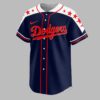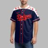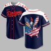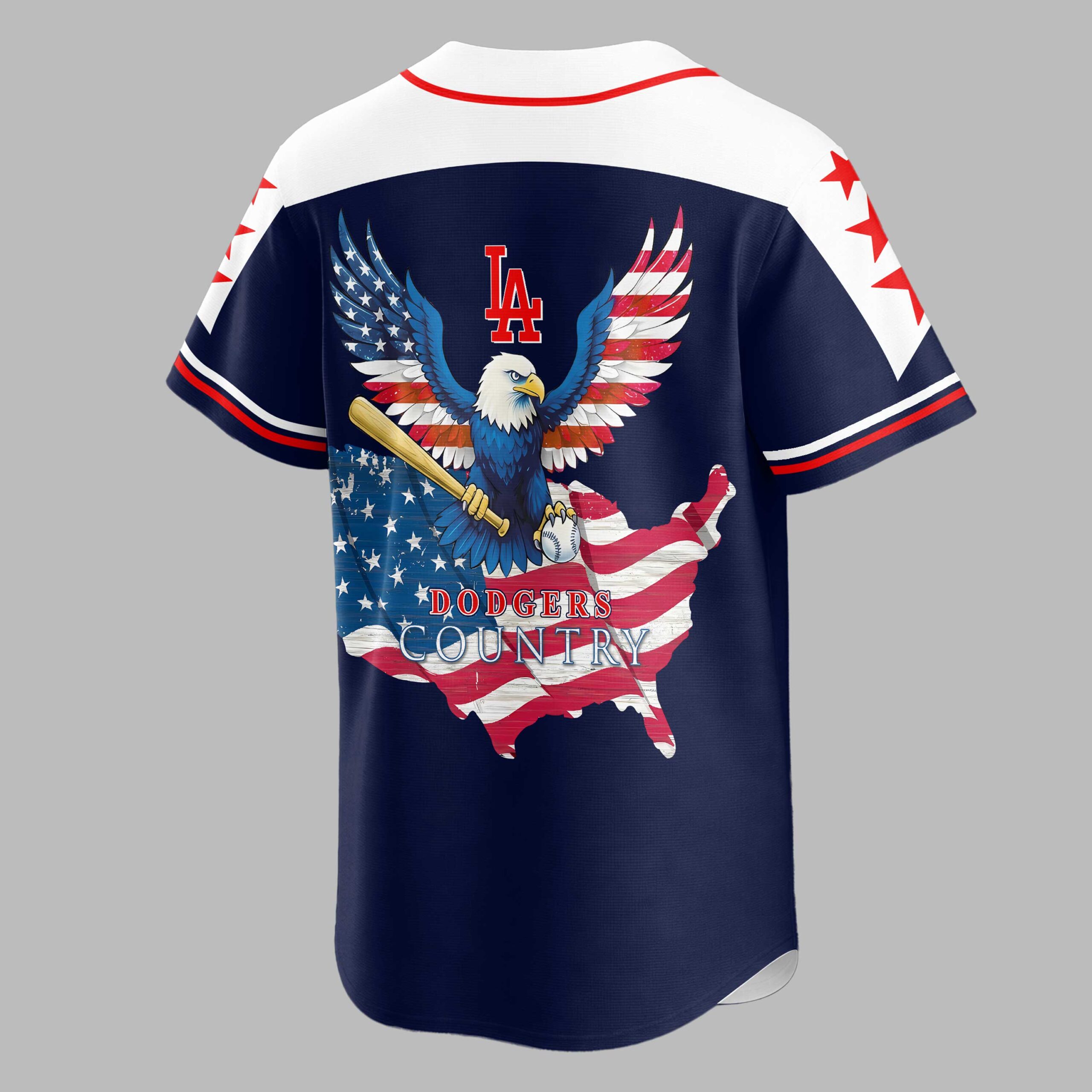 Show your unwavering Dodgers pride with a powerful display of patriotism! This unique jersey celebrates your favorite team and the USA, perfect for fans who live and breathe baseball with American spirit. Stand out in the crowd and let everyone know you’re a true fan of Dodgers Country. The front features the iconic Dodgers script in bold red with a crisp white outline, while the shoulders are adorned with vibrant red stars on a clean white panel. The back showcases a stunning graphic of a majestic bald eagle with American flag wings, clutching a baseball bat and ball. This powerful symbol is set against a distressed map of the USA, beautifully rendered in stars and stripes, with LA and DODGERS COUNTRY proudly displayed. Whether you’re cheering from the stands at Dodger Stadium, hosting a game day BBQ, celebrating national holidays like the Fourth of July, or simply showing off your team spirit around town, this jersey is a grand slam. It’s the perfect gear for any dedicated fan ready to represent their team and country.
