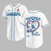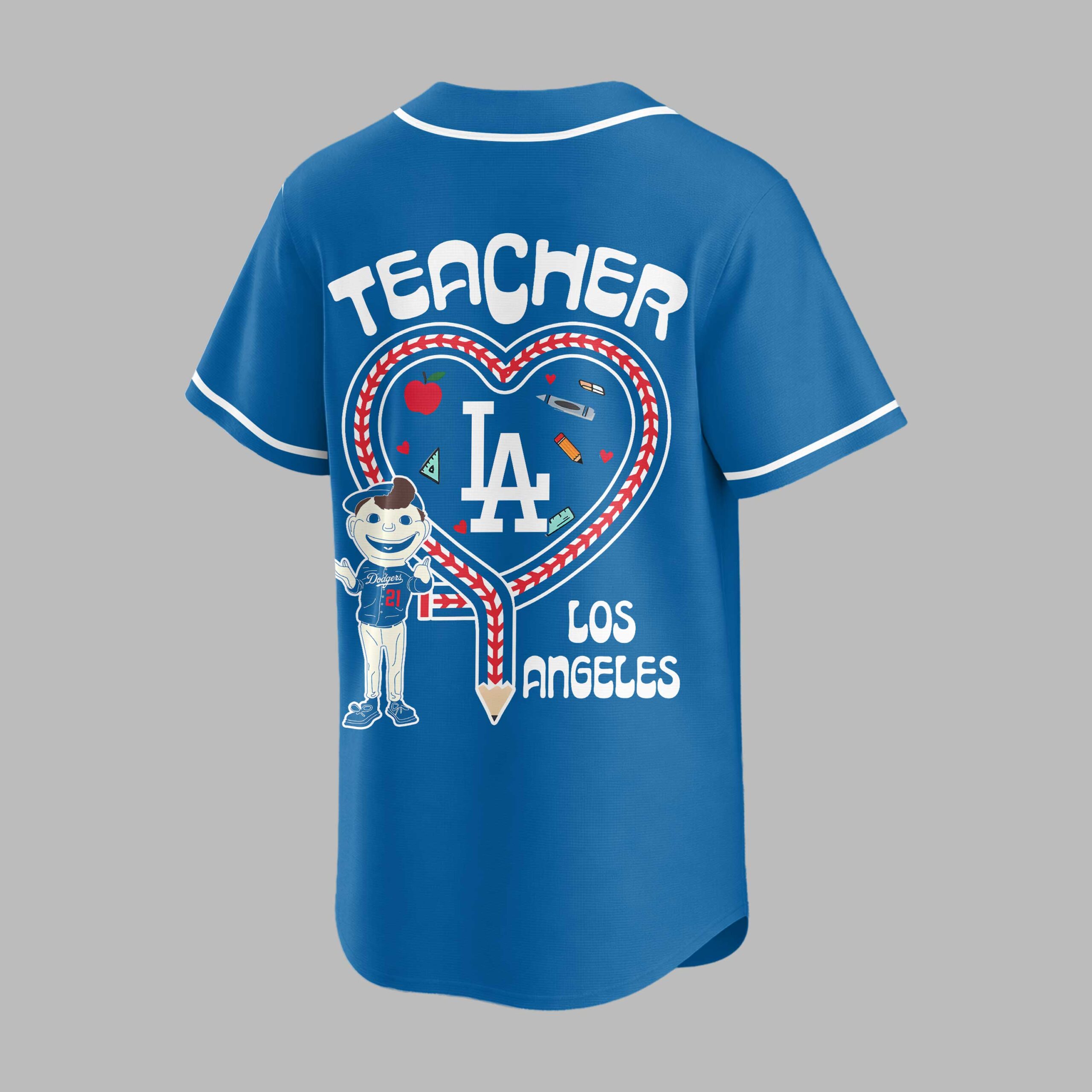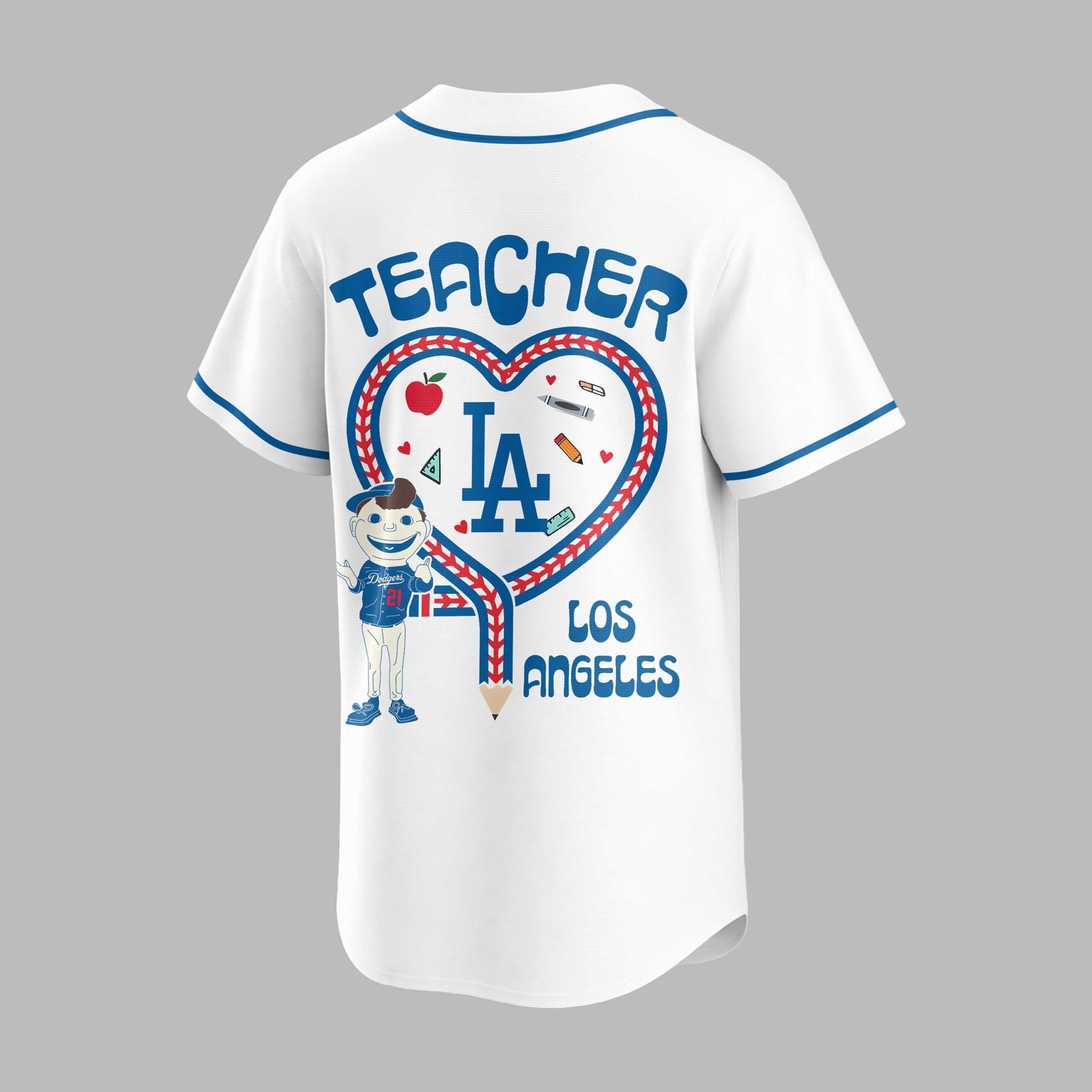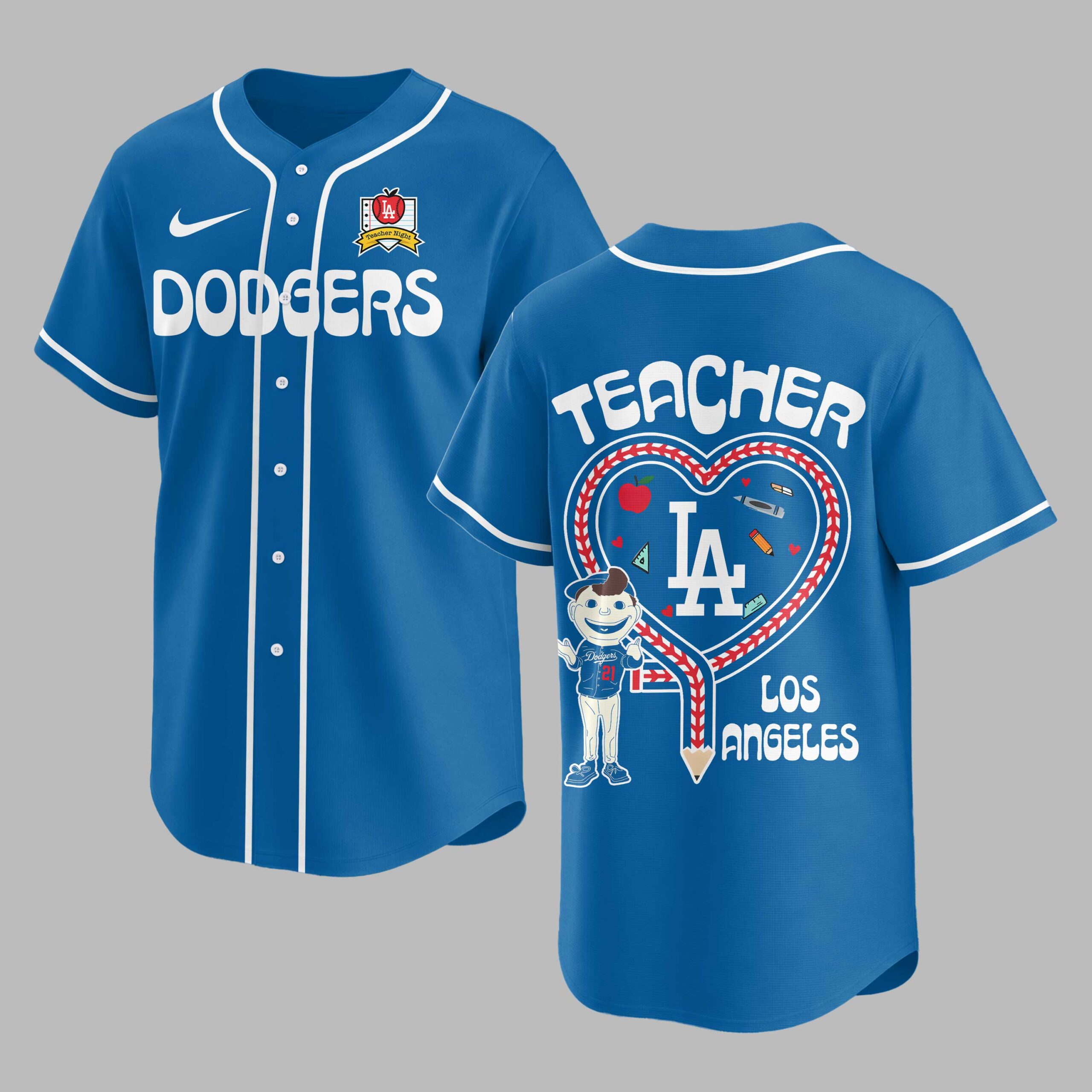Celebrate your love for the Los Angeles Dodgers and your dedication to education with this unique Teacher Night fan jersey! It’s the perfect way for every teaching professional to showcase their team spirit and pride in the city of Los Angeles, blending the excitement of baseball with the invaluable work of teachers. The front proudly displays DODGERS in classic blue lettering, accented by a special Teacher Night emblem featuring a red apple with the iconic LA logo. The back is a true tribute, with TEACHER boldly emblazoned above a heart-shaped design crafted from baseball stitching. Inside the heart, you’ll find the LA logo surrounded by charming school supplies like an apple, ruler, crayon, and pencil, all watched over by a friendly Dodgers mascot. Below, LOS ANGELES reinforces your local loyalty. Whether you’re cheering from the stands at Dodger Stadium, leading your classroom, or enjoying a casual day out, this jersey is designed for the ultimate fan-educator. It’s an ideal choice for Teacher Appreciation Week, game days, or simply demonstrating your dual passion for the Dodgers and making a difference in the lives of students.