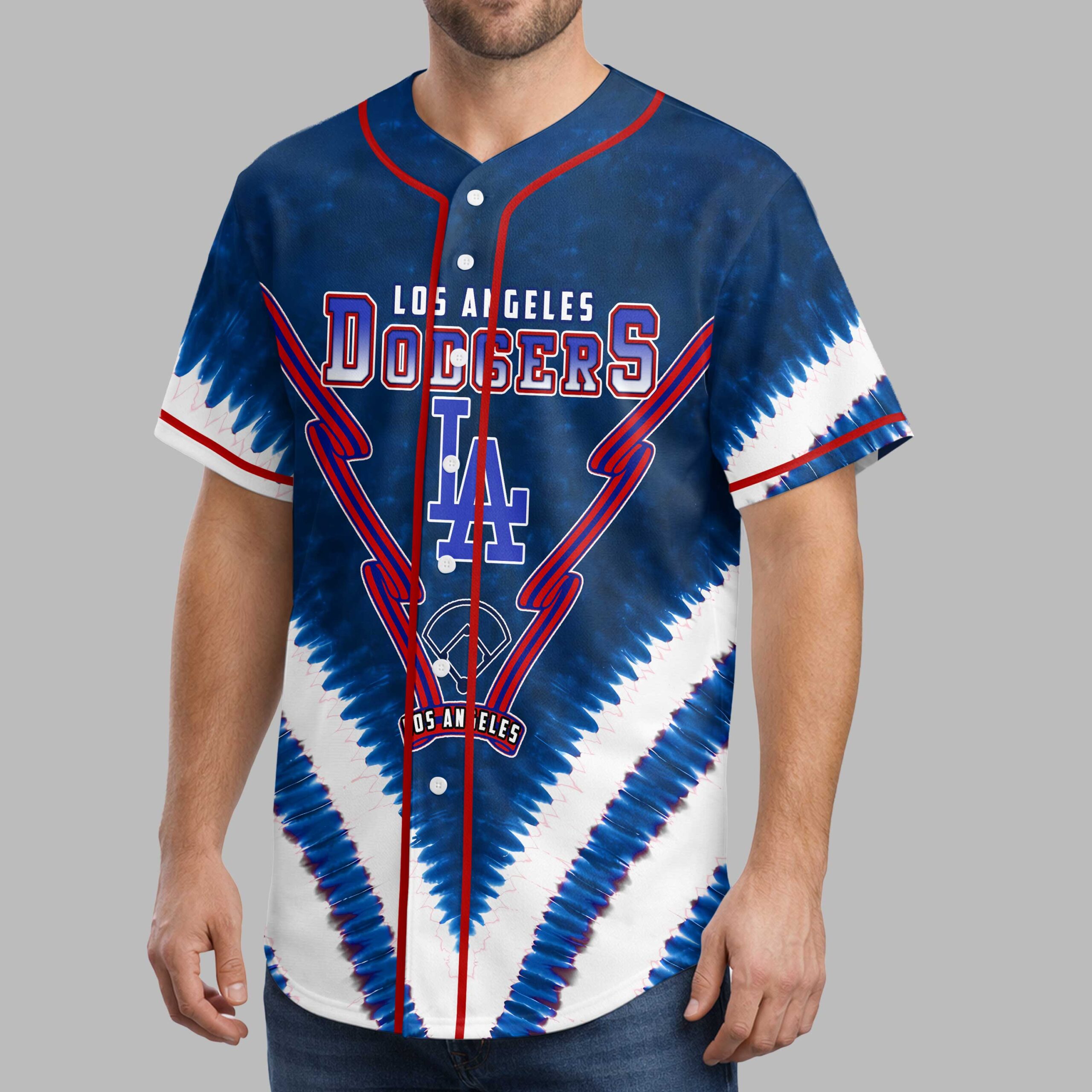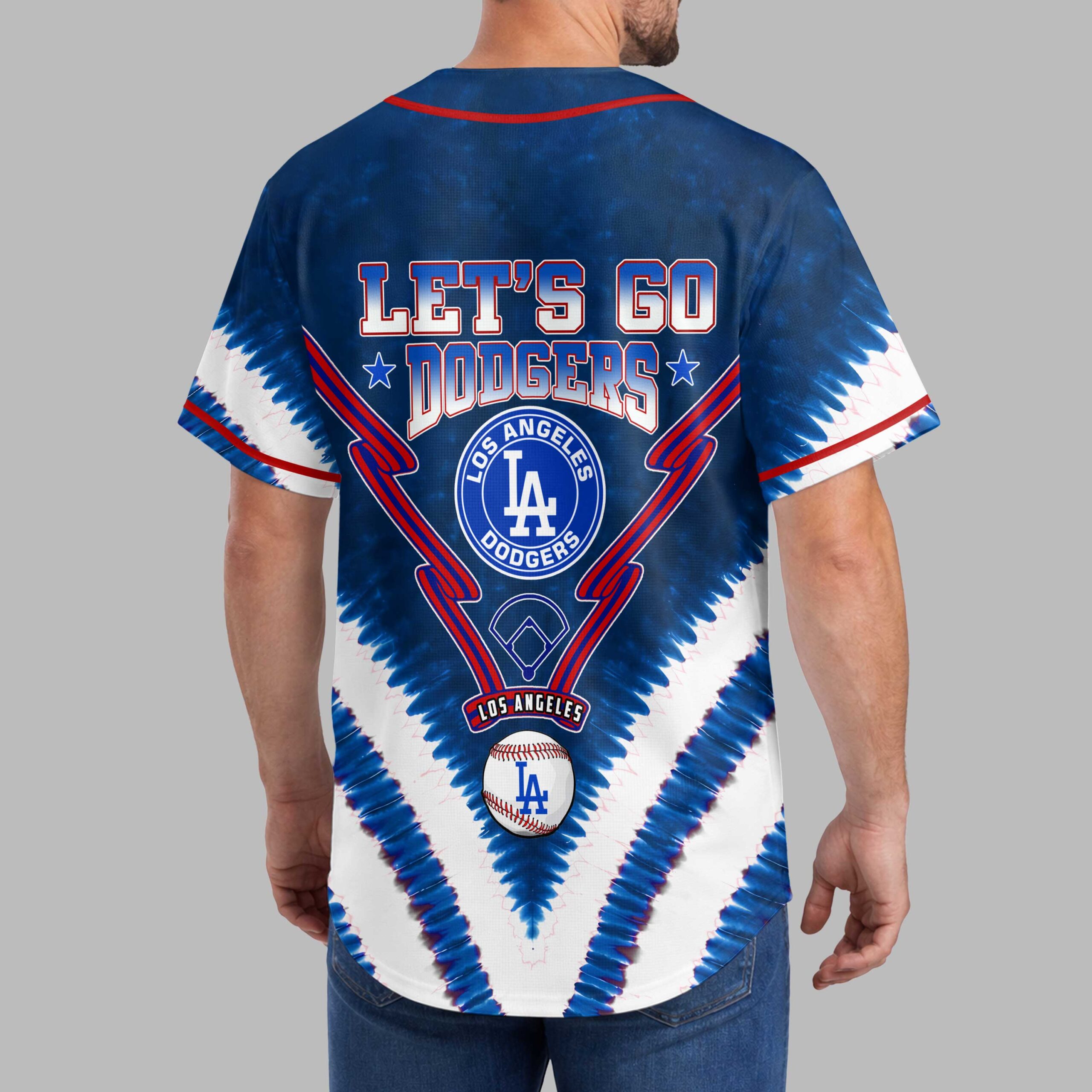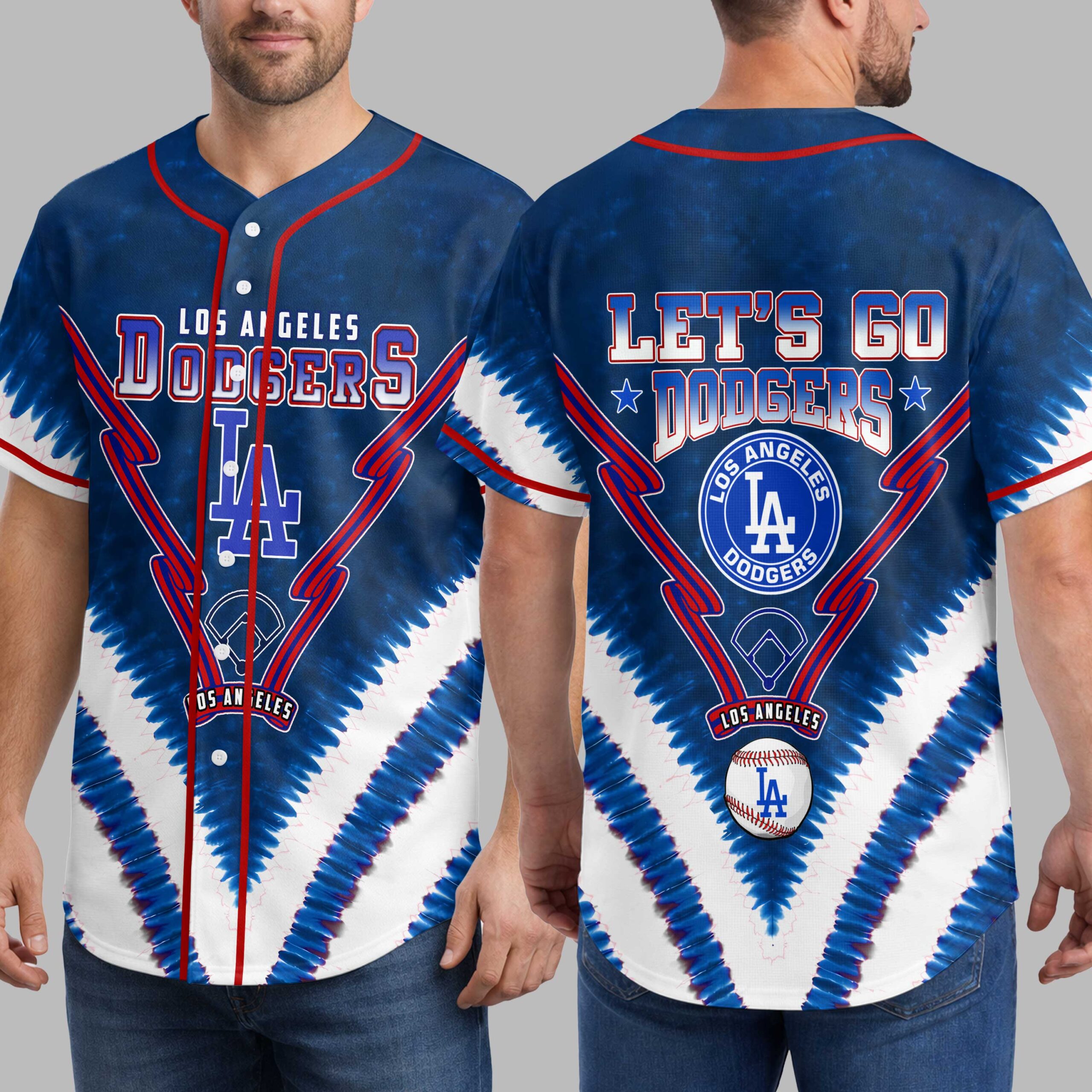 Ignite your game day spirit with this vibrant Los Angeles Dodgers tie-dye baseball jersey! Designed for dedicated fans, this shirt lets you proudly showcase your loyalty. Get ready to cheer loud, making a stylish statement for every thrilling game and victory. The front boldly features LOS ANGELES DODGERS and the iconic LA logo, framed by dynamic red lightning stripes on a striking blue and white tie-dye. The back electrifies with LET’S GO DODGERS and stars, plus a circular LA DODGERS emblem and a detailed baseball. This eye-catching jersey is perfect for game days at Dodger Stadium, spirited watch parties, or celebrating your team around town. Ideal for summer outings, it’s the ultimate way to show your passion for Los Angeles baseball with unforgettable style.
