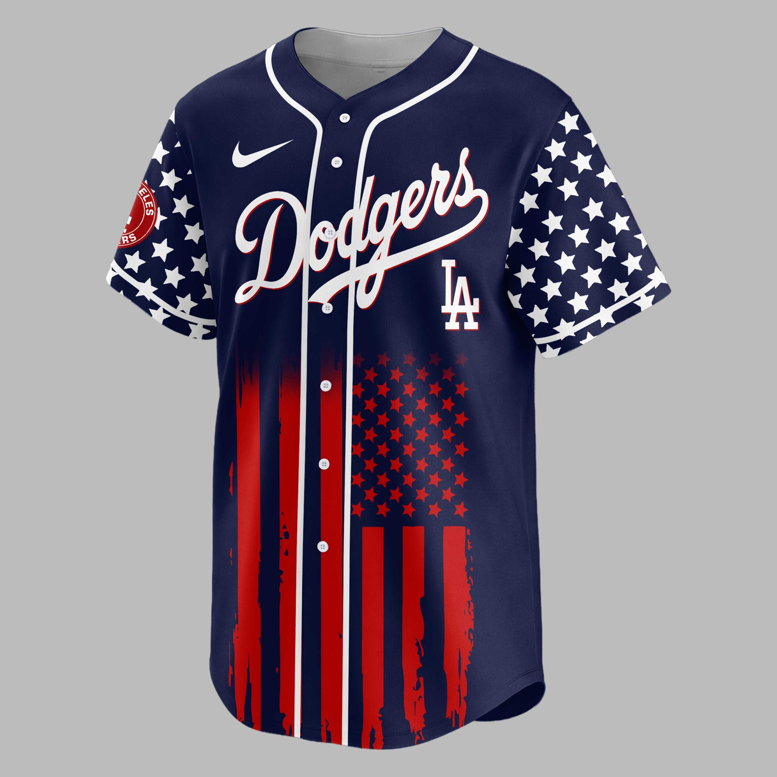 Celebrate Dodgers and American pride with this vibrant Patriotic Freedom Baseball Jersey! Marking 250 Years of Freedom, it blends team spirit with a bold national tribute. Honor your team and country in one striking design. The front features Dodgers script and LA logo over a distressed American flag of blue stripes, white stars on red. Sleeves carry this theme. The back showcases USA above a baseball, crossed bats, a majestic red, white, and blue bald eagle. A banner declares 250 YEARS OF FREEDOM, against a matching flag pattern. Ideal for game days, Fourth of July, Memorial Day, or patriotic events. Wear it to the ballpark or celebrations to proudly display Dodgers fandom and American spirit.