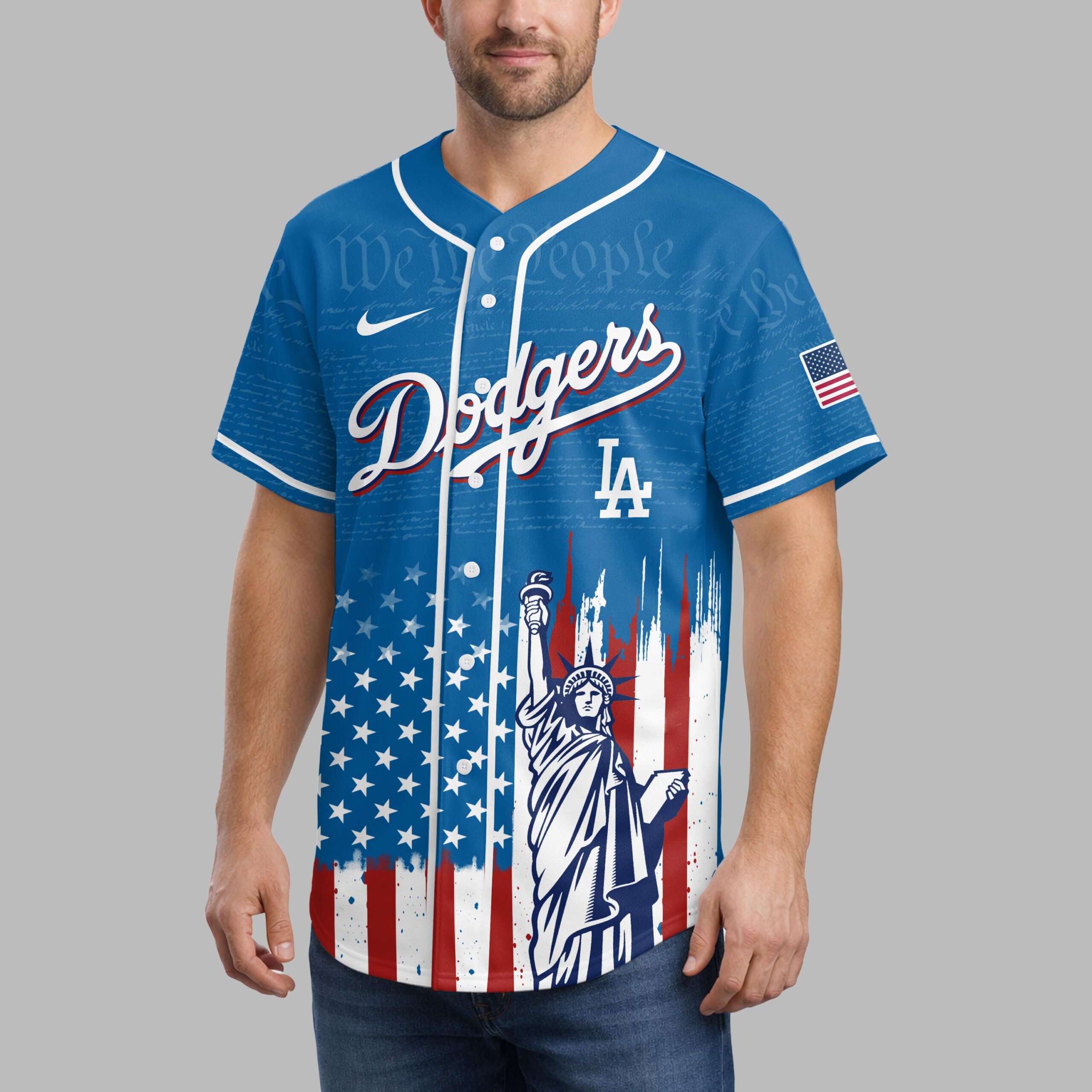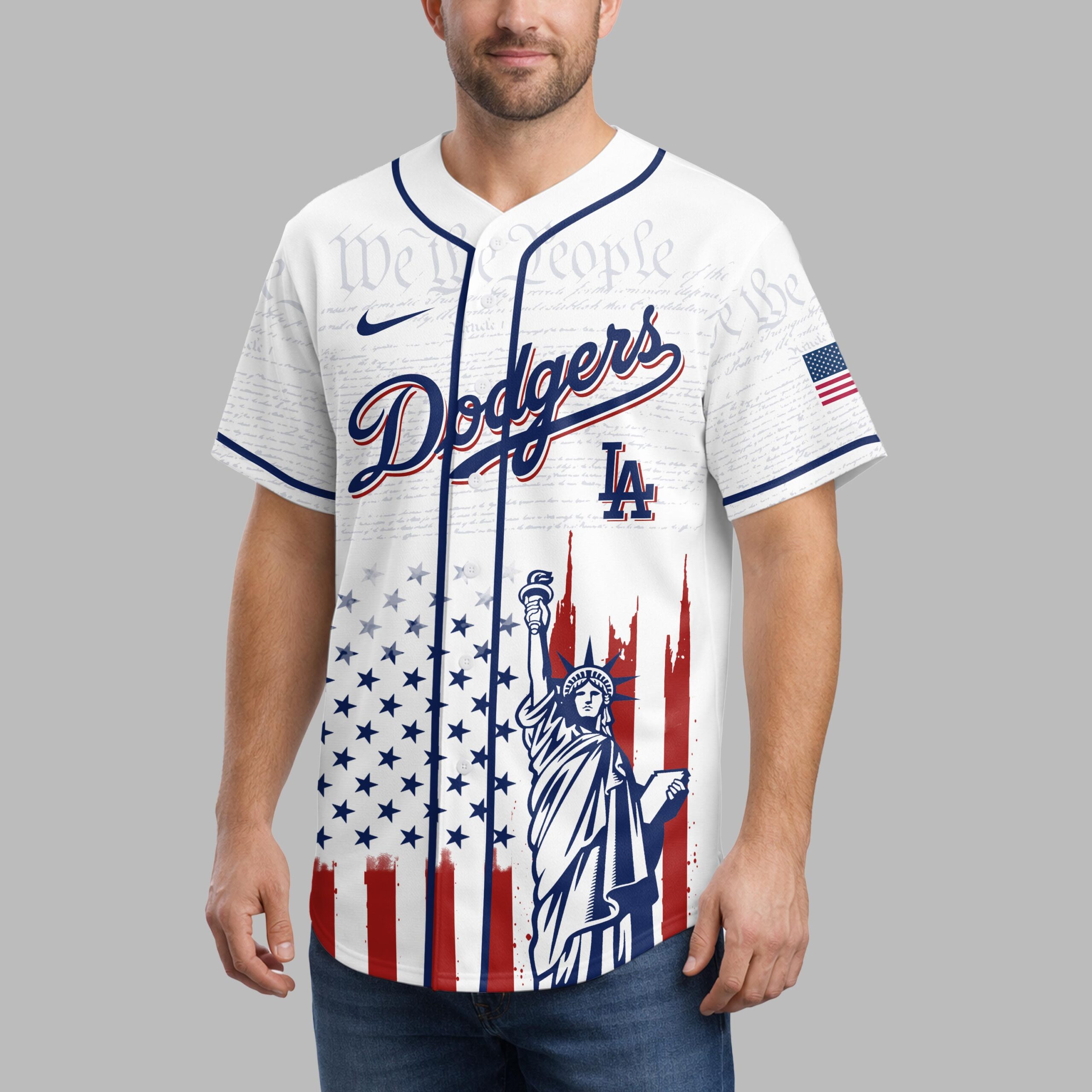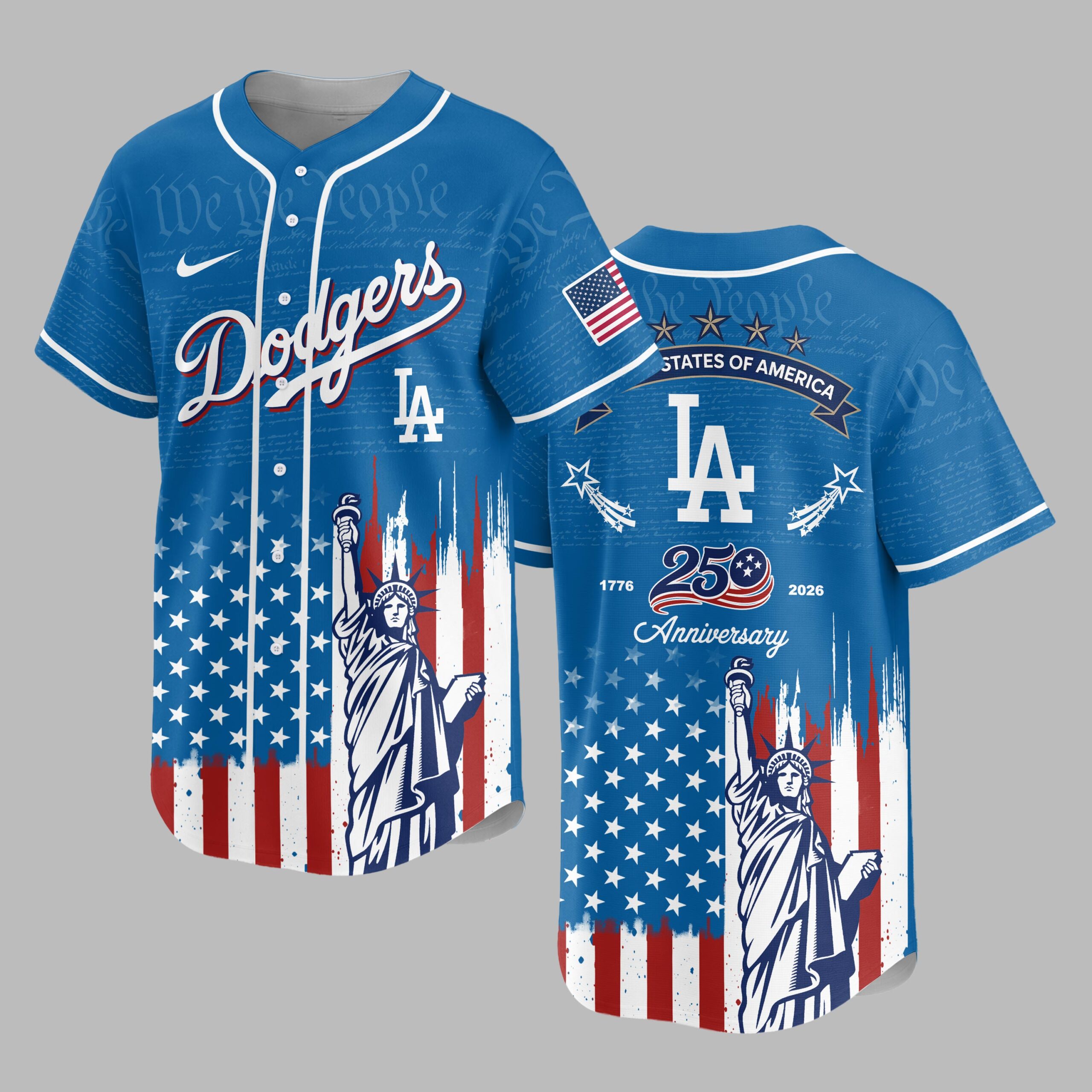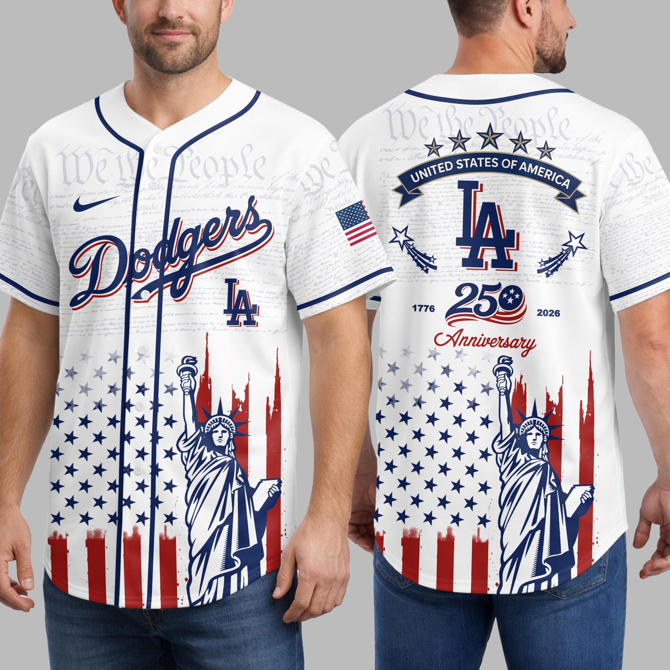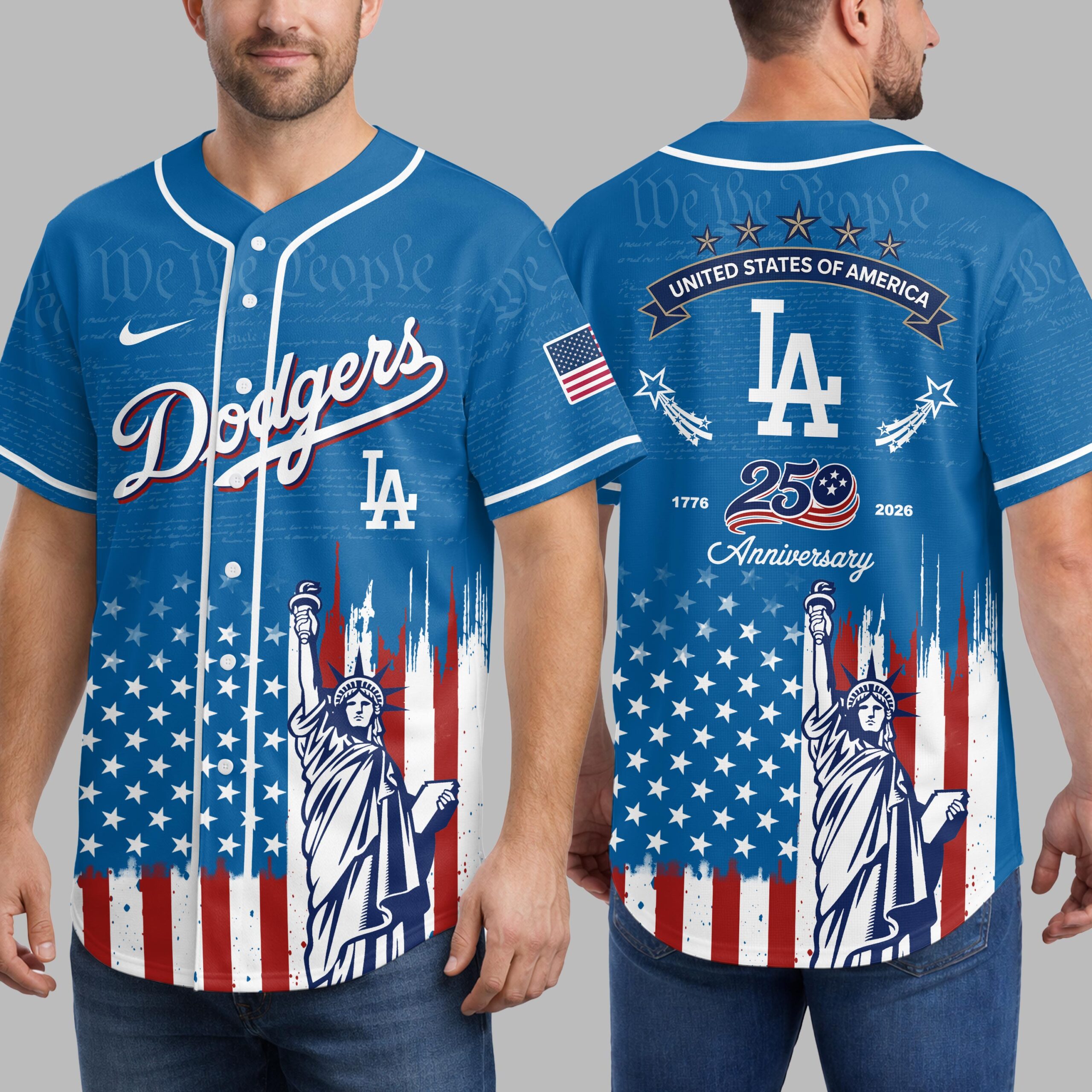 Show your profound pride in the Los Angeles Dodgers and the USA with this commemorative patriotic jersey. Celebrating the nation’s 250th anniversary, this unique design powerfully blends American heritage with Dodgers baseball. The front showcases the iconic ‘Dodgers’ script and ‘LA’ logo, subtly layered over a ‘We the People’ background. A distressed American flag design and the Statue of Liberty complete the lower half. The back proudly features another ‘LA’ logo, a ‘States of America’ banner, shooting stars, and the ‘1776-2026 250th Anniversary’ emblem, uniting team pride with national spirit. Ideal for game days, Fourth of July, or any event where you want to proudly showcase your devotion to team and country. This jersey is a bold statement for fans who cherish tradition, patriotism, and American baseball.