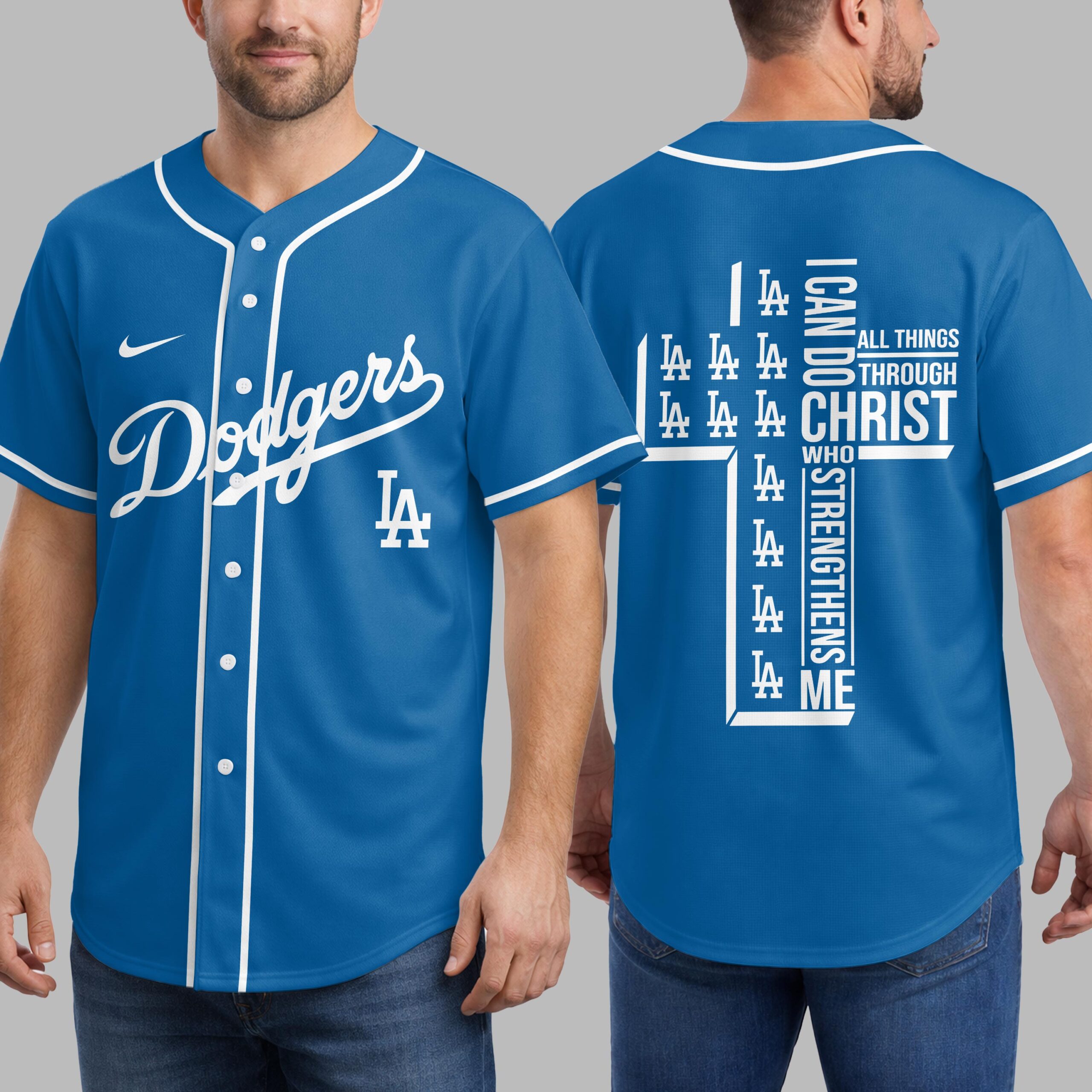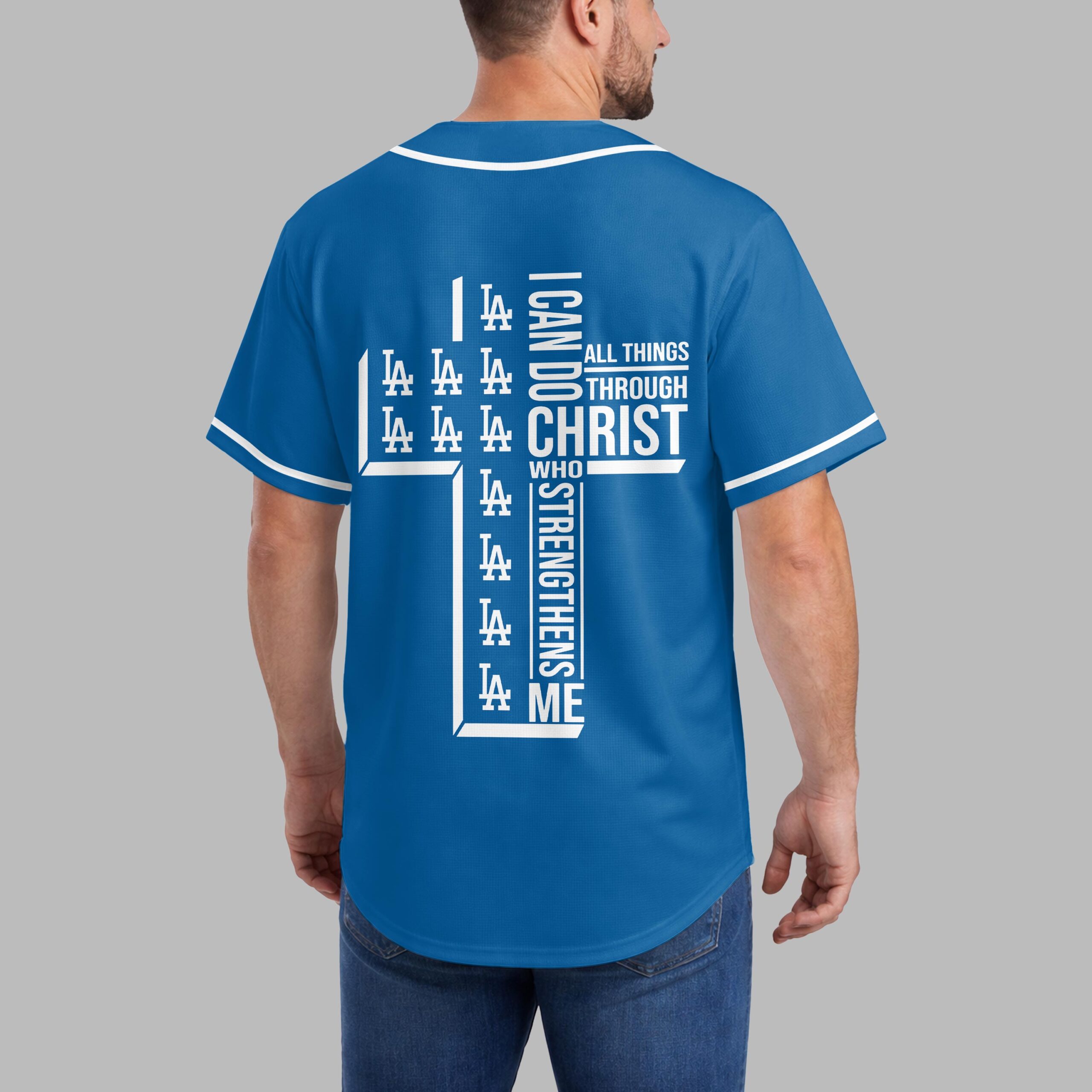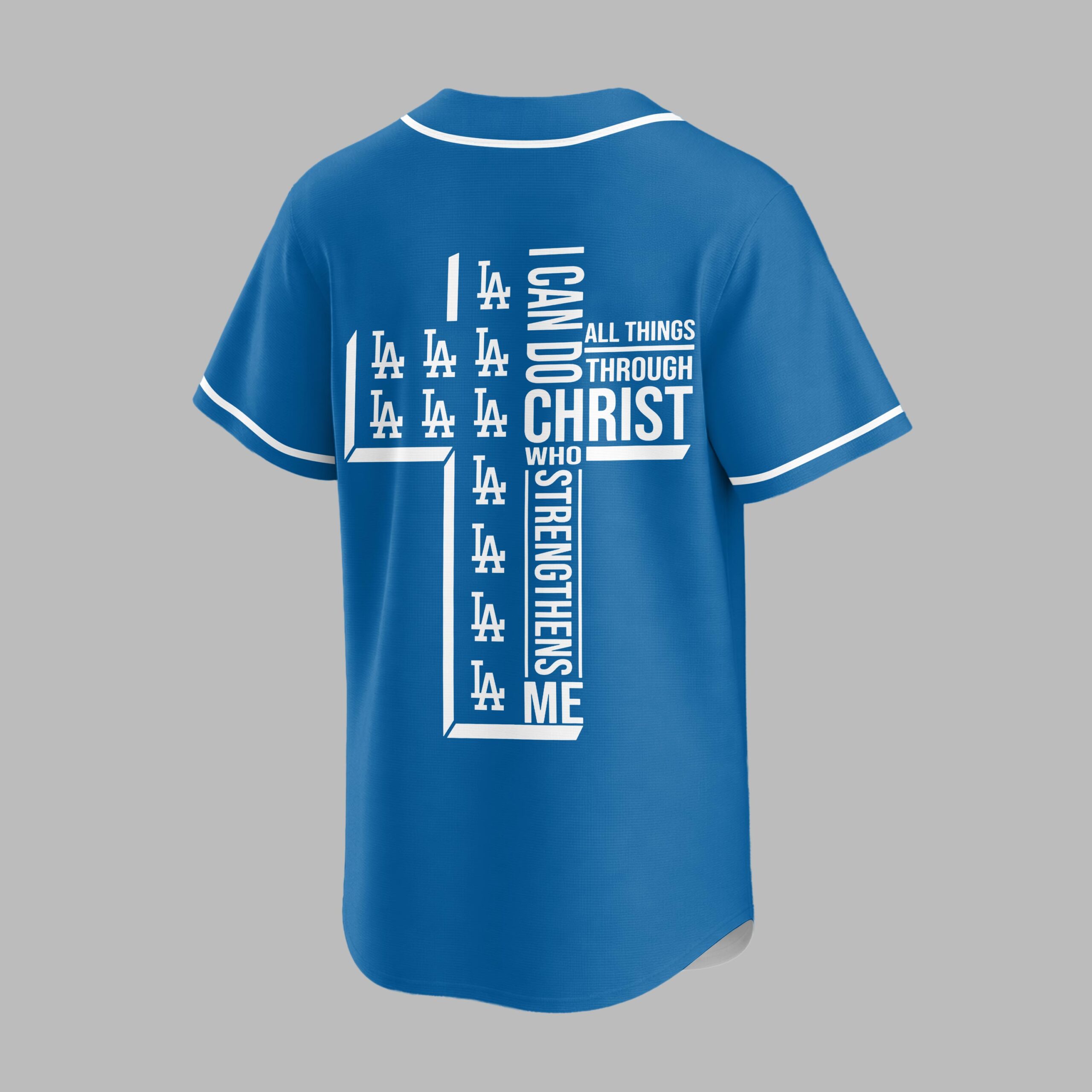 Step up to the plate with unwavering faith and passionate team pride in this unique Los Angeles Dodgers baseball jersey. This design beautifully merges your love for the Boys in Blue with a powerful message of strength, making it more than just game-day apparel. The front proudly displays the iconic Dodgers script across the chest, complete with the classic LA logo. Turn around, and you’ll reveal an inspiring cross design on the back, crafted from the uplifting scripture: I CAN DO ALL THINGS THROUGH CHRIST WHO STRENGTHENS ME. Multiple LA logos are thoughtfully integrated, reinforcing both your team allegiance and your spiritual fortitude. Whether you’re cheering from the stands at Dodger Stadium, enjoying a casual day out, or simply expressing your dual passions, this jersey is a perfect fit. It’s an ideal way to showcase your dedication to the Dodgers and your enduring faith in style.