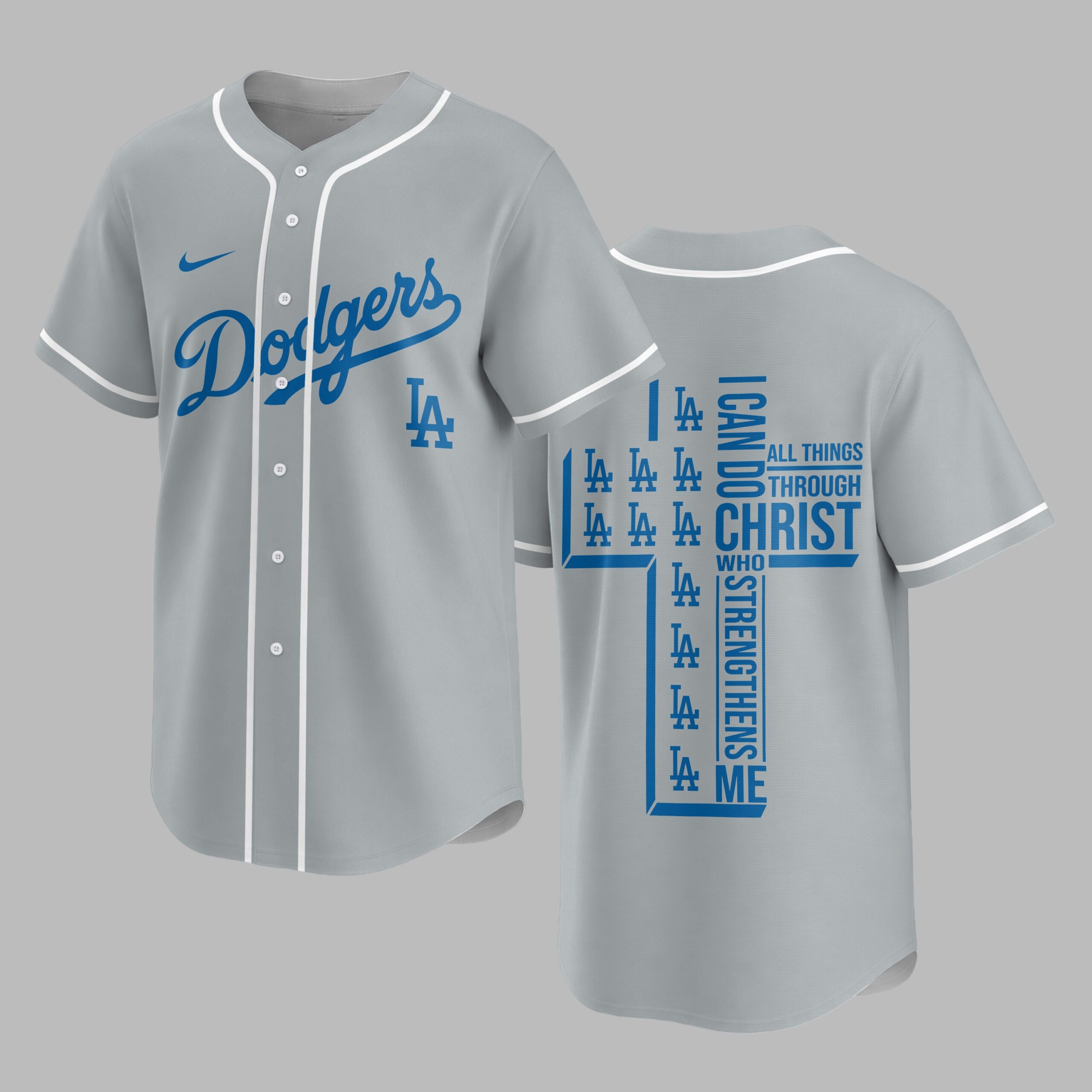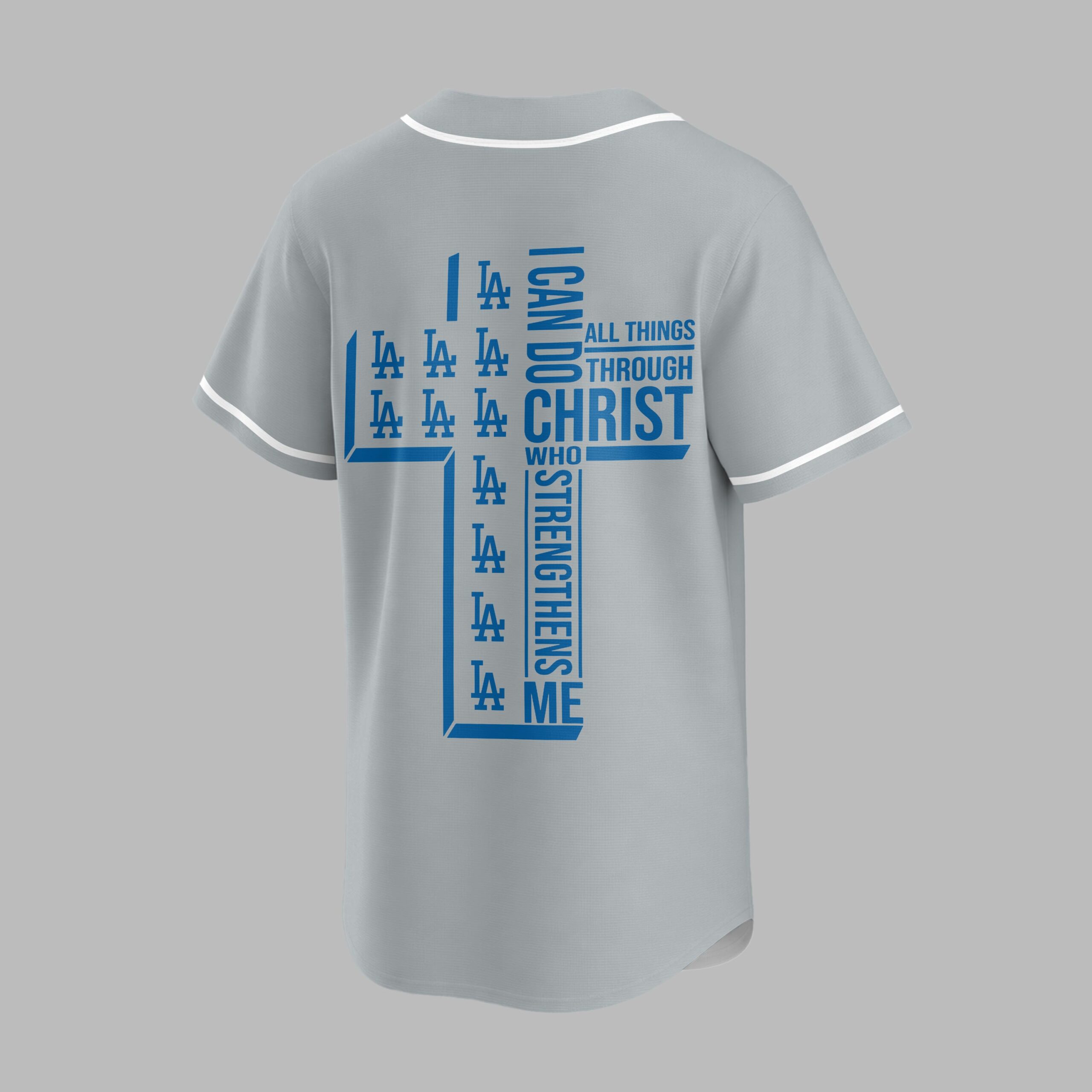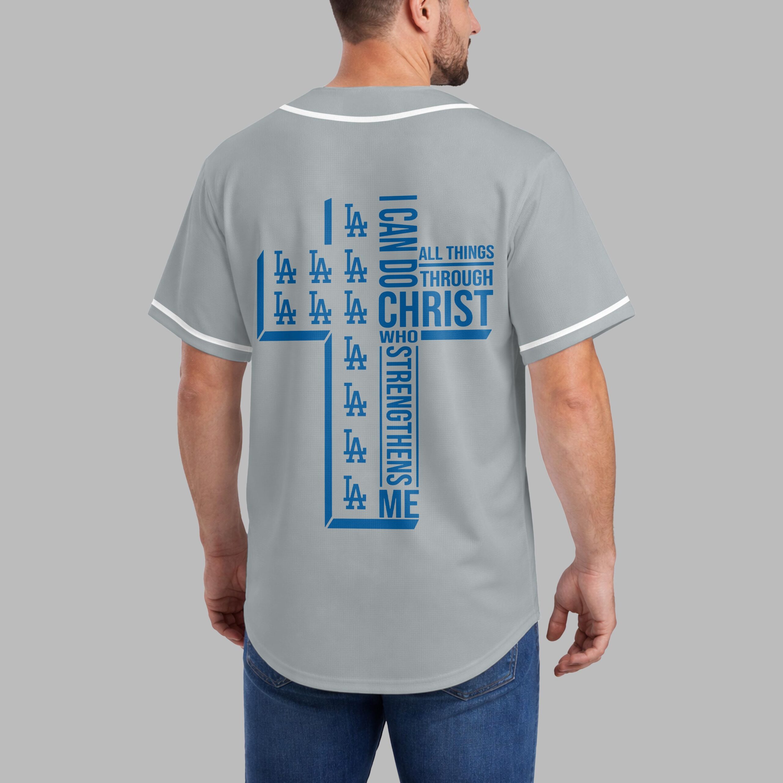 Step up to the plate with unwavering faith and passionate team pride in this unique Los Angeles Dodgers baseball jersey. This design beautifully merges your love for the Boys in Blue with a powerful message of strength, making it more than just game-day apparel. The front proudly displays the iconic Dodgers script across the chest, complete with the classic LA logo. Turn around, and you’ll reveal an inspiring cross design on the back, crafted from the uplifting scripture: I CAN DO ALL THINGS THROUGH CHRIST WHO STRENGTHENS ME. Multiple LA logos are thoughtfully integrated, reinforcing both your team allegiance and your spiritual fortitude. Whether you’re cheering from the stands at Dodger Stadium, enjoying a casual day out, or simply expressing your dual passions, this jersey is a perfect fit. It’s an ideal way to showcase your dedication to the Dodgers and your enduring faith in style.