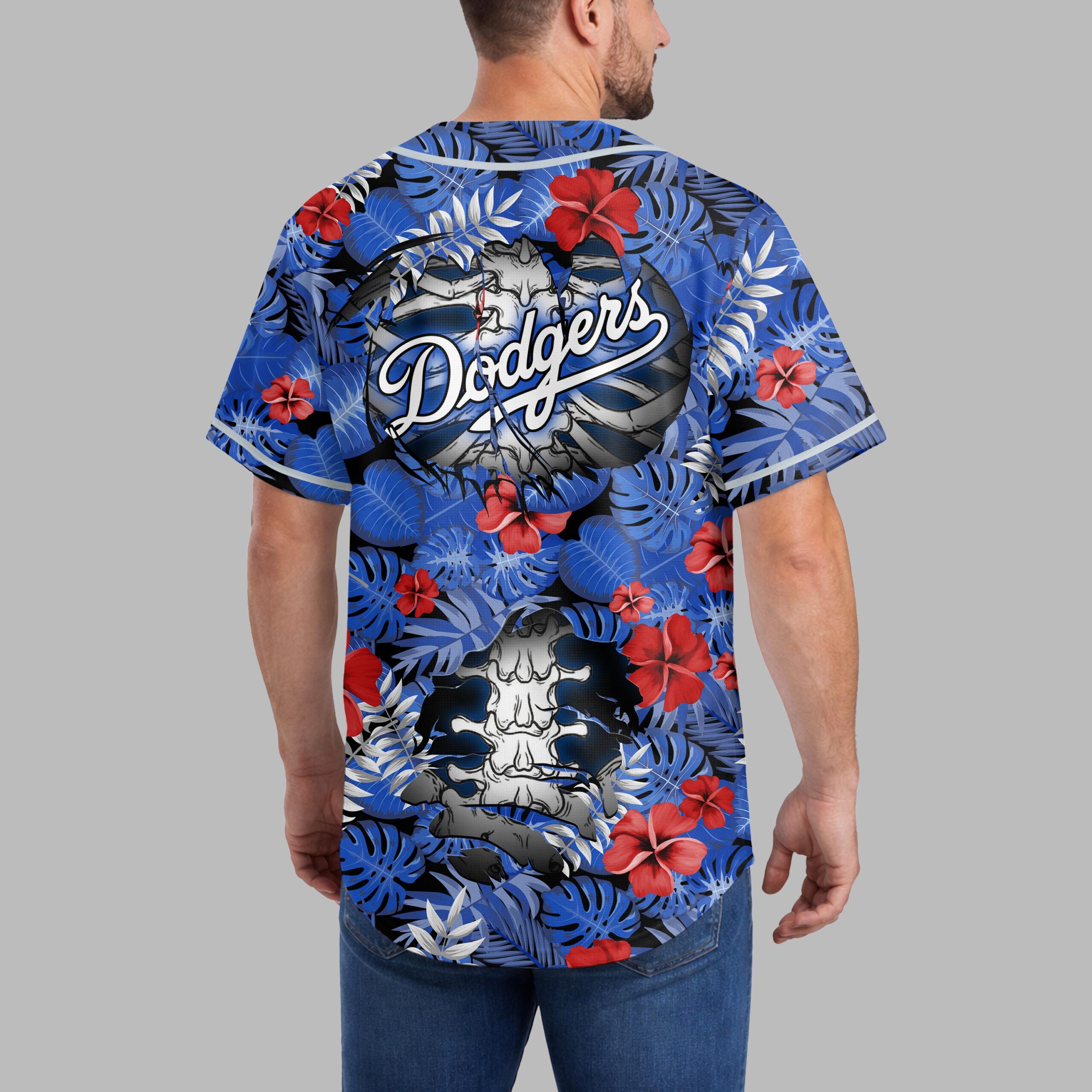 Show your unwavering support for the Los Angeles Dodgers with a shirt that’s anything but ordinary! This vibrant baseball jersey masterfully blends classic team pride with an unexpected, edgy tropical twist, perfect for fans who love to stand out. Embrace the unique fusion of your favorite team spirit and a cool, laid-back vibe. The front of this eye-catching design features the iconic LA logo alongside a vertical Dodgers script, all set against a rich blue backdrop of lush tropical leaves and bright red hibiscus flowers. A striking white skeleton rib cage subtly emerges from the pattern, adding a bold, distinctive statement. The back continues this dynamic theme, showcasing a prominent Dodgers wordmark positioned over a detailed skeleton skull and spine, all surrounded by the same intricate tropical foliage. This spirited jersey is perfect for game day at Dodger Stadium, a lively summer BBQ, or your next sun-soaked vacation. It’s more than just fan gear; it’s a statement piece for every devoted Dodgers supporter looking to celebrate their team with ultimate style and a touch of the extraordinary.