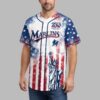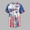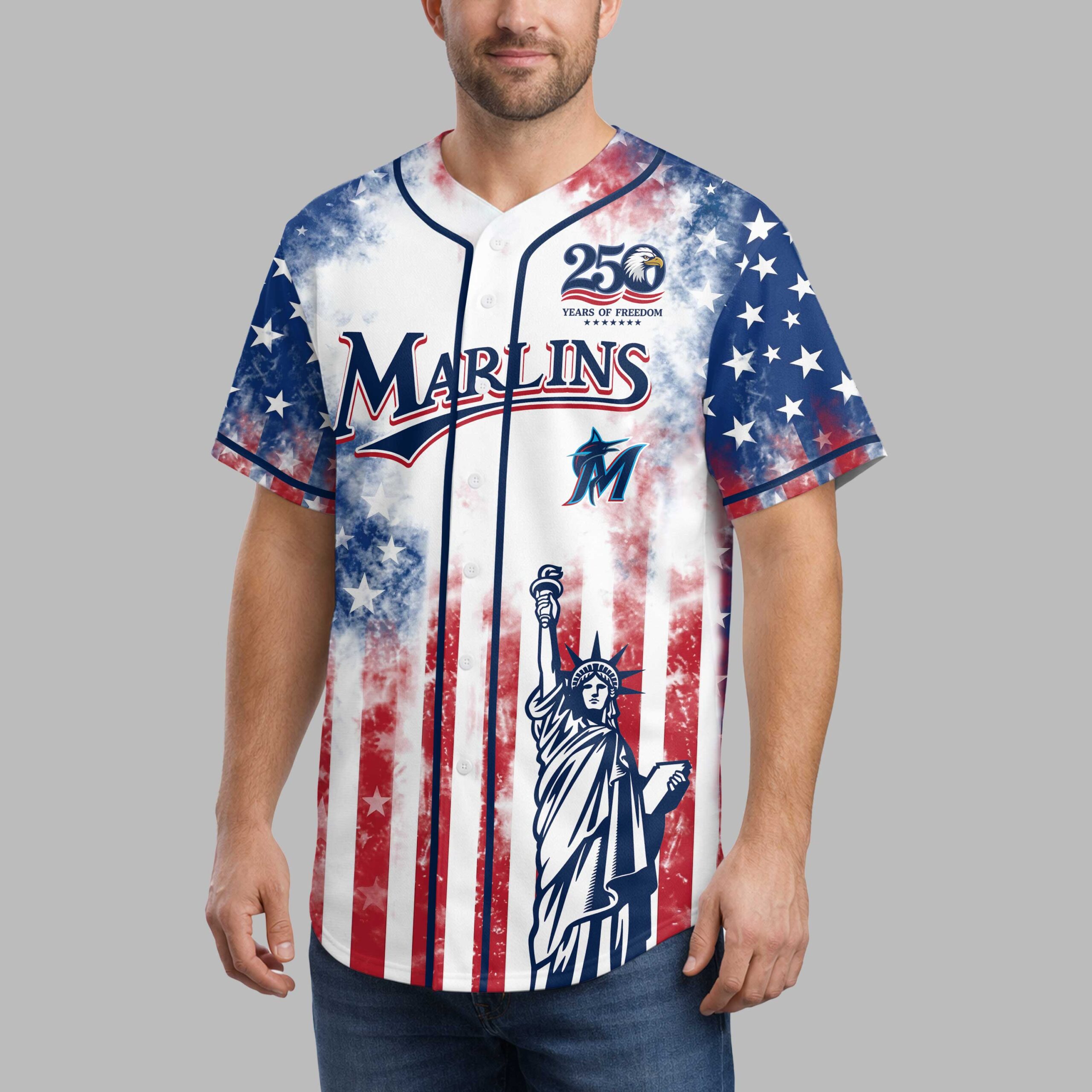 Unite your Miami Marlins pride with American patriotism in this striking baseball jersey! Celebrating 250 Years of Freedom, this design beautifully blends team loyalty with a powerful tribute to our nation’s spirit. It’s a truly special piece for any fan. The front prominently features MARLINS in team colors, alongside the Statue of Liberty and a 250 Years of Freedom eagle emblem. A distressed American flag pattern, with bold red stripes and blue stars, creates a dynamic backdrop. The back displays 1776 250 2026 YEARS OF FREEDOM above a stylized Marlins M logo. Ideal for game days, Fourth of July, Memorial Day, or any patriotic gathering, this jersey lets you boldly showcase your team and national pride. It’s the perfect statement piece for every devoted Marlins fan and proud American.