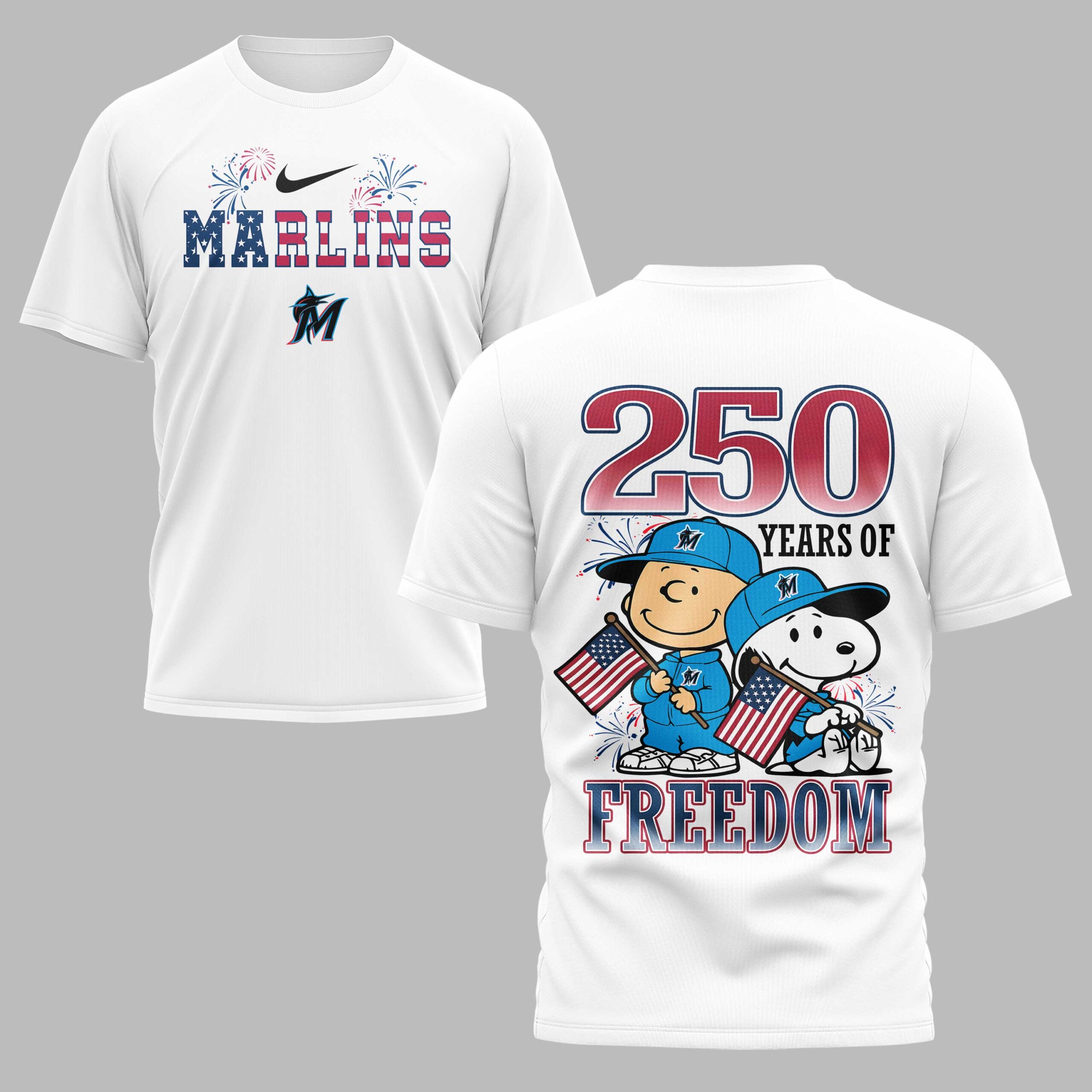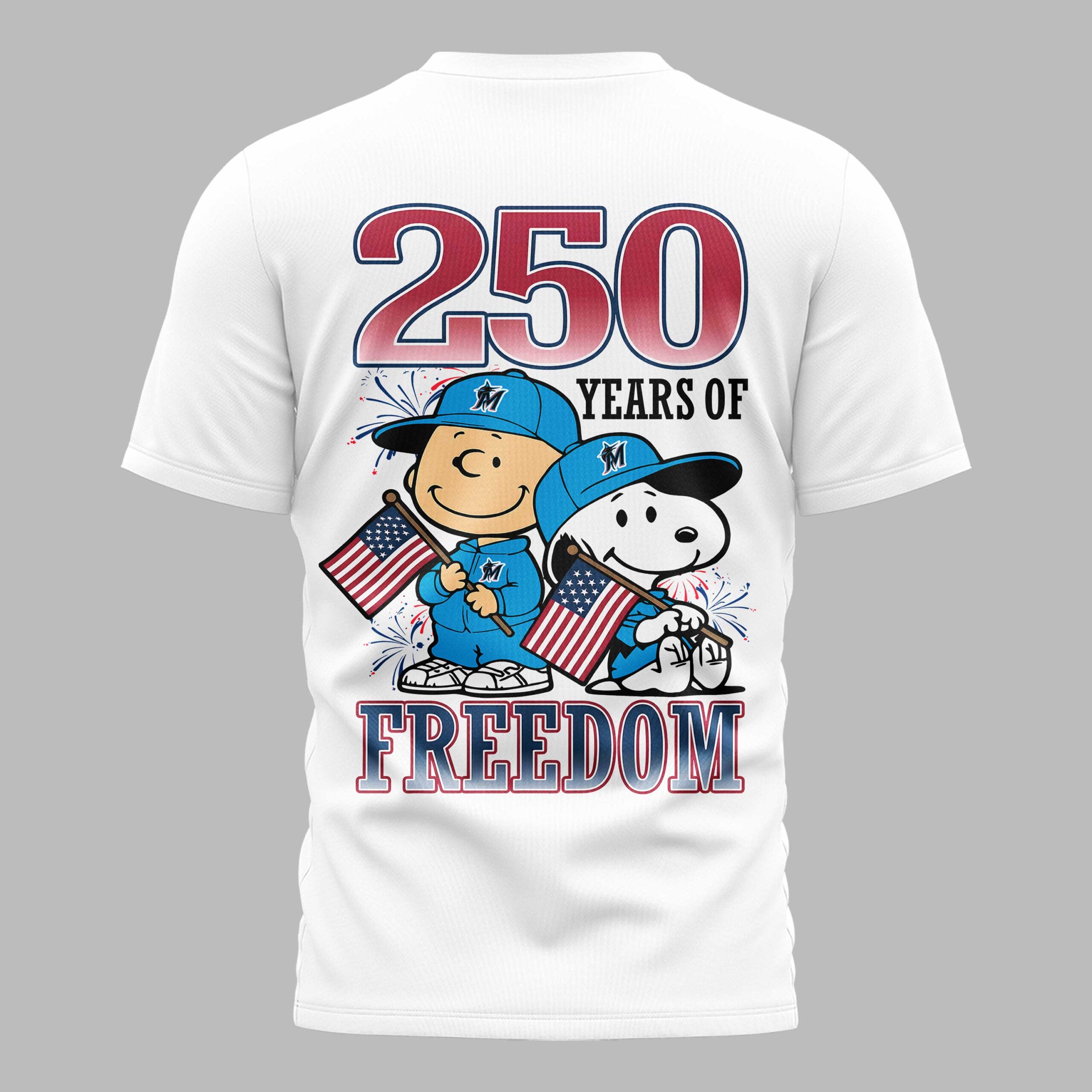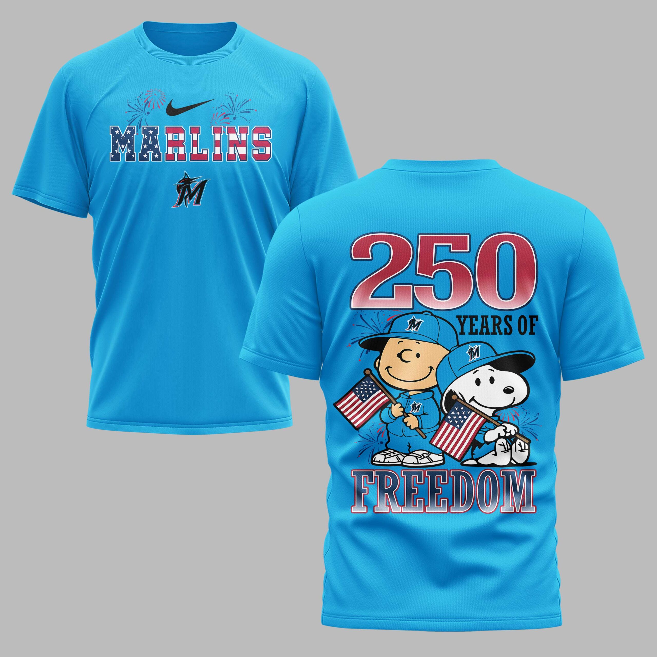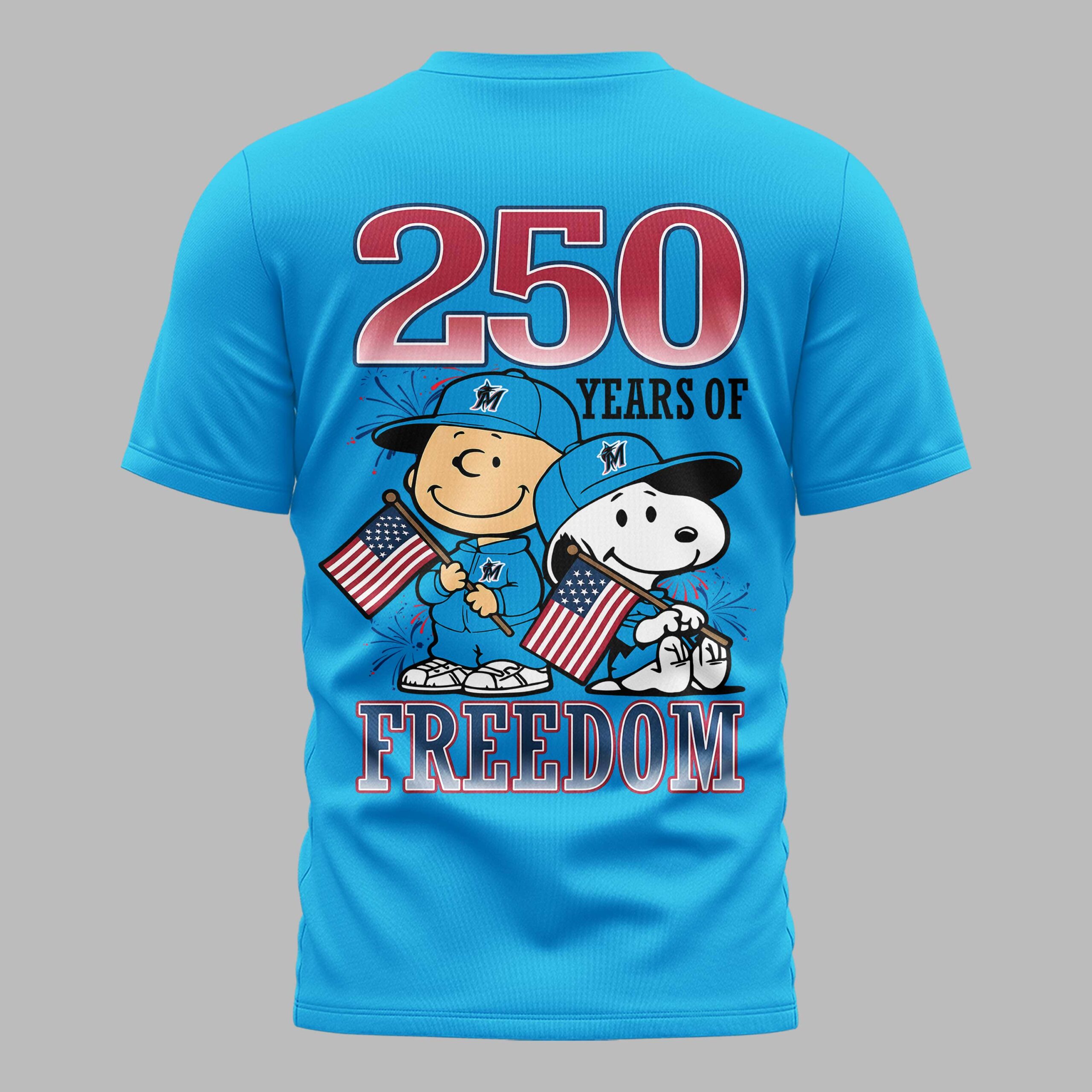 Celebrate Miami Marlins pride and American freedom with this vibrant patriotic tee! Perfect for fans who love baseball and country, this spirited shirt honors both. It brings a festive touch to any occasion, showcasing your dual passions. The front proudly displays MARLINS in a dynamic red, white, and blue stars and stripes design, accented by festive fireworks and the team’s iconic logo. The back declares 250 YEARS OF FREEDOM, featuring beloved Peanuts characters, Charlie Brown and Snoopy, wearing Marlins caps and waving American flags. Ideal for game days, Fourth of July celebrations, or any patriotic event. Wear it to the ballpark or gatherings to proudly display your American spirit and team loyalty.