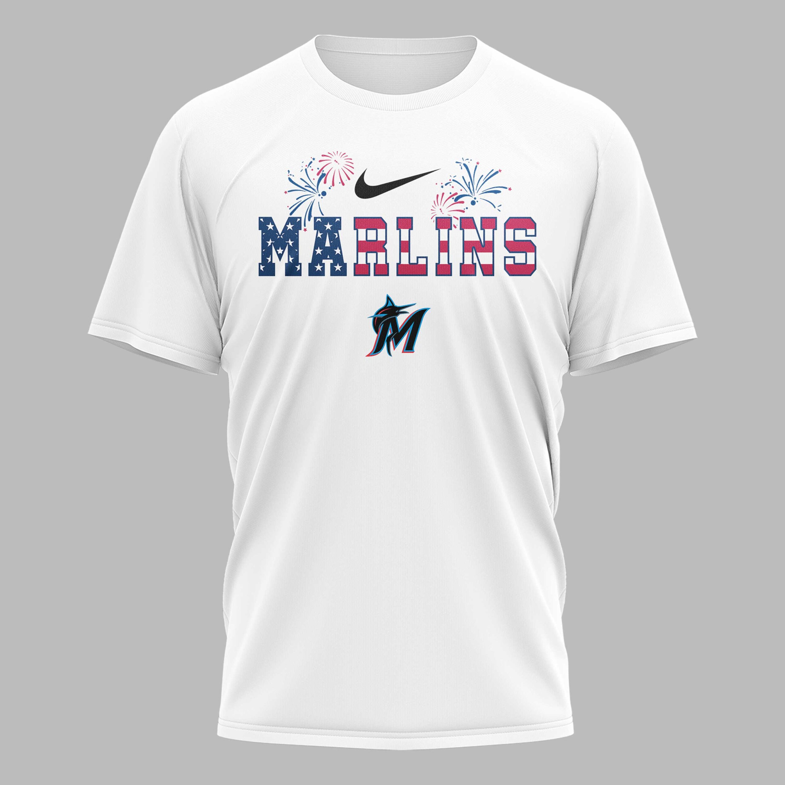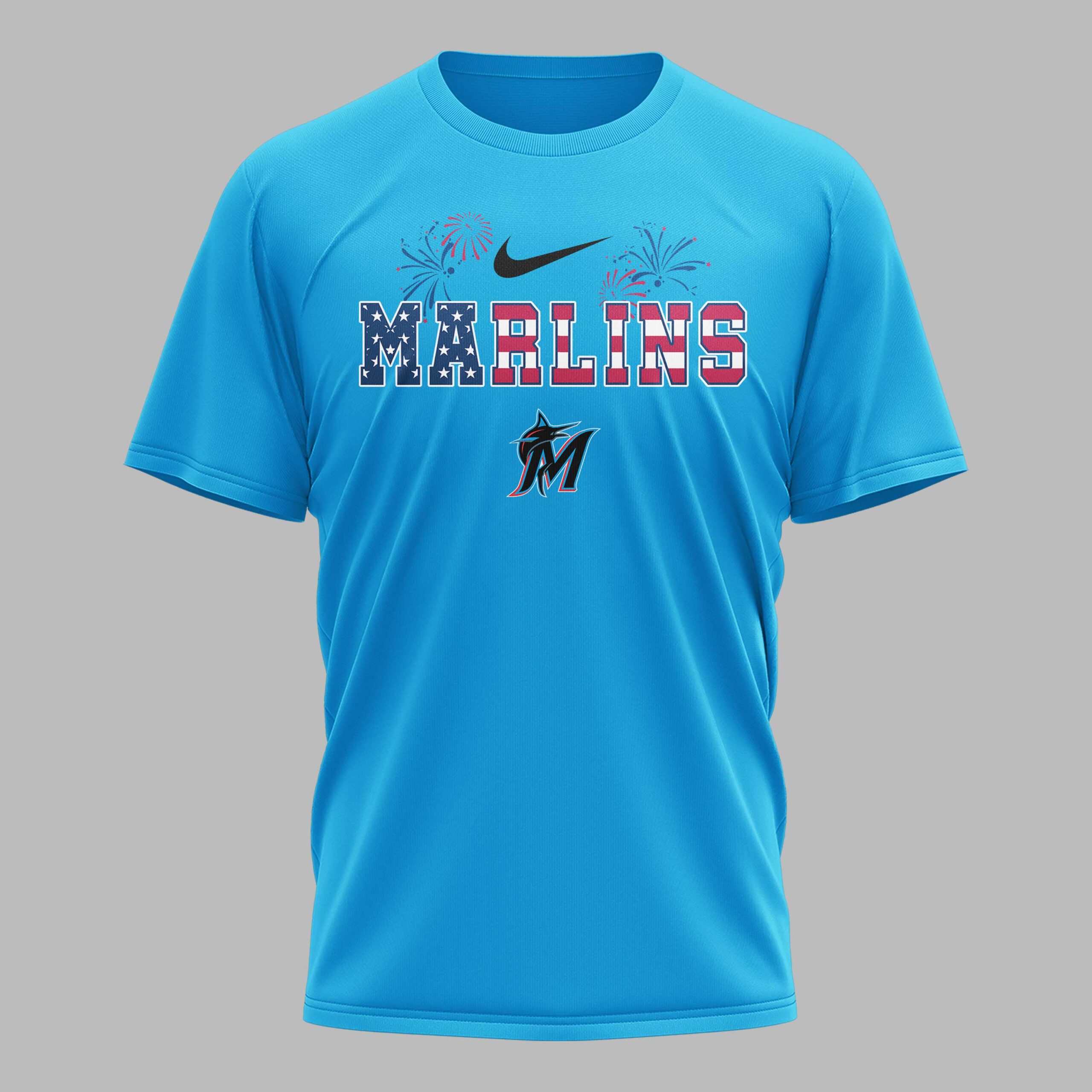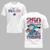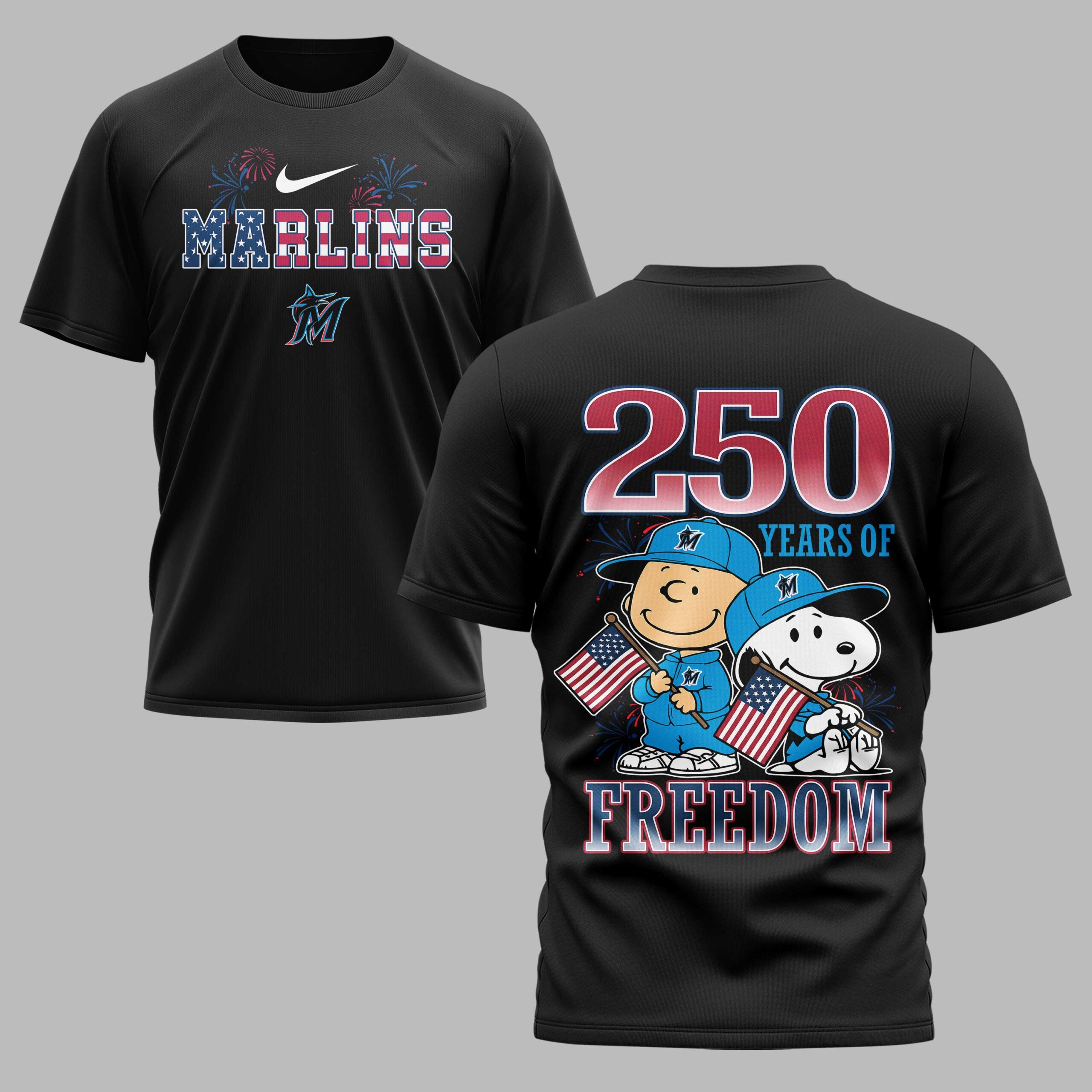 Celebrate Miami Marlins pride and American freedom with this vibrant patriotic tee! Perfect for fans who love baseball and country, this spirited shirt honors both. It brings a festive touch to any occasion, showcasing your dual passions. The front proudly displays MARLINS in a dynamic red, white, and blue stars and stripes design, accented by festive fireworks and the team’s iconic logo. The back declares 250 YEARS OF FREEDOM, featuring beloved Peanuts characters, Charlie Brown and Snoopy, wearing Marlins caps and waving American flags. Ideal for game days, Fourth of July celebrations, or any patriotic event. Wear it to the ballpark or gatherings to proudly display your American spirit and team loyalty.