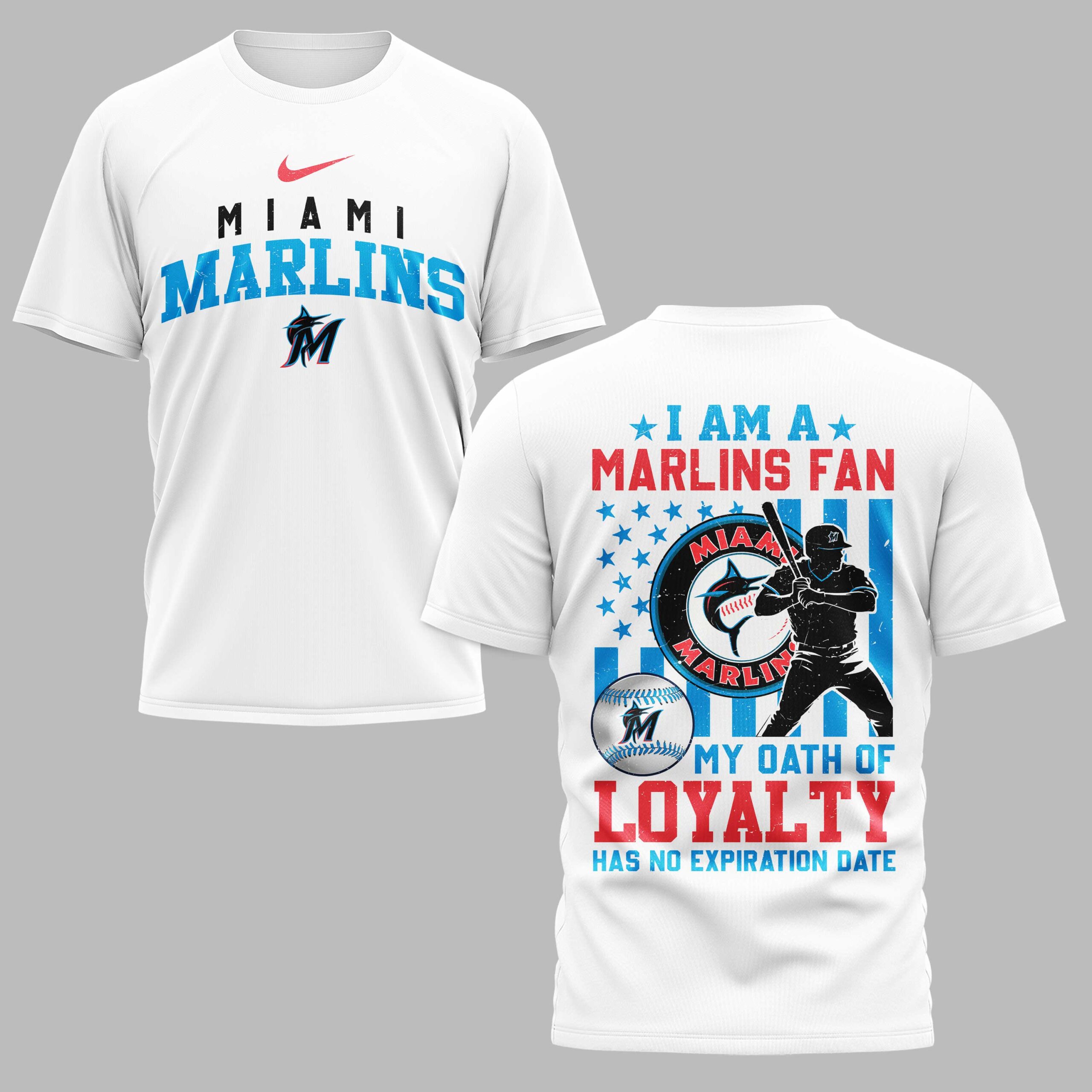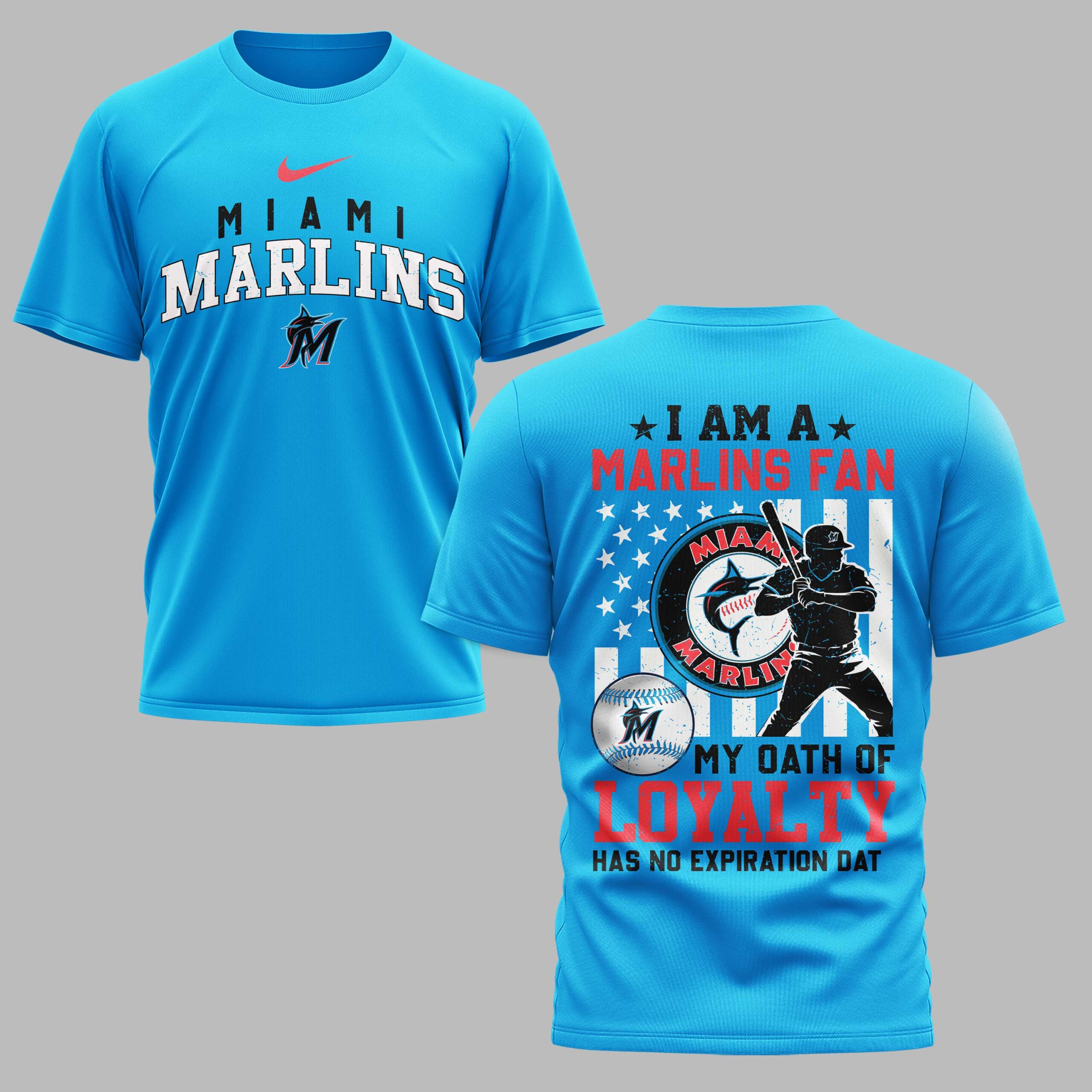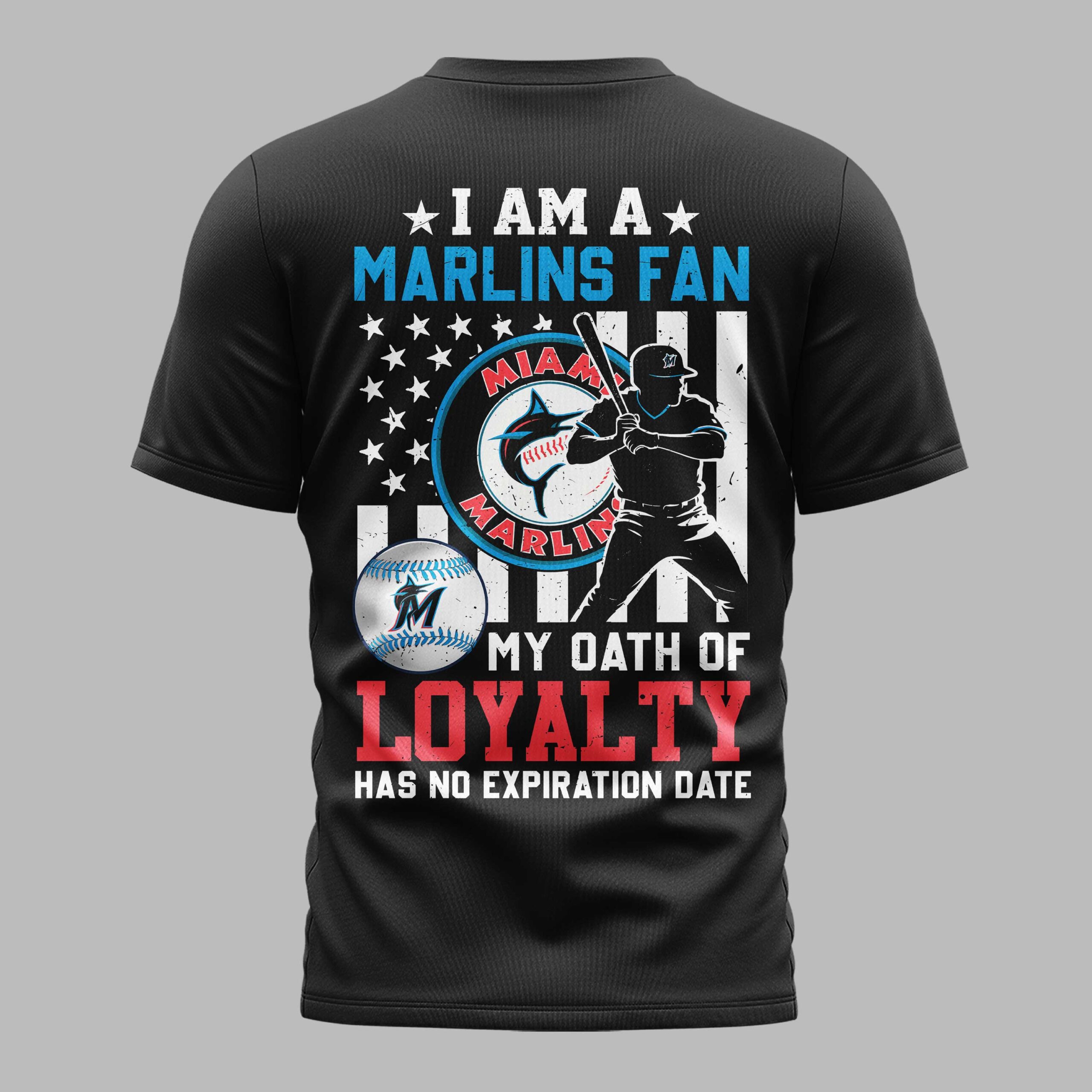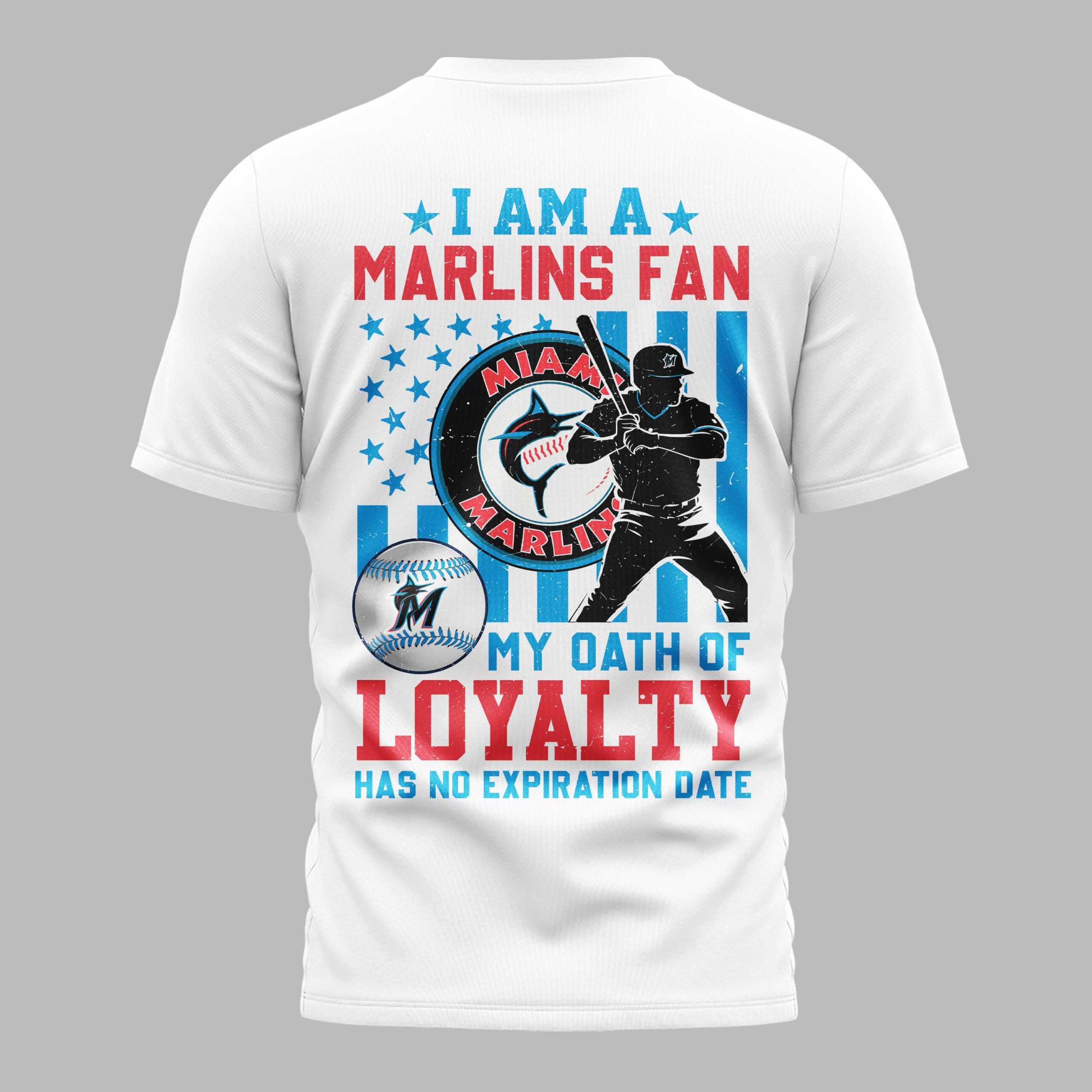 Show your unwavering spirit for the Miami Marlins with this fan tee! Perfect for dedicated supporters, this shirt proudly declares your passion. It’s a vibrant statement of lasting loyalty, ideal for every thrilling moment of Marlins baseball. The front features MIAMI MARLINS in crisp white and distressed blue, with the iconic M logo. The back impresses with an American flag-inspired design, showcasing a baseball player silhouette and the classic Marlins emblem. MY OATH OF LOYALTY HAS NO EXPIRATION DATE champions your enduring commitment. Perfect for cheering at the ballpark, hosting watch parties, or daily casual wear, this shirt lets you proudly represent your Marlins pride. Wear it to major league games, casual outings, or any event to showcase your passion and patriotic support.