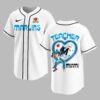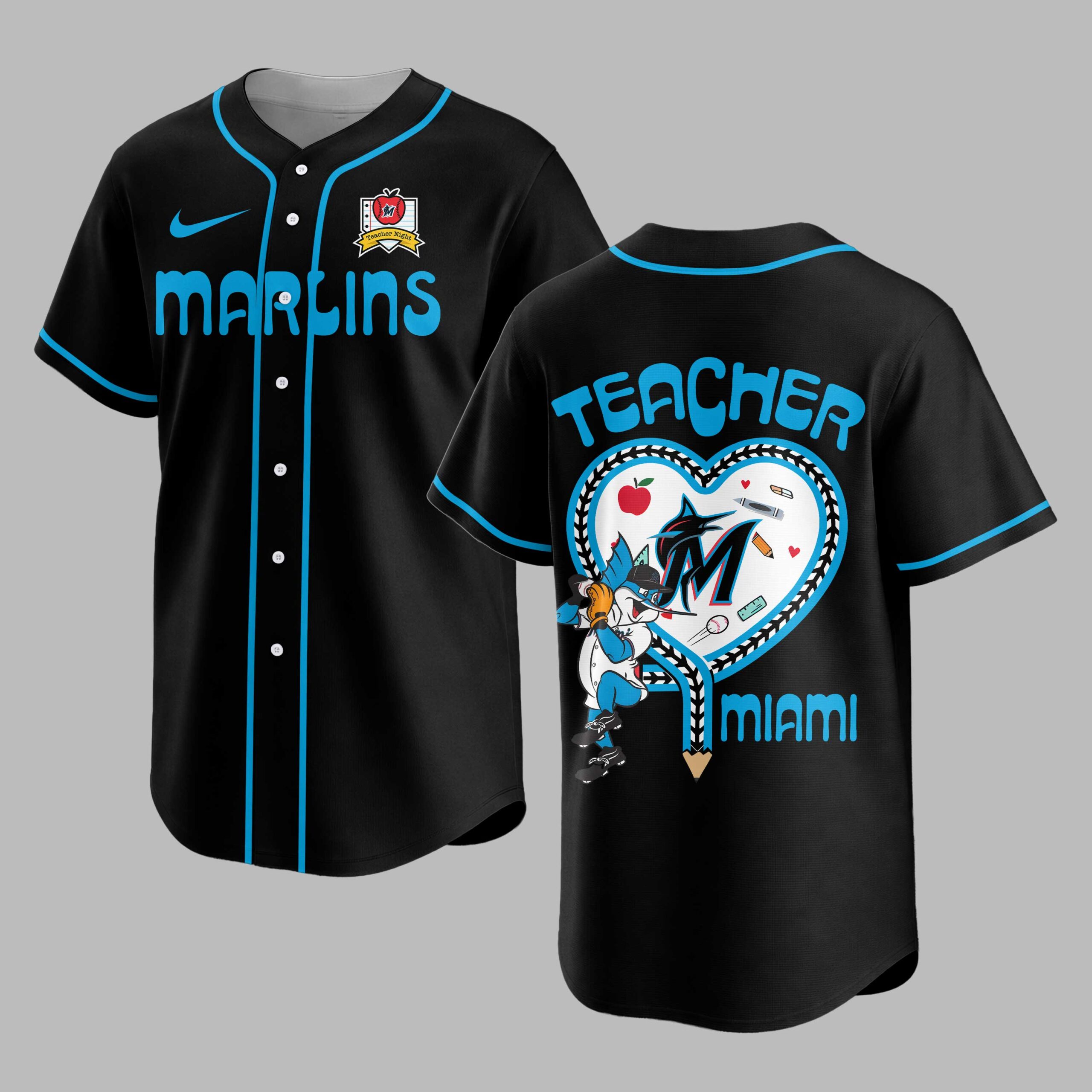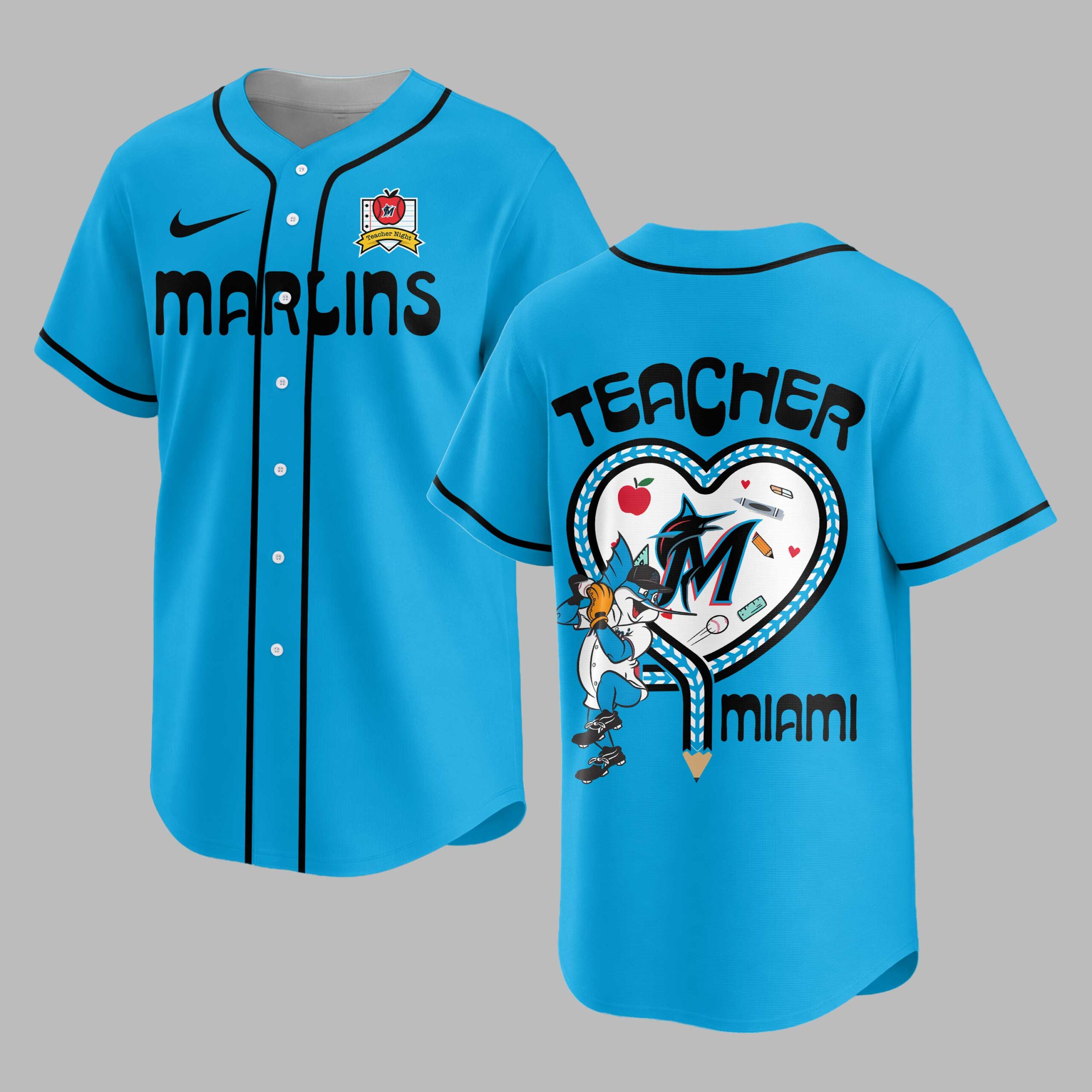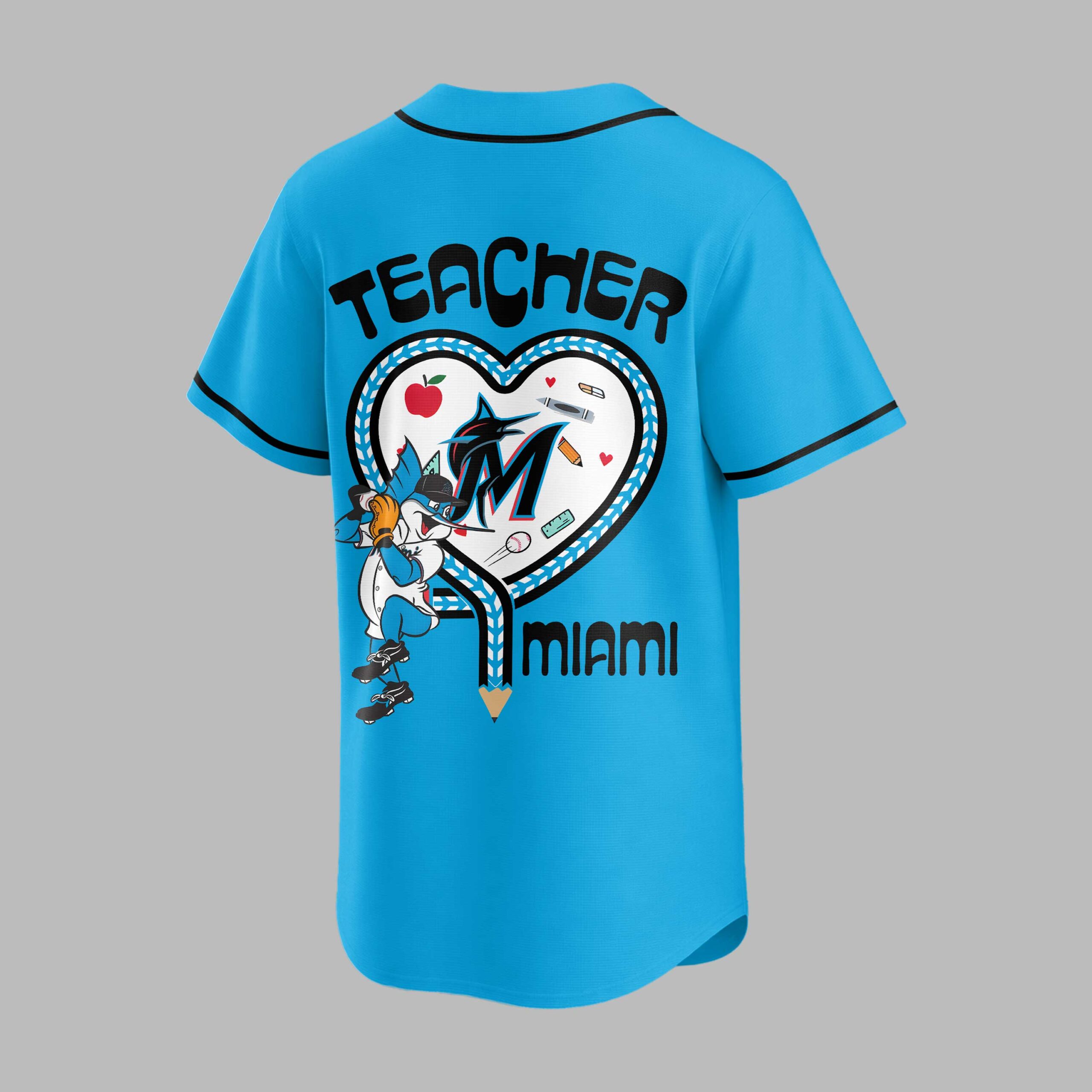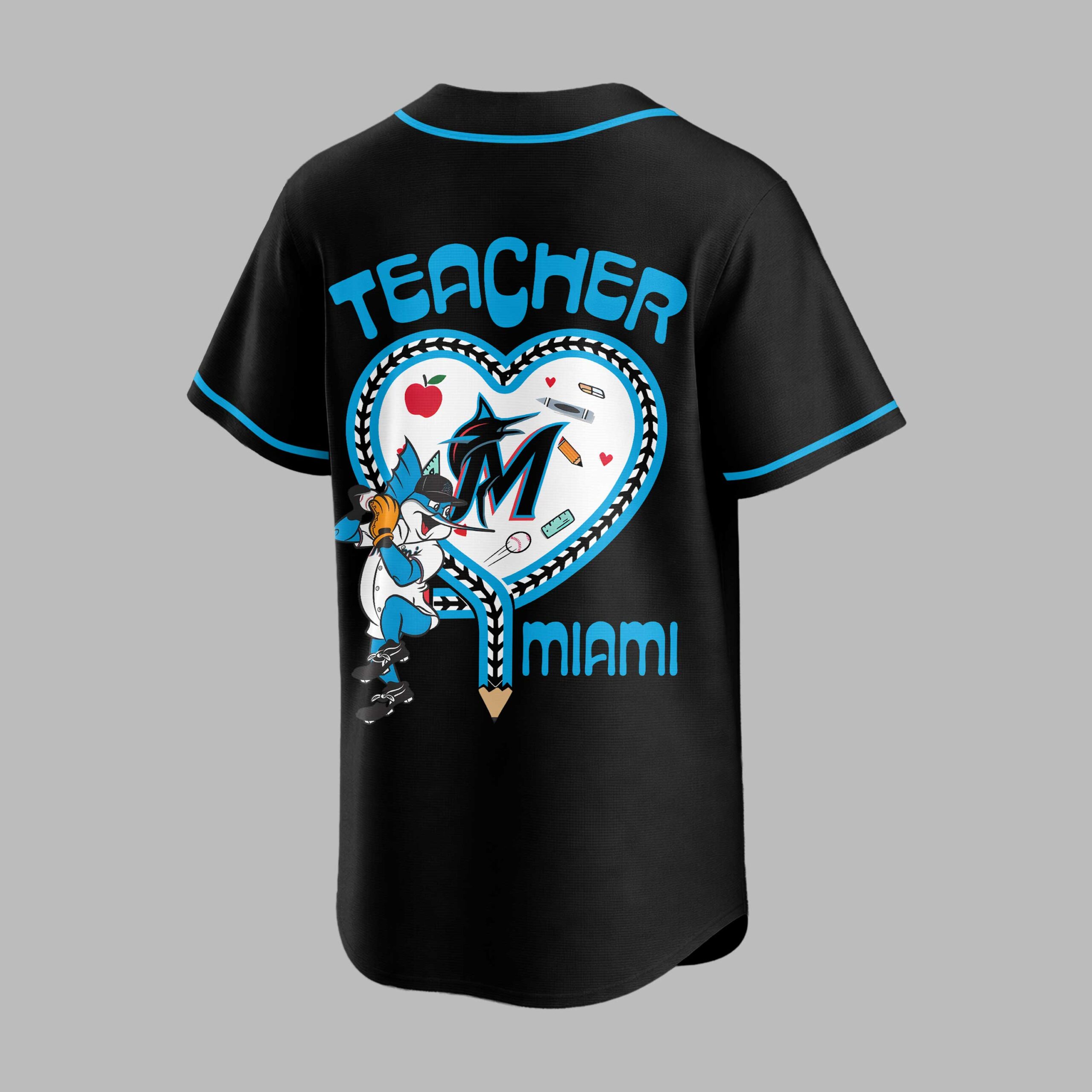 Unite your love for the Miami Marlins with profound appreciation for educators in this special Teacher Appreciation baseball jersey! It’s the perfect way to blend game-day enthusiasm and heartfelt gratitude for those who shape our future. The front proudly features MARLINS in bold blue, accented by an apple logo with an M and a Teacher Night banner. The back is a vibrant tribute: TEACHER rests above a heart design, cleverly merging baseball stitching with a braided pattern. Inside, the Marlins mascot swings amidst school supplies, with MIAMI stylized as a pencil. This spirited jersey is ideal for Teacher Night at the ballpark, cheering on the Marlins, or expressing your dual pride at school events. A comfortable, heartfelt choice, it’s perfect for devoted fans and incredible educators alike.