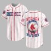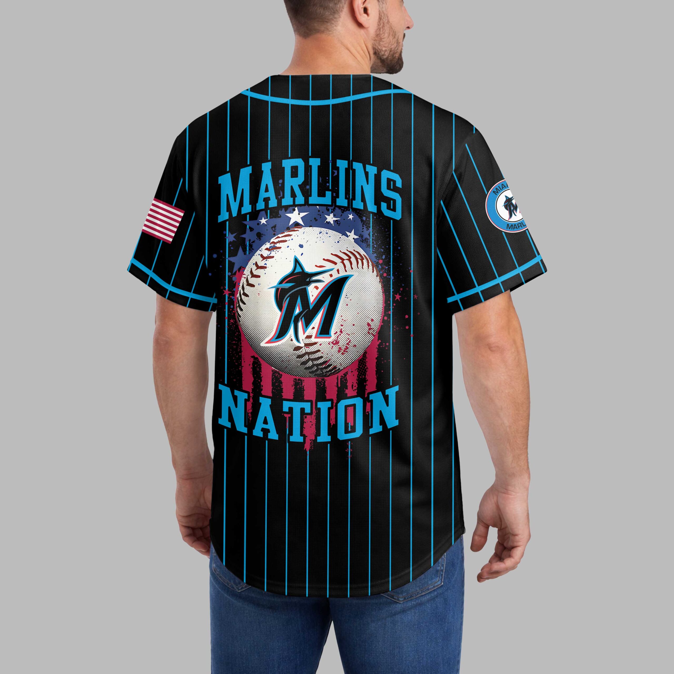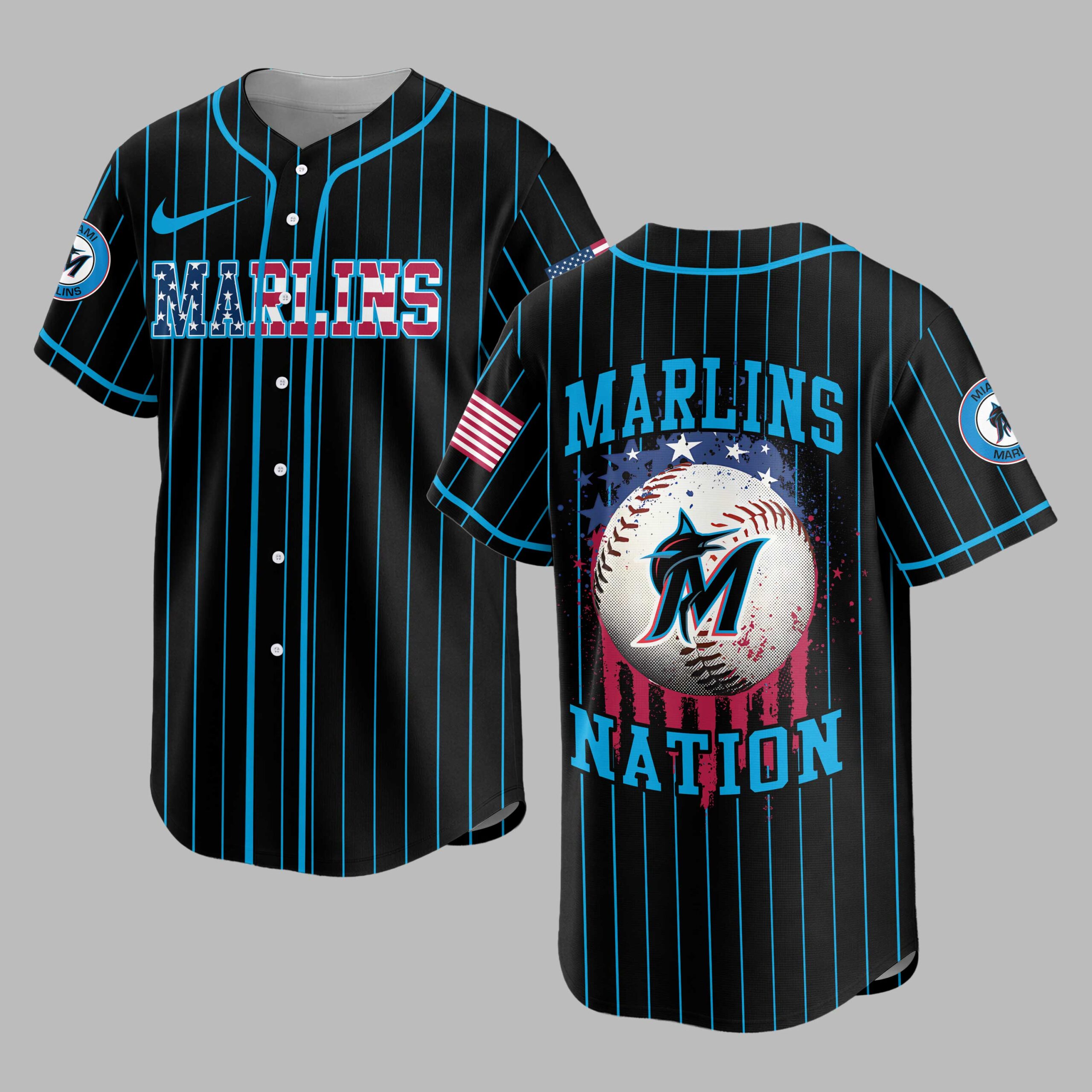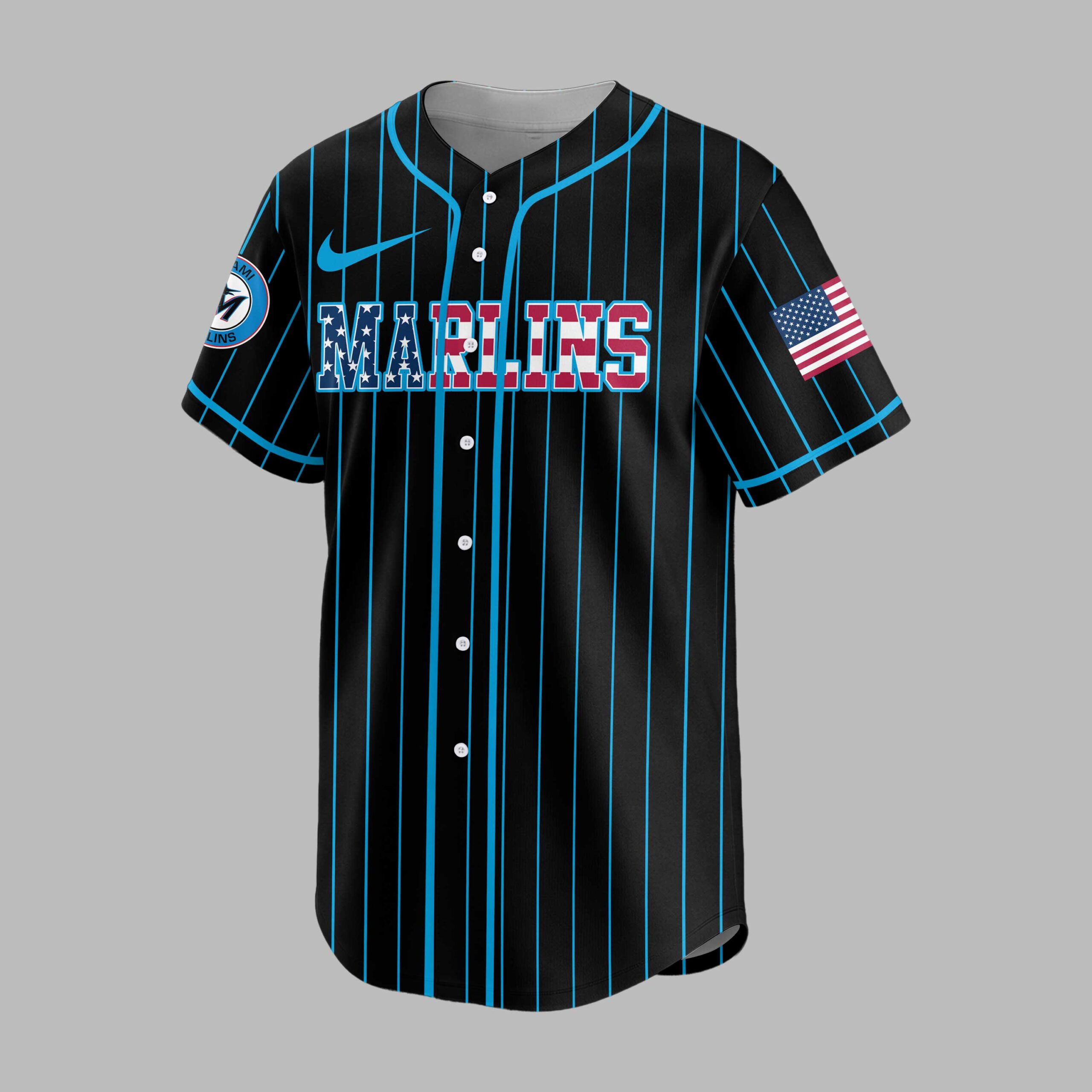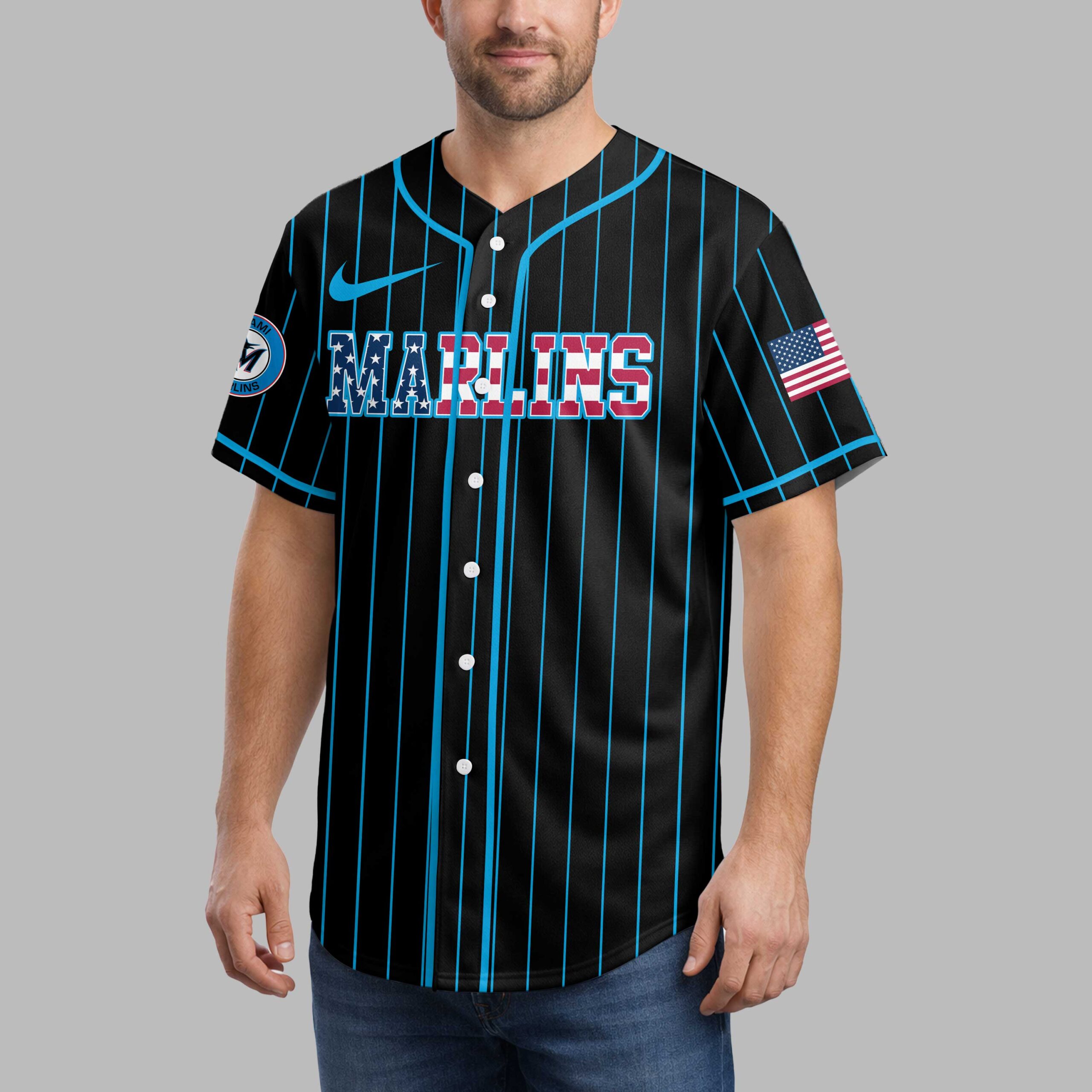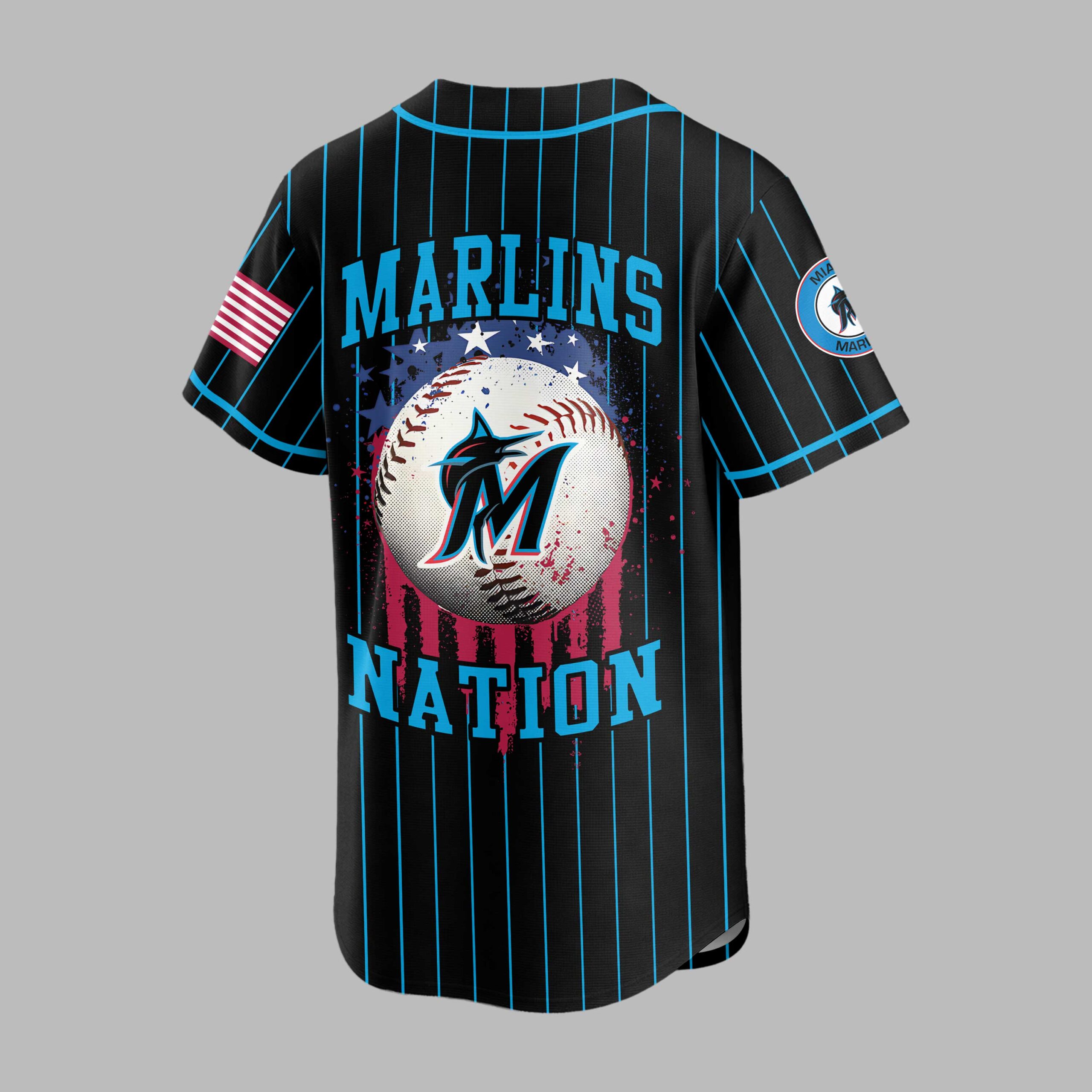 Show your unwavering support for the Miami Marlins with this dynamic patriotic baseball jersey! Crafted for dedicated fans, it blends classic pinstripe style with a bold display of team pride and American spirit, perfect for cheering on your favorite team. The jersey features a sleek black base adorned with vibrant light blue pinstripes. The front proudly displays MARLINS in striking red, white, and blue lettering, complete with a star-spangled design. On the back, a powerful graphic showcases a baseball featuring the iconic Marlins M logo, set against a patriotic backdrop of red and blue splashes and white stars, with NATION boldly printed beneath. Sleeves feature American flag patches and the circular team logo. Perfect for gamedays at the ballpark, watch parties, or simply showcasing your devotion around town, this jersey is a must-have for true Marlins enthusiasts. Wear it to celebrate your team and American baseball spirit.