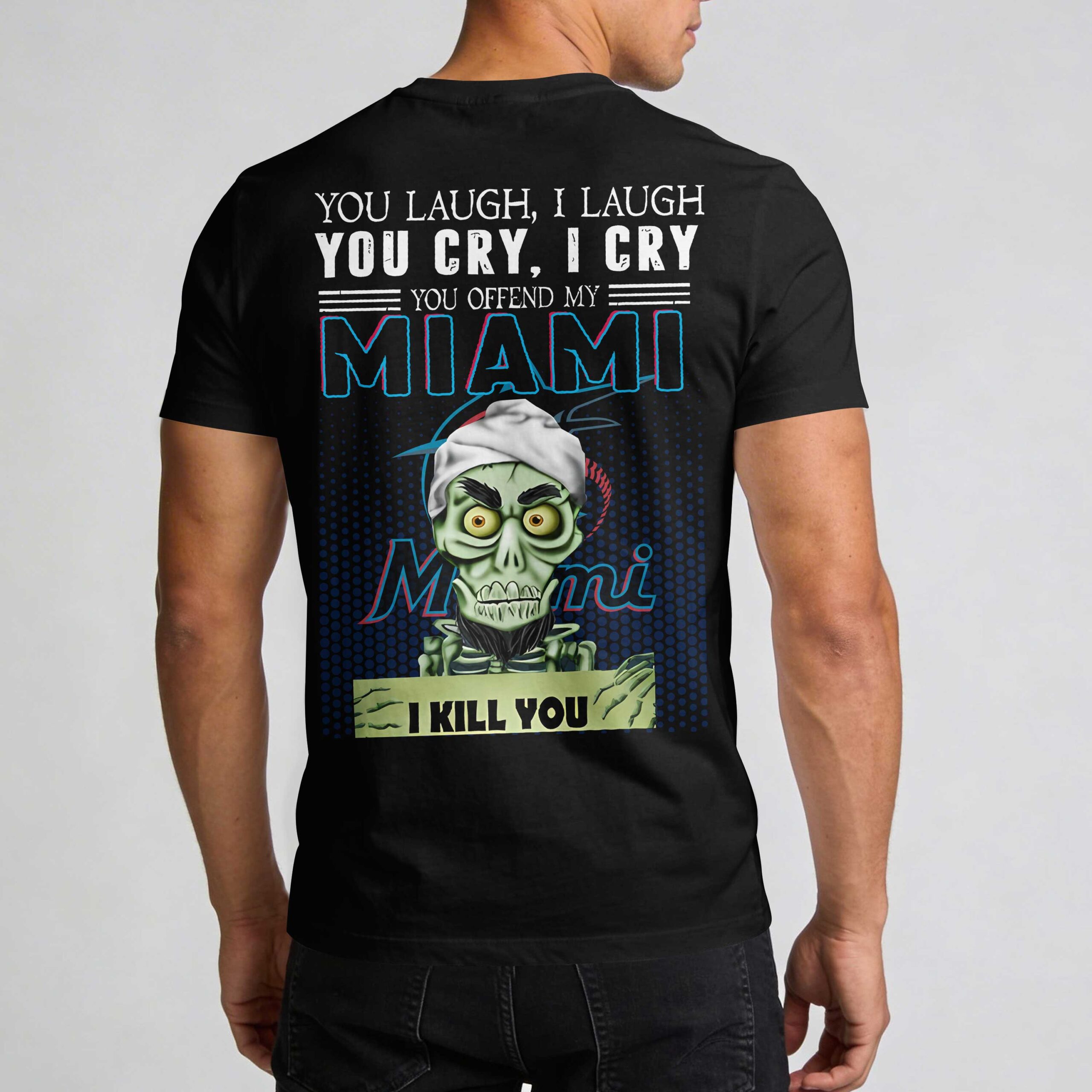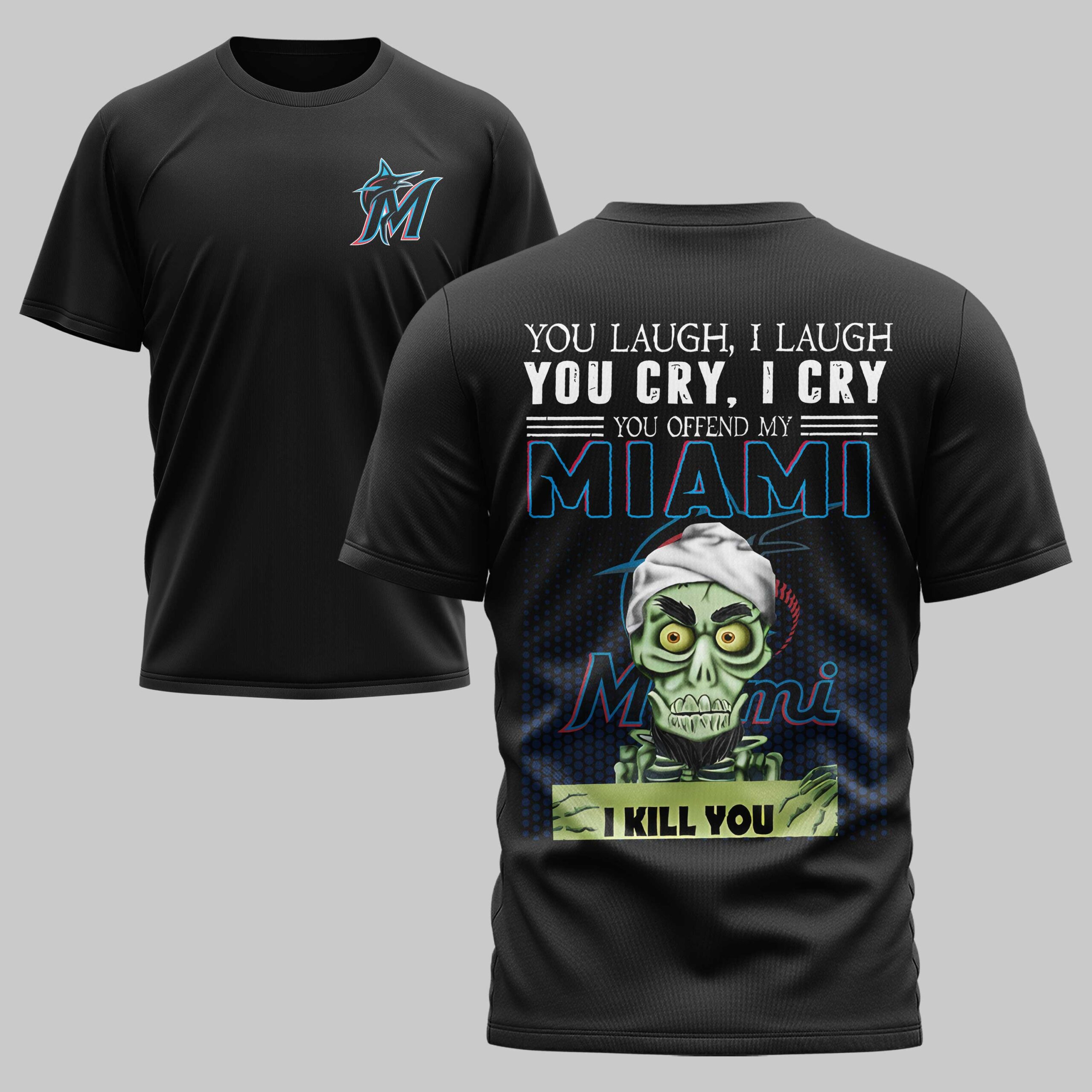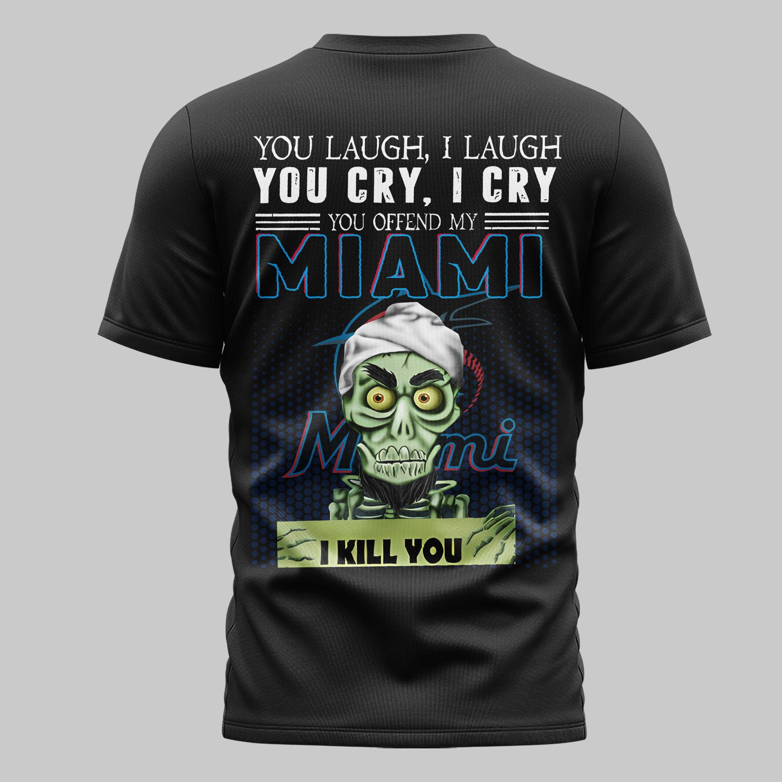 Show your fierce Miami pride with this bold statement tee! Perfect for the fan who doesn’t back down, this shirt embodies unwavering loyalty to your favorite Miami team. It’s a fun and edgy way to let everyone know where your allegiances lie, combining humor with an undeniable sense of team spirit. The front features a striking, stylized M logo, complete with a dynamic fish-like element in vibrant blue and pink accents. Turn around and make a statement with the back design, showcasing a truly unique, ghoulish character in a beanie, holding a sign that reads I KILL YOU. Above, the powerful message YOU LAUGH, I LAUGH YOU CRY, I CRY YOU OFFEND MY MIAMI I KILL YOU is emblazoned, making it clear there’s no messing with your city. Whether you’re catching a game, heading to a watch party, or just out and about, this shirt is designed to turn heads and spark conversations. It’s the ultimate gear for any dedicated Miami supporter looking to express their passion with a bit of playful menace. Wear it proudly and let your Miami spirit shine!