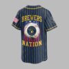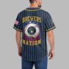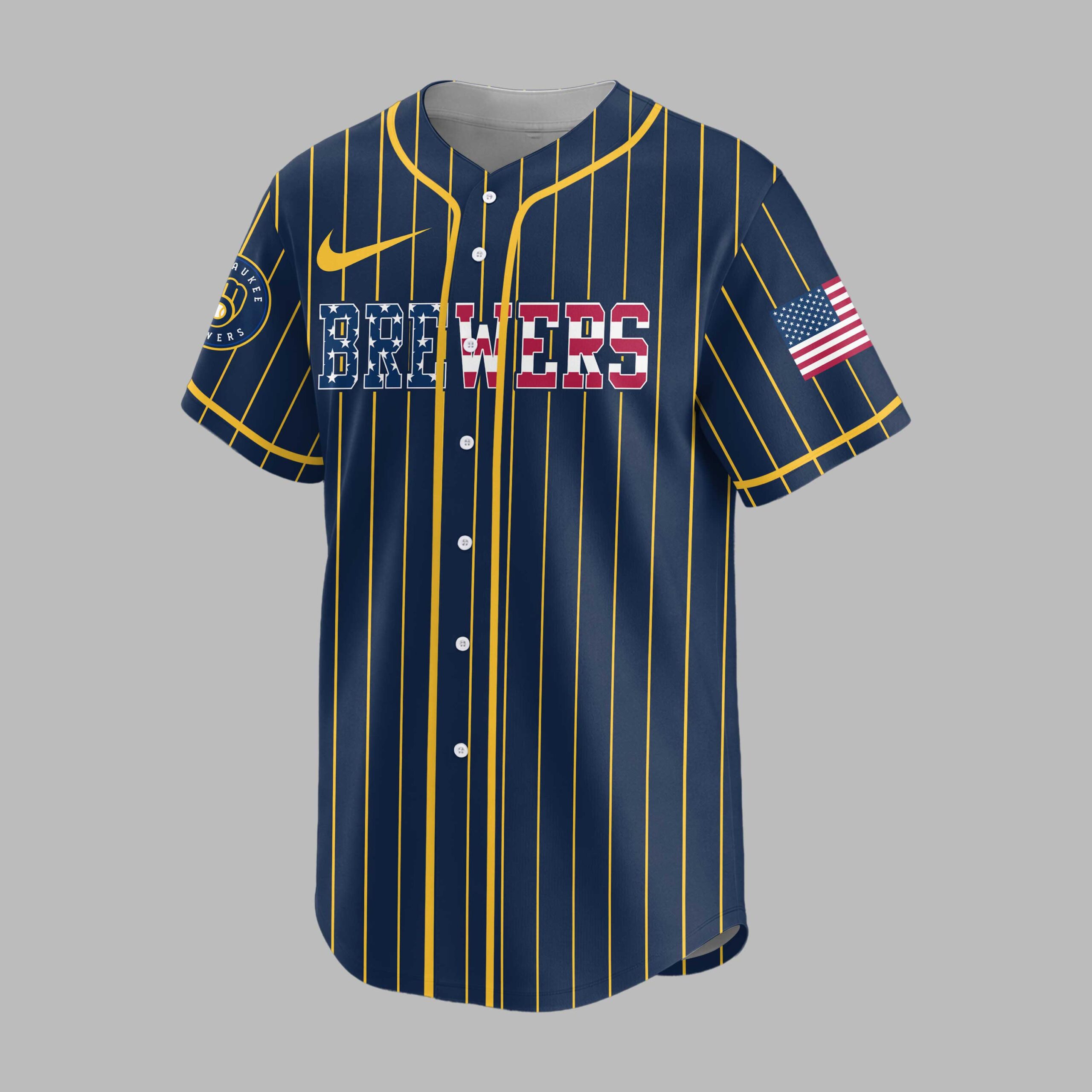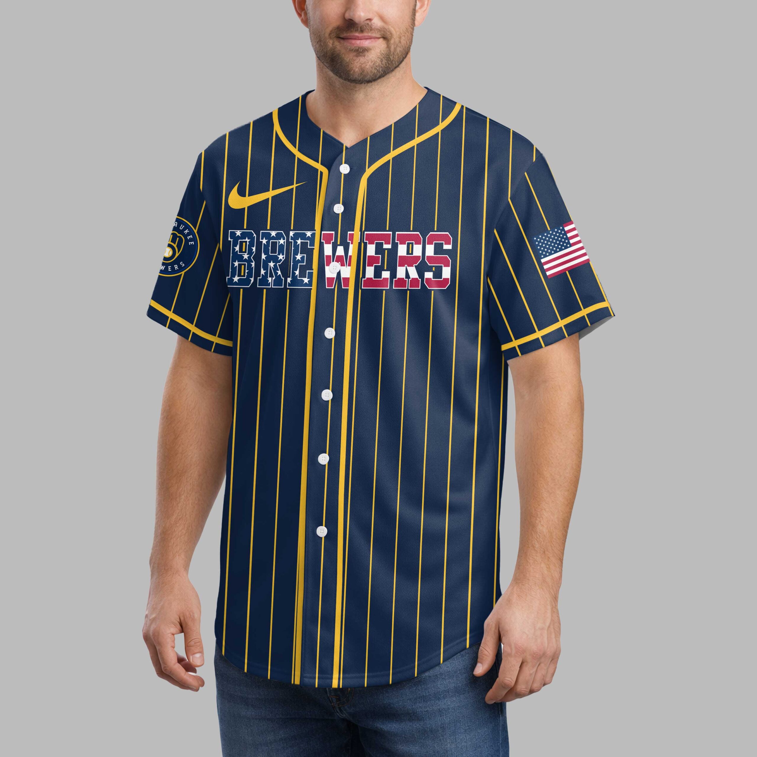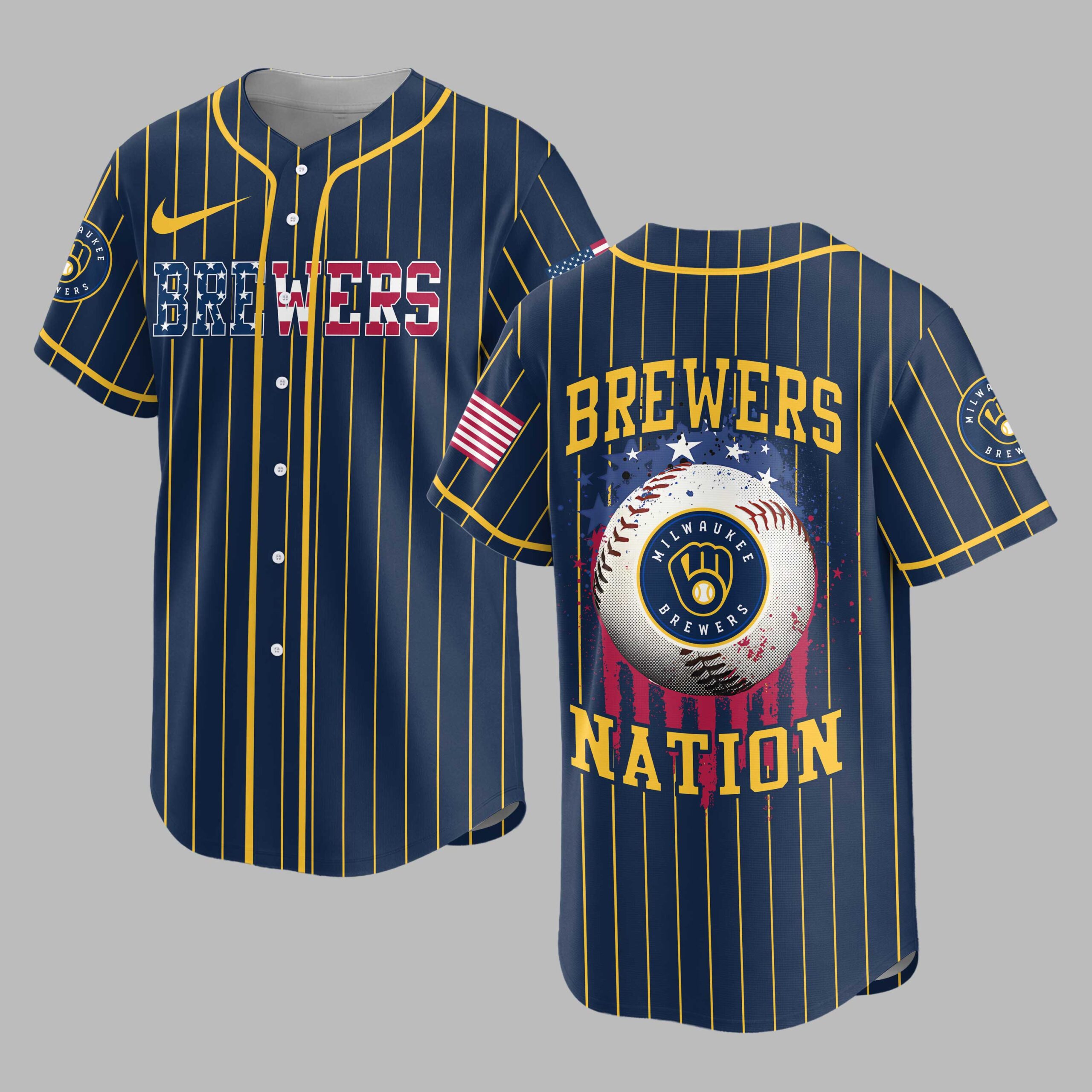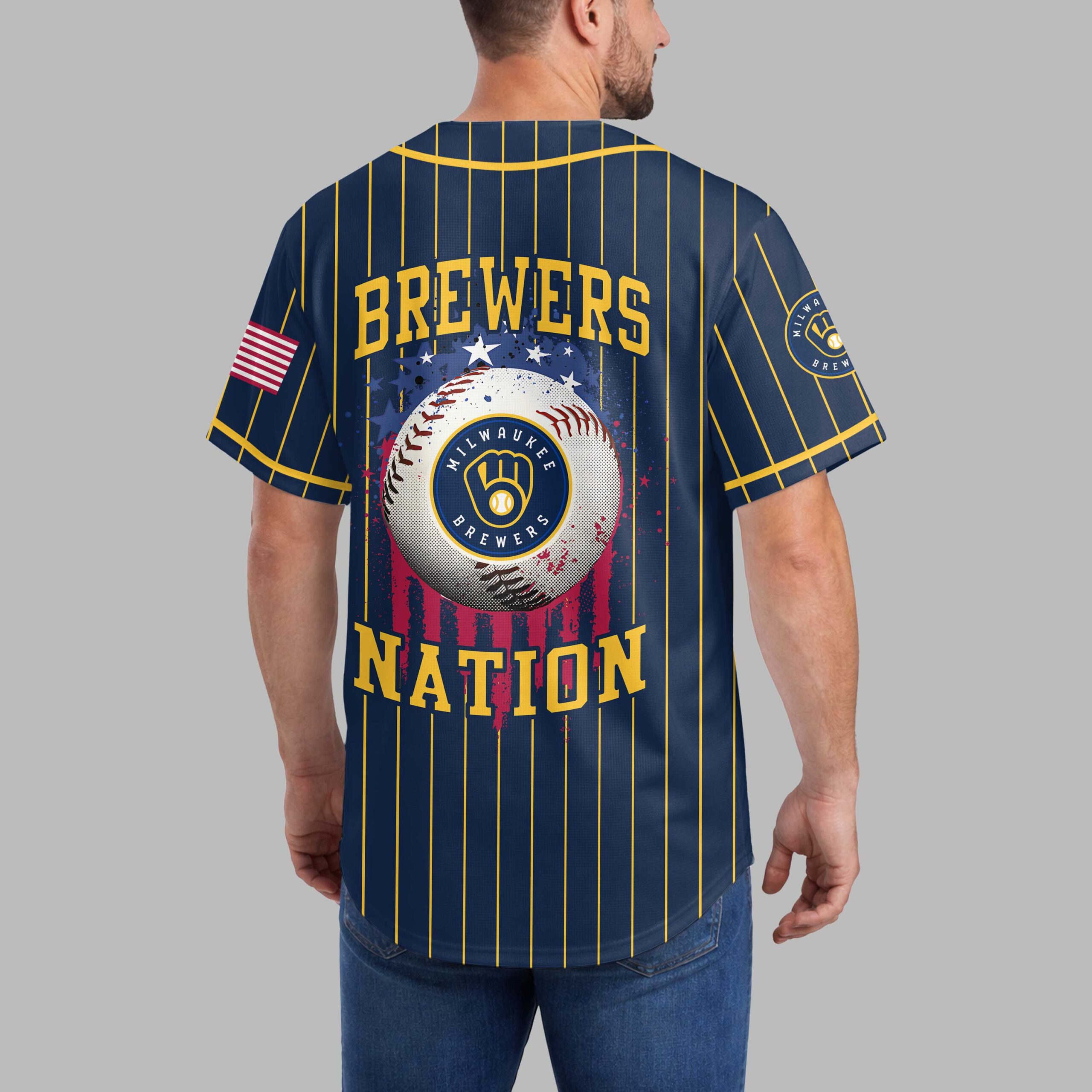 Show your unwavering pride for the Milwaukee Brewers and your country with this standout patriotic baseball jersey! This eye-catching design celebrates your favorite team with a bold American spirit, making it perfect for every dedicated fan. Get ready to cheer on the Brewers with a style that truly makes a statement. The front proudly displays BREWERS in a unique distressed American flag print, set against classic navy blue and yellow pinstripes. The left sleeve features the iconic circular Milwaukee Brewers logo, while a subtle American flag patch adorns the right. Turn heads with the back design, featuring a large baseball centered on a vibrant, distressed flag background, topped with BREWERS and finished with NATION below, solidifying your fan allegiance. Whether you’re catching a game at American Family Field, hosting a watch party, or celebrating national holidays, this jersey is your ultimate fan gear. It’s perfect for summer BBQs, casual outings, or any occasion where you want to combine your love for baseball with patriotic flair. Stand tall and represent your Brewers Nation!