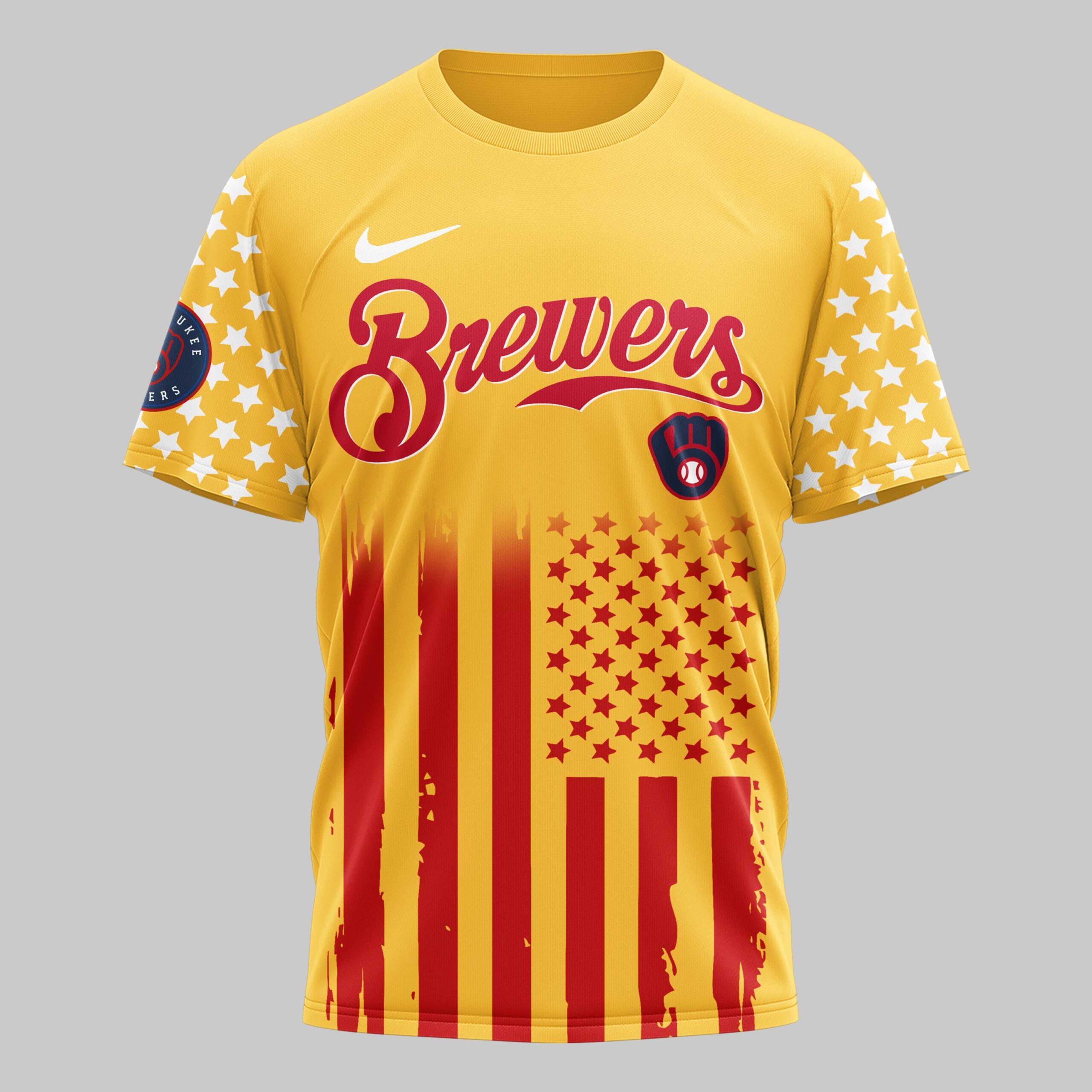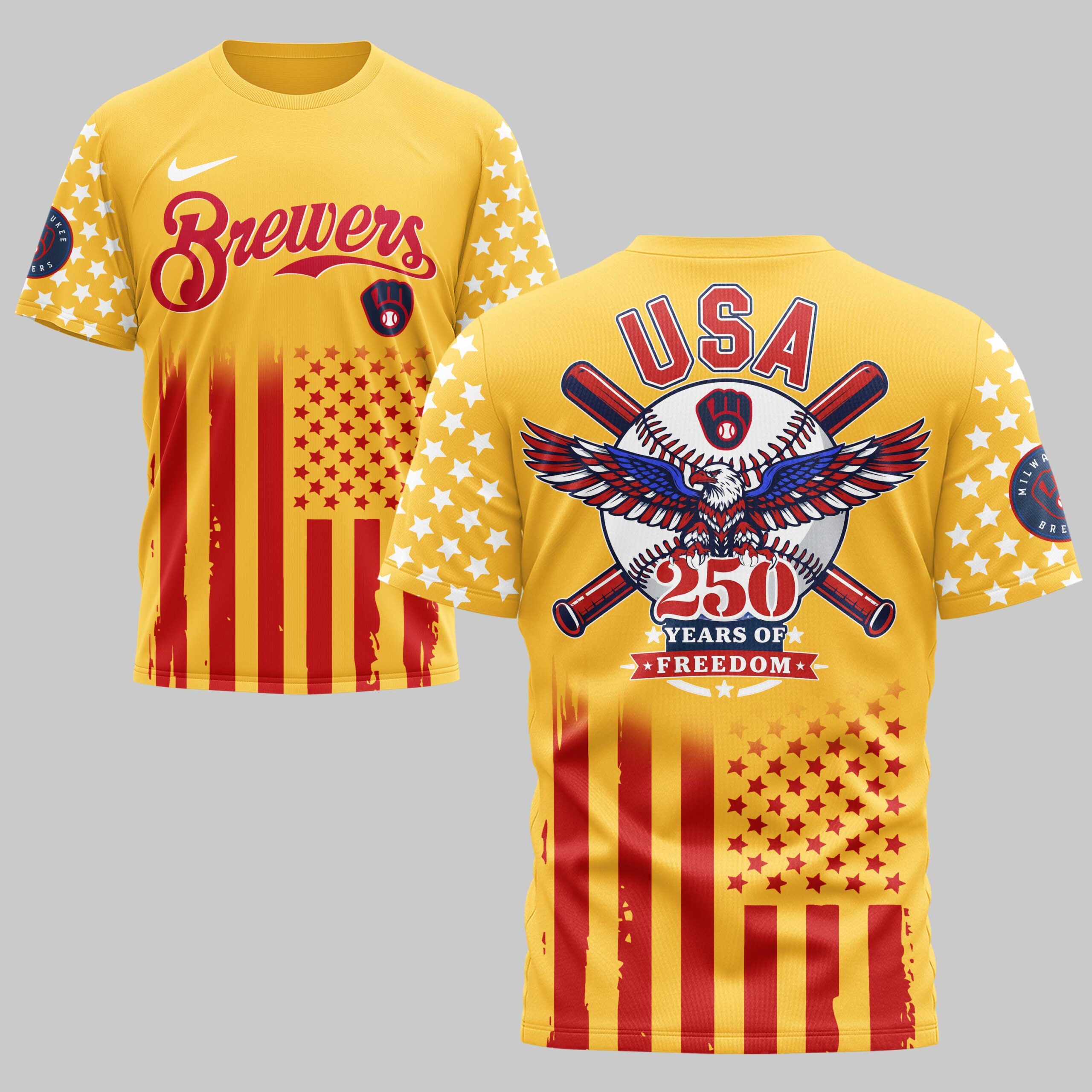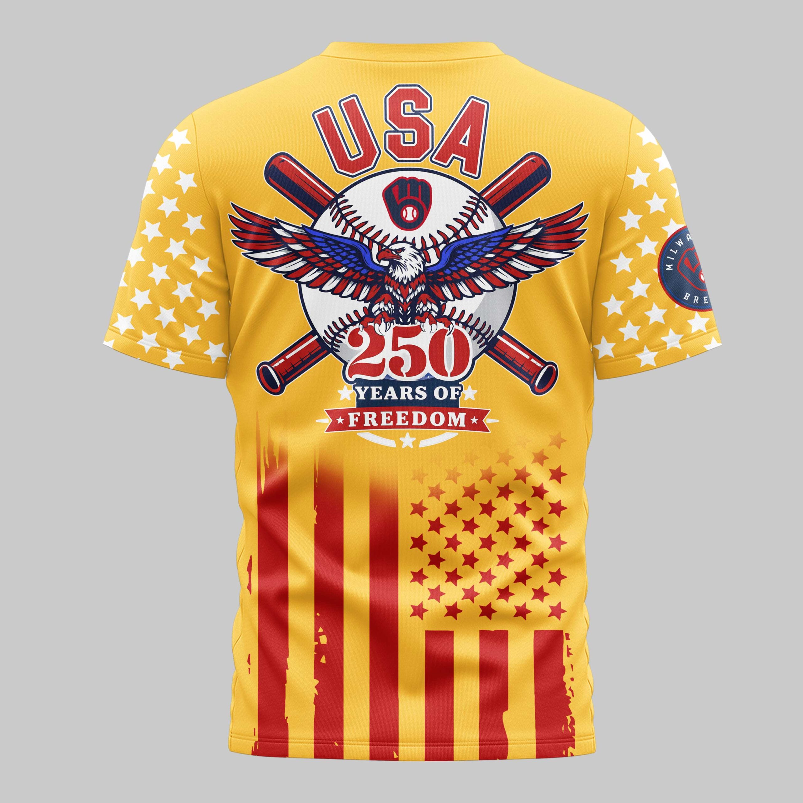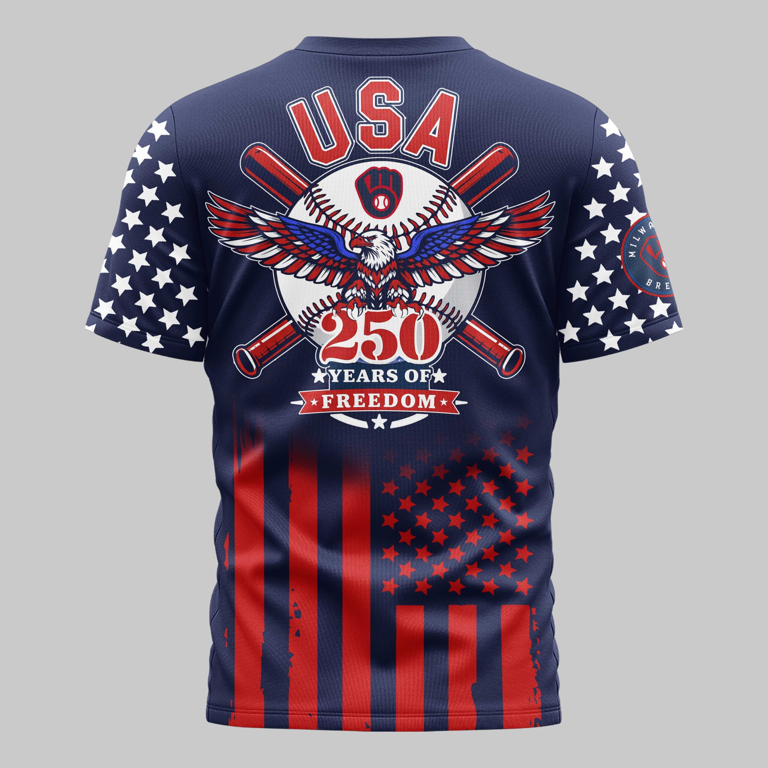 Show off your dual passion for Milwaukee baseball and the red, white, and blue with this Milwaukee Brewers USA 250 Independence T-Shirt. This striking piece of fan gear celebrates a historic national milestone while keeping your Brewers pride front and center. It is the ultimate way for dedicated fans to honor the American spirit alongside their favorite team. The front features the iconic Brewers script and glove logo, accented by patriotic stars on the sleeves and a distressed flag pattern across the bottom. The back showcases a powerful graphic with a majestic bald eagle, crossed bats, and a baseball emblazoned with the team logo. The bold USA 250 Years of Freedom text highlights the commemorative theme. Whether you’re cheering from the stands at the ballpark, attending an Independence Day celebration, or enjoying a casual day out, this shirt is built for game-day energy. It is a must-have for every fan who stands proud for their country and their team.