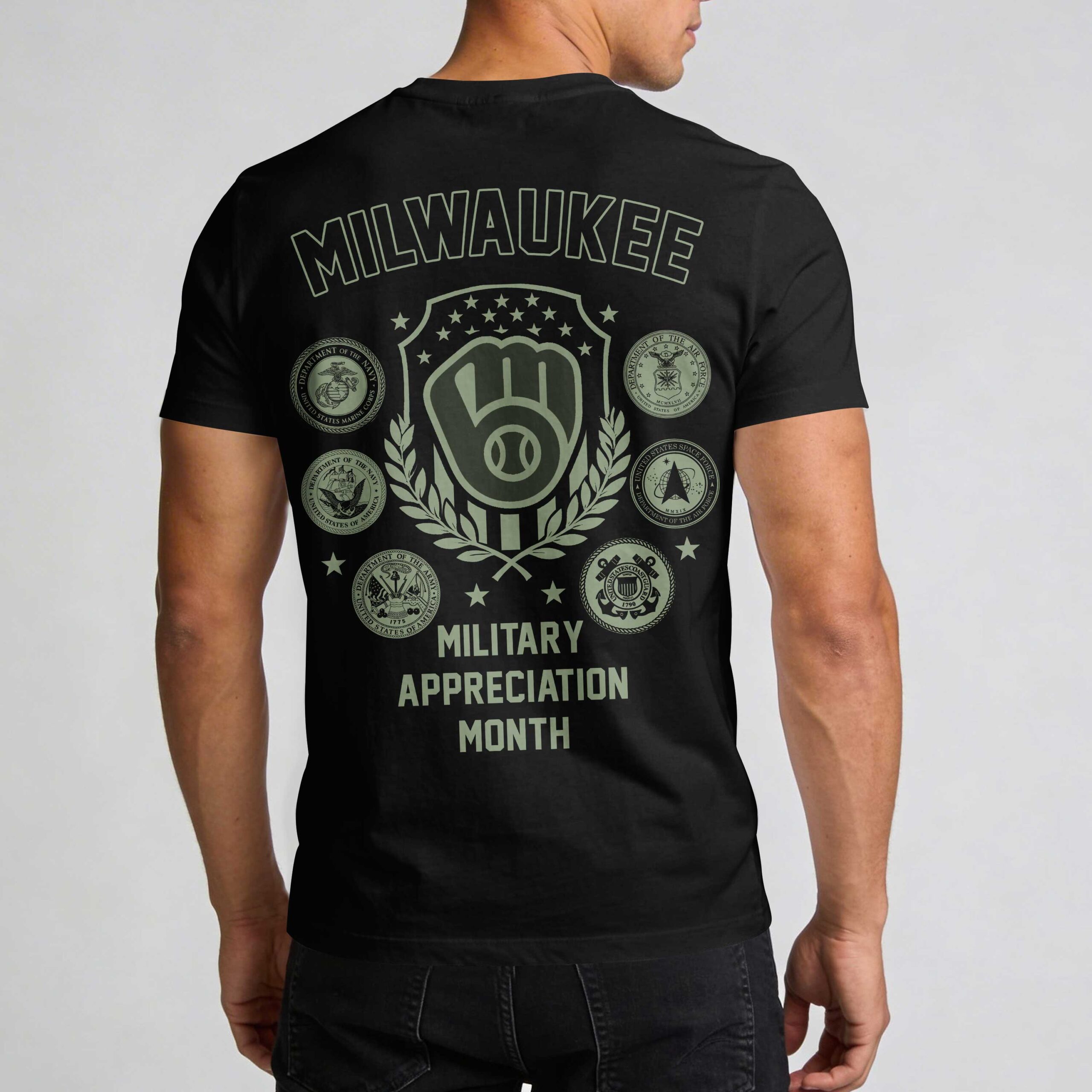 Show your unwavering support for the Milwaukee Brewers and honor those who serve with this striking tribute tee. This shirt combines deep-rooted team pride with a powerful patriotic message, making it a standout choice for any dedicated fan. It’s a bold way to celebrate the spirit of the game and our nation’s heroes. The front features the iconic Brewers script and glove logo in a bold military-inspired olive green. On the back, MILWAUKEE arches over a detailed shield displaying the ball-in-glove logo. It is surrounded by the official seals of the US Armed Forces—including the Army, Navy, Air Force, Marines, Coast Guard, and Space Force—commemorating Military Appreciation Month with a commanding design. Perfect for cheering from the stands, attending Independence Day festivities, or everyday wear, this shirt is a must-have for the Milwaukee faithful. Wear it proudly to show your loyalty to the Brew Crew and your respect for the military during gameday and beyond.