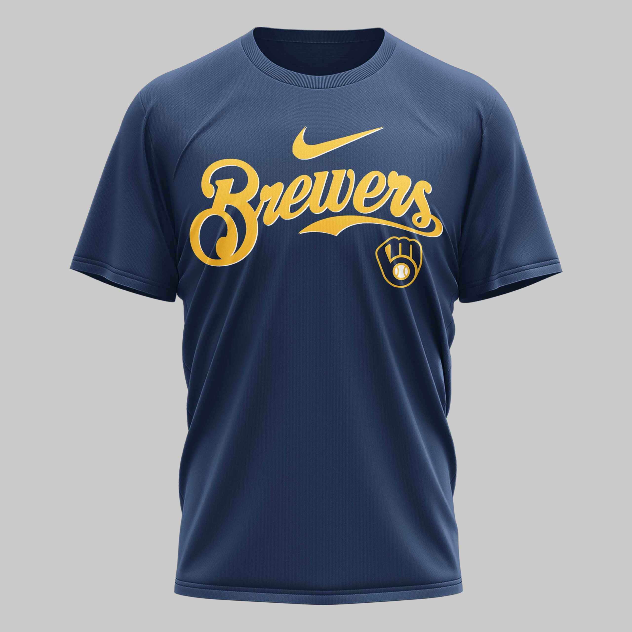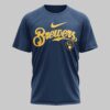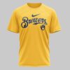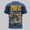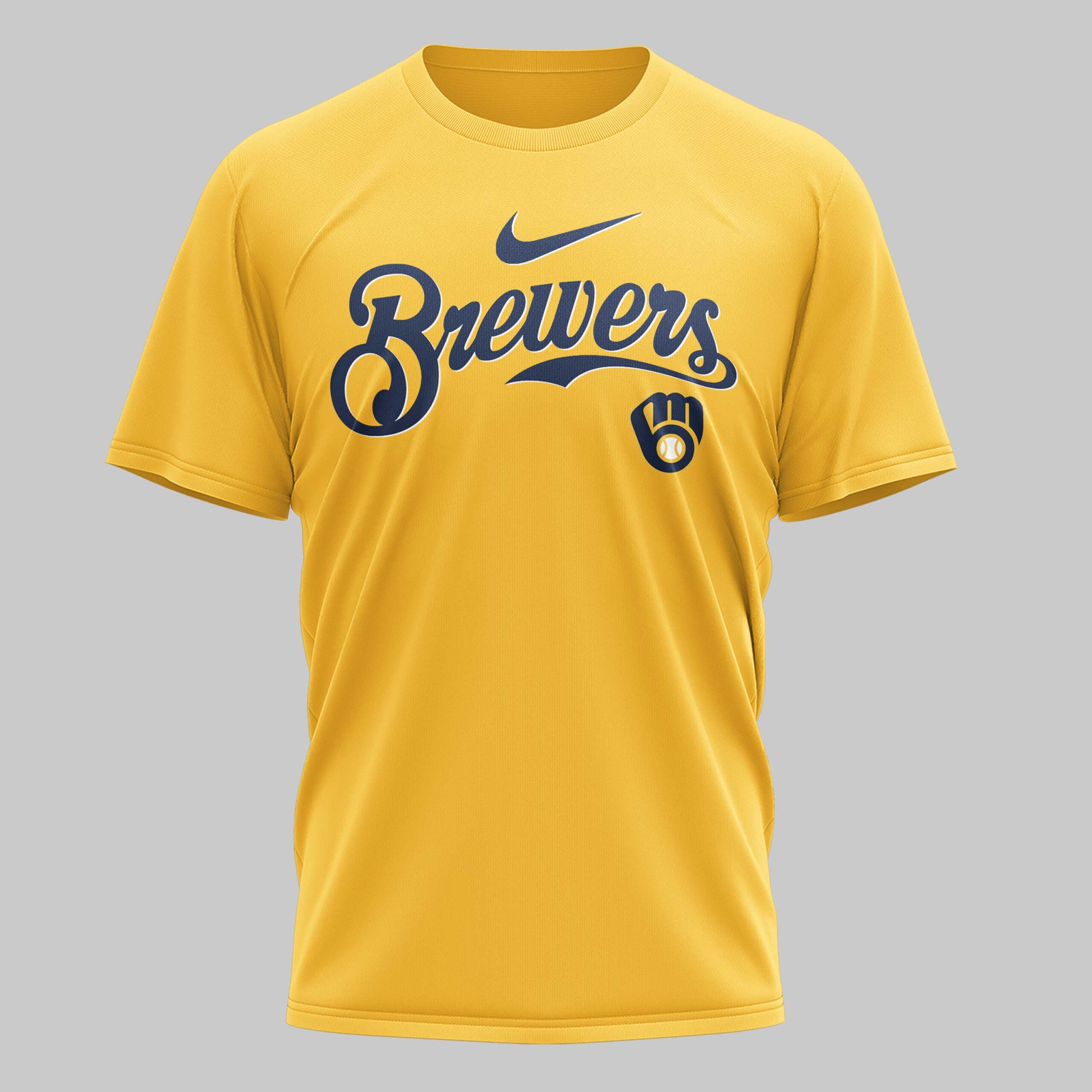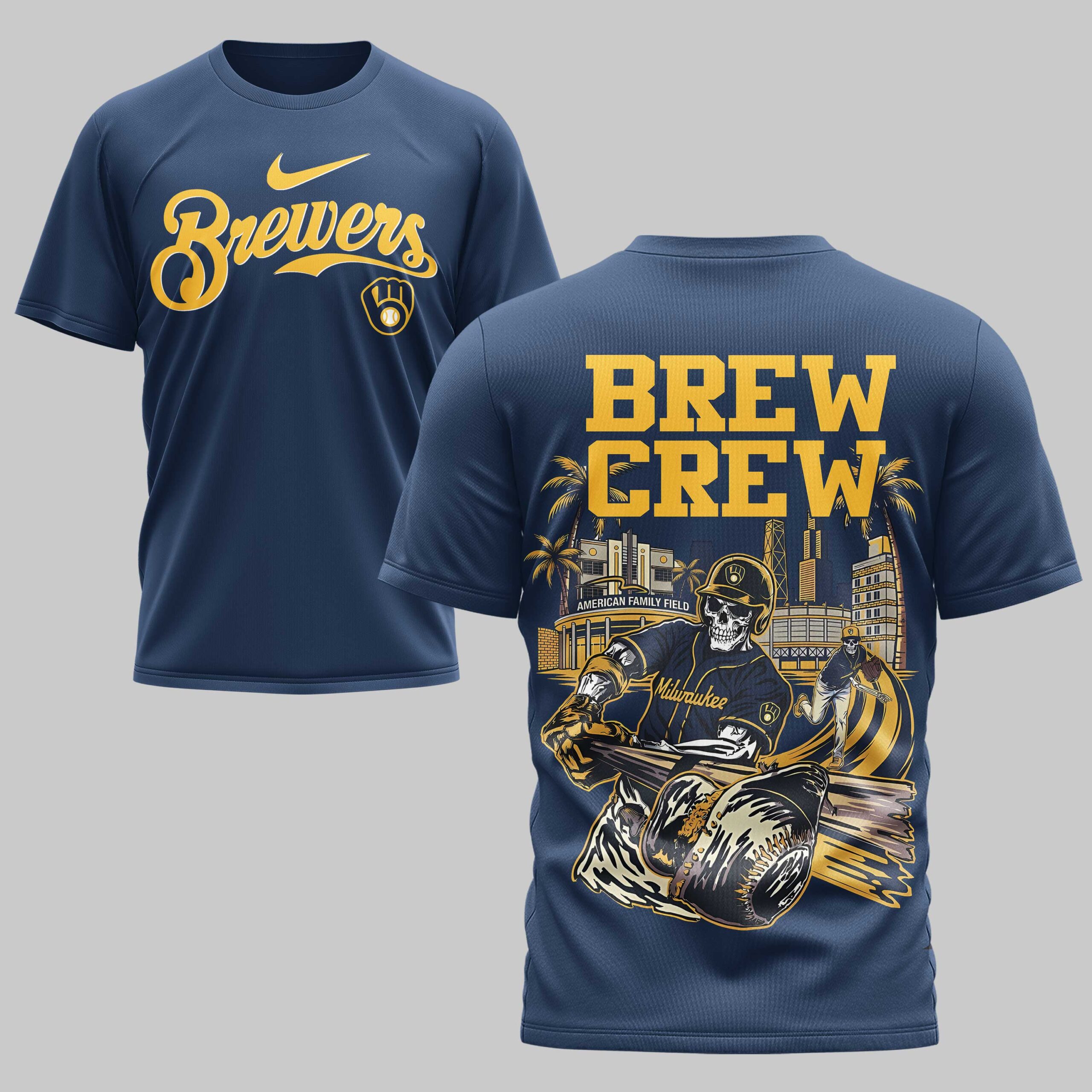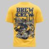 Unleash your ultimate fan spirit with this unique Milwaukee Brewers tee! Perfect for those who cheer loud and proud, this shirt celebrates your favorite team with a bold, distinctive design that stands out in any crowd. Show your devotion to the Brew Crew and let everyone know where your loyalty lies. The front proudly displays the classic Brewers script logo in navy and white on a vibrant yellow background. Turn around, and the real game begins with a dynamic back graphic featuring BREW CREW above a stylized Milwaukee skyline, including American Family Field. Dominating the scene are spirited skeleton baseball players, one ready to bat and another pitching, each sporting Milwaukee on their jersey sleeves, adding an edgy twist to your team pride. This shirt is your go-to for gamedays at the stadium, watch parties with friends, or simply showing off your Milwaukee love around town. It’s a guaranteed conversation starter and an essential piece for any true Brewers fan looking for something beyond the ordinary.