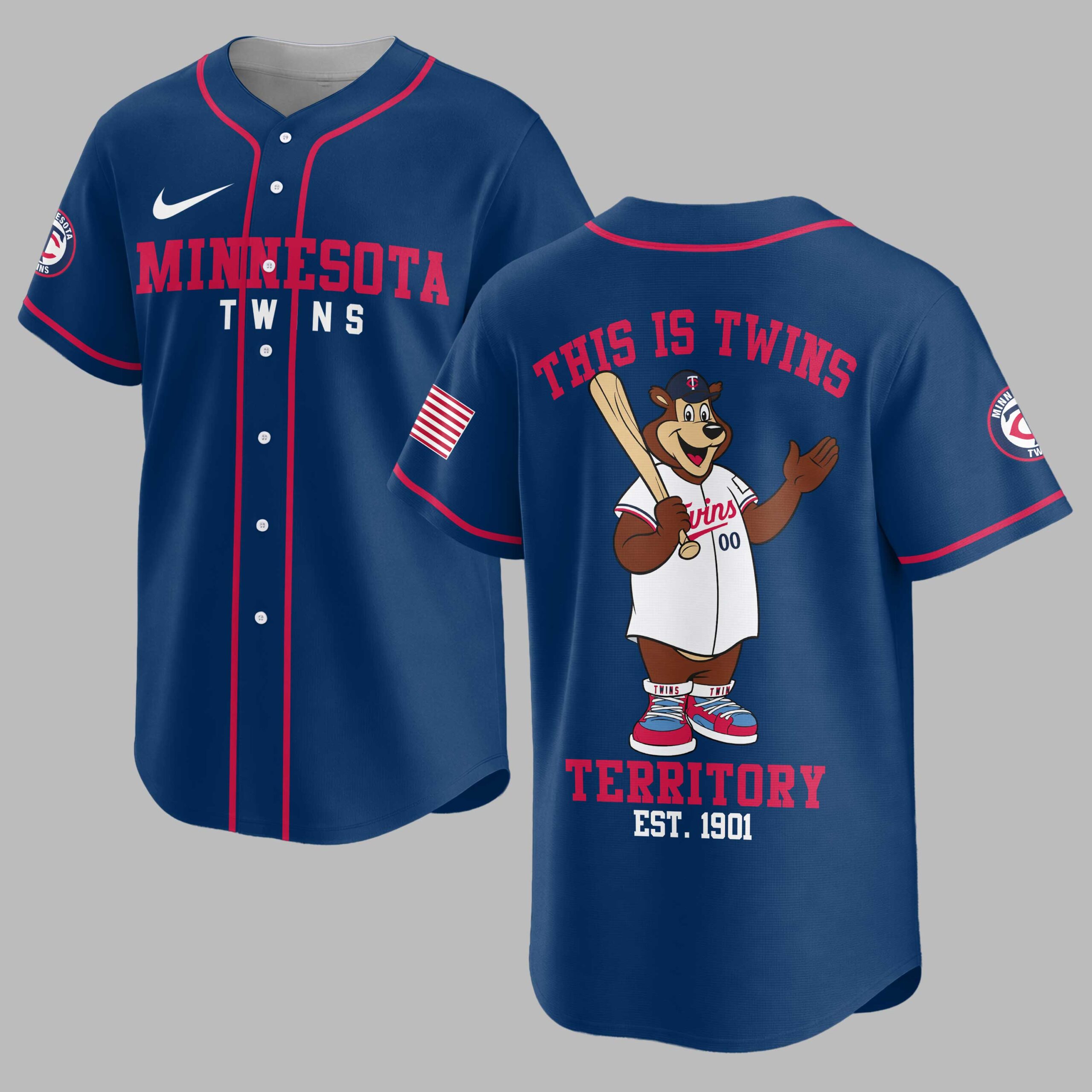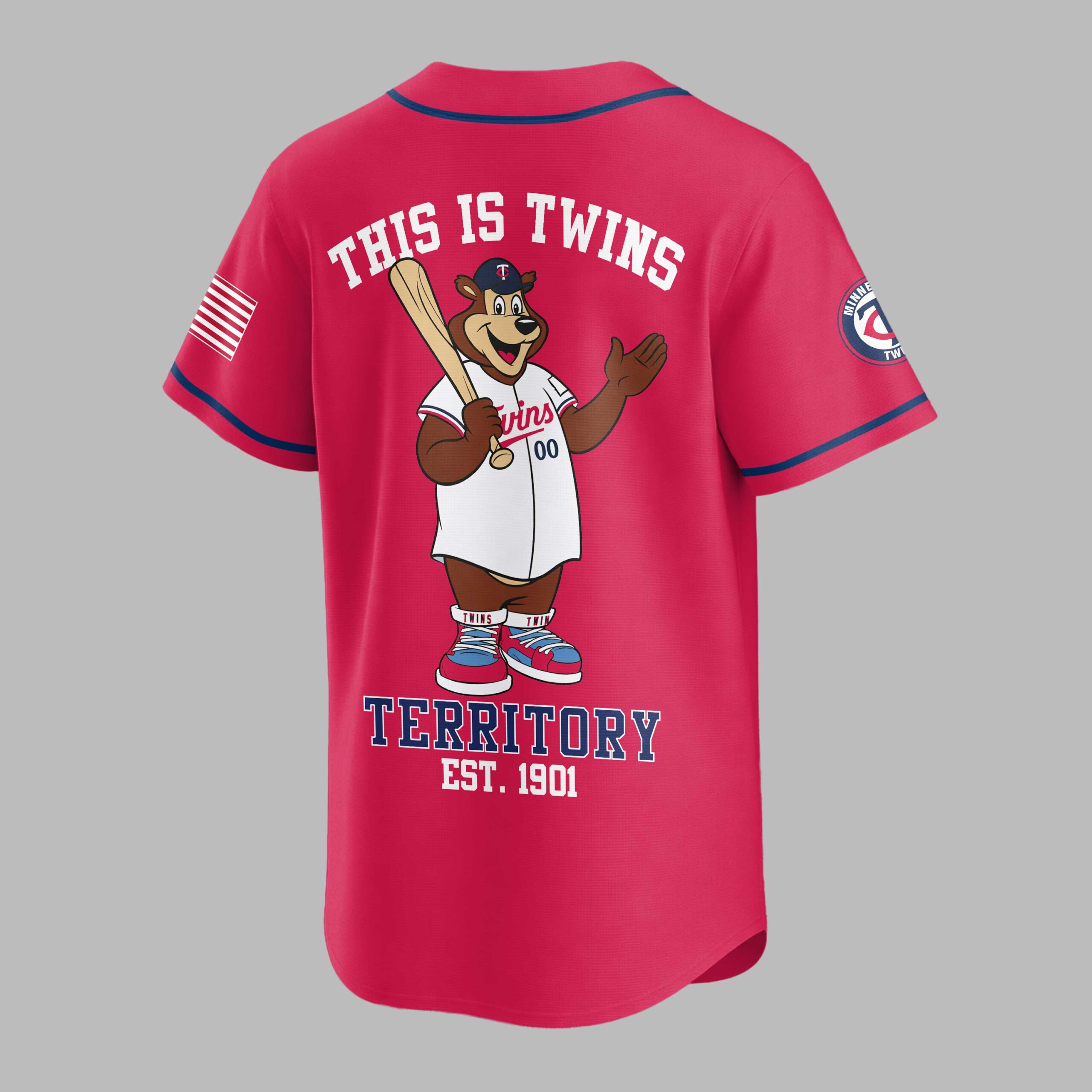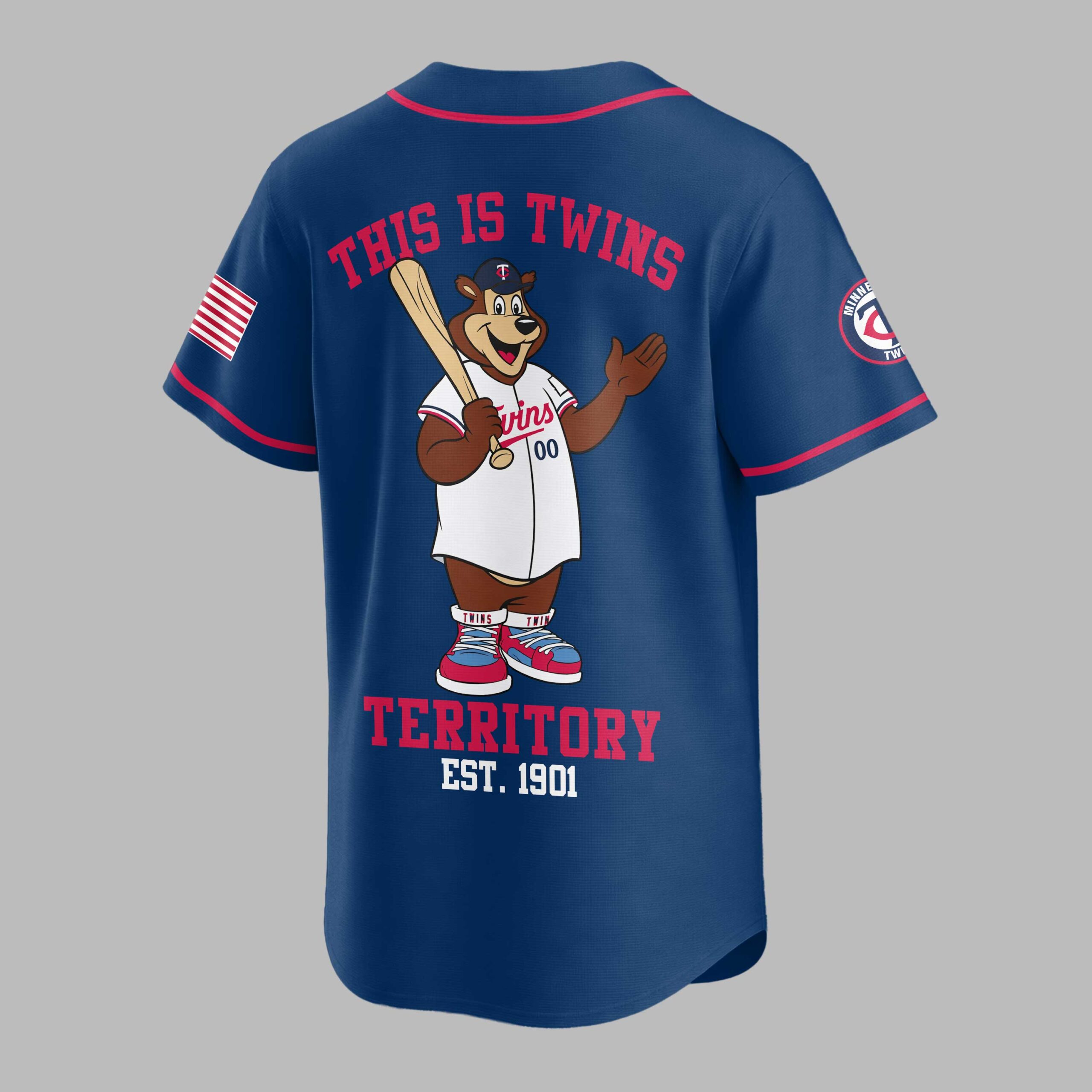 Rally behind your favorite team with this vibrant Minnesota Twins baseball fan jersey, a true testament to your enduring loyalty. Embody the spirit of game day and let everyone know where your allegiance lies with this essential piece of fan apparel, designed for every devoted Twins supporter. The front proudly displays MINNESOTA TWINS in bold red and blue lettering across the chest, complemented by a classic circular team logo on the sleeve and a patriotic American flag design. The back of the jersey comes alive with the beloved Twins bear mascot, bat in hand, beneath the rallying cry THIS IS TWINS. Below, TERRITORY EST. 1901 is boldly stated, making a powerful statement of team pride. Whether you’re at the ballpark, hosting a game day party, or simply out and about, this jersey is the perfect way to showcase your Twins spirit. It’s an ideal choice for celebrating victories, attending watch parties, or adding a touch of sporty flair to your everyday wardrobe.