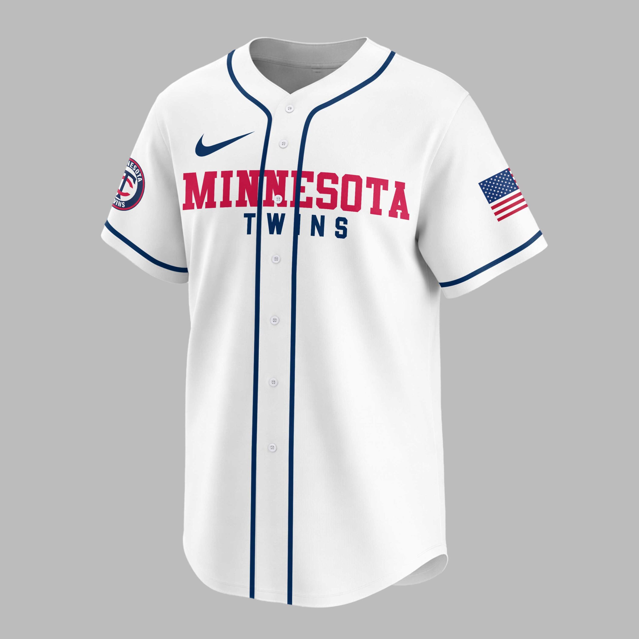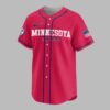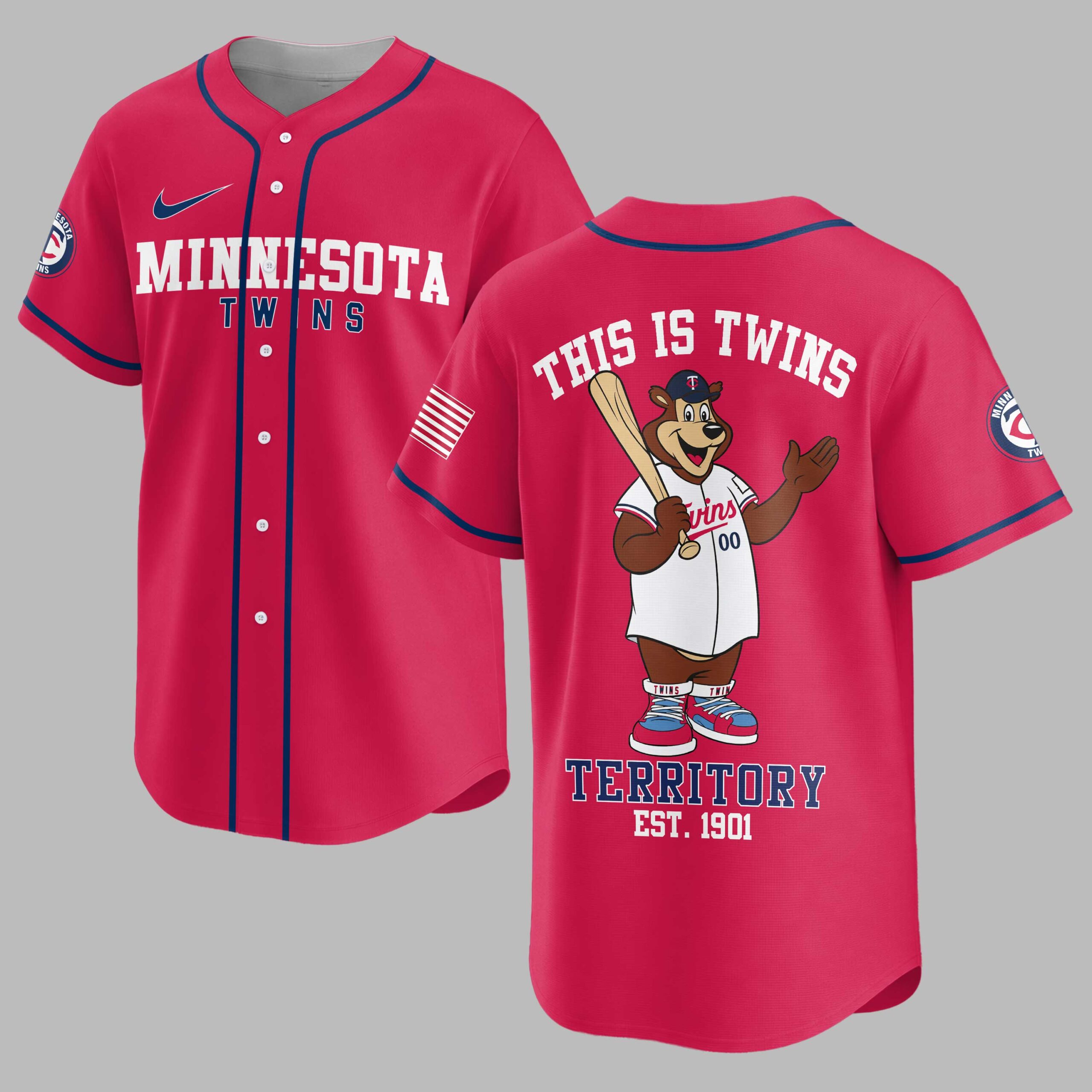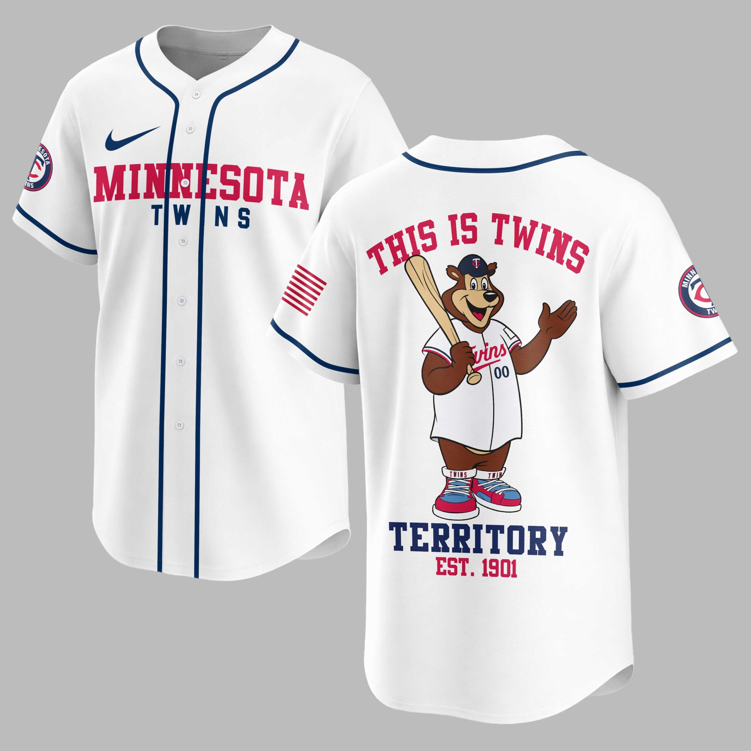 Rally behind your favorite team with this vibrant Minnesota Twins baseball fan jersey, a true testament to your enduring loyalty. Embody the spirit of game day and let everyone know where your allegiance lies with this essential piece of fan apparel, designed for every devoted Twins supporter. The front proudly displays MINNESOTA TWINS in bold red and blue lettering across the chest, complemented by a classic circular team logo on the sleeve and a patriotic American flag design. The back of the jersey comes alive with the beloved Twins bear mascot, bat in hand, beneath the rallying cry THIS IS TWINS. Below, TERRITORY EST. 1901 is boldly stated, making a powerful statement of team pride. Whether you’re at the ballpark, hosting a game day party, or simply out and about, this jersey is the perfect way to showcase your Twins spirit. It’s an ideal choice for celebrating victories, attending watch parties, or adding a touch of sporty flair to your everyday wardrobe.