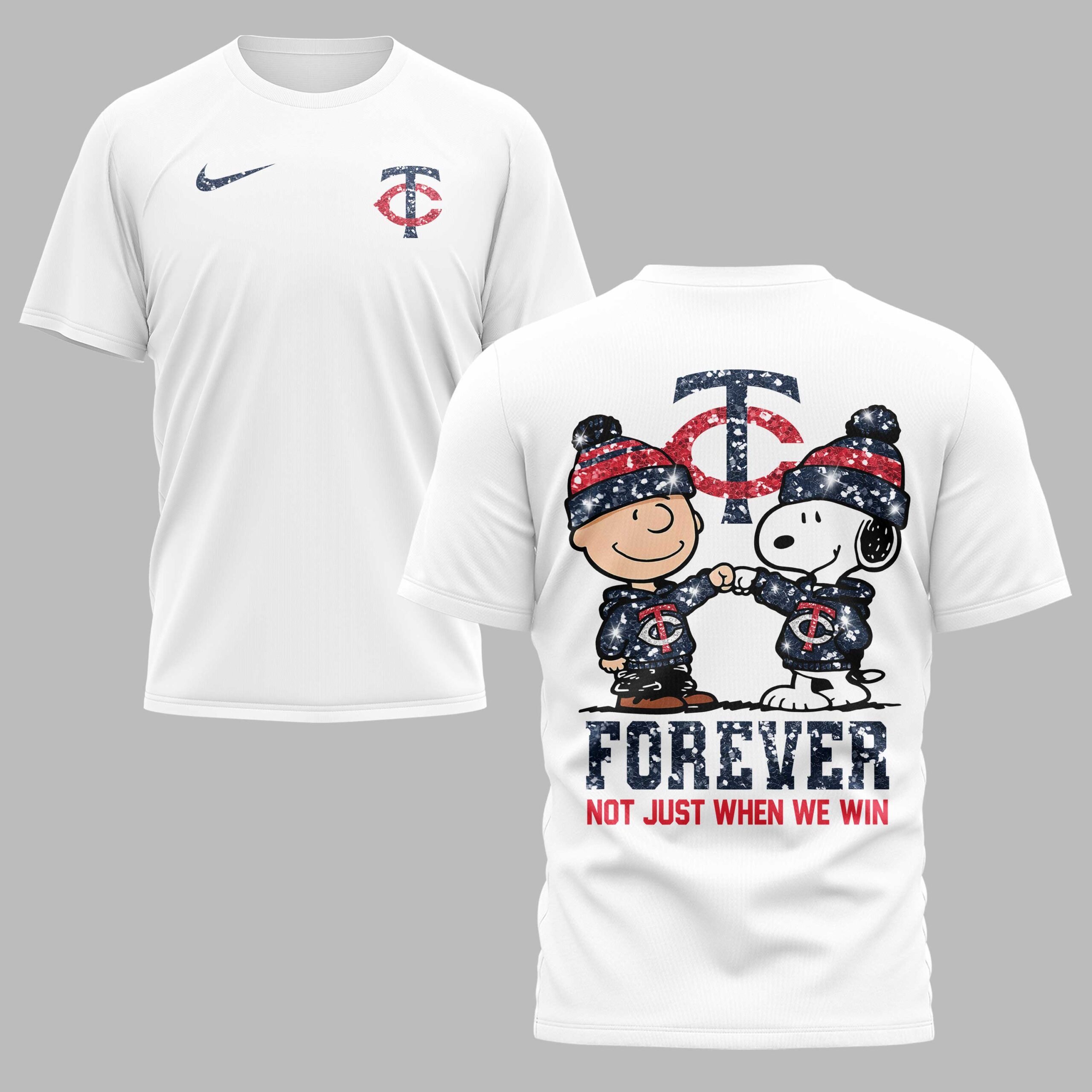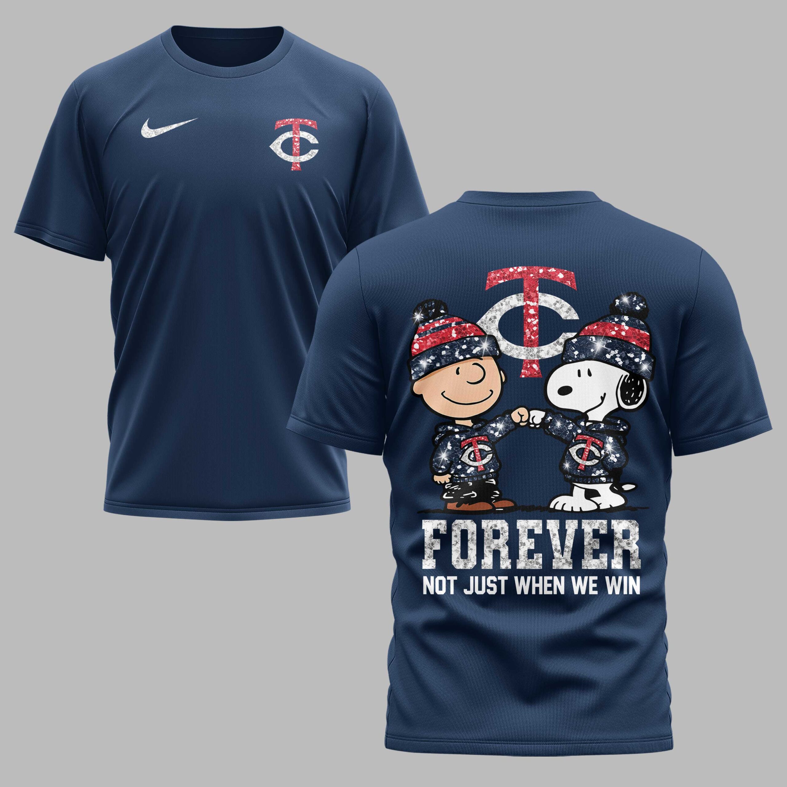 Show your Minnesota Twins devotion with this spirited fan T-shirt, starring Charlie Brown and Snoopy! This design perfectly captures true team loyalty, proving your support shines through every season. It’s the ultimate way for dedicated fans to express their passion with a fun, nostalgic touch. The front features a distressed TC Twins logo and a Nike swoosh. The back makes a bold statement: Charlie Brown and Snoopy, in glitter-accented Twins hoodies and hats, share a loyal fist bump. A large TC logo sits above, and FOREVER NOT JUST WHEN WE WIN below declares your deep commitment. Perfect for game days, watch parties, or casual outings, this T-shirt lets you express your Twins spirit comfortably. Wear it proudly to any event or occasion, celebrating your team and everlasting loyalty!