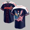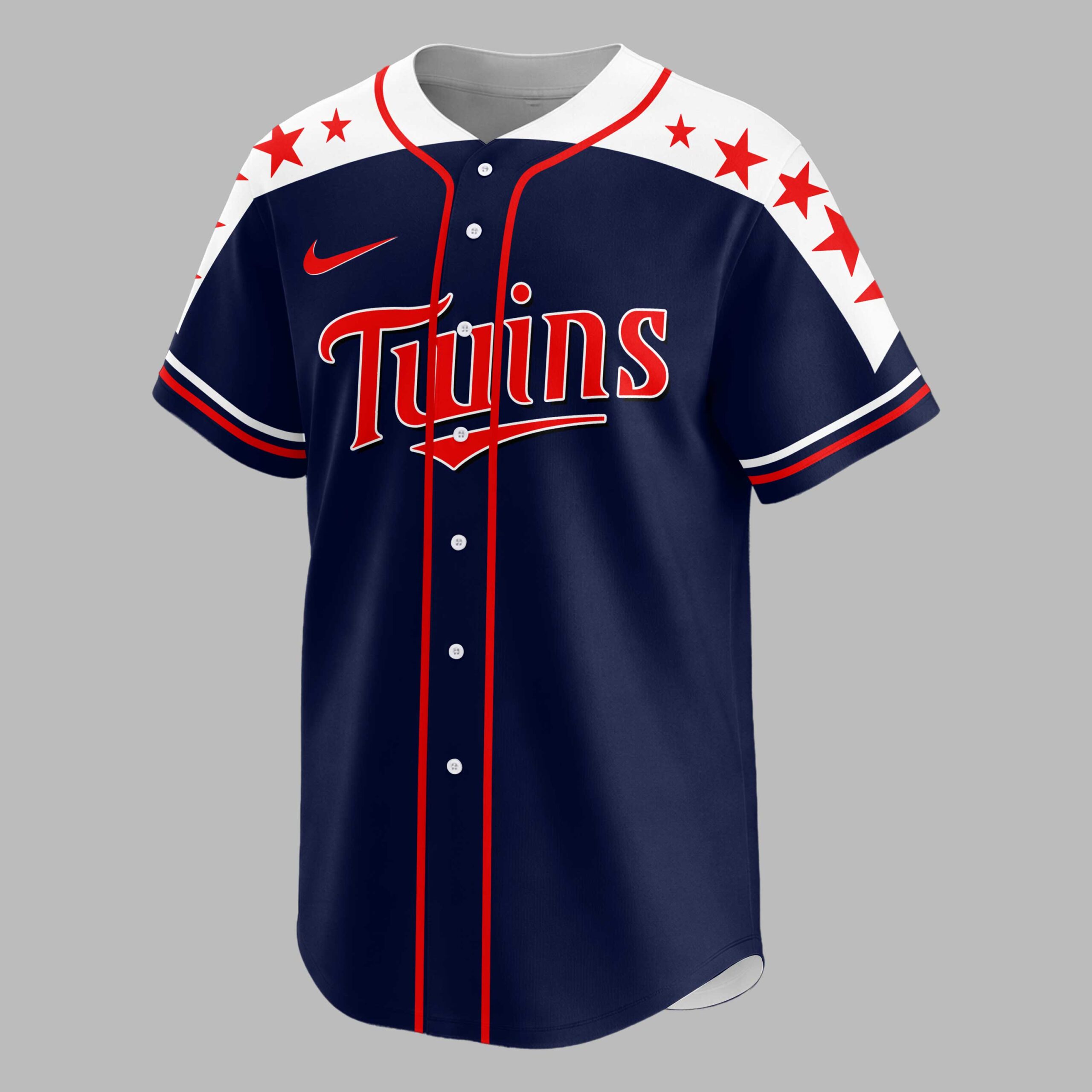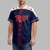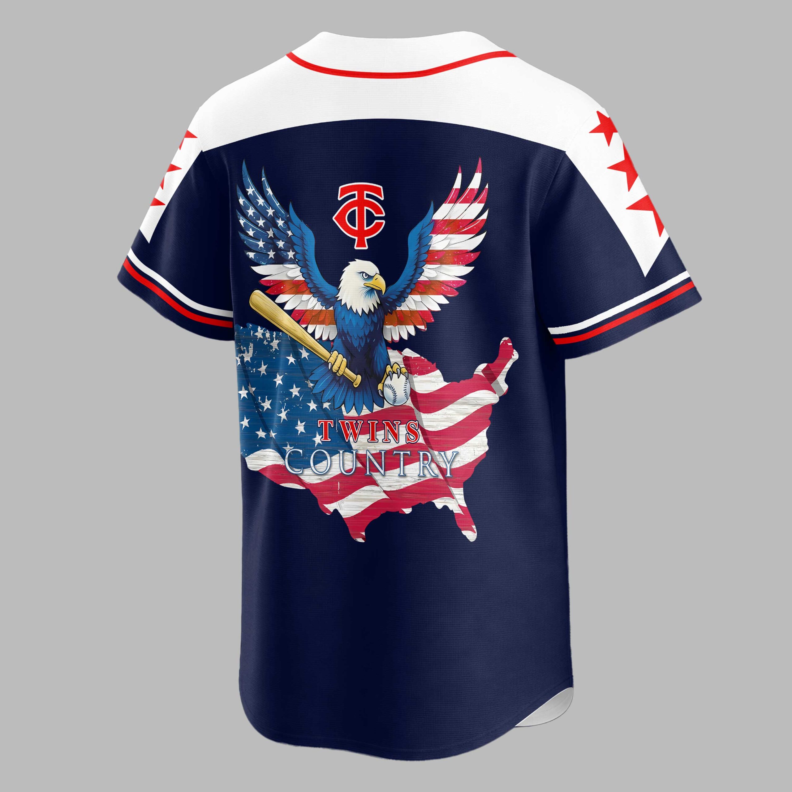 Show your unwavering pride for both the Minnesota Twins and the USA with this vibrant patriotic baseball jersey! Designed for dedicated fans, this shirt brilliantly merges your love for America’s favorite pastime with a powerful display of national spirit, making it an essential addition to any Twins supporter’s wardrobe. The front of the jersey proudly displays Twins in classic red script, outlined in white, against a rich navy blue background. White shoulder panels adorned with striking red stars add an extra touch of flair. Flip it around to reveal an impressive graphic featuring a majestic bald eagle with wings in a stars-and-stripes pattern, holding a baseball bat and ball, all set against a distressed American flag map of the USA. The bold TWINS COUNTRY text and the iconic TC logo complete this spirited design. Whether you’re cheering from the stands at Target Field, celebrating national holidays, or simply enjoying a summer day, this jersey is perfect for showcasing your allegiance. It’s an ideal choice for game days, barbecues, or any occasion where you want to wear your Twins pride and patriotic spirit loud and clear.