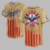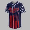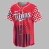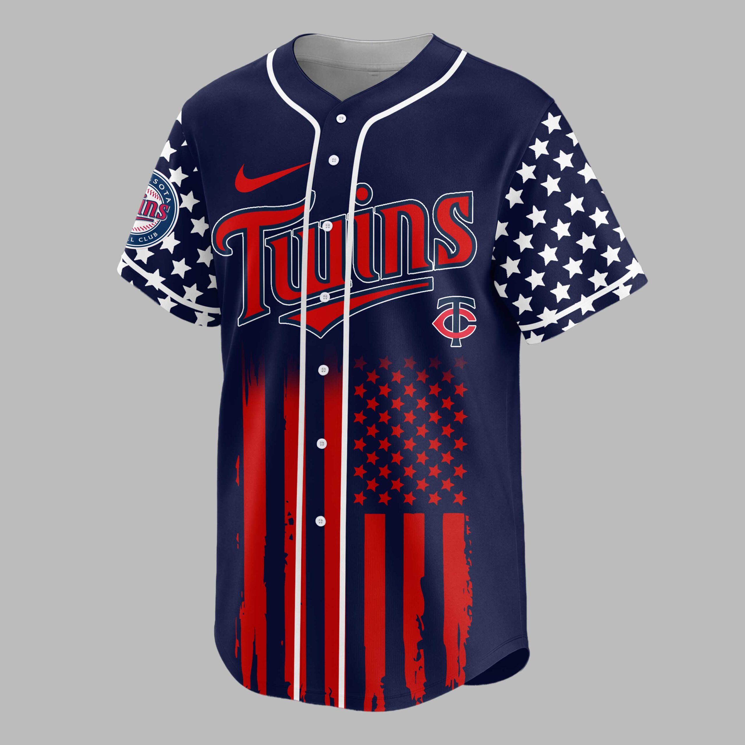 Show your unwavering support for the Minnesota Twins and celebrate a monumental milestone with this striking patriotic baseball jersey. It’s the perfect way to honor your favorite team and 250 years of American freedom, blending sports passion with national pride. The front proudly showcases the iconic ‘Twins’ lettering in a classic red, white, and blue, set against a backdrop of patriotic stars and distressed flag-inspired stripes. The back makes a powerful statement with a bold ‘USA’ graphic, an eagle spreading its wings over crossed baseball bats and a ‘250 Years of Freedom’ banner, all seamlessly integrated with more flag elements. Wear this striking jersey to Target Field, during patriotic celebrations, or any day you want to showcase your unwavering spirit. It’s the perfect blend of baseball fandom and national pride, making it an essential addition for any true fan.