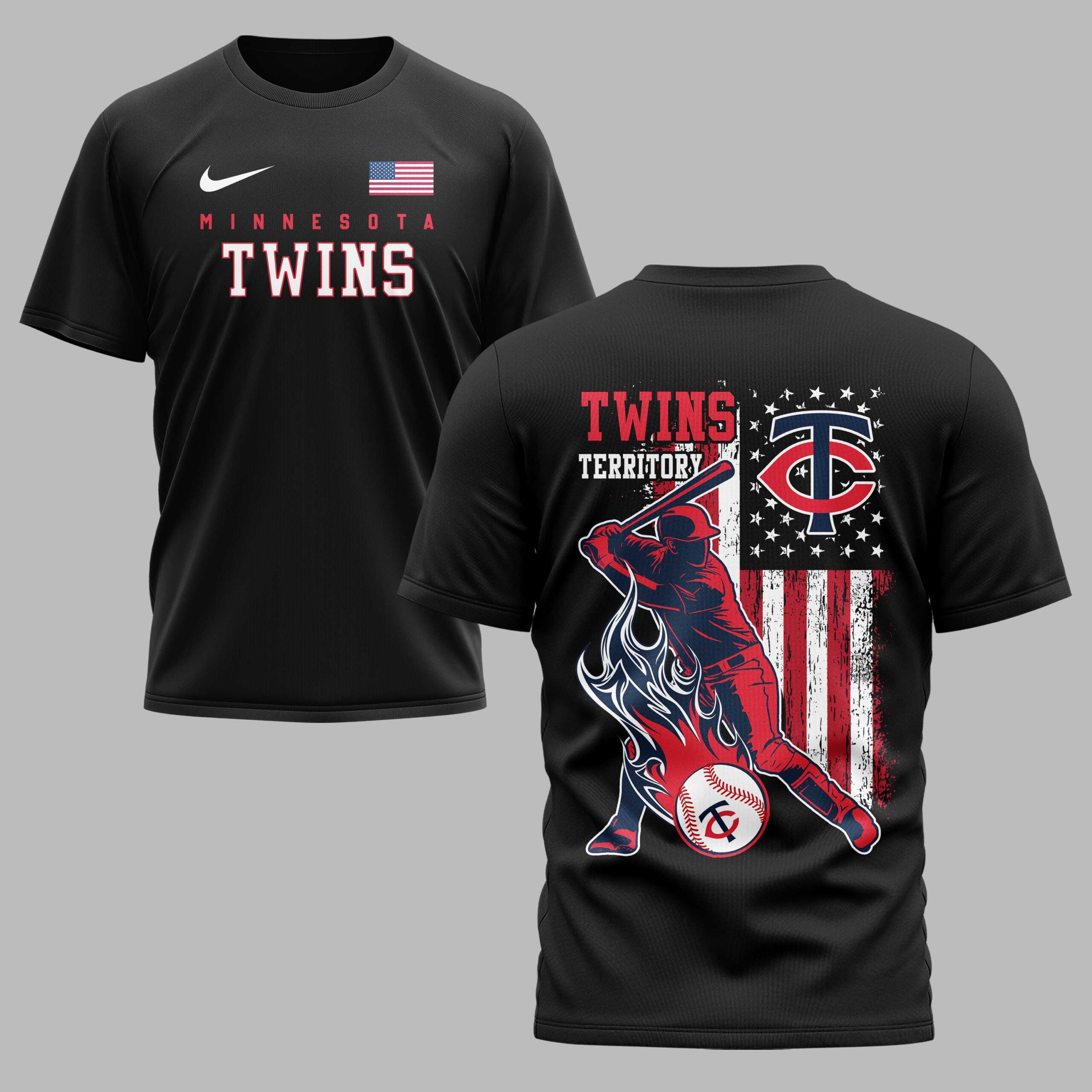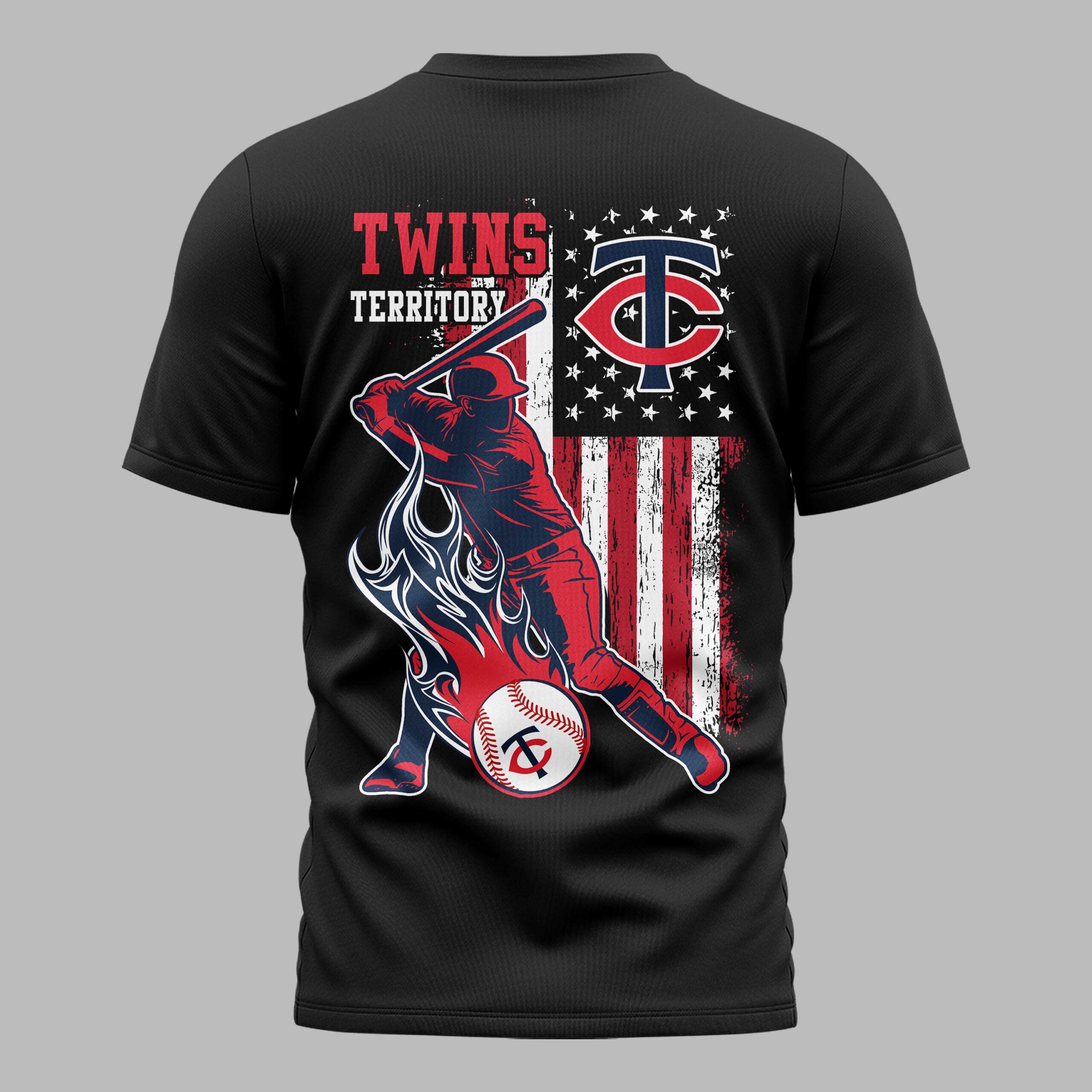 Show your unwavering support for the Minnesota Twins with this dynamic t-shirt, blending fierce team pride with a bold display of American spirit. It’s the perfect way to represent your favorite team and country, celebrating both your love for baseball and national pride. The front proudly features MINNESOTA TWINS in classic red and white lettering, complemented by a subtle American flag and a crisp white swoosh detail. The back makes a powerful statement with a distressed American flag serving as a dramatic backdrop to a determined baseball batter. Flames ignite from the bat and baseball, set alongside the iconic Twins TC logo and the bold declaration TWINS TERRITORY. Perfect for cheering loud at Target Field, game day gatherings, or simply showcasing your devotion around town. This shirt is designed for every dedicated Twins fan who lives and breathes baseball and American pride, making it an essential addition to your game day wardrobe or everyday wear.