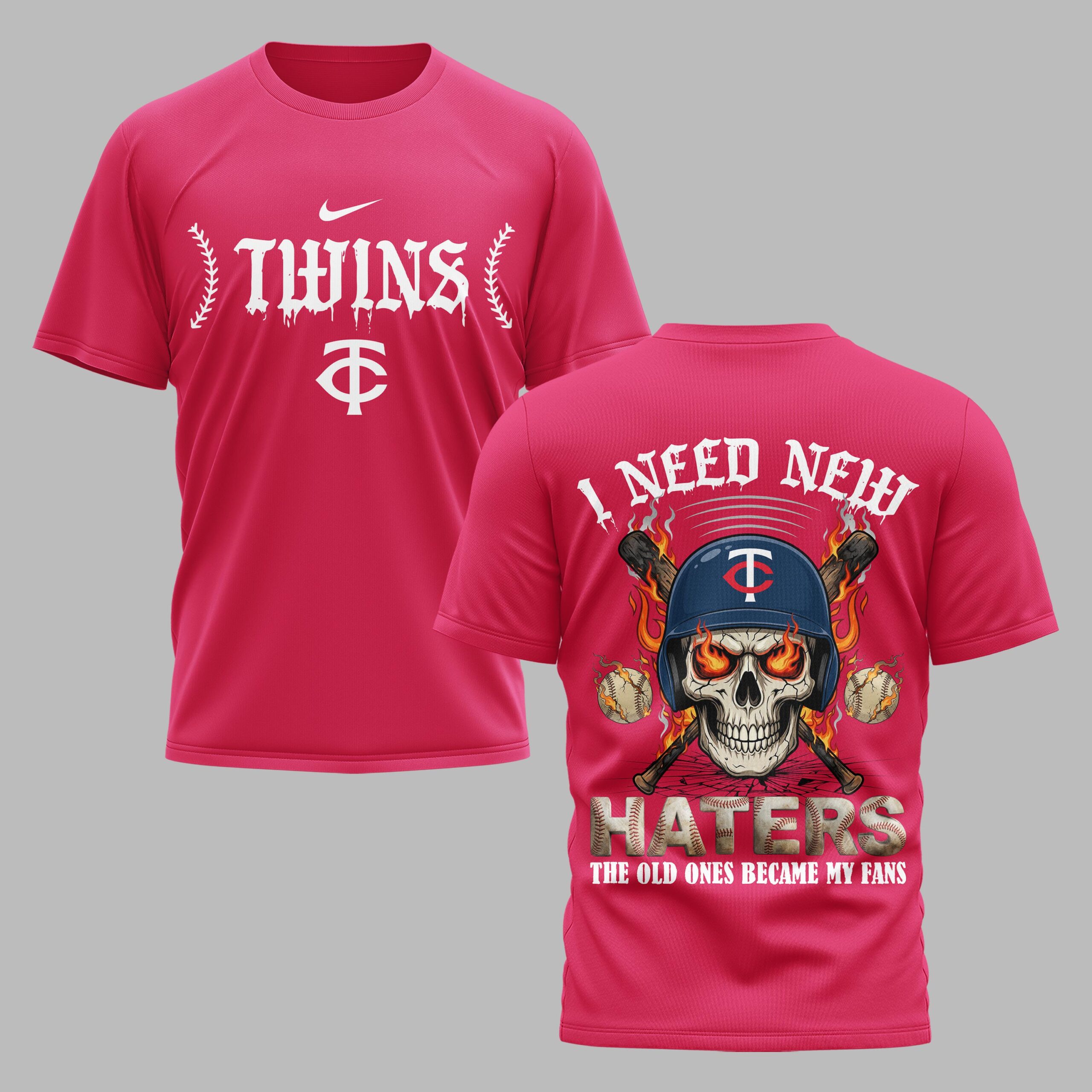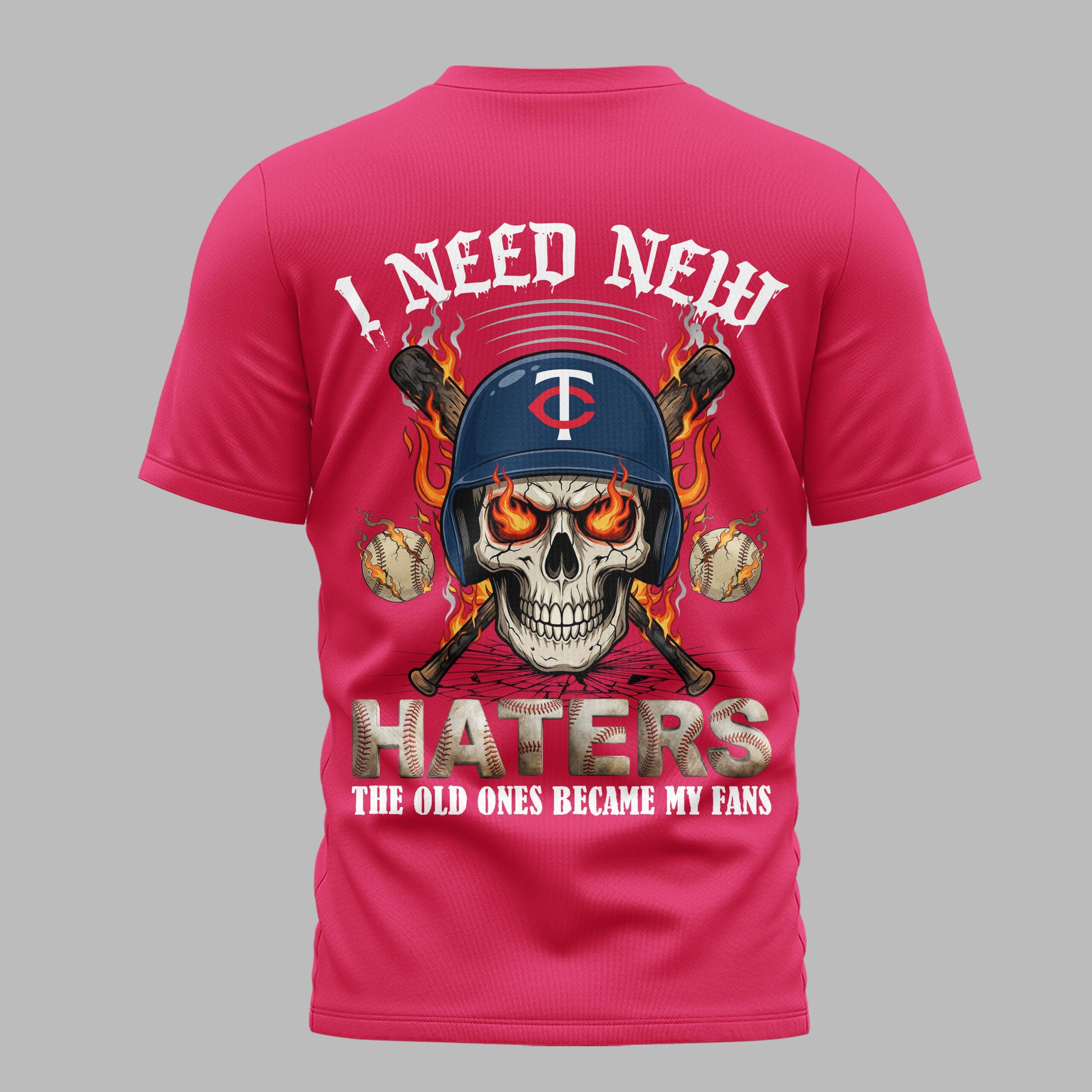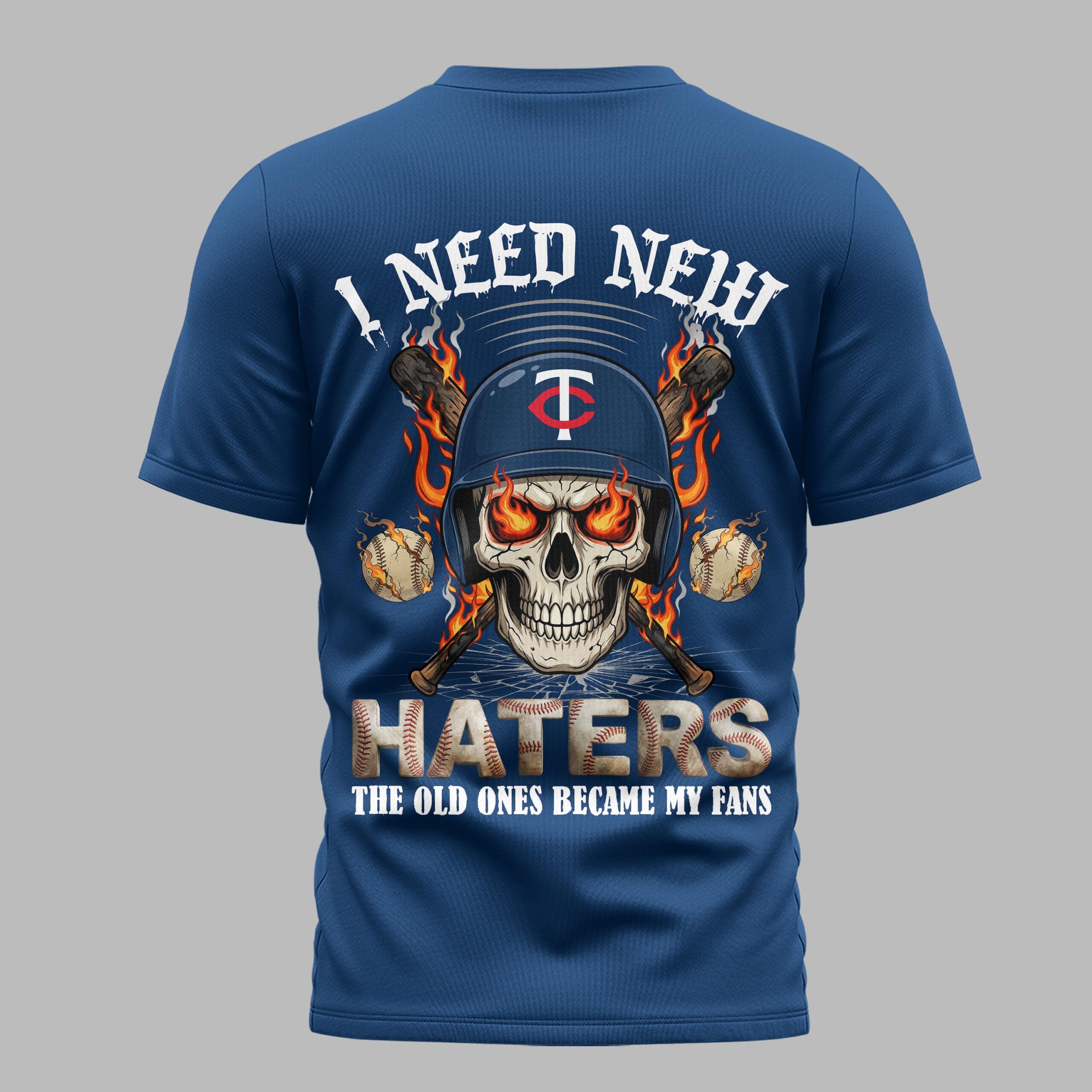 Show your unwavering Minnesota Twins pride with this bold and defiant fan tee! Perfect for loyalists, this shirt declares your unbreakable dedication and team spirit. Wear your Twins heart with an attitude that commands attention. The front features TWINS in stylized white font, with red baseball stitching and the iconic TC logo. The back makes a powerful statement: a flaming skull in a Twins helmet, flanked by fiery bats and blazing baseballs. Above, I NEED NEW HATERS (textured like a baseball) and THE OLD ONES BECAME MY FANS stand out against a cracked backdrop. This tee is ideal for game days, watch parties, or any time you want to represent the Twins with confidence. It’s more than just fan apparel; it’s a bold declaration of loyalty and a fun jab at rivals.