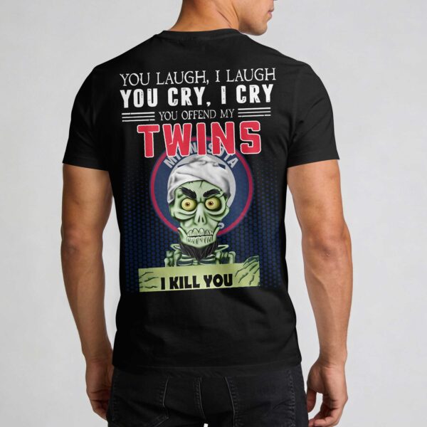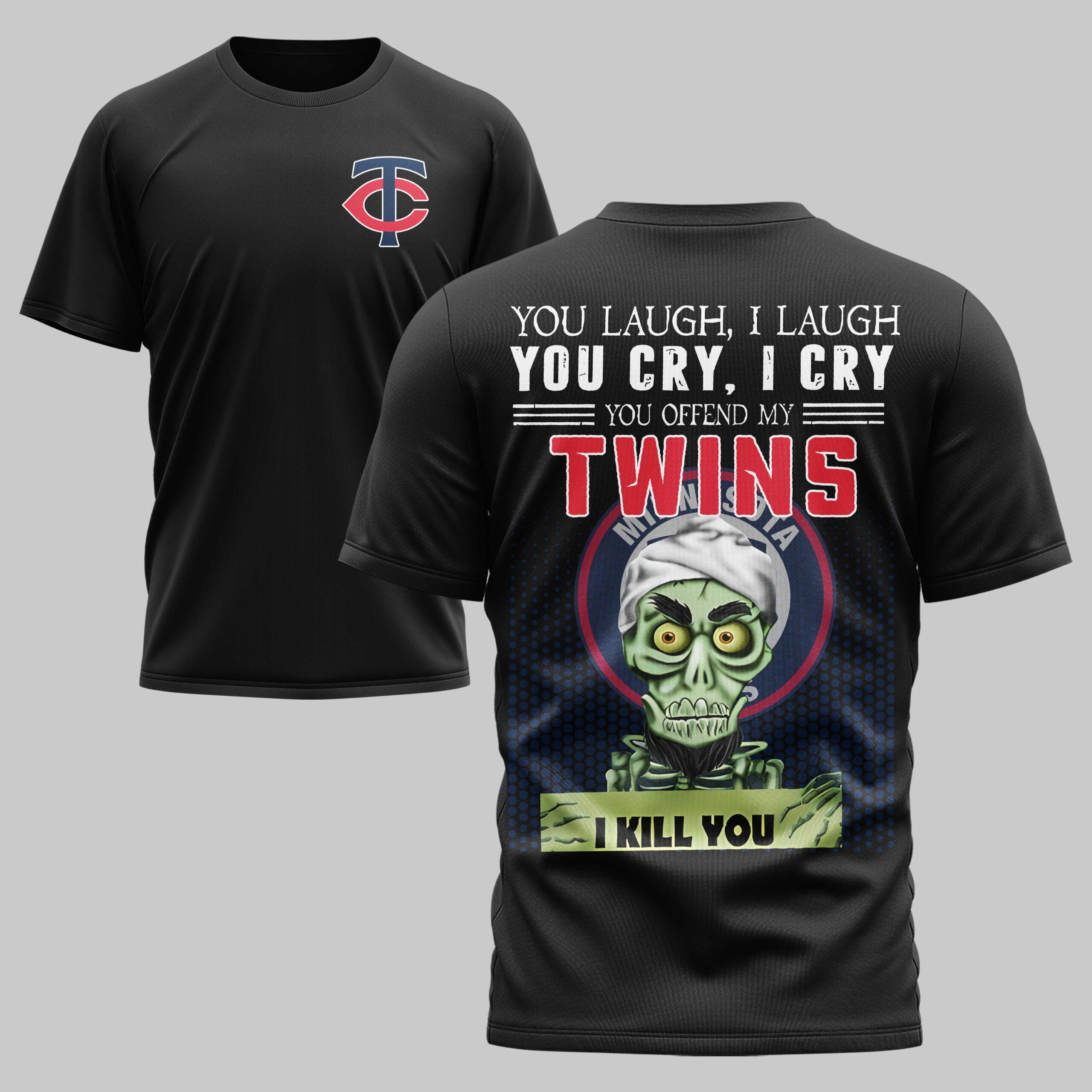 Show your undying loyalty to the Minnesota Twins with this bold and spirited fan gear. Designed for the most dedicated supporters, this shirt combines team pride with a touch of humor and an uncompromising attitude. It’s the perfect way to let everyone know where your allegiance lies while celebrating the enduring legacy of American baseball. The front features the iconic TC logo on the chest for a classic look. The back showcases a striking graphic with the famous skeleton character positioned in front of the Minnesota Twins emblem. Accompanied by the defiant text, You offend my Twins, I kill you, this design highlights the deep bond shared by fans who stand by their team through every game. Wear it to the ballpark, tailgates, or during Independence Day festivities to showcase your Minnesota pride. It’s the ultimate statement piece for any fan who takes their loyalty seriously.