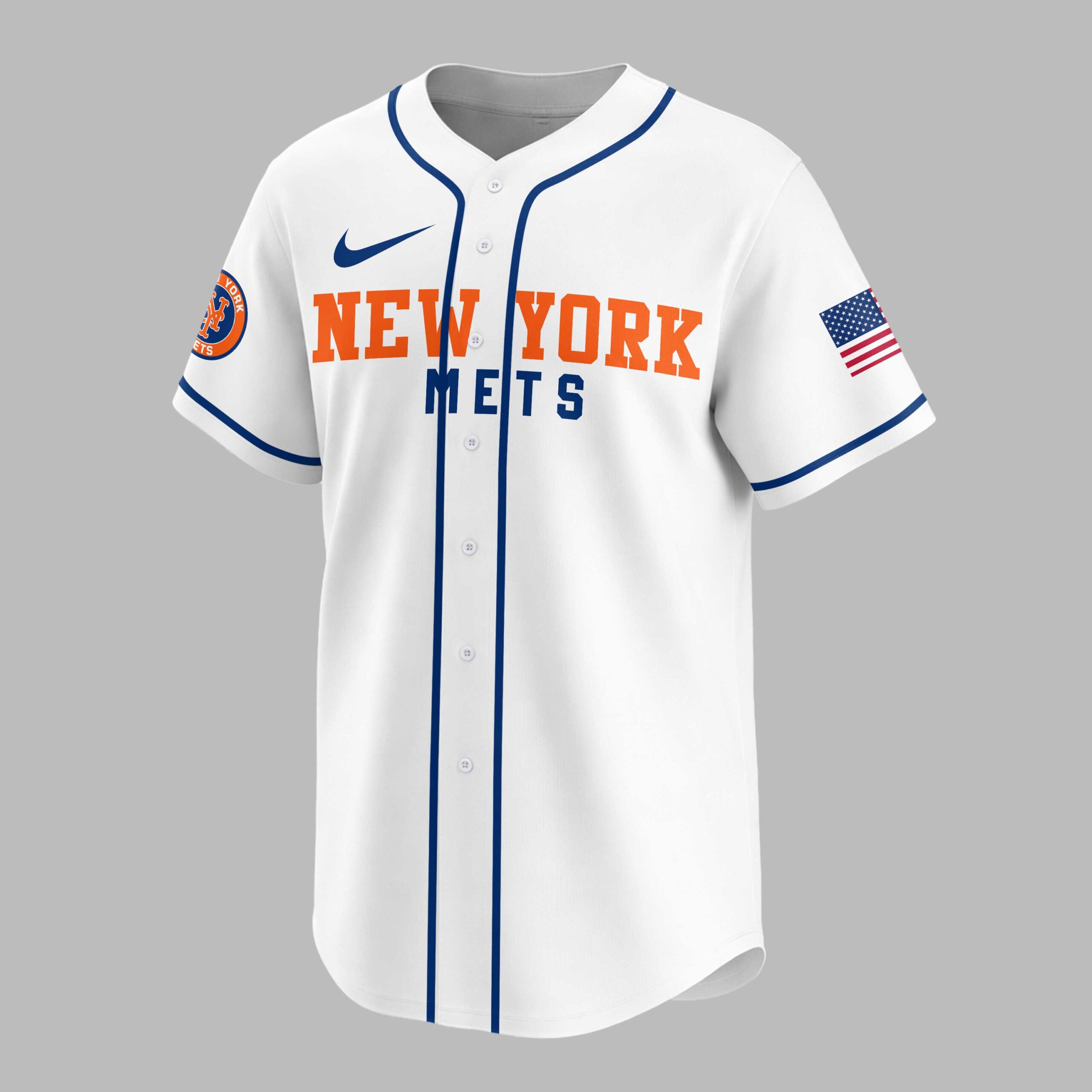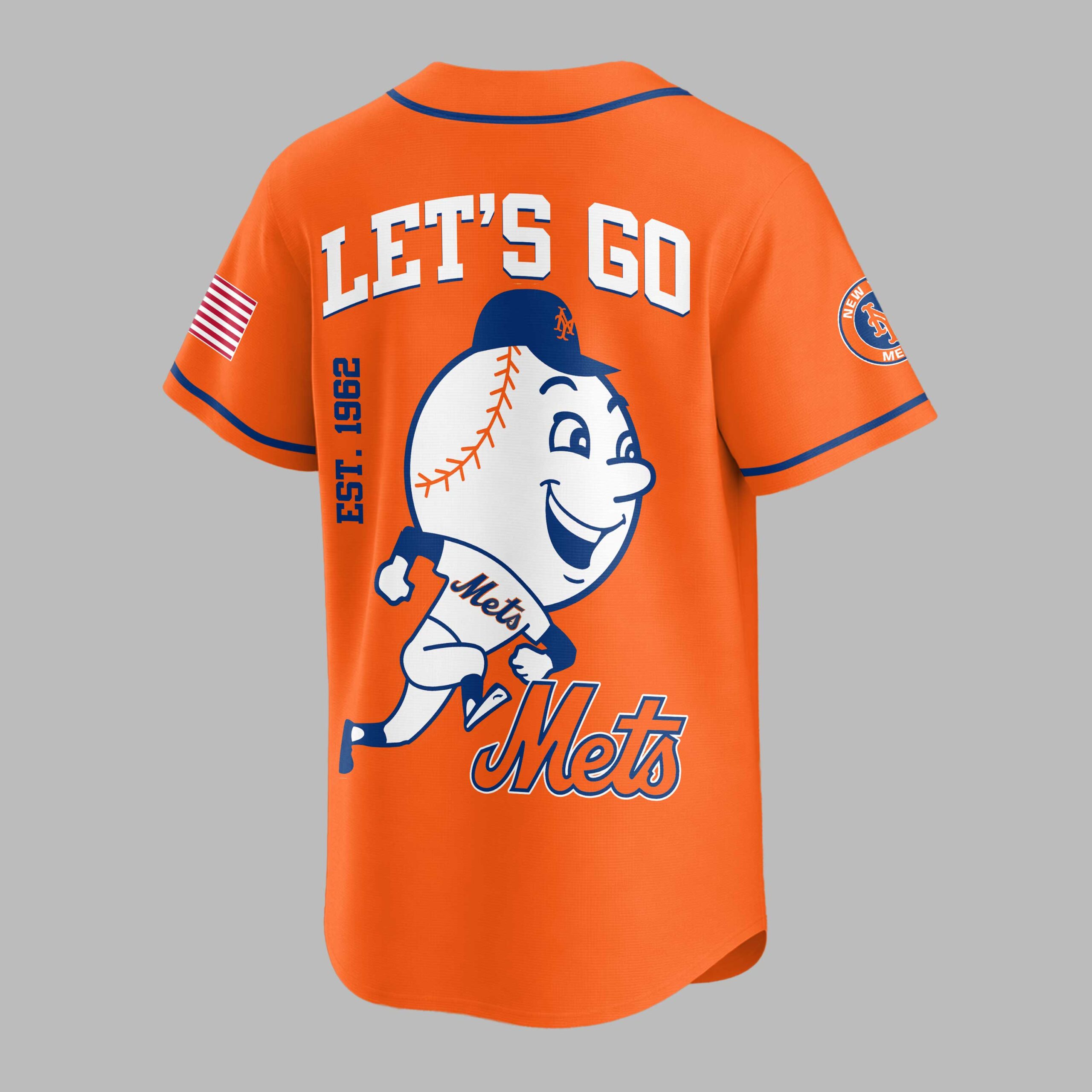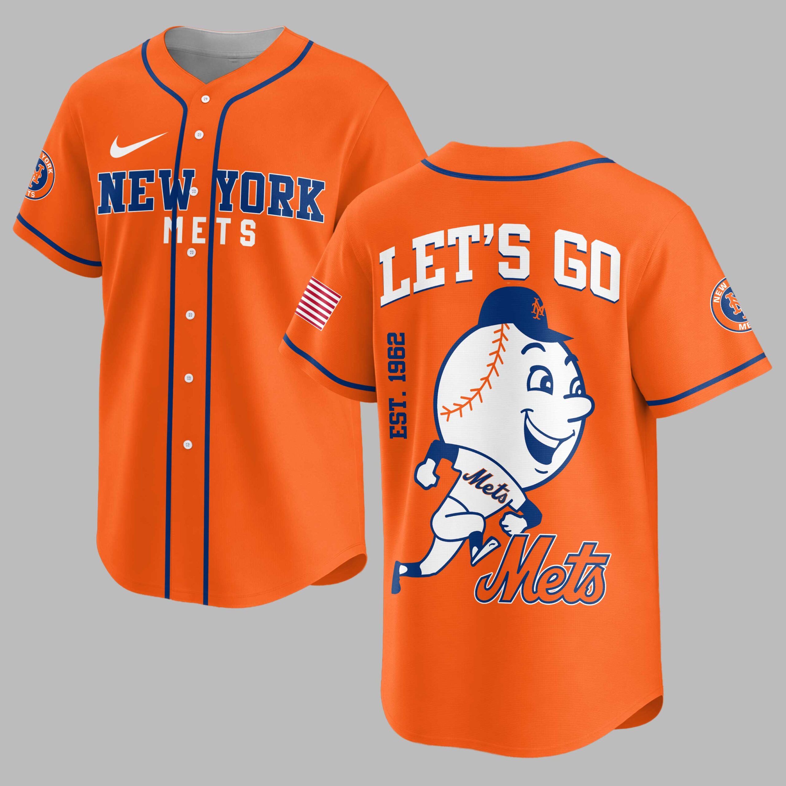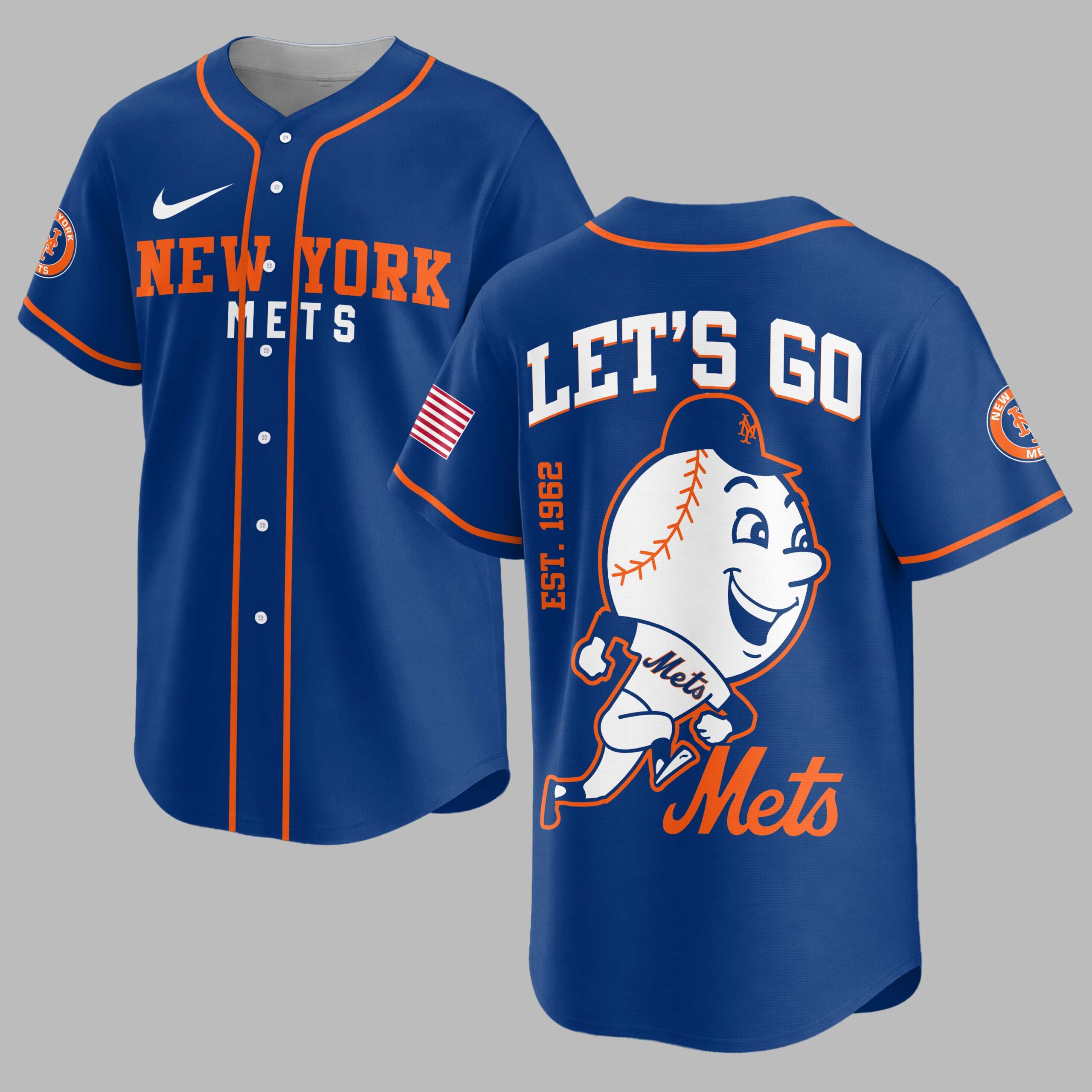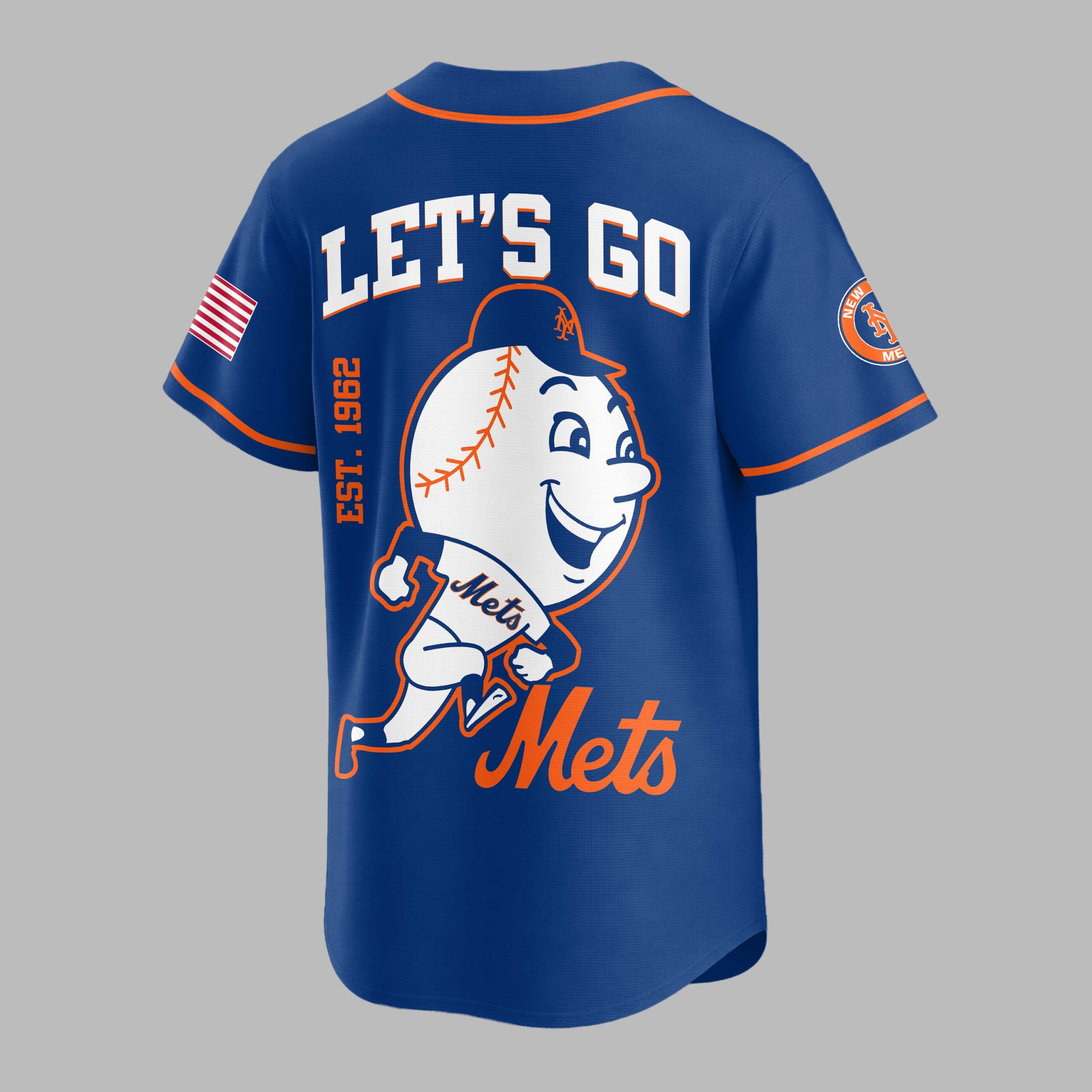 Ignite your Mets passion and step up to the plate in style with this spirited New York Mets fan jersey! Perfect for dedicated followers, this vibrant design lets you proudly showcase your unwavering loyalty to the team that captures the heart of Queens. It’s more than just apparel; it’s a statement of your steadfast Mets pride, celebrating a legacy established in 1962. The front boldly features ‘NEW YORK METS’ in the iconic orange and blue, with the classic Mets circular logo on the sleeve. Turn around and get ready to rally with the cheerful Mr. Met mascot running across the back, encouraging everyone with a resounding ‘LET’S GO!’ Below him, the classic ‘Mets’ script is displayed, complemented by an ‘EST. 1962’ mark and an American flag patch on the sleeve, honoring the team’s rich history and national spirit. Whether you’re cheering from the stands at Citi Field, gathering with friends for a watch party, or simply enjoying a sunny day out, this jersey is your go-to for game day or any day you want to represent your beloved Mets. It’s an essential piece for any fan who lives and breathes New York baseball history.