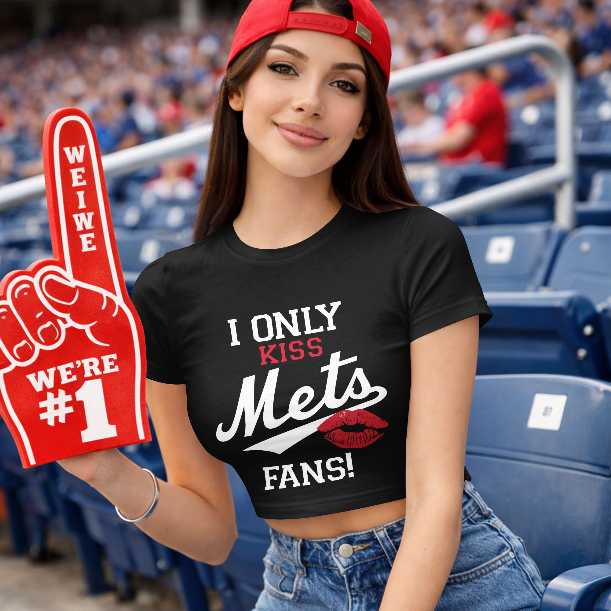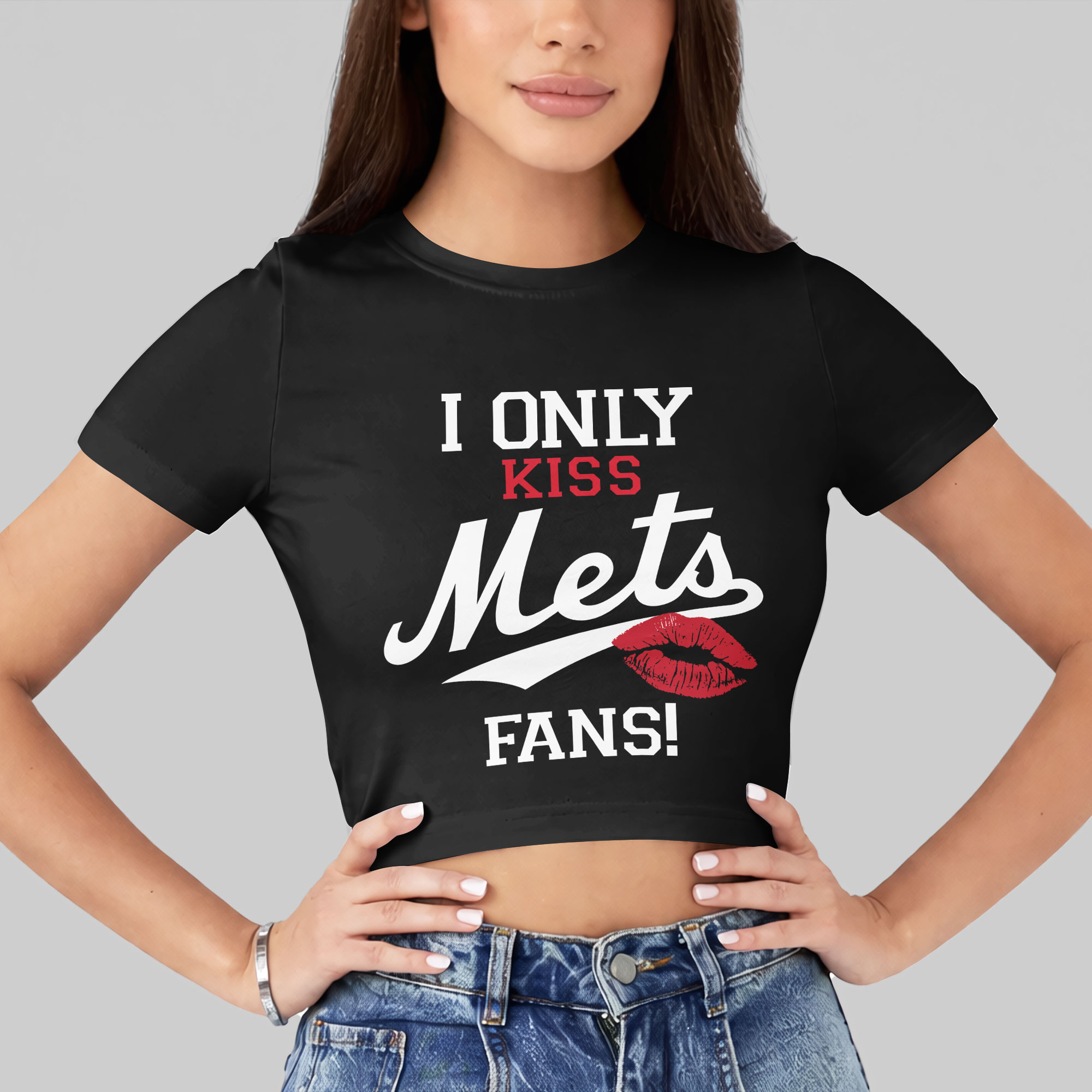 Show your vibrant New York Mets loyalty with this spirited crop top! For devoted fans, this design makes a playful, bold statement about your undeniable baseball allegiance. It’s a confident declaration of devotion, sure to spark smiles and conversation. The front proudly features I ONLY KISS in white, with KISS highlighted in vibrant red. The iconic Mets stands out below in stylish white script, accented by a striking red lipstick kiss mark. FANS! emphatically concludes the statement. On the back, a classic MLB logo subtly signifies your passion. This crop top is essential for thrilling game days at Citi Field, lively watch parties, or simply showcasing Mets pride. Celebrate every win, cheer on your favorite players, and make it clear your heart is truly with the Mets!