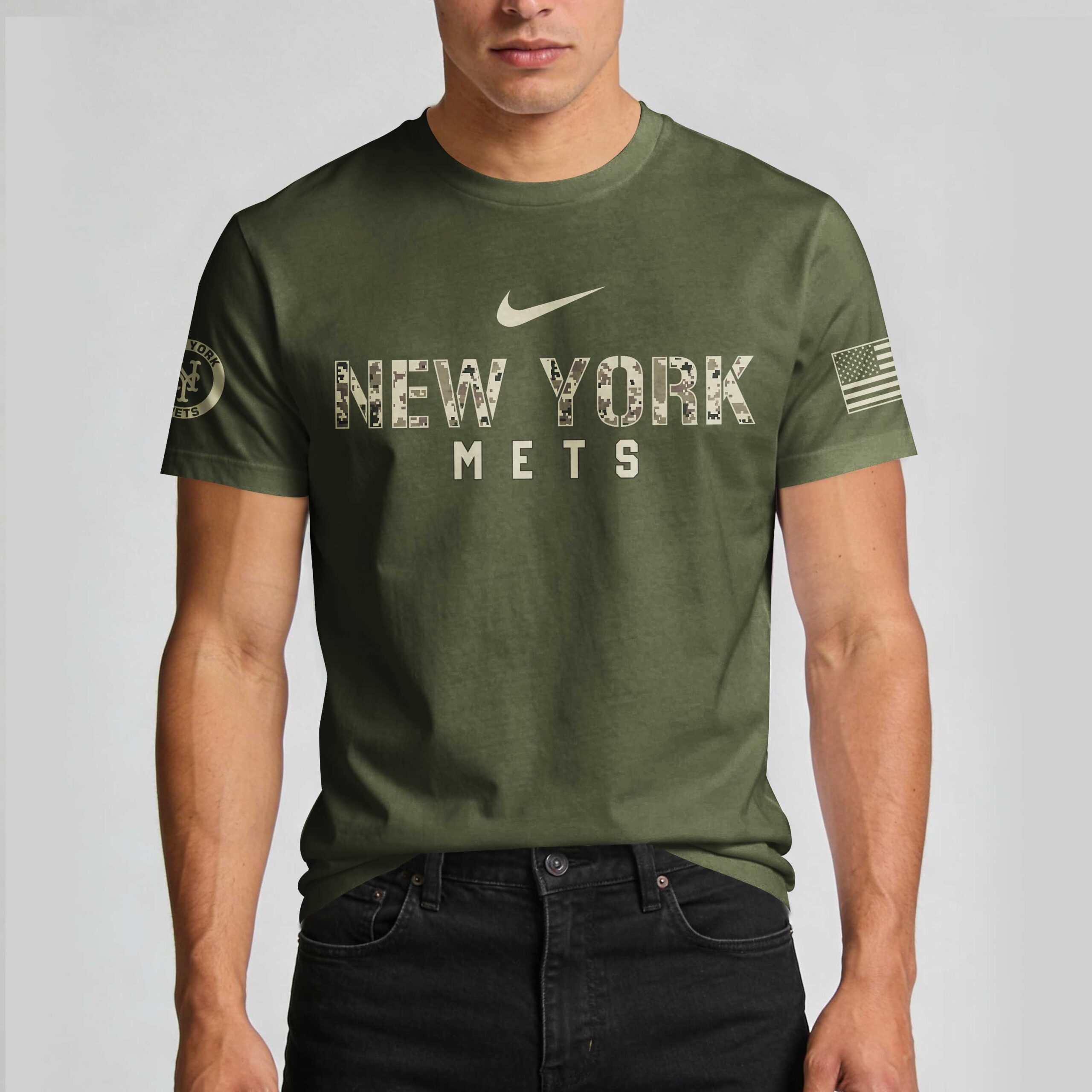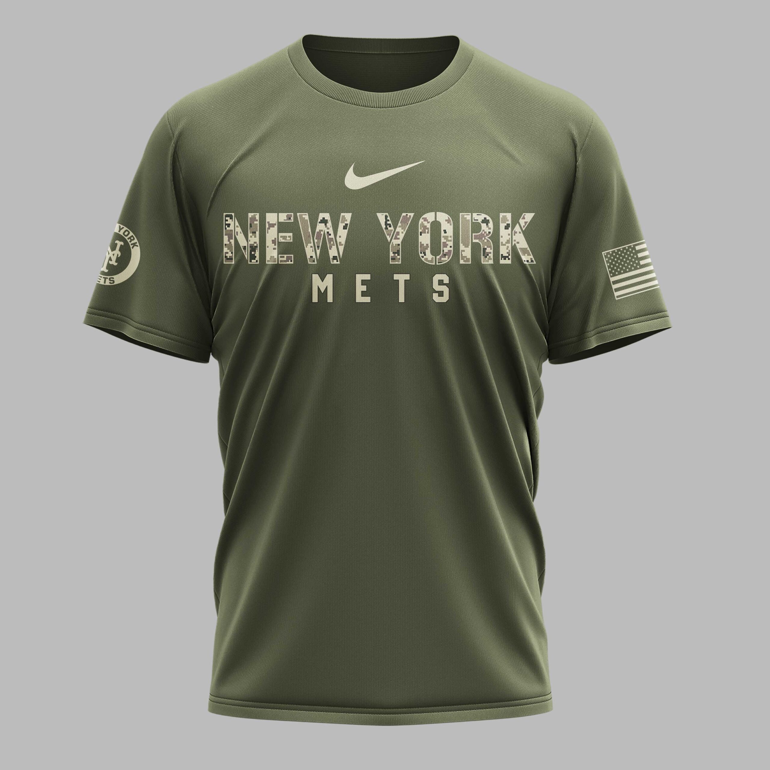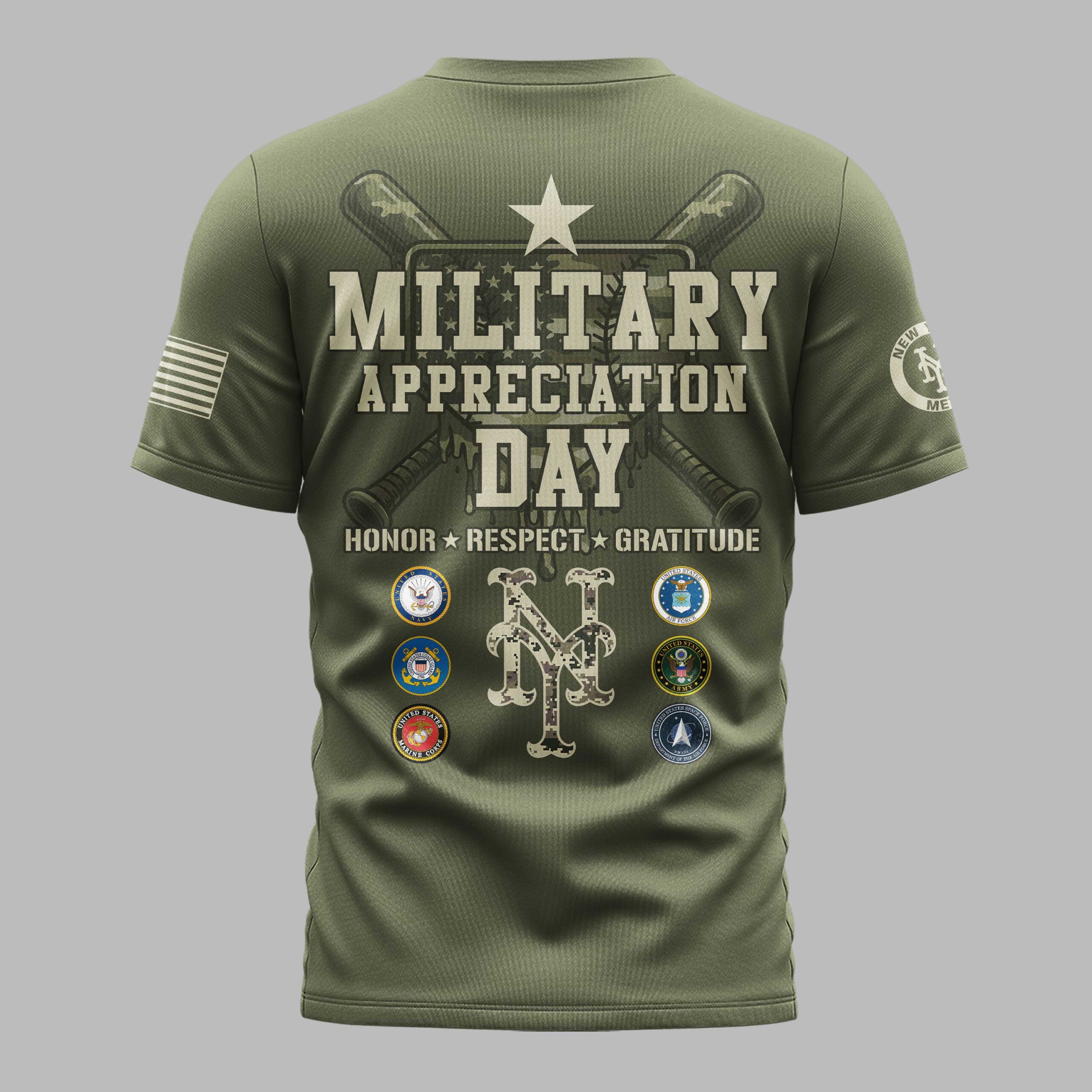 Show your unwavering support for the New York Mets and pay tribute to our nation’s heroes with this special Military Appreciation Day tee. This shirt is designed for every fan who stands with their team and proudly honors the brave men and women of the US Armed Forces. The front proudly displays NEW YORK METS in a striking digital camouflage pattern, complemented by a patriotic American flag on the right sleeve. The back makes a bold statement with MILITARY APPRECIATION DAY, featuring crossed baseball bats, a proud star, and the powerful message HONOR * RESPECT * GRATITUDE. A camouflage New York Mets logo is surrounded by the seals of the US Navy, Coast Guard, Marine Corps, Air Force, Army, and Space Force, symbolizing unity and respect. Perfect for gamedays at Citi Field, Memorial Day celebrations, Veterans Day events, or simply as an everyday expression of your Mets fandom and patriotic pride. This shirt is a powerful way to honor those who serve while cheering on your favorite team.