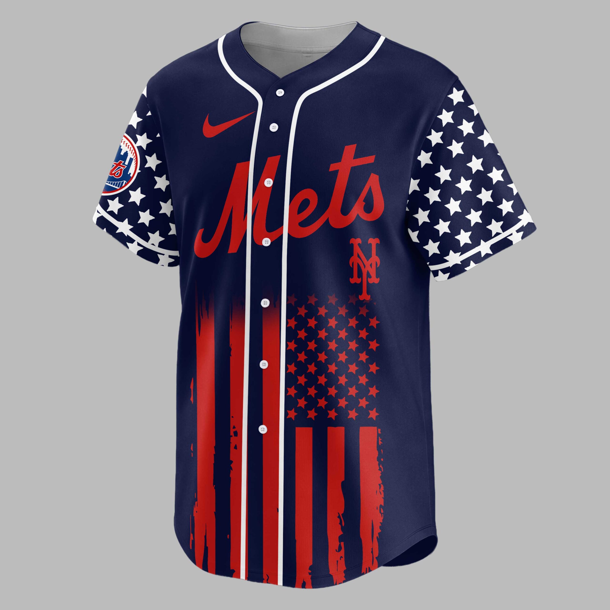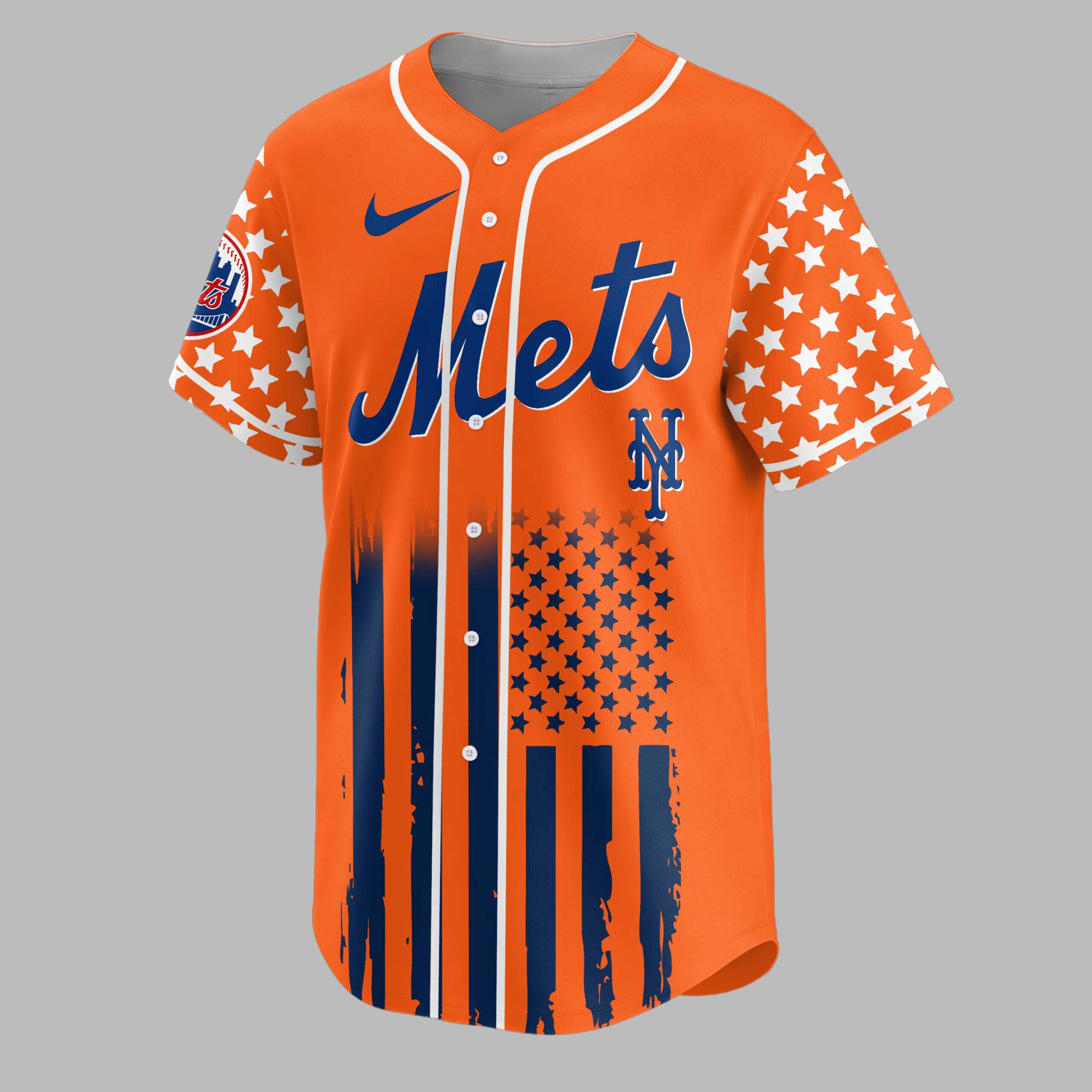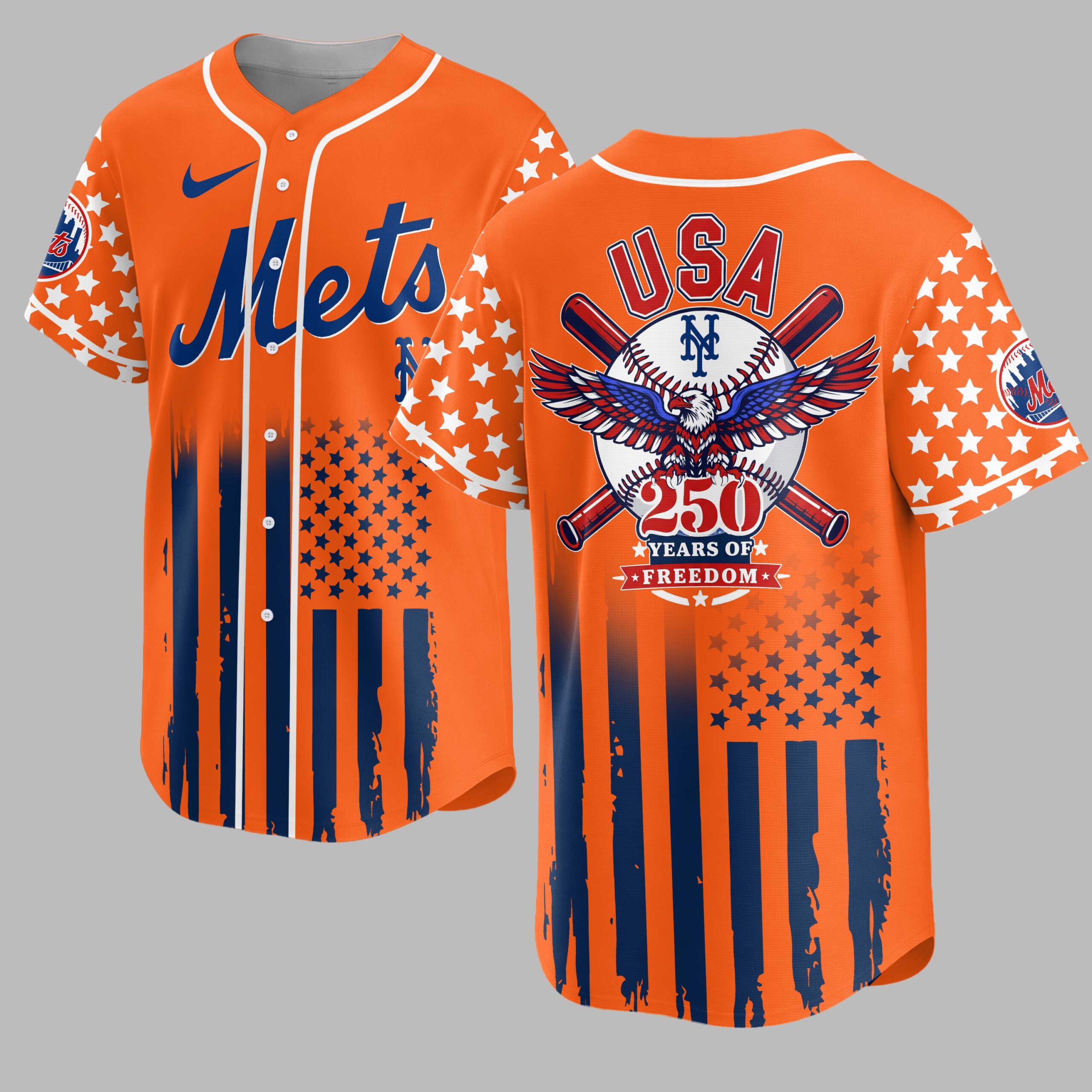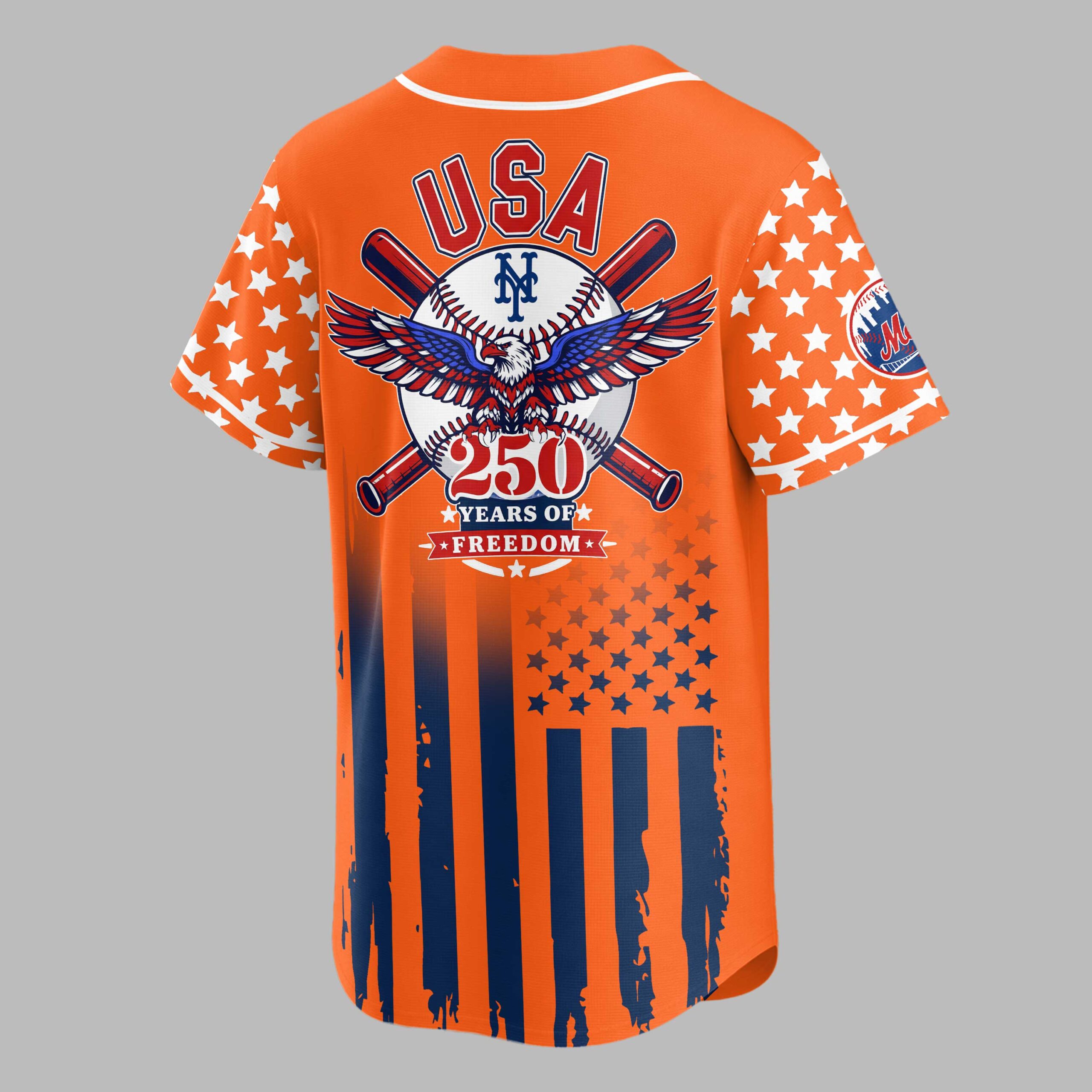 Celebrate American freedom and Mets pride with this patriotic baseball jersey! This design blends national spirit with your passion for the game, commemorating 250 years of freedom. It’s the ultimate apparel for dedicated fans. The front features Mets in bold red script, merging into a distressed American flag motif on the lower half and sleeves. The back showcases USA above a majestic eagle clutching an NY logo baseball, flanked by crossed bats, and 250 YEARS OF FREEDOM. White stars punctuate the flag’s blue fields. Perfect for game days, Fourth of July festivities, or any proud occasion. Display your Mets loyalty and patriotic spirit at the ballpark, gatherings, or casual outings.