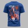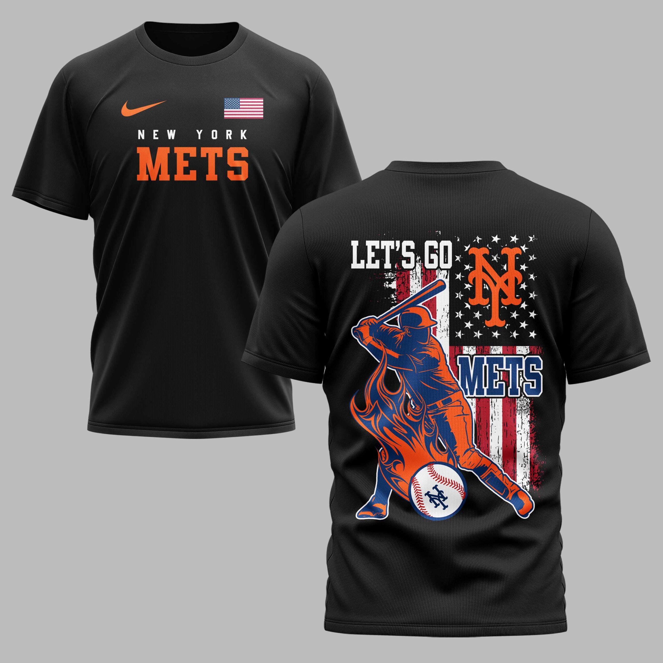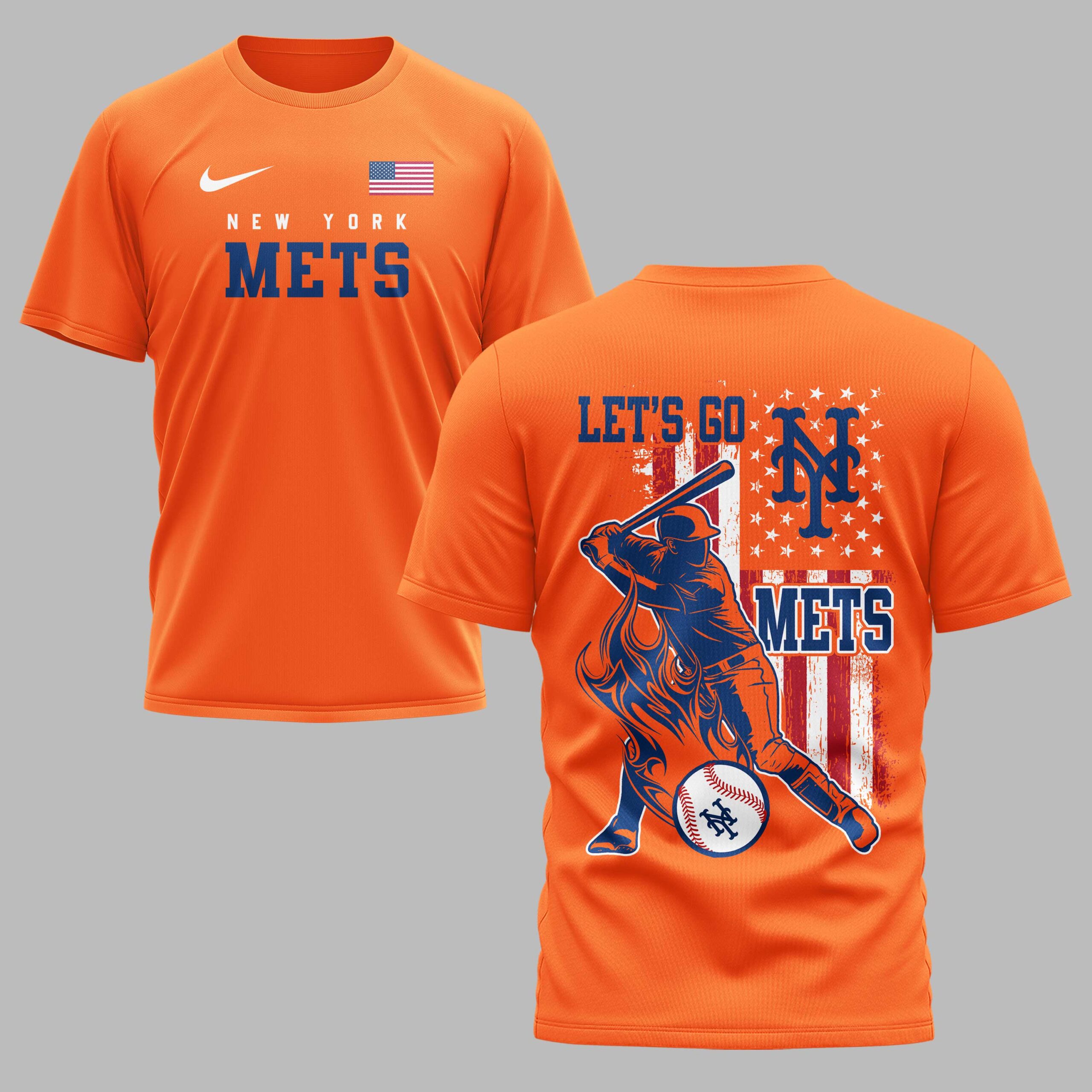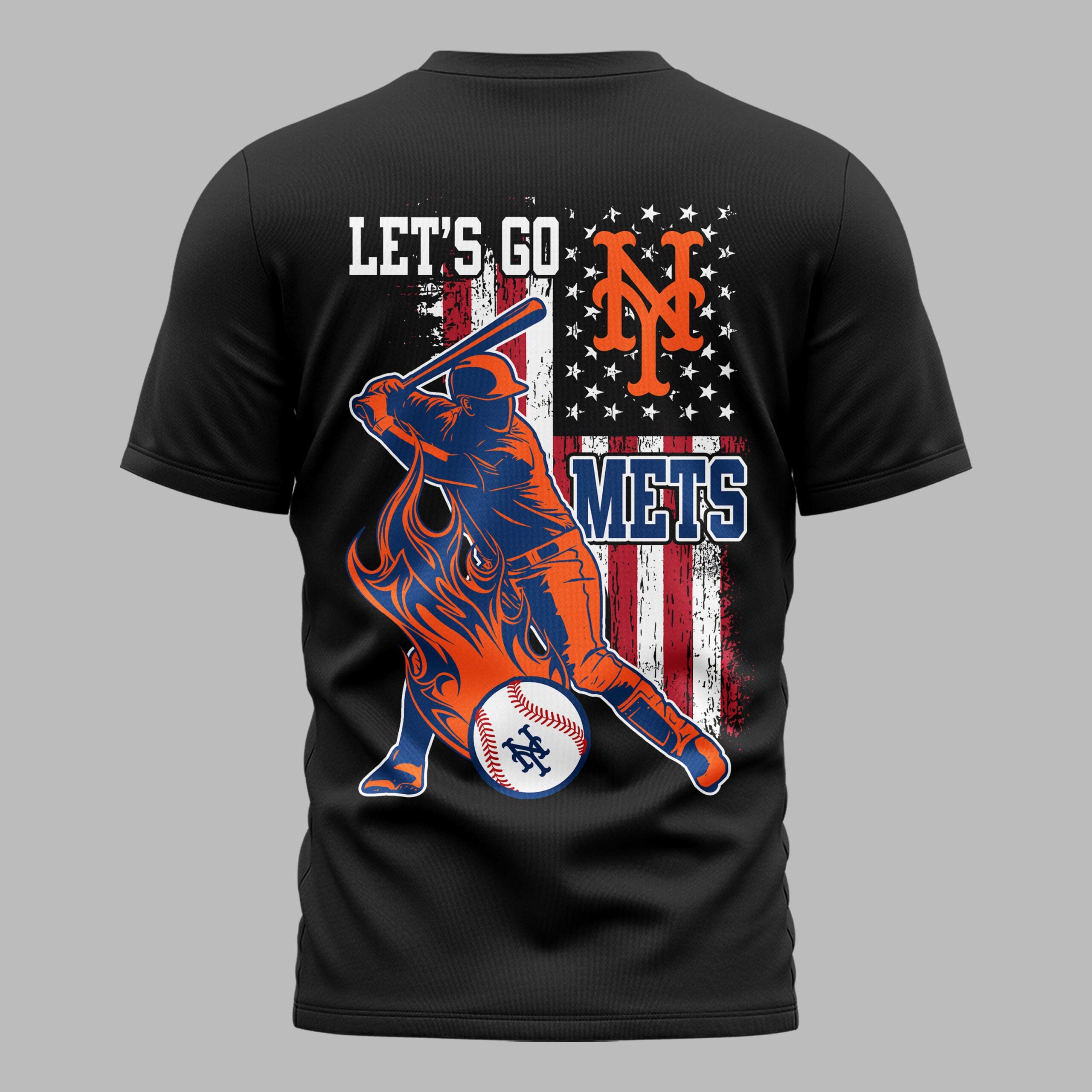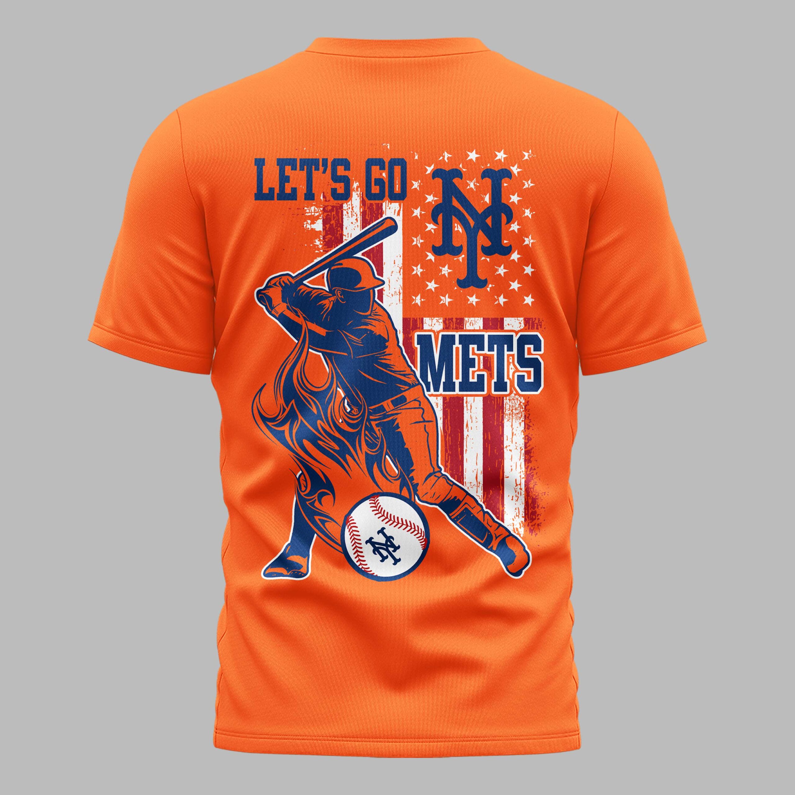 Unleash your undeniable New York Mets pride with this energetic, patriotic fan tee! Crafted for dedicated supporters, this shirt embodies the thrill of baseball and your deep loyalty. It’s the ultimate statement to celebrate your team and American spirit. The vibrant blue front proudly features NEW YORK METS in bold white and orange, with a subtle American flag on the sleeve. The back explodes with a dynamic baseball player mid-swing, enveloped in fiery orange graphics. A distressed American flag provides the backdrop, boldly accented with LET’S GO, the iconic NY logo, and METS. Perfect for cheering from the stands, a lively watch party, or everyday display of team spirit. This shirt is your go-to, a powerful declaration for your beloved New York Mets.