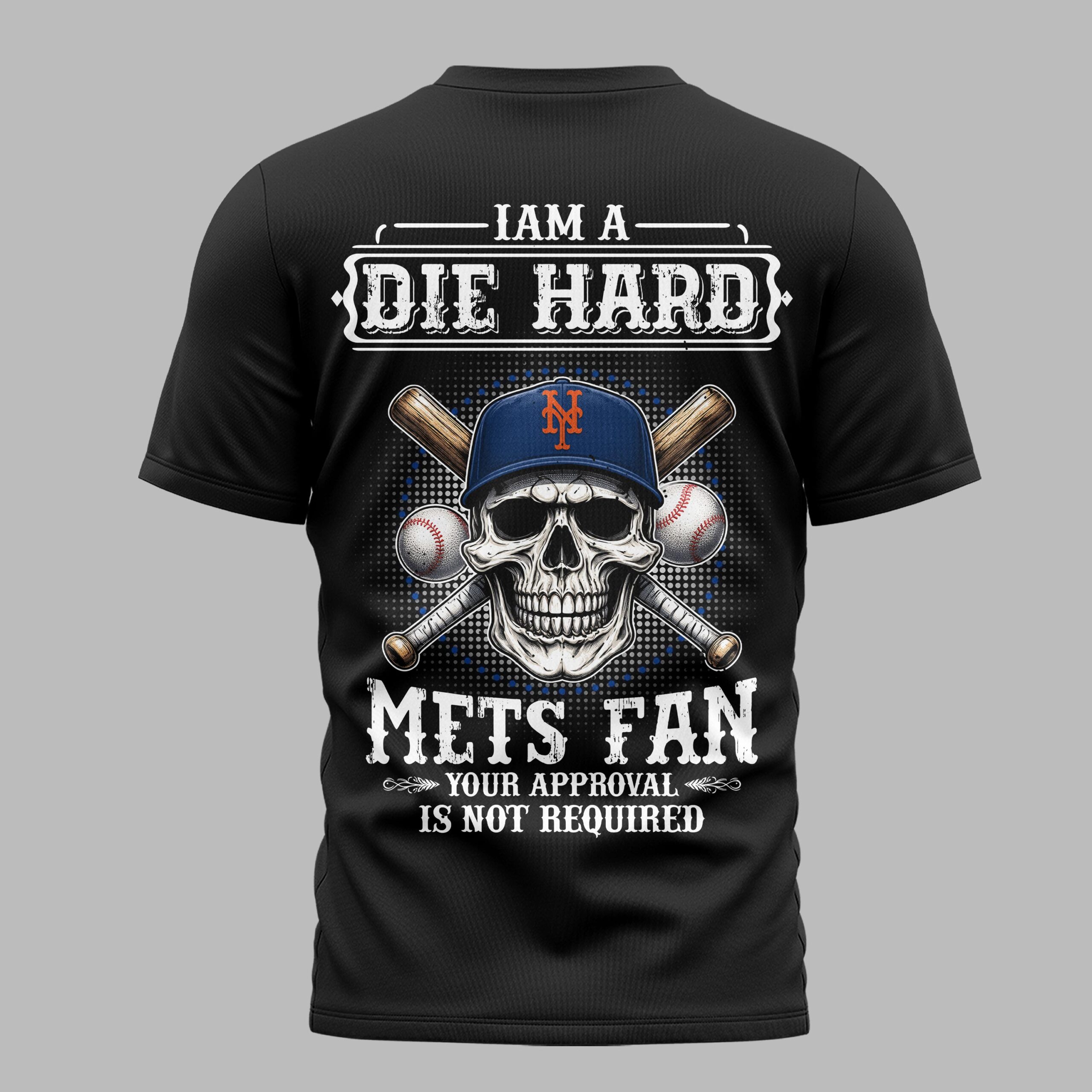 Declare your unwavering loyalty with this bold Die Hard Mets Fan T-shirt! Perfect for those who bleed orange and blue, this shirt makes it clear where your baseball allegiance stands. It’s more than just apparel; it’s a statement of passion for your beloved New York Mets that no one can question. The front features a subtle yet impactful design of a skull proudly sporting a Mets cap, flanked by crossed baseball bats and two baseballs. Turn around, and the message amplifies with a large, striking version of the skull graphic. Below it, the powerful words I AM A DIE HARD METS FAN YOUR APPROVAL IS NOT REQUIRED are displayed, letting everyone know your dedication is absolute. Sport this tee at Citi Field, during lively watch parties with fellow fans, or even just around town to showcase your unbreakable spirit. It’s the ultimate way to celebrate every home run, every strikeout, and every unforgettable moment with the Mets, all season long.
