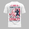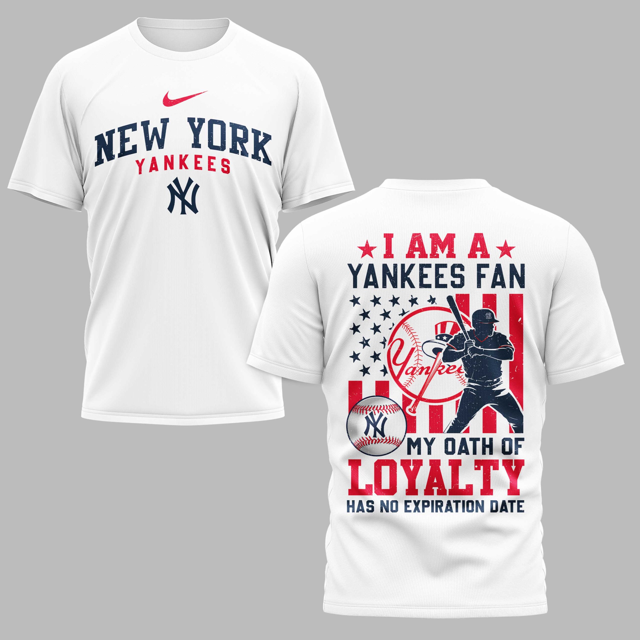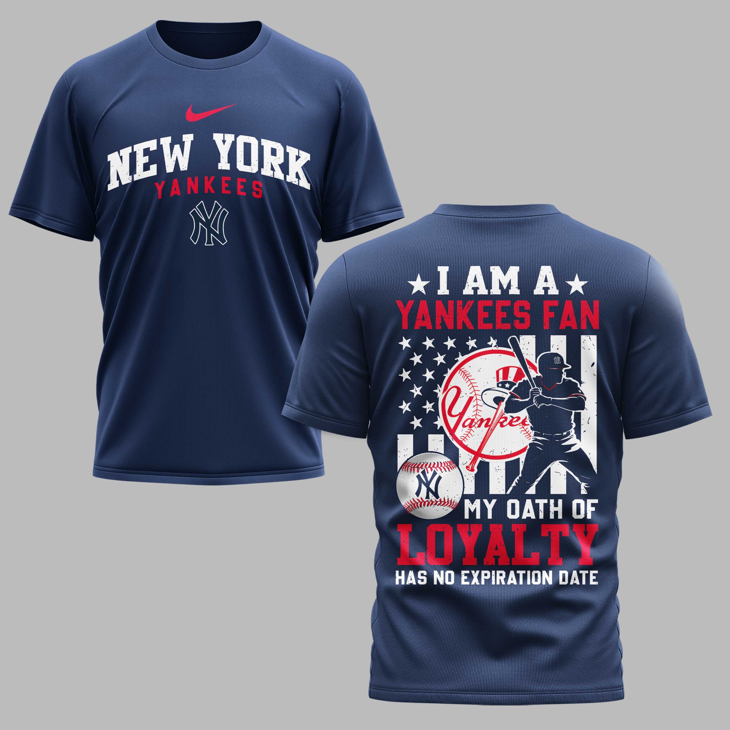 Declare your unwavering devotion to the Bronx Bombers with this energetic New York Yankees fan tee! It’s the perfect way for loyal fans to proudly showcase their passion and game day spirit. The front proudly displays NEW YORK YANKEES in classic blue with a white outline, alongside the iconic NY logo. The striking back features an American flag motif, framing a baseball player silhouette. A baseball with Yankees script and NY logo adds detail, surrounded by ★ I AM A ★ YANKEES FAN and MY OATH OF LOYALTY HAS NO EXPIRATION DATE. Wear this tee proudly at the stadium, during watch parties, or daily to show your team spirit. It’s ideal for celebrating your connection to the New York Yankees with patriotic flair.