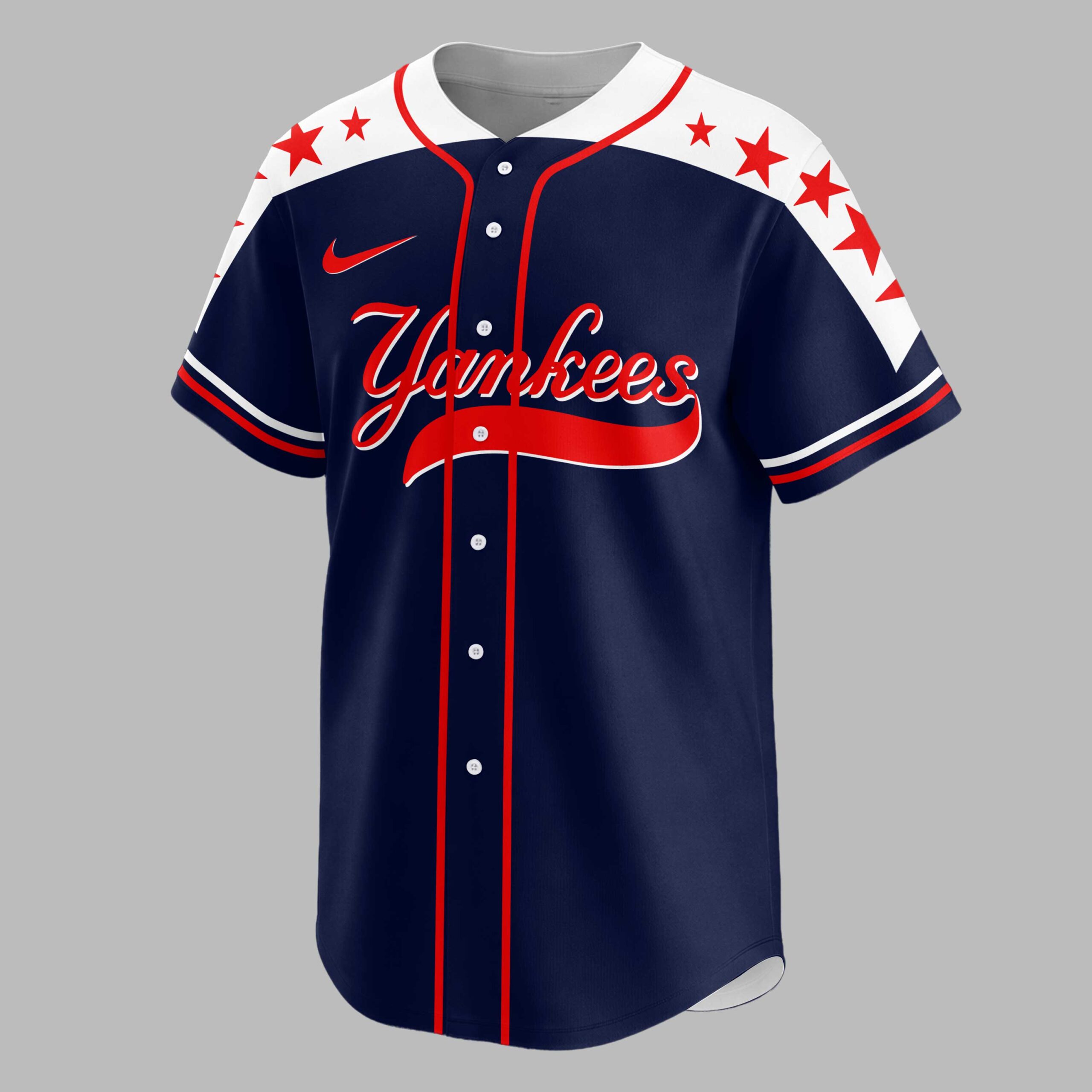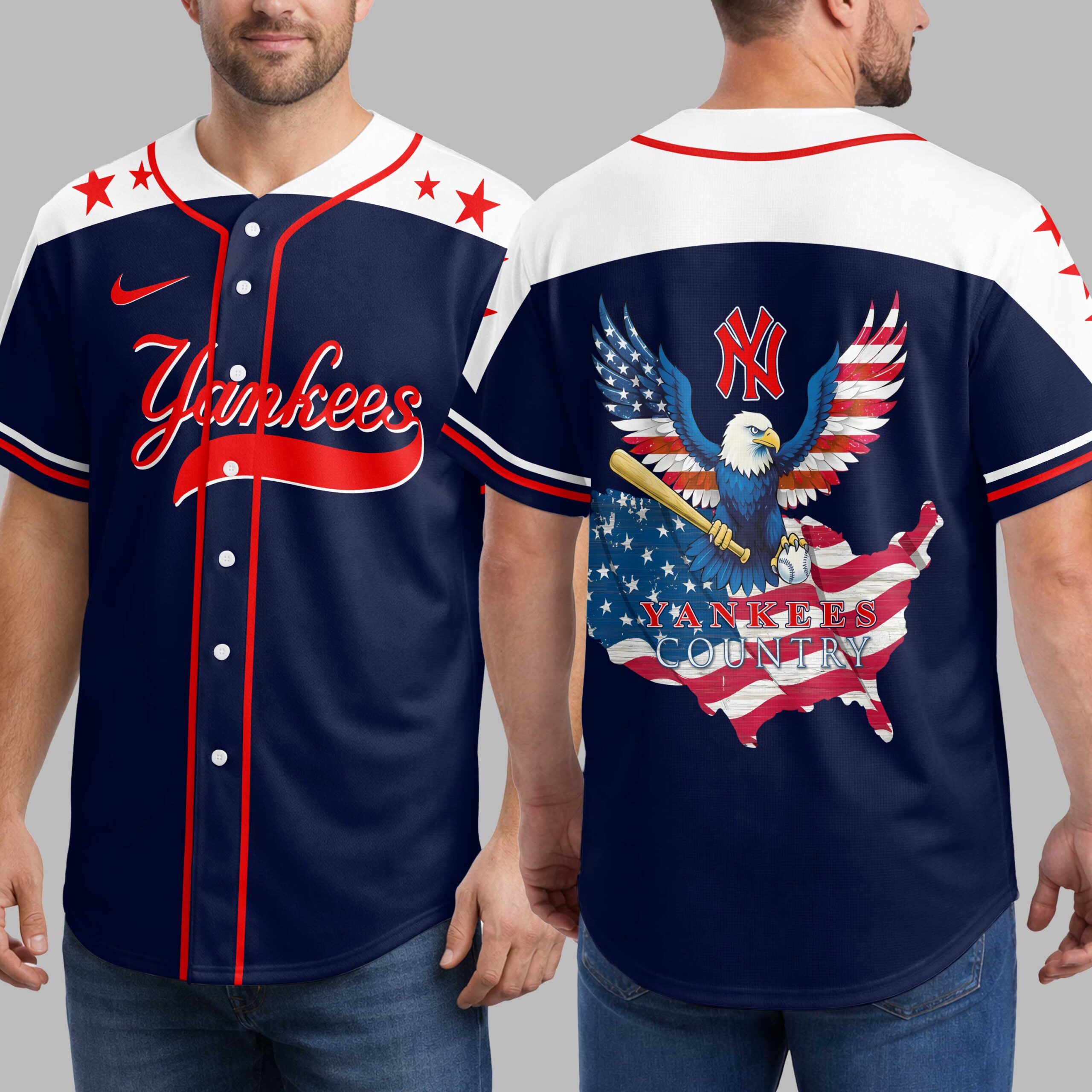 Unleash your ultimate team spirit with this dynamic New York Yankees Patriotic Eagle Baseball Jersey! Perfect for fans who live and breathe Yankees baseball, this shirt proudly blends your love for the team with a bold display of American patriotism. Get ready to stand out and cheer on your favorite team with unparalleled pride. The front of this striking jersey features the iconic Yankees script in vibrant red, accented by sharp pinstripes and patriotic red stars marching across the shoulders. Turn heads as you walk away, revealing a majestic bald eagle with wings draped in the American flag’s stars and stripes, clutching a baseball bat and ball. This powerful design, complete with the Yankees Country slogan over a U.S. map, declares your allegiance loud and clear. Whether you’re at Yankee Stadium, celebrating Independence Day, or just enjoying a casual day out, this jersey is your go-to for showing off your New York pride. It’s the ideal attire for game days, national holidays, backyard barbecues, or any occasion where you want to broadcast your love for the Yankees and your country.