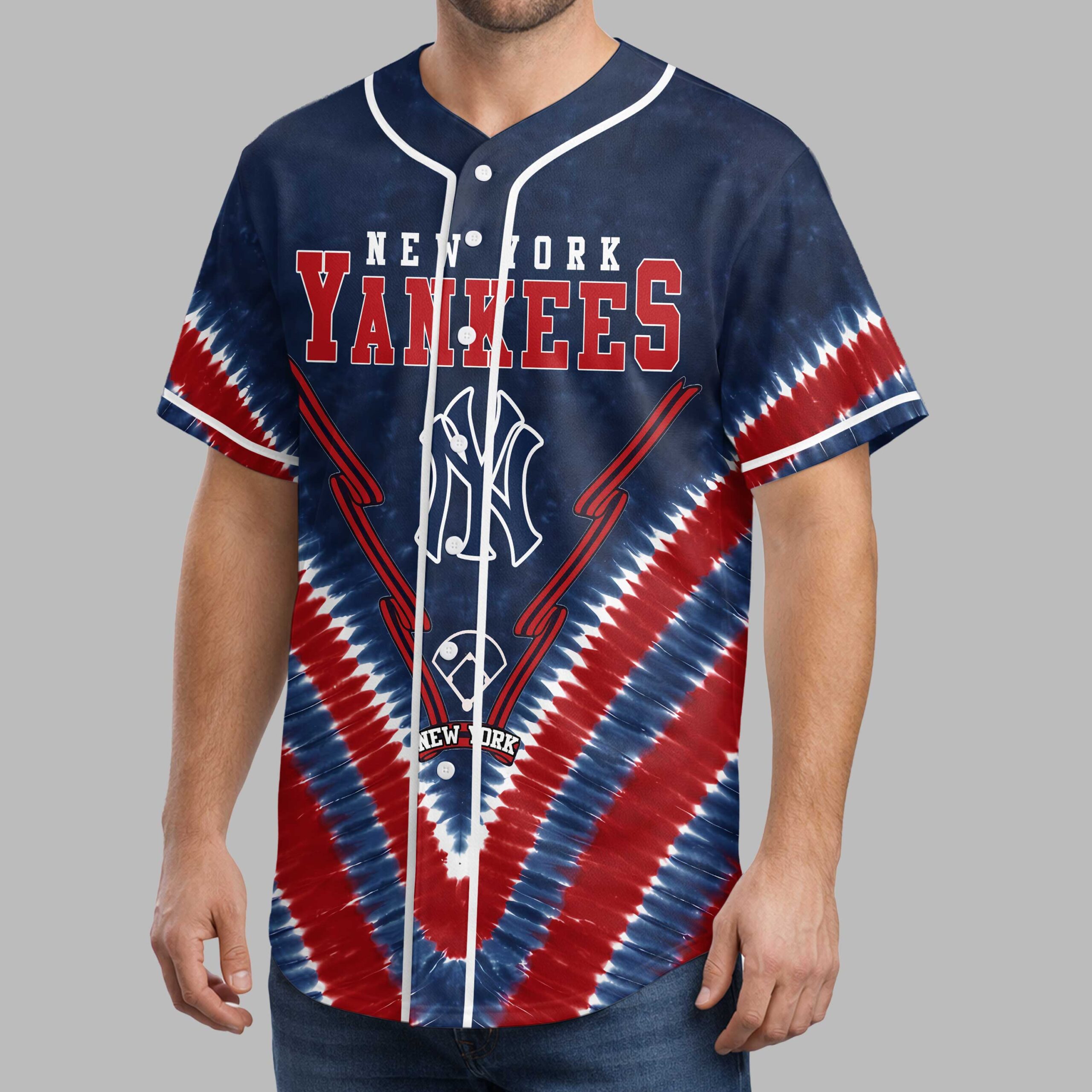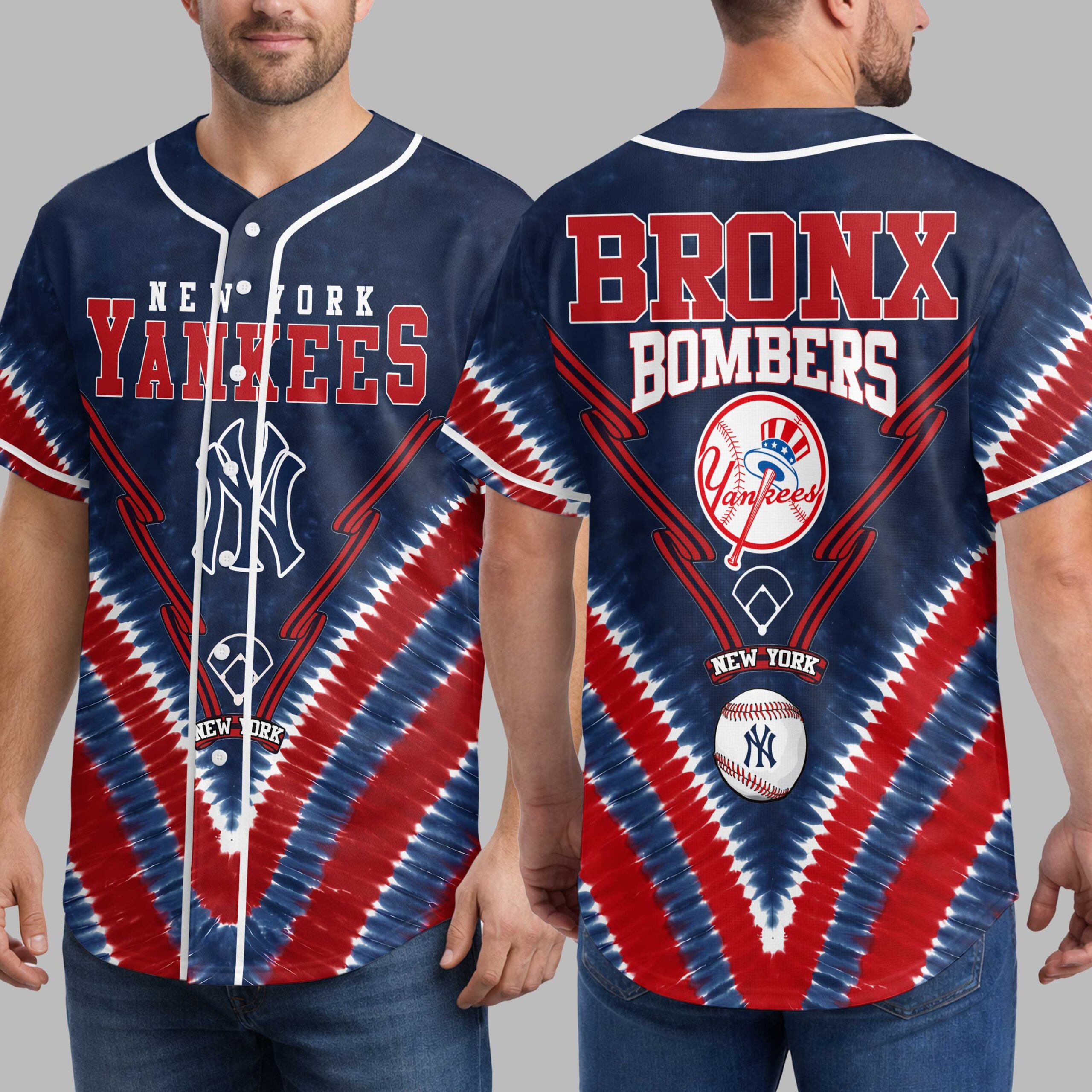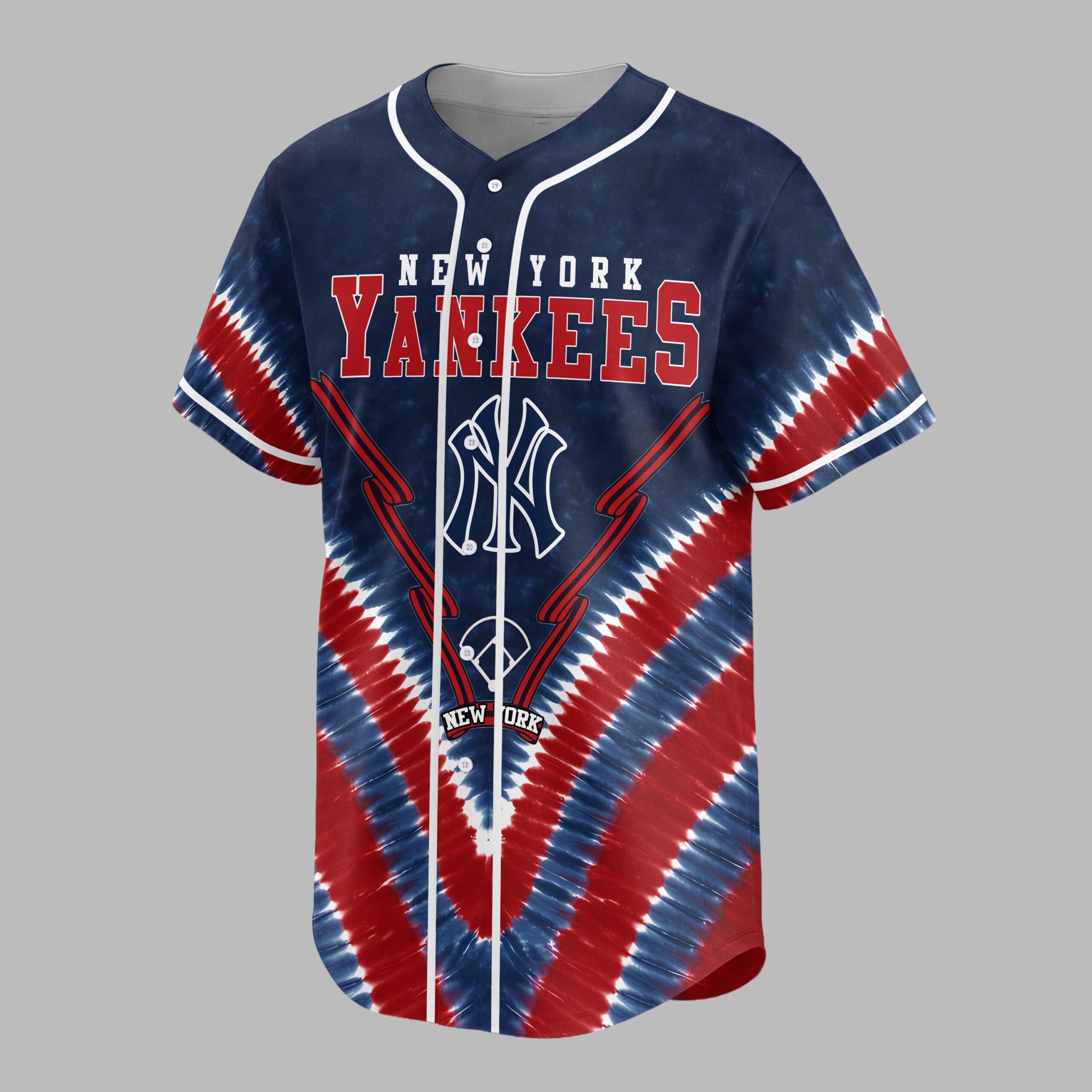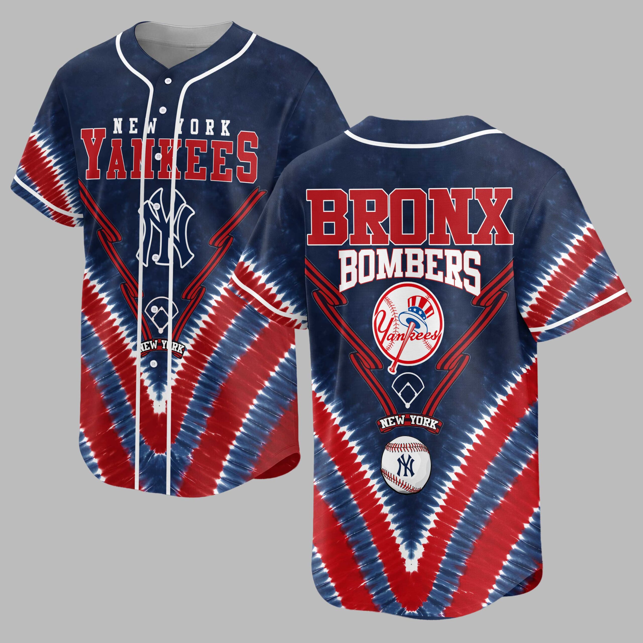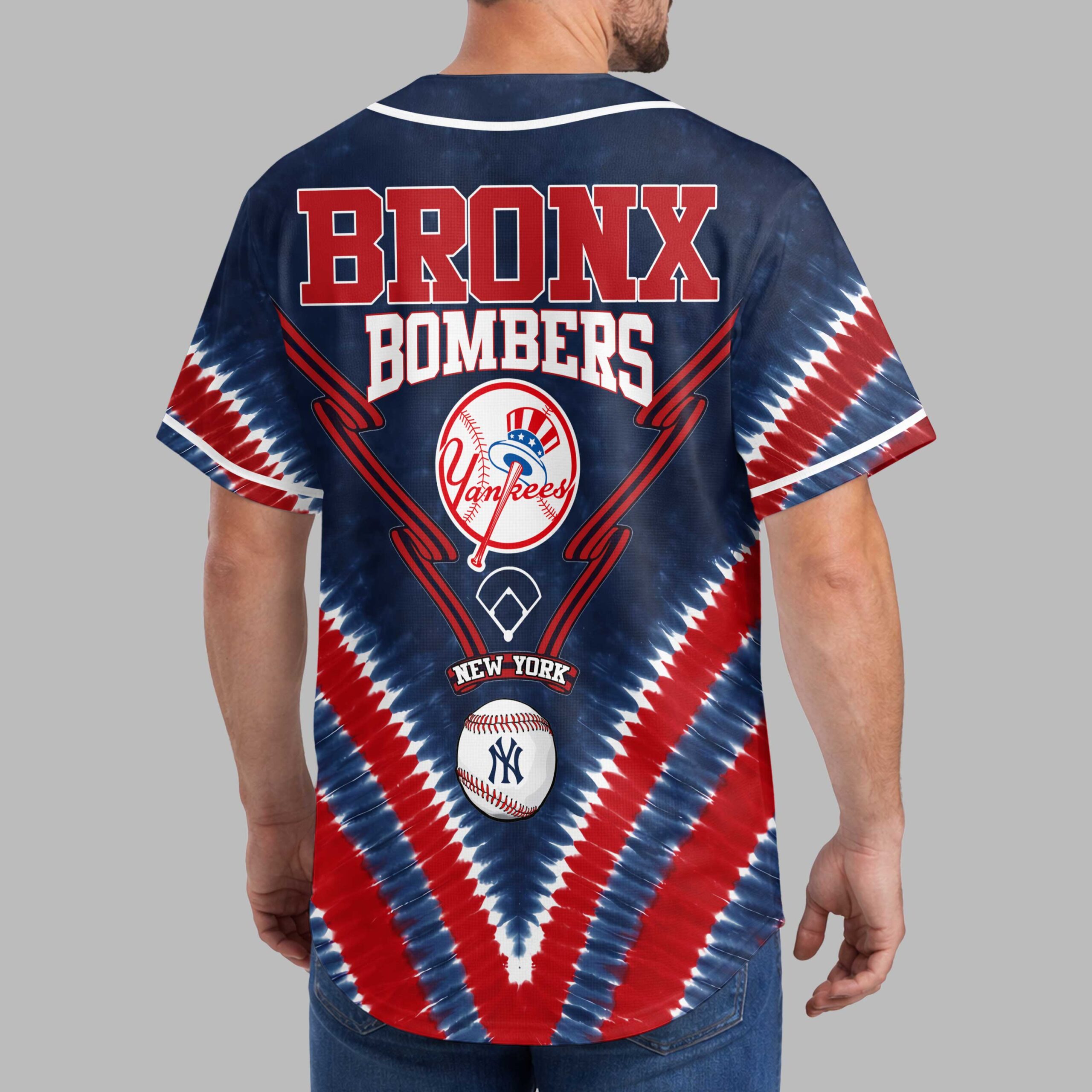 Show your New York Yankees pride with this electrifying tie-dye baseball jersey! Blending classic team spirit with a vibrant red, white, and blue design, this shirt lets you stand out. It’s the perfect way to celebrate your favorite team with patriotic flair. The front features NEW YORK YANKEES and the iconic NY logo, set against a striking tie-dye pattern and baseball bat outlines. The back proudly displays BRONX BOMBERS, a distinct Yankees logo featuring an Uncle Sam hat, plus a detailed baseball and additional graphics, highlighting your team’s powerful legacy. Ideal for game days at the stadium, spirited watch parties, or casual wear, this jersey makes your loyalty undeniable. Champion the New York Yankees with bold style and passionate spirit all season long.