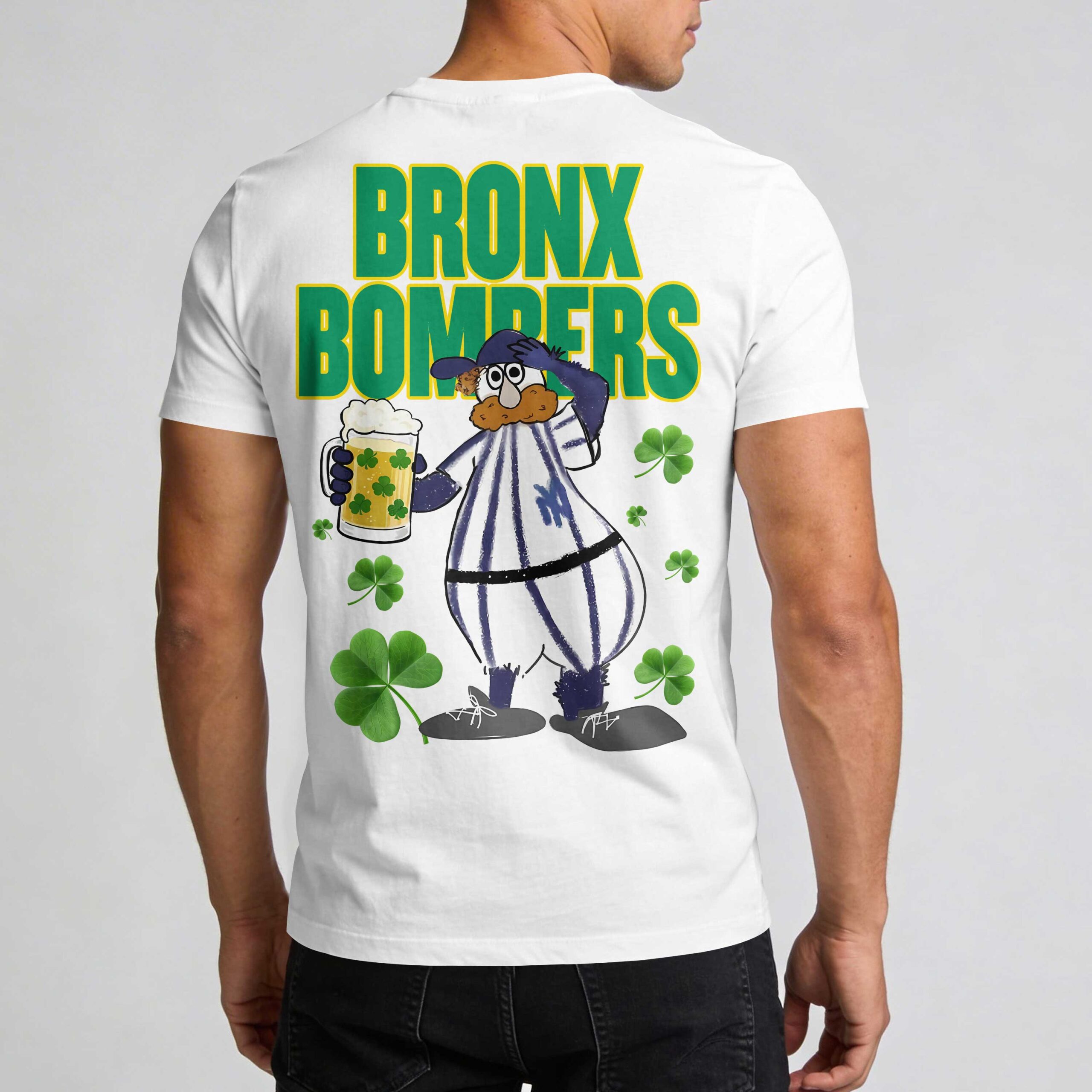 Hit a grand slam this St. Patrick’s Day with this spirited Yankees tee! Perfectly blending your New York Yankees pride with festive Irish charm, this shirt is designed for every fan who loves celebrating in style. It’s the ideal way to show your team spirit and embrace the luck of the Irish all at once. The front proudly displays Yankees in a vibrant green script with a yellow outline, complemented by the iconic NY logo, ensuring your team loyalty shines bright. Turn heads with the back design featuring BRONX BOMBERS in matching green and yellow, alongside a playful baseball-clad character raising a mug full of shamrocks, surrounded by lucky four-leaf clovers. Whether you’re heading to a St. Paddy’s Day parade, catching a game, enjoying festivities with friends, or simply adding a festive touch to your everyday wardrobe, this shirt is your go-to. Celebrate both your favorite baseball team and the holiday with unparalleled enthusiasm!