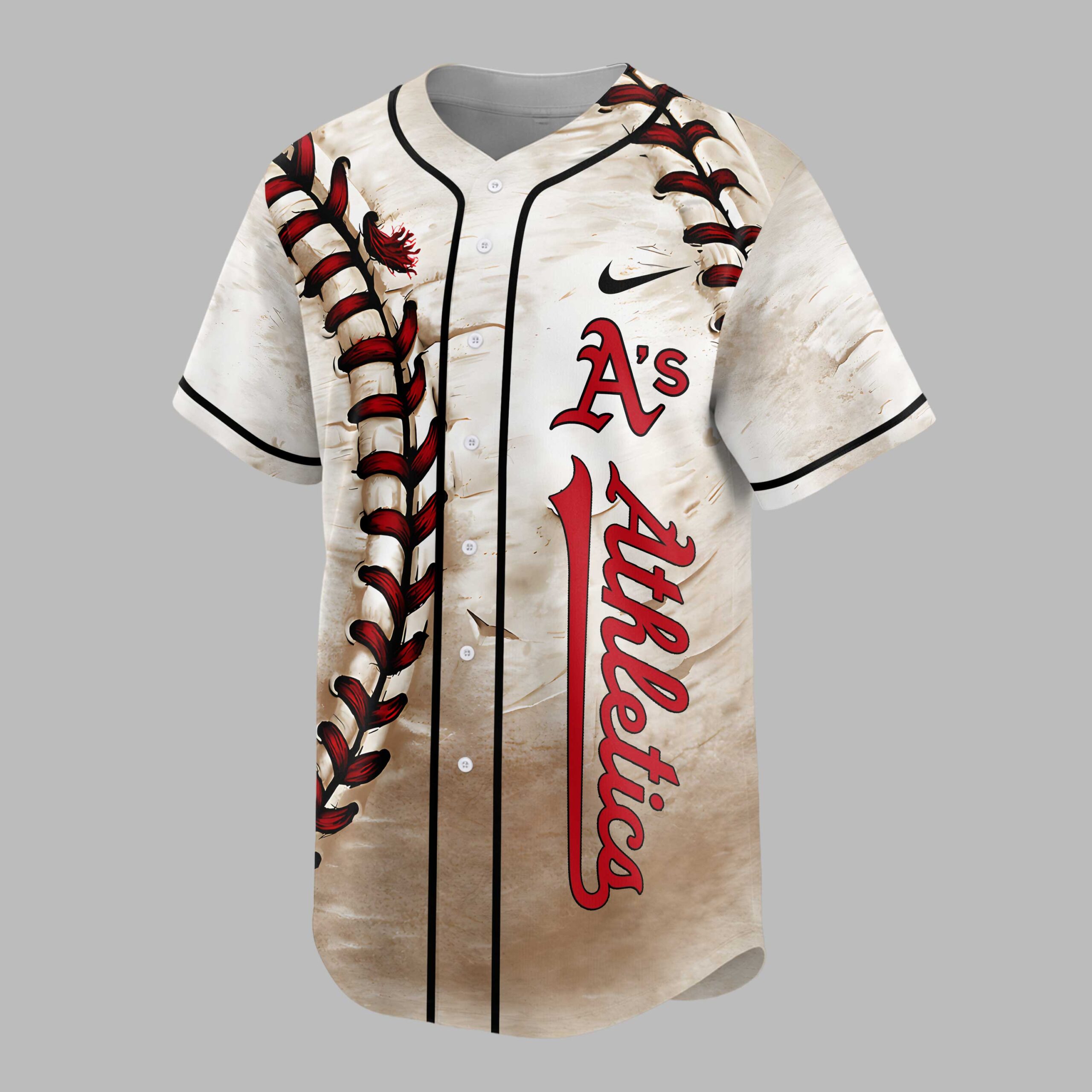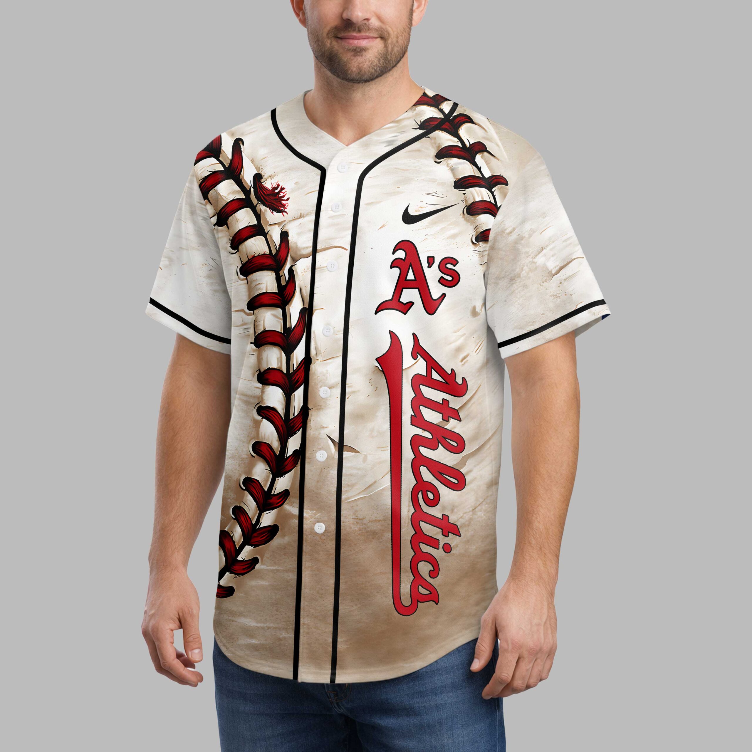 Step up to the plate and show your unwavering support for the A’s with this unique personalized baseball jersey! Perfect for any devoted fan, this top captures the spirit of the game with a rugged, vintage-inspired look. Celebrate your love for the Athletics and stand out with a custom touch that truly makes it your own. The front features striking, large baseball stitching details on one side, paired with the iconic A’s Athletics name running vertically in bold red on the other. The entire jersey boasts a cool distressed texture, giving it a well-loved, classic feel. On the back, customize it with Your Name in a stylish script above your chosen numbers, prominently displayed with baseball stitching within their design. This jersey is ideal for cheering on the A’s at the stadium, gathering with friends for game day, or simply showing off your team pride around town. It’s a fantastic way to represent your favorite team and personalize your everyday casual wear or special fan events.