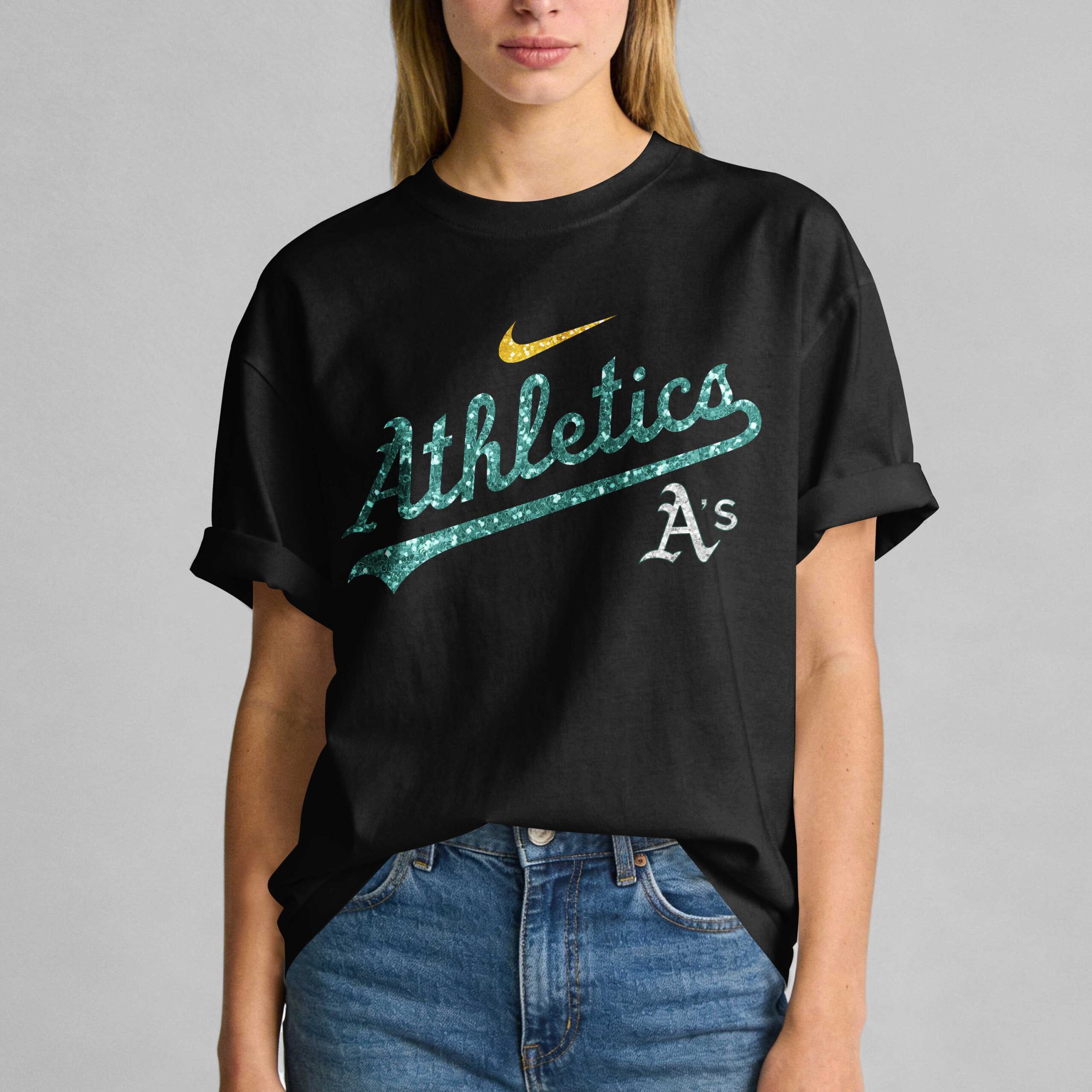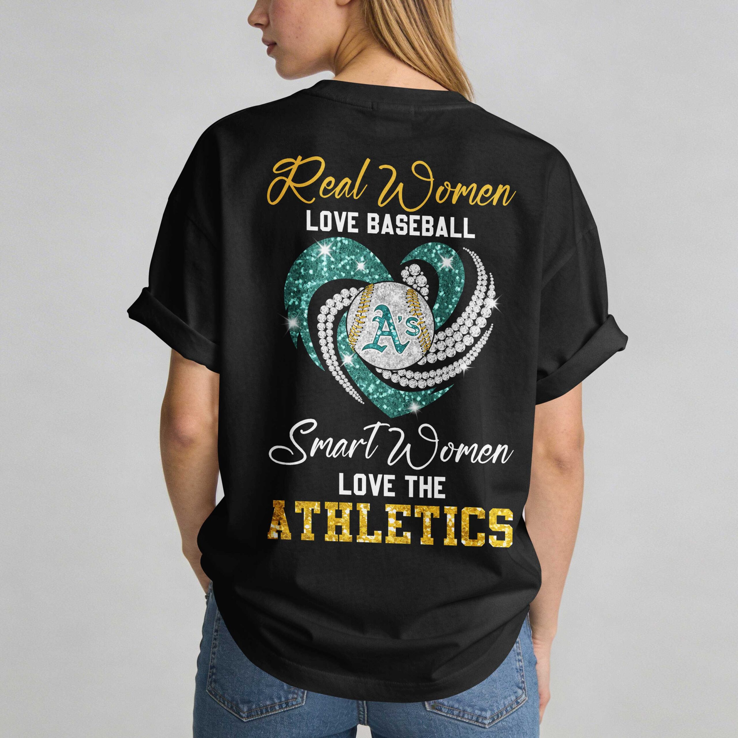 Show off your unwavering team spirit with this Oakland Athletics fan T-shirt. Designed for dedicated supporters, this tee combines your love for the A’s with a bold, celebratory aesthetic. It is the perfect way to represent your team while gearing up for major national milestones and patriotic festivities. The front features the iconic Athletics script in a stunning glitter-textured finish, accented by a sharp gold swoosh. The back makes a proud statement with the text, Real Women Love Baseball, Smart Women Love the Athletics. A shimmering heart graphic, detailed with pearls and swirling green patterns, serves as the centerpiece for this sophisticated design. Whether you are heading to the Coliseum for game day, hosting an Independence Day celebration, or representing your team daily, this shirt is your new go-to. It captures the energy of the ballpark and the pride of being an Athletics fan.