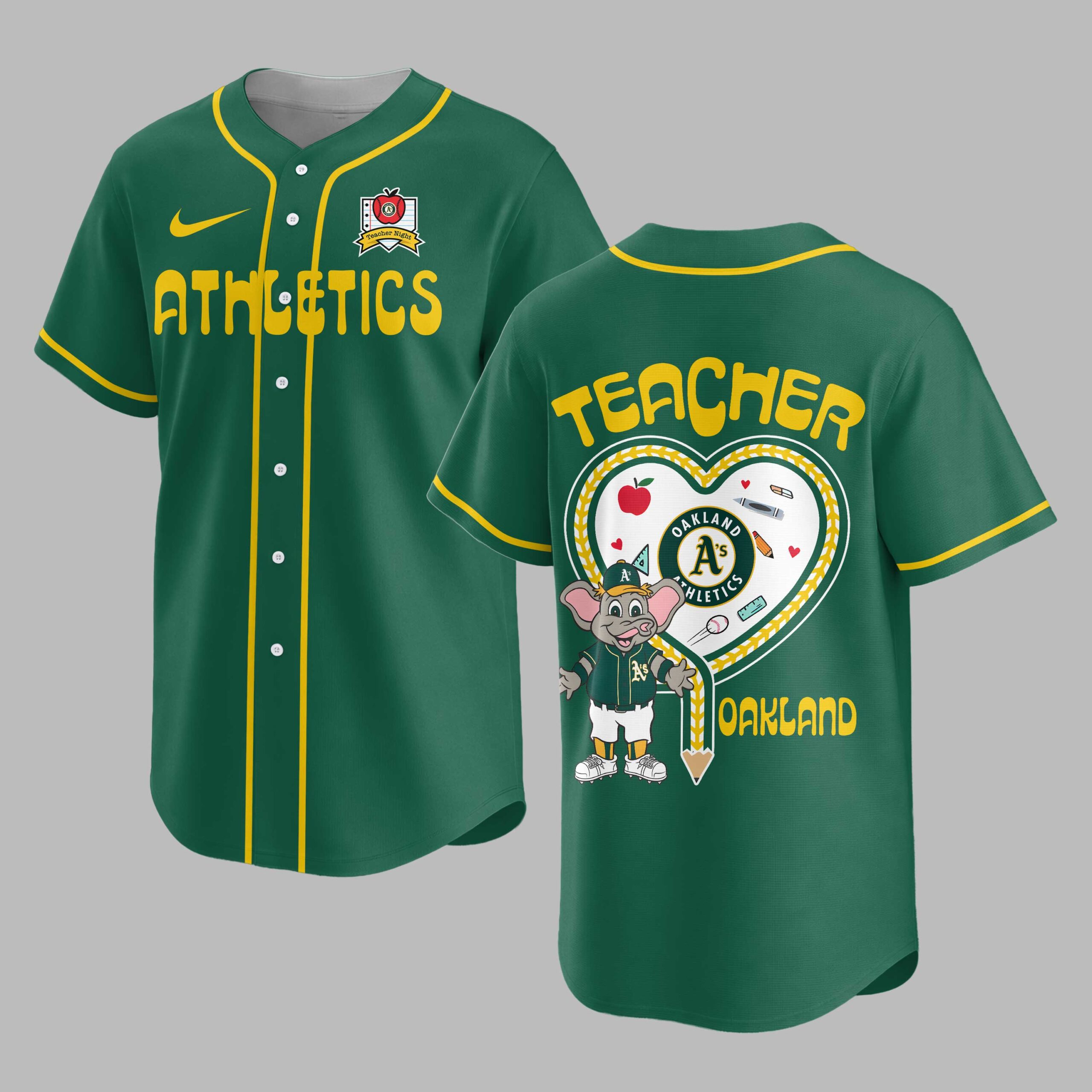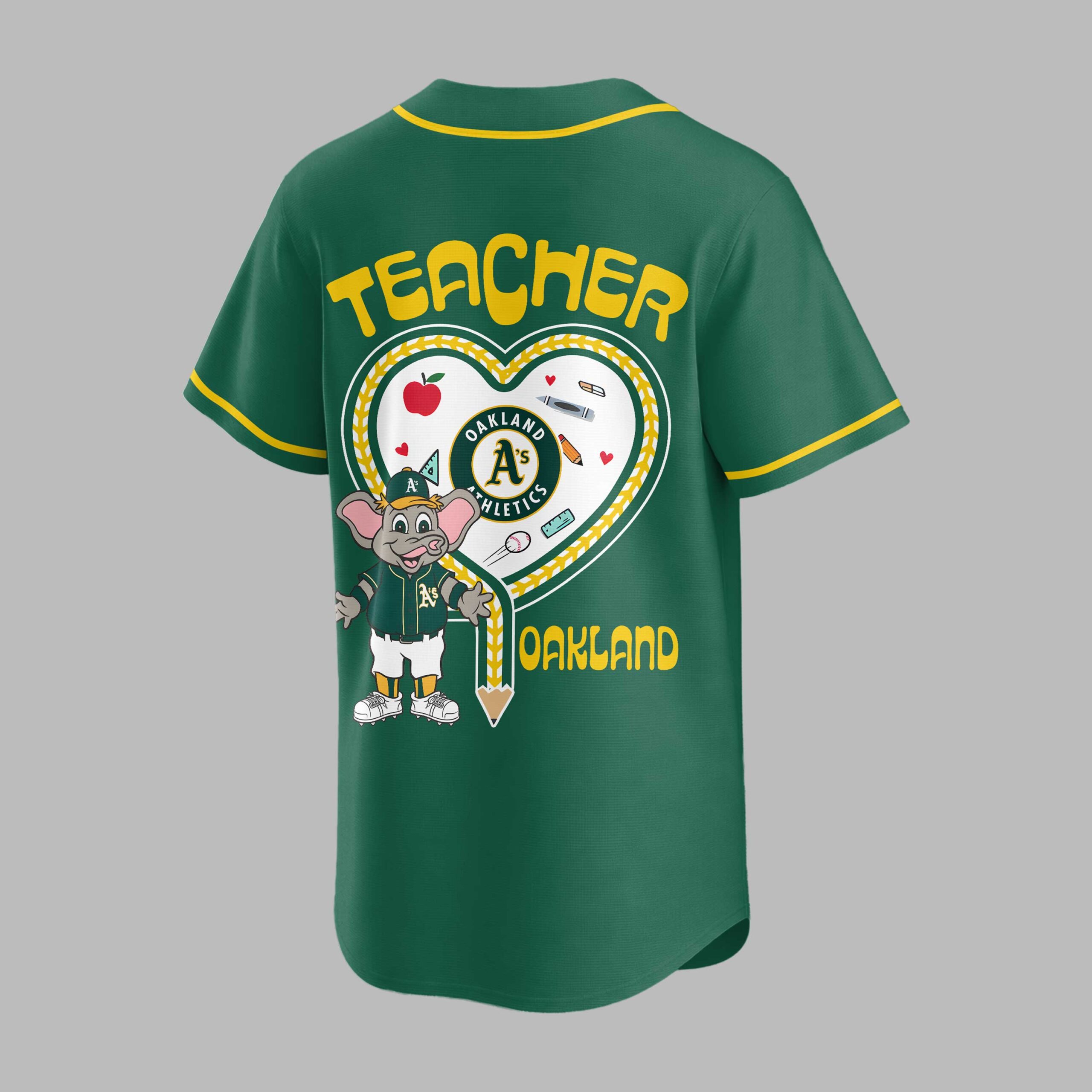 Celebrate your love for both education and baseball with this unique Oakland Athletics Teacher Night jersey! This shirt is a heartwarming tribute to the dedicated educators who also proudly root for the A’s, making it the perfect way to showcase your dual passions with pride. The front of this spirited white jersey boldly displays Athletics in vibrant green, complemented by a special Teacher Night apple emblem on the chest. The back truly shines with TEACHER prominently featured above a lively heart design. Inside the heart, you’ll find the classic A’s logo, their beloved mascot Stomper, and charming school-themed elements like pencils, crayons, and an apple, all tied together with the Oakland name below. Wear this special jersey to an Oakland Athletics game, especially on Teacher Night, to school events, or while out and about. It’s an ideal way to honor your profession, represent your favorite team, and connect with fellow fans and educators, whether you’re in the stands or in the classroom.