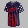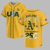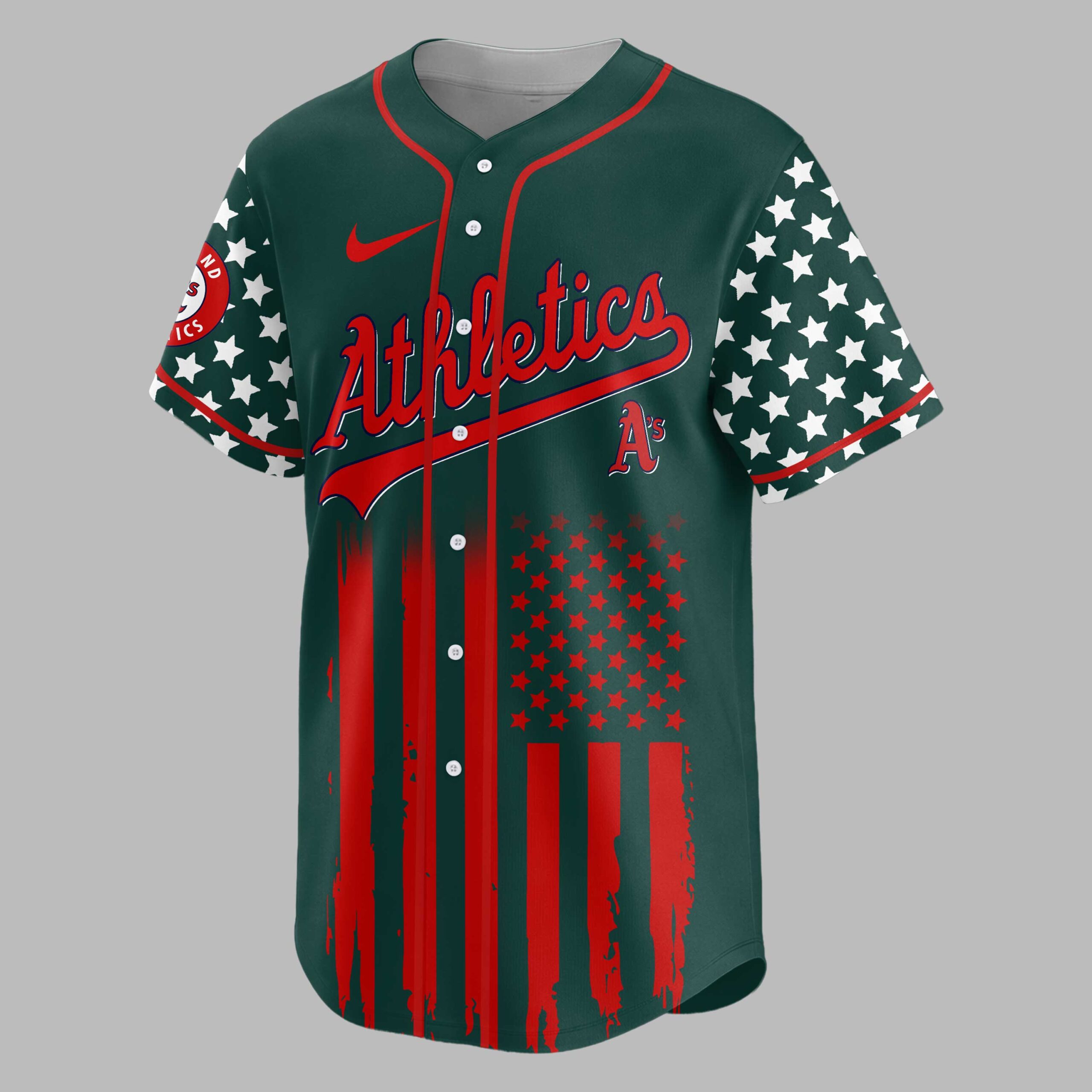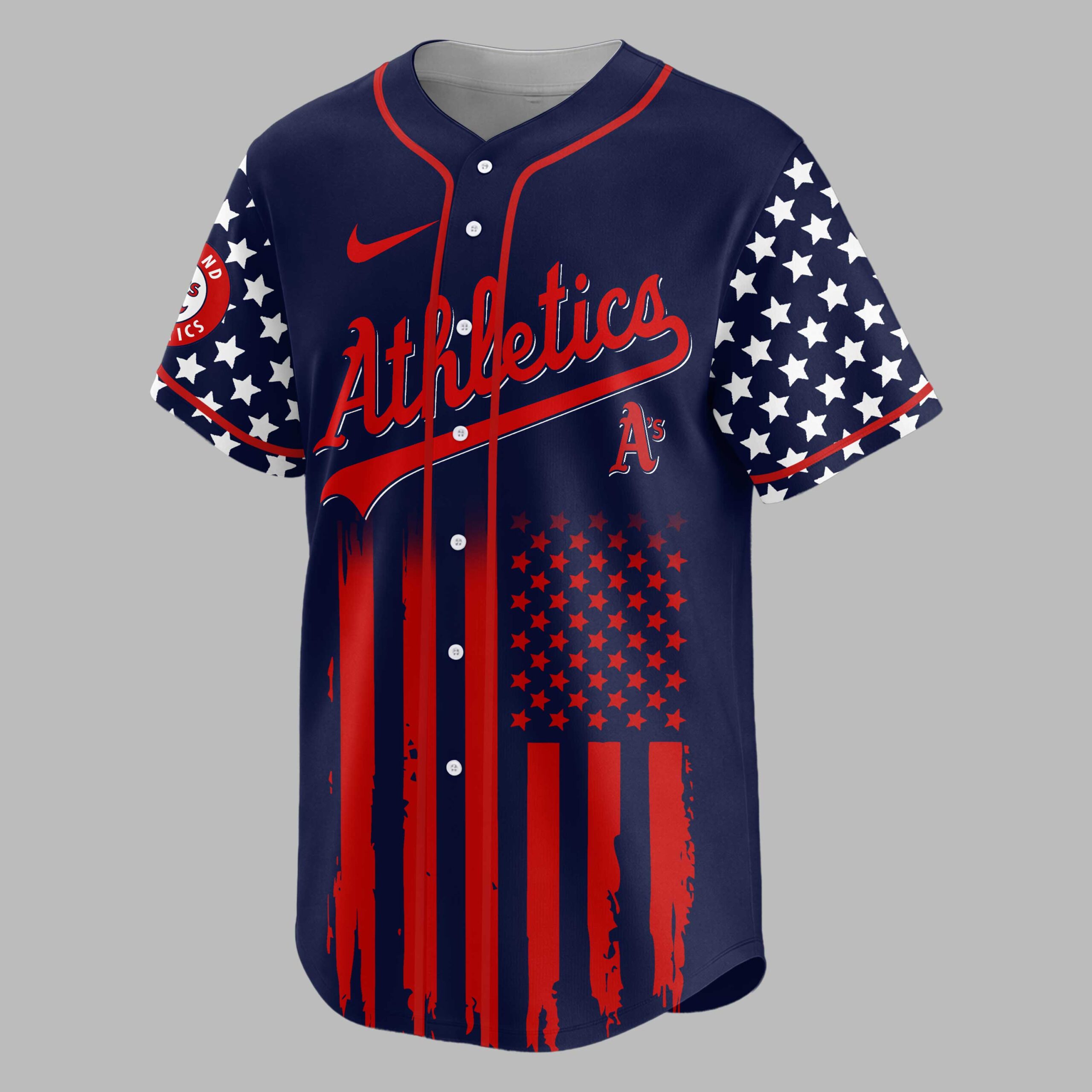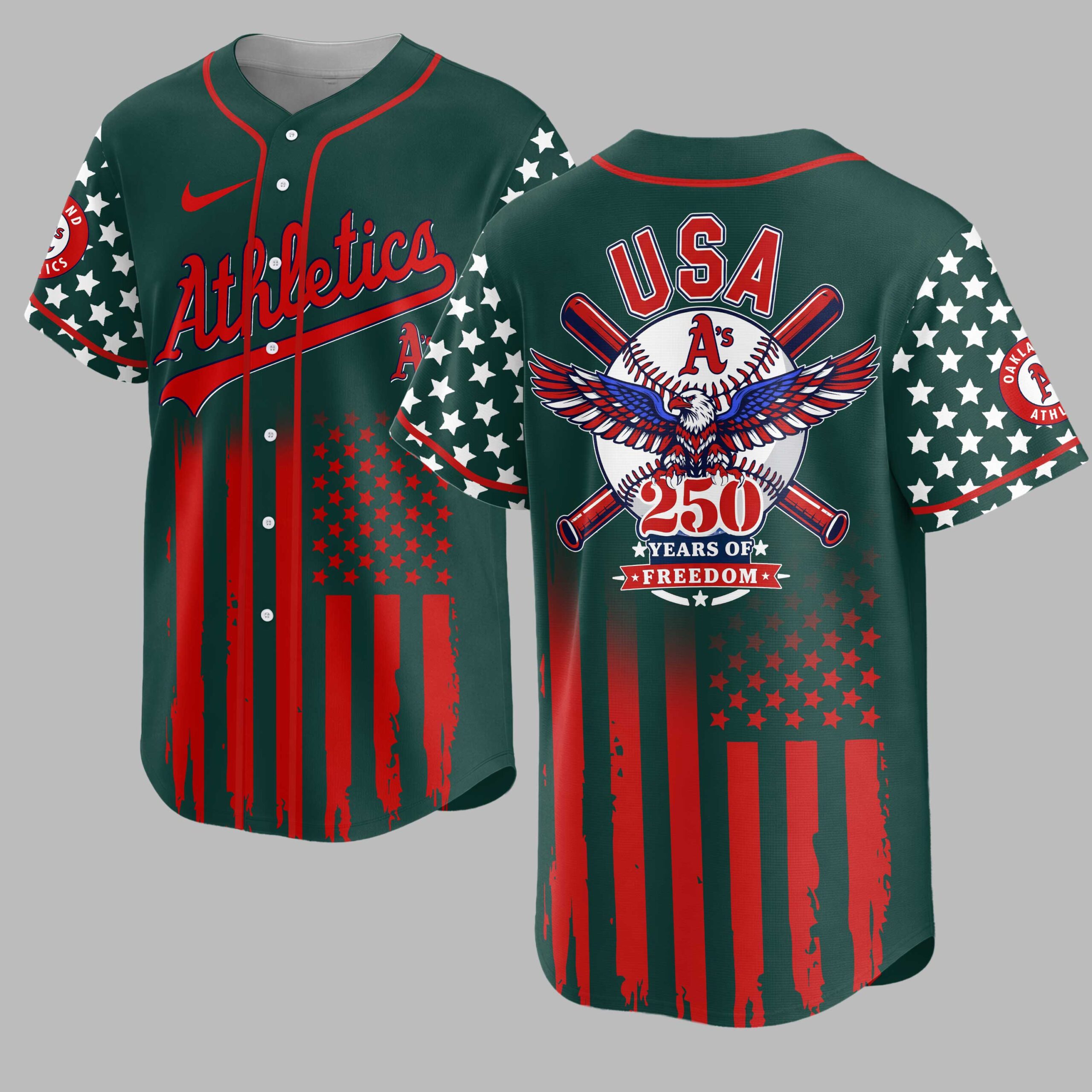 Show your unwavering pride for both your country and your favorite team with this dynamic Oakland Athletics USA Freedom Baseball Jersey! This spirited design perfectly blends the thrill of the game with deep patriotic sentiment, making it a must-have for any A’s fan who loves America. The front proudly displays Athletics in bold red script, accented by a distressed American flag motif of red stripes and a starry navy background on the sleeves. The back explodes with patriotism, featuring USA above a baseball graphic, complete with an eagle and the A’s logo, all commemorating 250 YEARS OF FREEDOM against a backdrop of red stripes and stars. This jersey is perfect for celebrating national holidays like the Fourth of July, Memorial Day, or any game day at the ballpark. Wear it to fan gatherings, barbecues, or simply as a bold statement of your dual loyalties. It’s an ideal way to honor America’s freedom while cheering on the Oakland A’s.