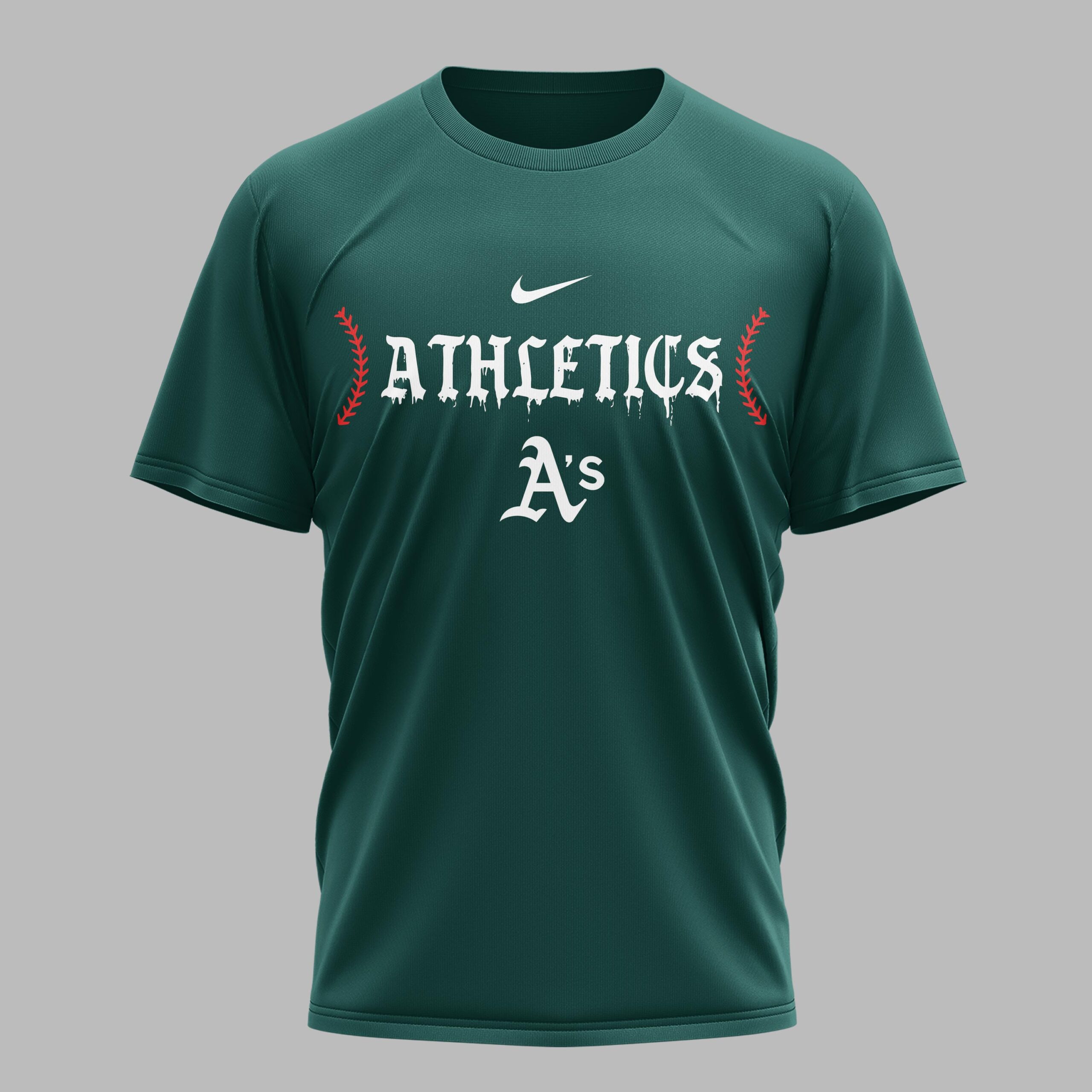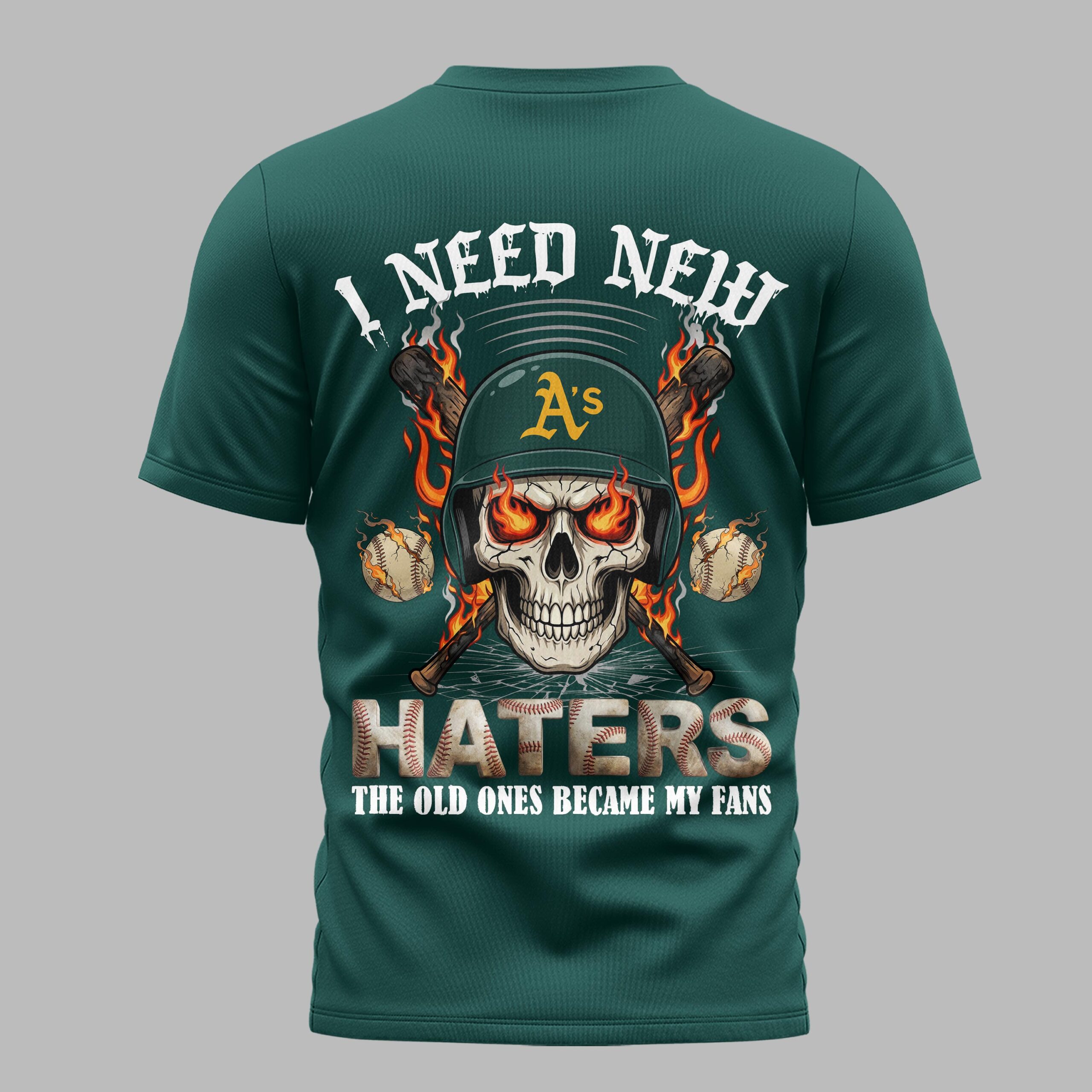 Unleash your ultimate team spirit with this bold Athletics A’s fan tee, designed for those who stand unwavering with their team. This shirt isn’t just apparel; it’s a confident declaration of loyalty, perfect for dedicated fans who embody the grit and determination of their favorite baseball team. The front proudly displays ATHLETICS in a striking, distressed font, accented by classic red baseball stitching and the iconic A’s logo. The back makes an even more powerful statement, featuring a fierce skull donning an A’s baseball helmet, surrounded by flaming baseballs and crossed bats. Below this intense imagery, the compelling message reads, I NEED NEW HATERS THE OLD ONES BECAME MY FANS, set against a dynamic shattered glass effect. Sport this eye-catching tee at the ballpark, your favorite sports bar, or any casual outing. It’s the ideal way to showcase your Oakland Athletics pride and confident attitude, whether you’re cheering from the stands, watching with friends, or simply making a statement every day.