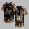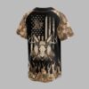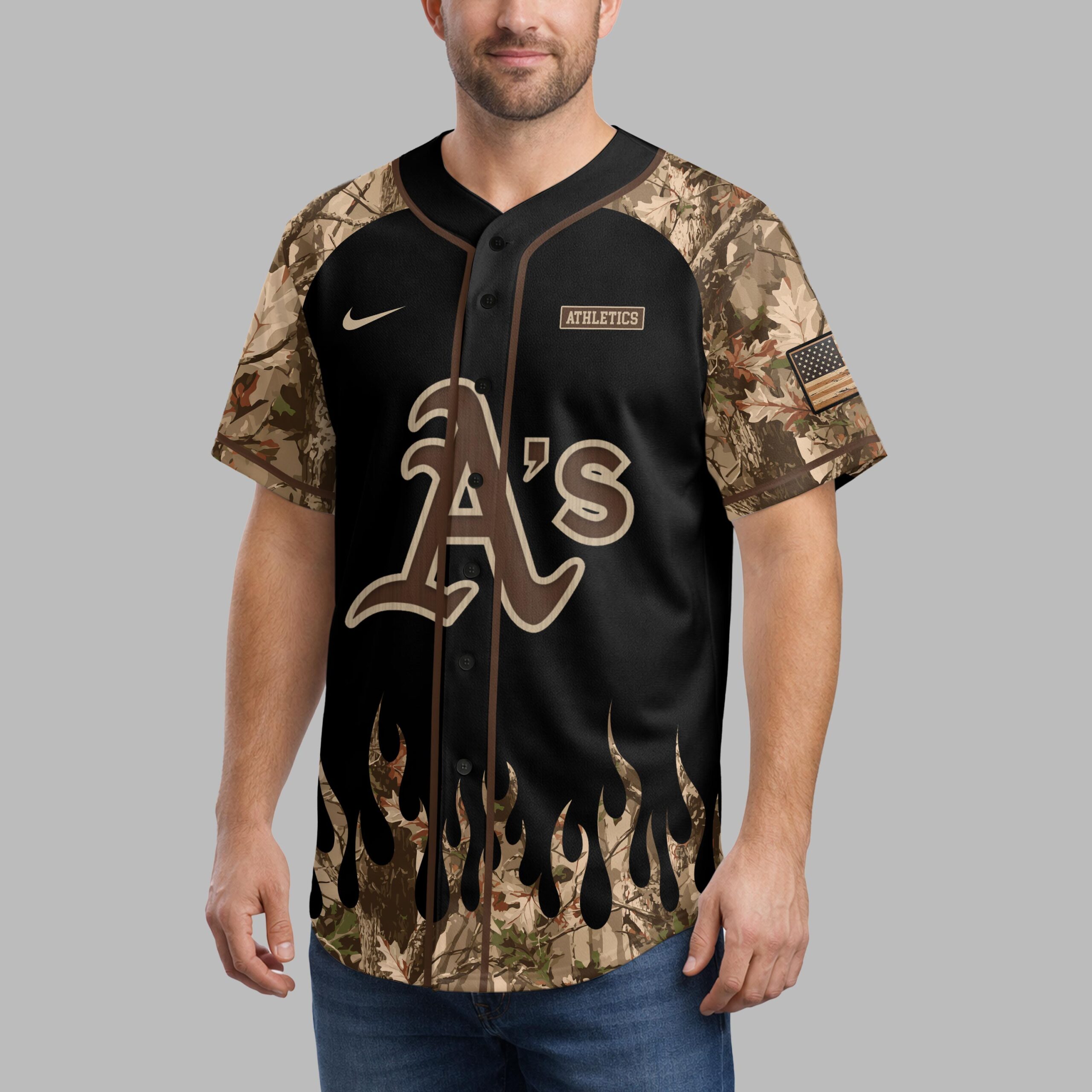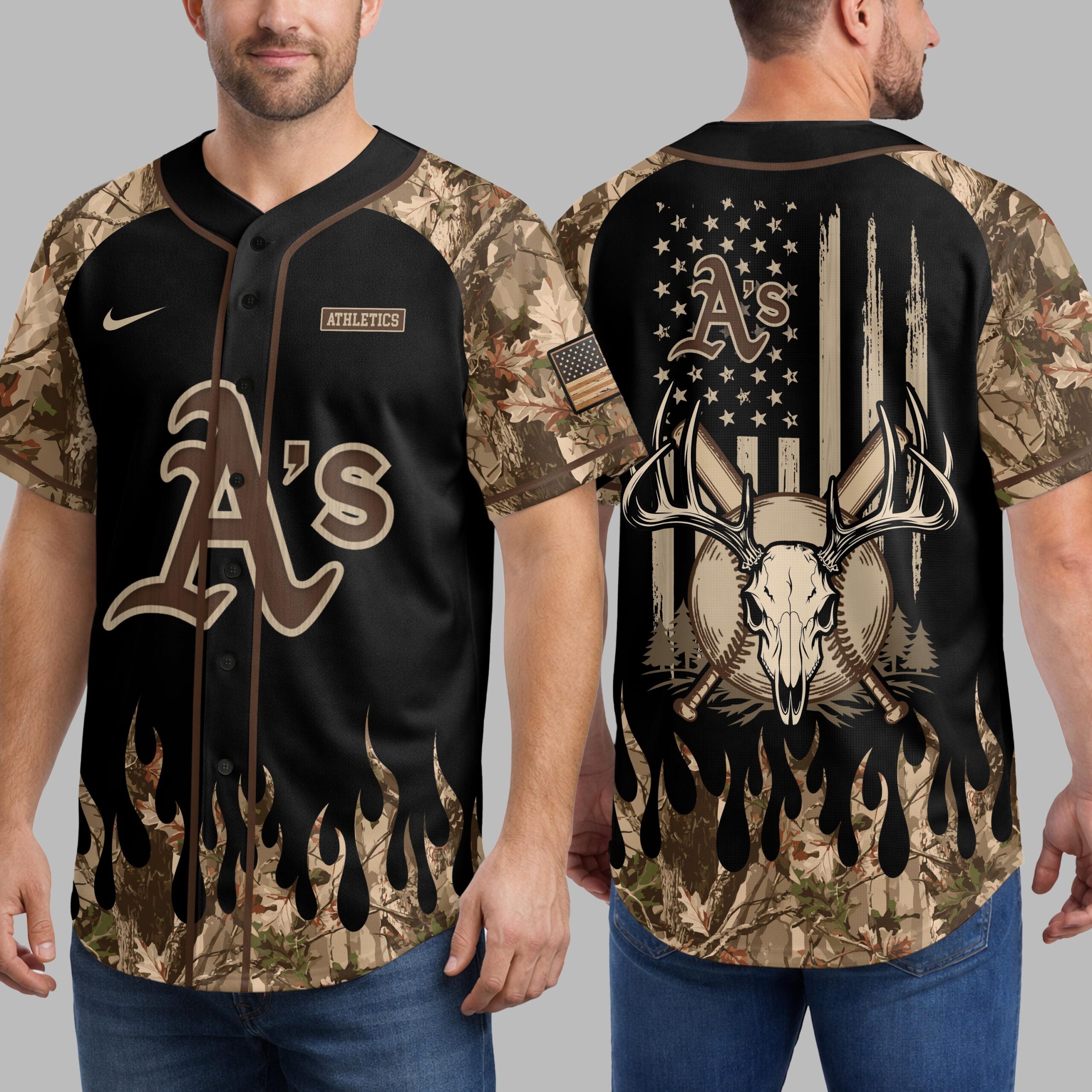Showcase your diverse passions with this unique Athletics A’s baseball jersey. Blending team pride, rugged outdoor spirit, and patriotic flair, it’s perfect for fans who love the game, embrace hunting, and honor their country. Make a bold statement. The front features the iconic A’s logo on black, framed by realistic camouflage sleeves. A dynamic camo flame design accents the lower hem. The back presents a commanding deer skull with antlers over crossed baseball bats and pine trees, all set against a distressed American flag, topped by the A’s logo. This versatile jersey is ideal for game days, outdoor trips, or patriotic celebrations. From the ballpark to hunting camp or a Fourth of July event, proudly represent your team, nature, and country with authentic American style.