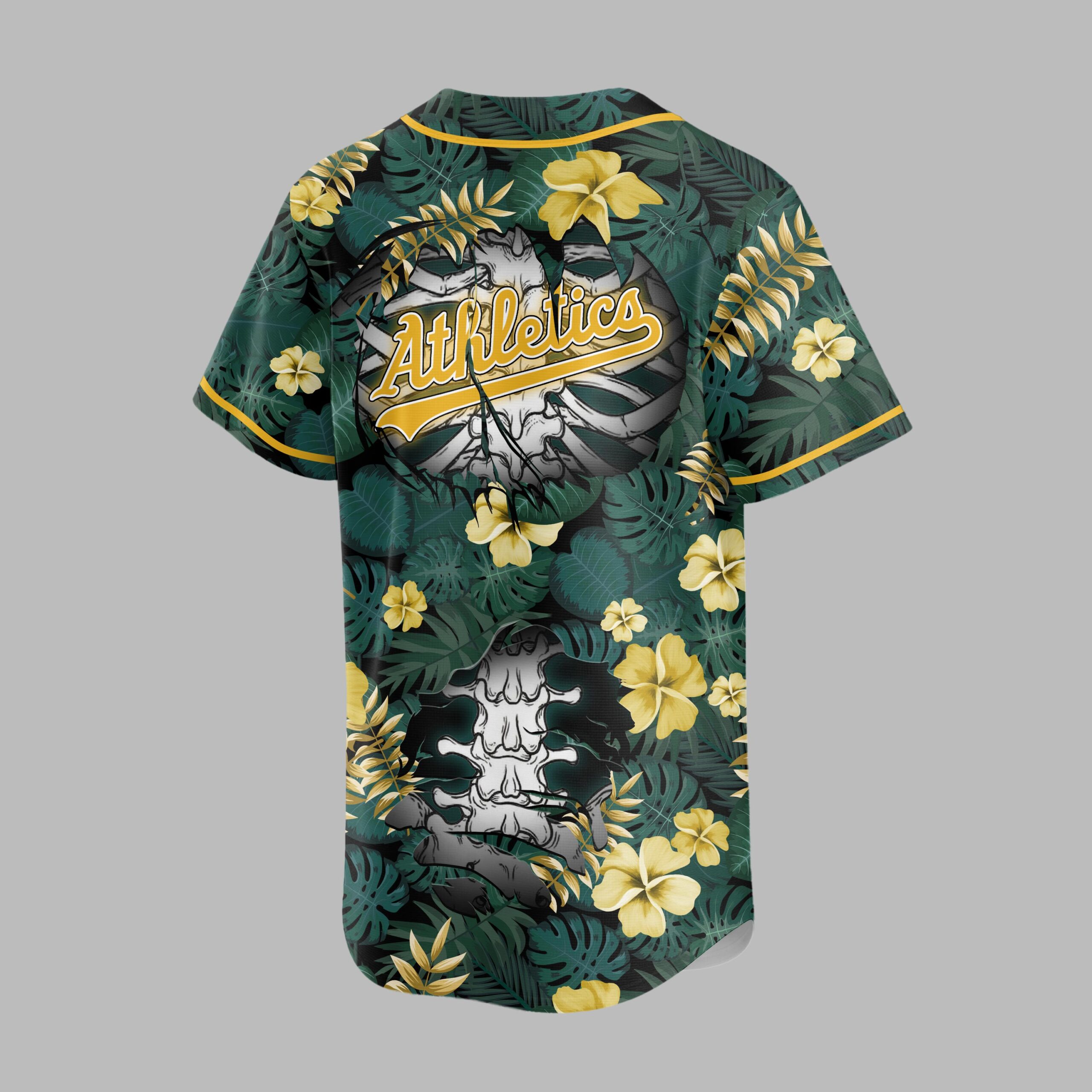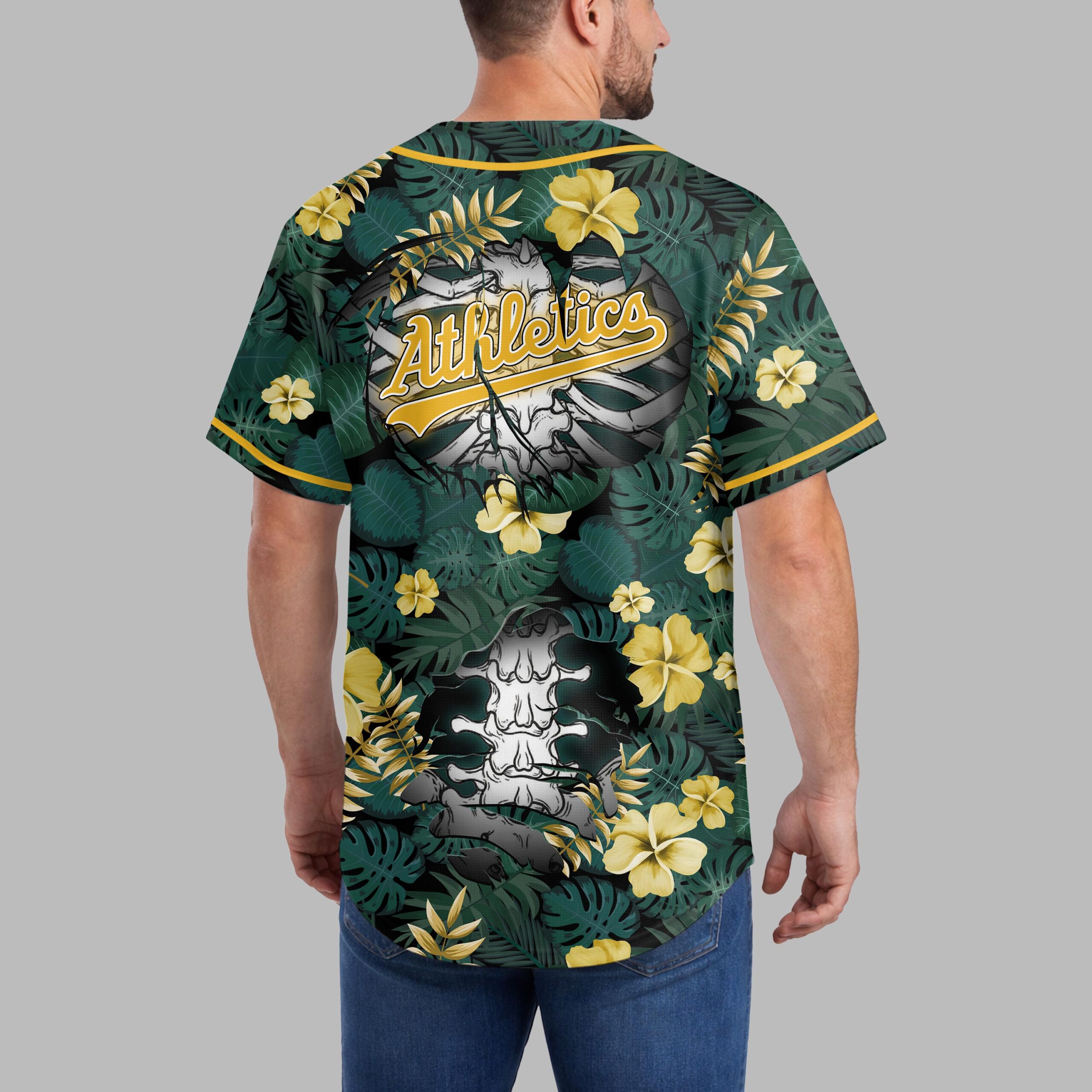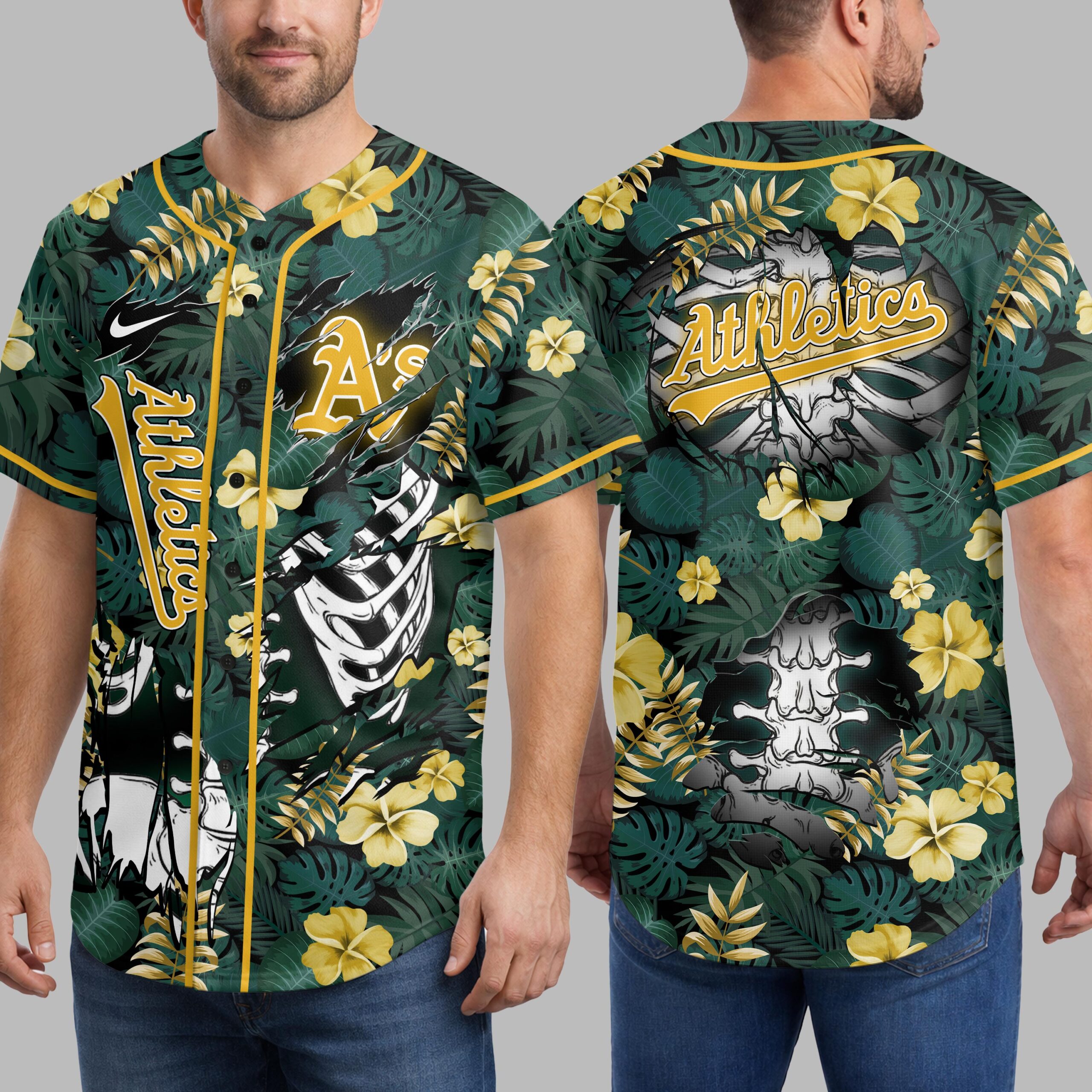 Unleash your team spirit with a bold twist in this unique Athletics baseball jersey! Perfect for fans who love to stand out, this shirt combines classic team pride with an unexpected, vibrant tropical skeleton design. It’s more than just game day attire; it’s a statement of your unshakeable devotion and playful personality. The front of the jersey features the iconic A’s logo and Athletics wordmark in golden yellow, seemingly tearing through the fabric to reveal a skeletal ribcage beneath. This edgy detail is set against a lush backdrop of deep green tropical leaves and bright yellow hibiscus flowers. On the back, the Athletics name spans across the shoulders, with a detailed spinal column and pelvis emerging from the same vibrant foliage pattern. Whether you’re catching a game at the ballpark, enjoying a summer BBQ, or simply showcasing your unique style, this jersey is designed for memorable moments. It’s ideal for fan gatherings, themed parties, or any casual occasion where you want to celebrate your favorite team with an adventurous and eye-catching flair.