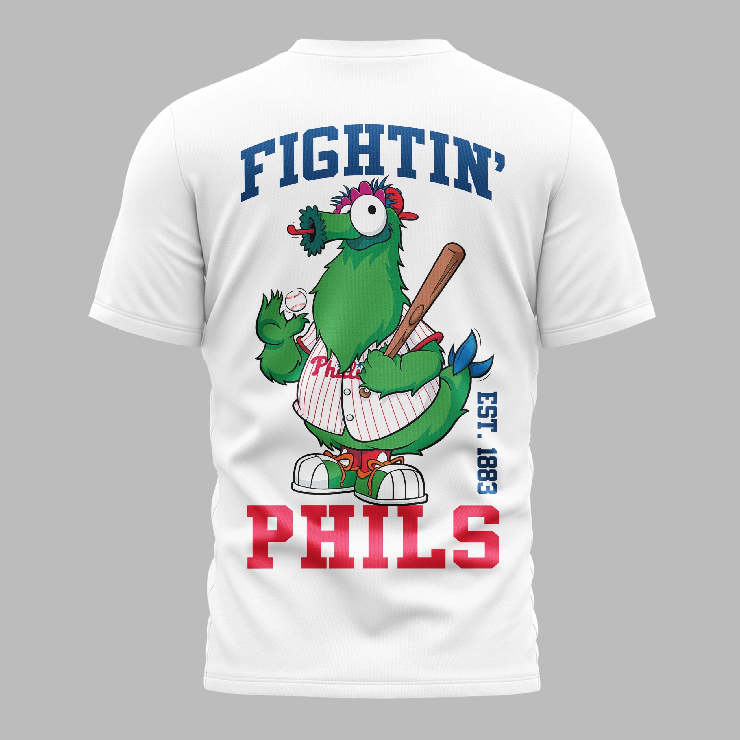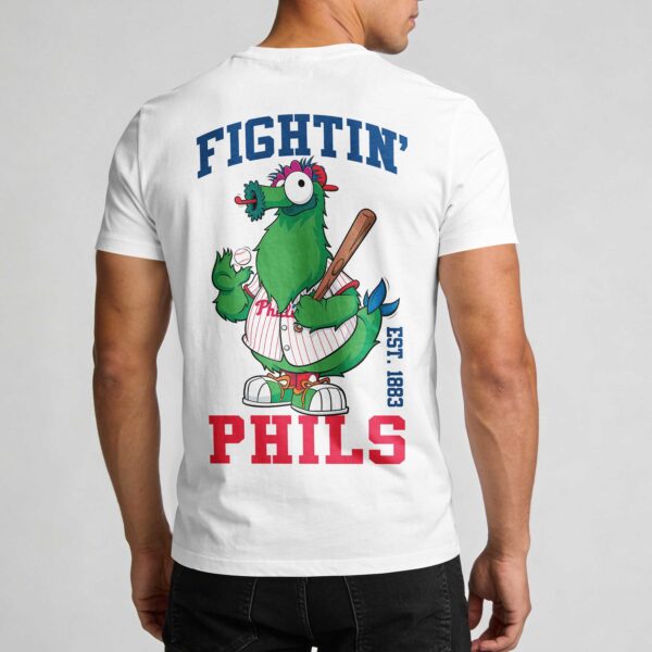Show your unwavering support for the Philadelphia Phillies with this dynamic baseball tee! Perfect for any devoted fan, this shirt captures the spirit and history of the Fightin’ Phils, letting everyone know where your baseball loyalty lies. It’s a statement of passion for your team. The front proudly features the iconic Philadelphia skyline in blue, above a stylized Phillies graphic in bold red and blue, complete with a baseball design and energetic red streaks. The back showcases the beloved Phillie Phanatic, ready for action in his pinstripes, holding a bat and ball. FIGHTIN’ is boldly displayed above him, with PHILS below, and EST. 1883 celebrating storied heritage. Whether you’re heading to Citizens Bank Park, catching the game with friends, or simply going about your day, this shirt is ideal for celebrating every home run and unforgettable moment. It’s perfect for game days, watch parties, or any occasion where you want to represent your Philadelphia Phillies pride.