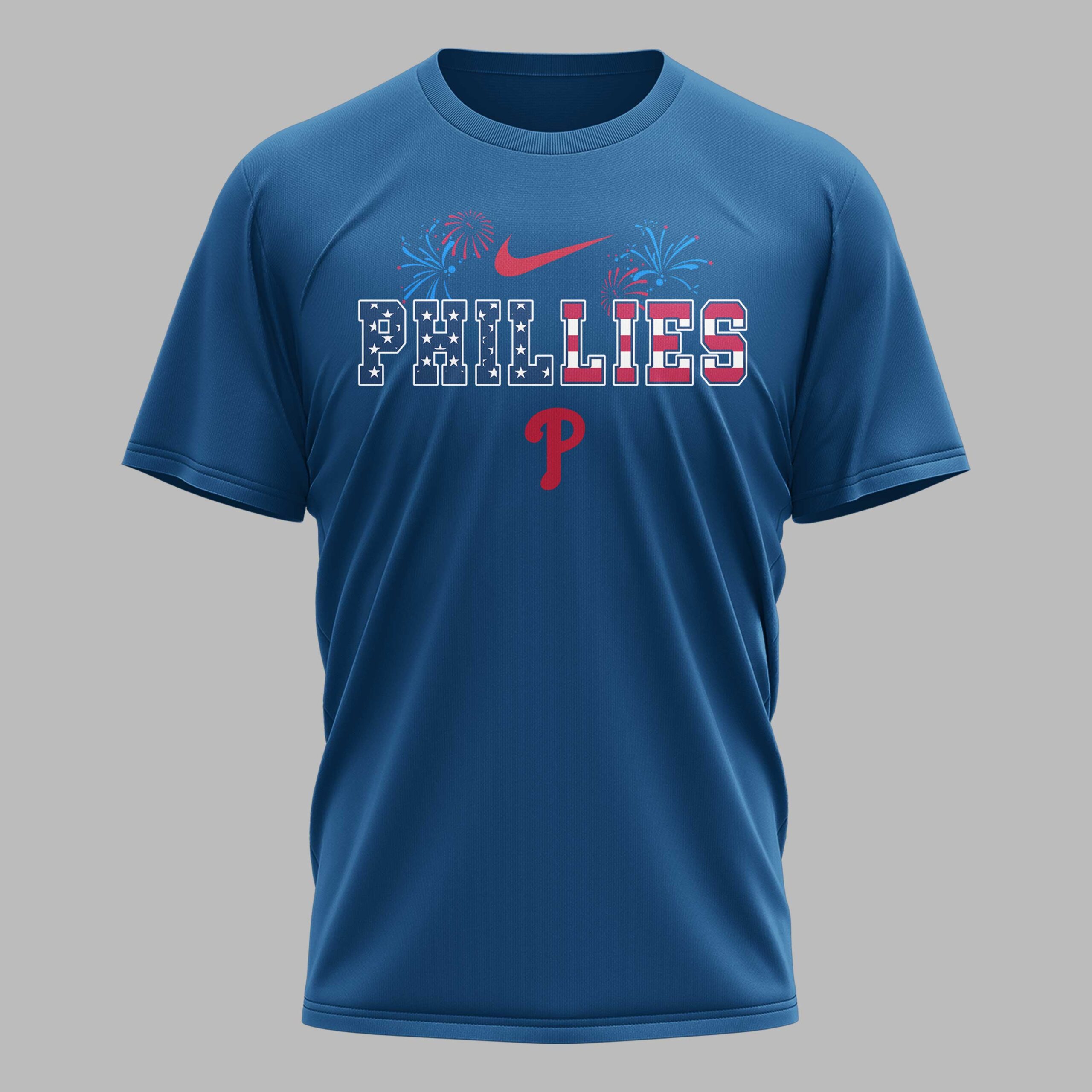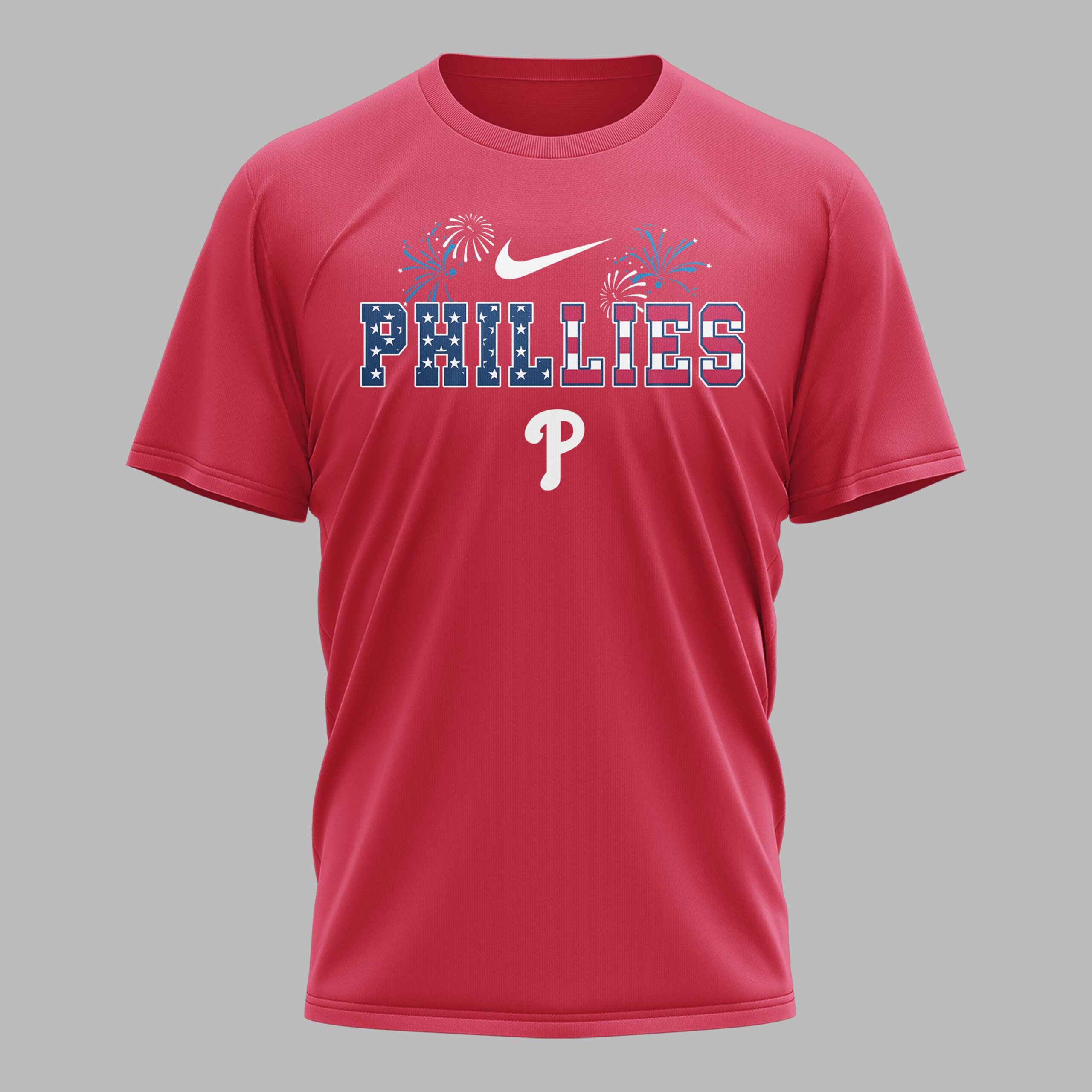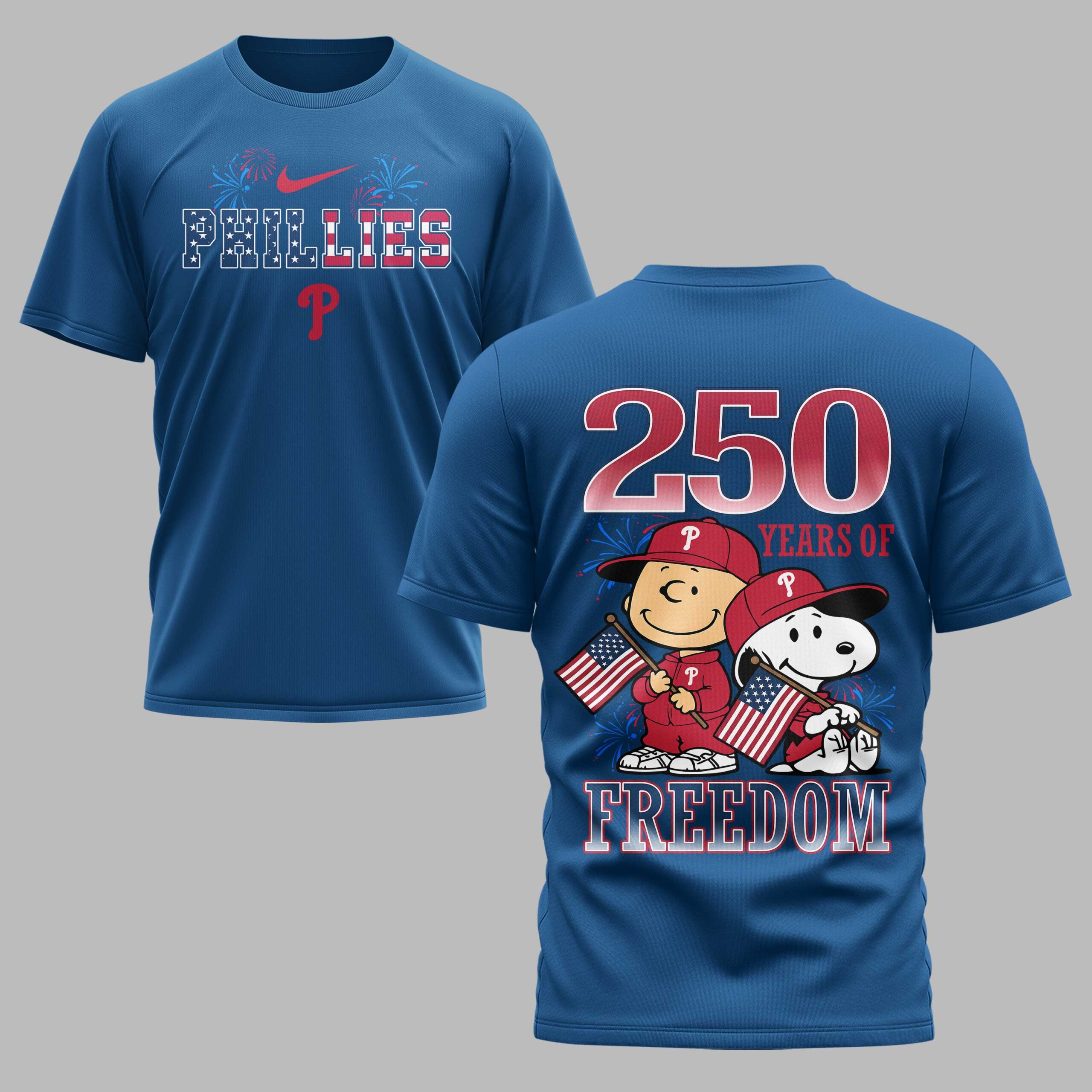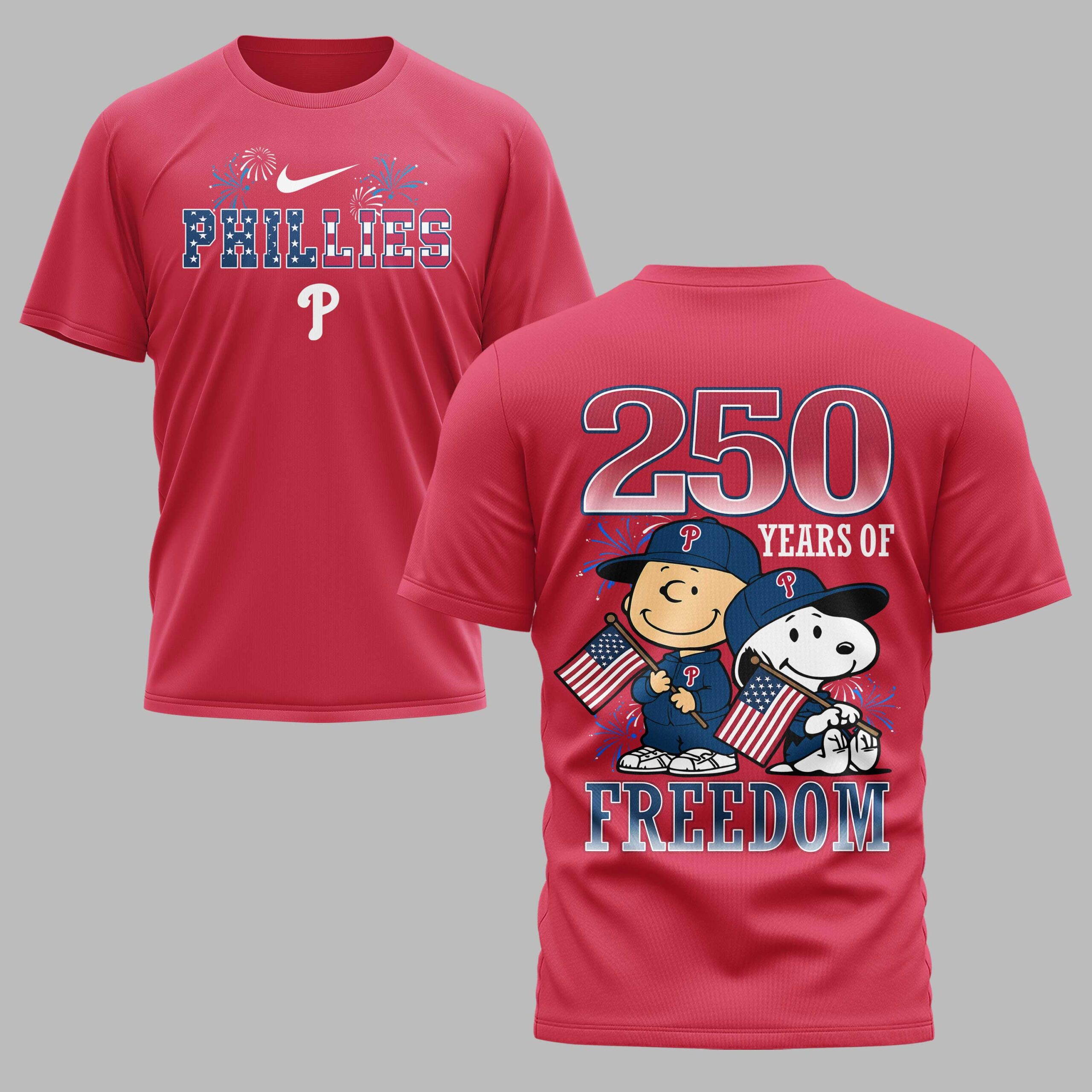 Celebrate your unwavering Philadelphia Phillies pride and American spirit with this unique patriotic tee! Featuring beloved Peanuts characters, this shirt is a grand slam tribute to both your favorite baseball team and the enduring spirit of freedom. The front proudly showcases PHILLIES in a vibrant red, white, and blue, star-spangled design, accented with festive fireworks and the iconic Phillies P logo. Turn heads with the back design, where Charlie Brown and Snoopy are dressed in Phillies caps, joyfully waving American flags beneath a bold 250 YEARS OF FREEDOM, all framed by dazzling fireworks. This spirited shirt is perfect for game days, Fourth of July celebrations, Memorial Day, or any day you want to display your love for the Phillies and country. Wear it to parades, picnics, or simply as you cheer on the team, embodying both national pride and baseball passion.