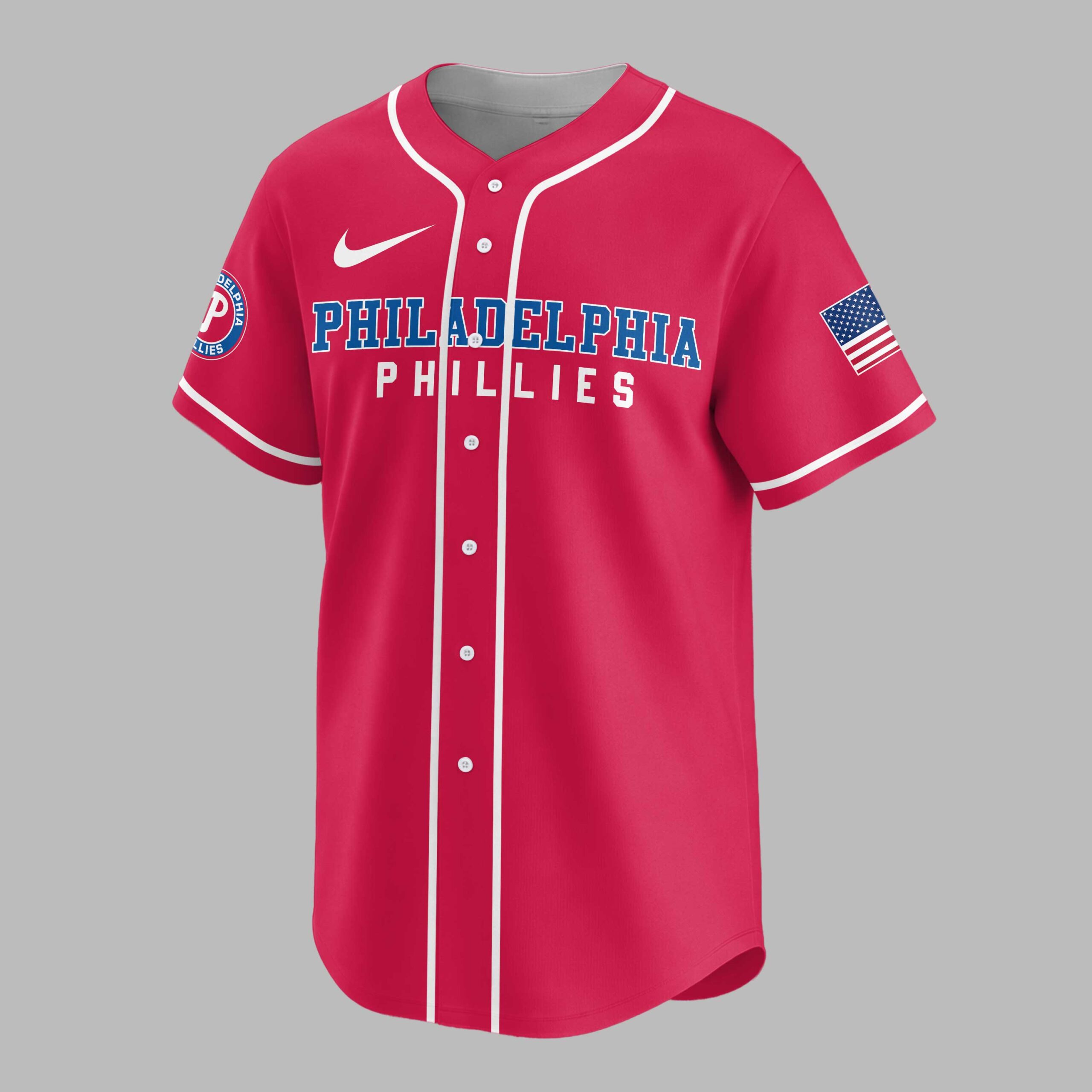 Unleash your ultimate Phillies spirit with this vibrant baseball jersey, celebrating the heart and soul of Philadelphia baseball! This dynamic design lets you proudly display your allegiance to the Fightin’ Phils and their legendary mascot. It’s more than just a jersey; it’s a statement of passion for every pitch and every win. The front of the jersey proudly displays PHILADELPHIA PHILLIES in bold blue lettering across the chest, complemented by the classic P logo on the left sleeve. Turning around, the back explodes with energy, featuring the iconic Philadelphia Phanatic in a ready-to-play stance, bat in hand. Above him, FIGHTIN’ declares the team’s fierce spirit, while PHILS below, alongside EST. 1883, solidifies the team’s deep-rooted history. An American flag design on the left sleeve adds a touch of patriotic pride. Whether you’re cheering from the stands at Citizens Bank Park, gathering with fellow fans for a watch party, or simply showing your team pride around town, this jersey is the perfect way to represent your beloved Phillies. Gear up and let everyone know where your loyalty lies!