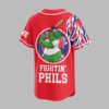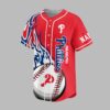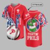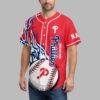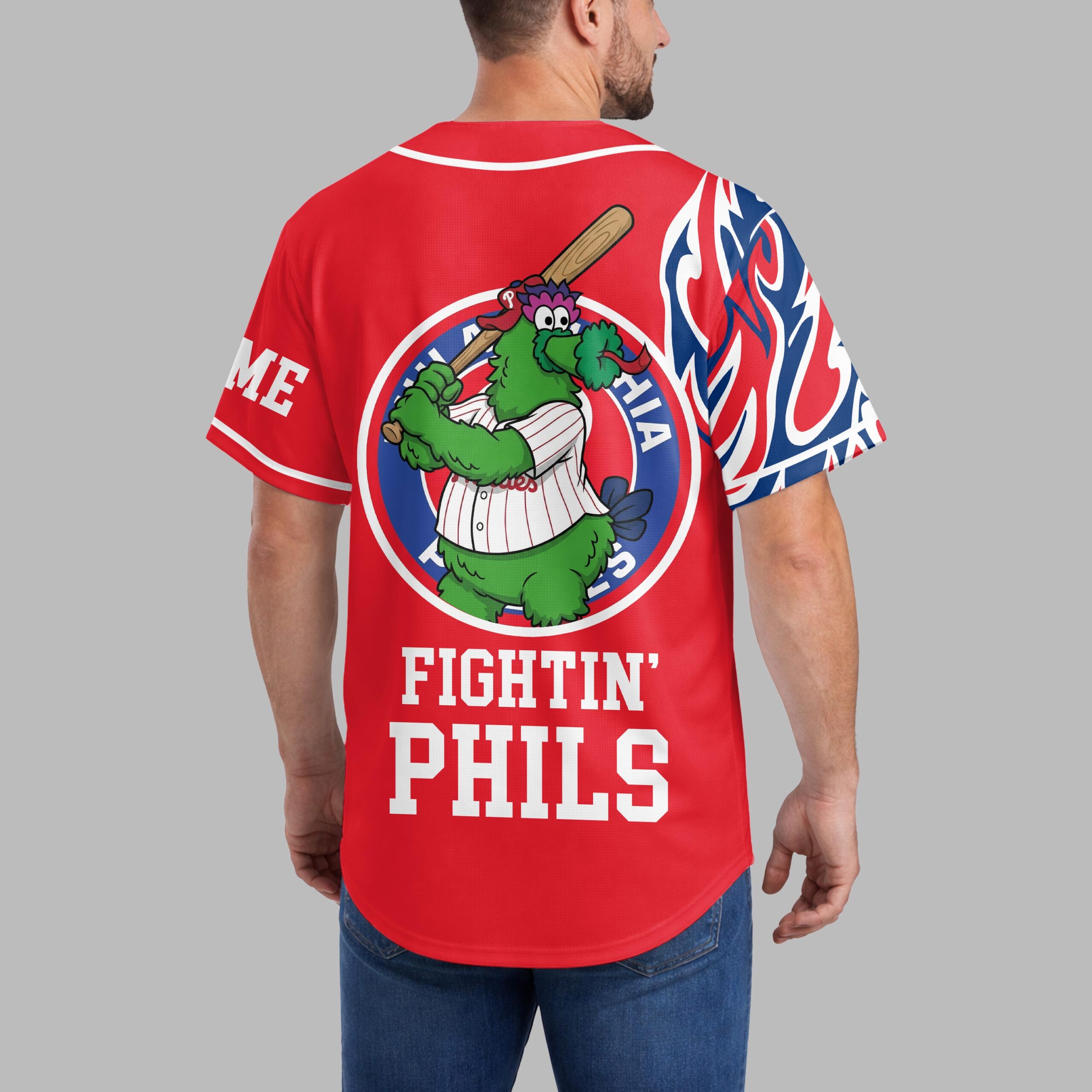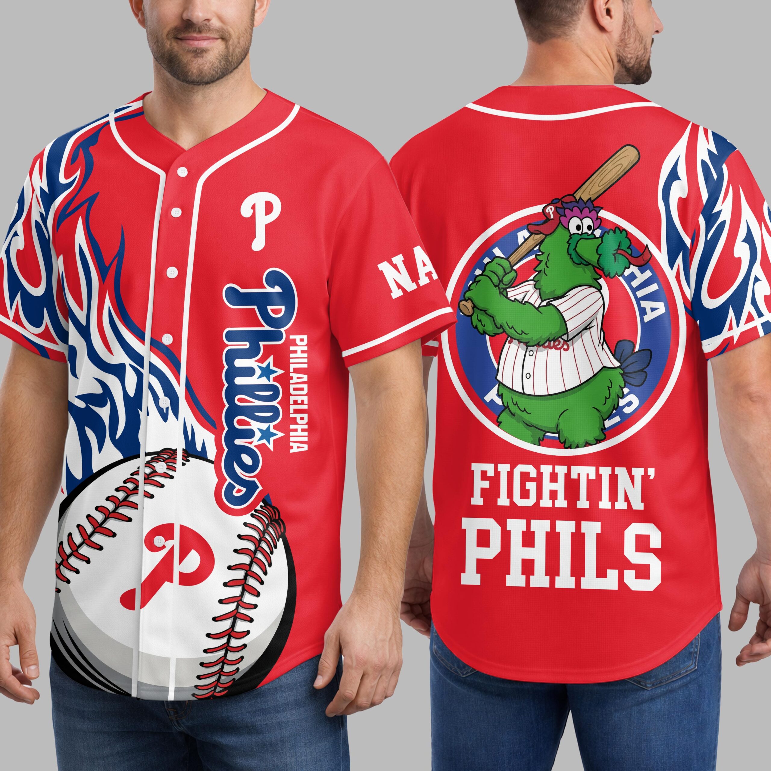 Show your unwavering Philadelphia Phillies pride with this dynamic baseball jersey! Designed for the ultimate fan, this vibrant red top celebrates your favorite team with bold graphics and an unmistakable spirit. It’s the perfect way to represent the Fightin’ Phils and bring that game-day energy wherever you go. The front of the jersey features crisp white piping and striking blue and white tribal-inspired flames on the sleeves and sides. The iconic P logo is prominently displayed on the chest, alongside Phillies text and a large baseball graphic with another P and 2. On the back, the beloved Phillie Phanatic is ready to hit a home run, encircled by team details, with FIGHTIN’ PHILS declared proudly below. You can even customize the back with your own name, making it uniquely yours. Whether you’re cheering from the stands at Citizens Bank Park, hosting a watch party, or simply showing your team loyalty around town, this jersey is a must-have. It’s ideal for game days, sporting events, or casual wear, letting everyone know you’re a true Phillies supporter.