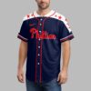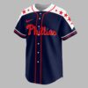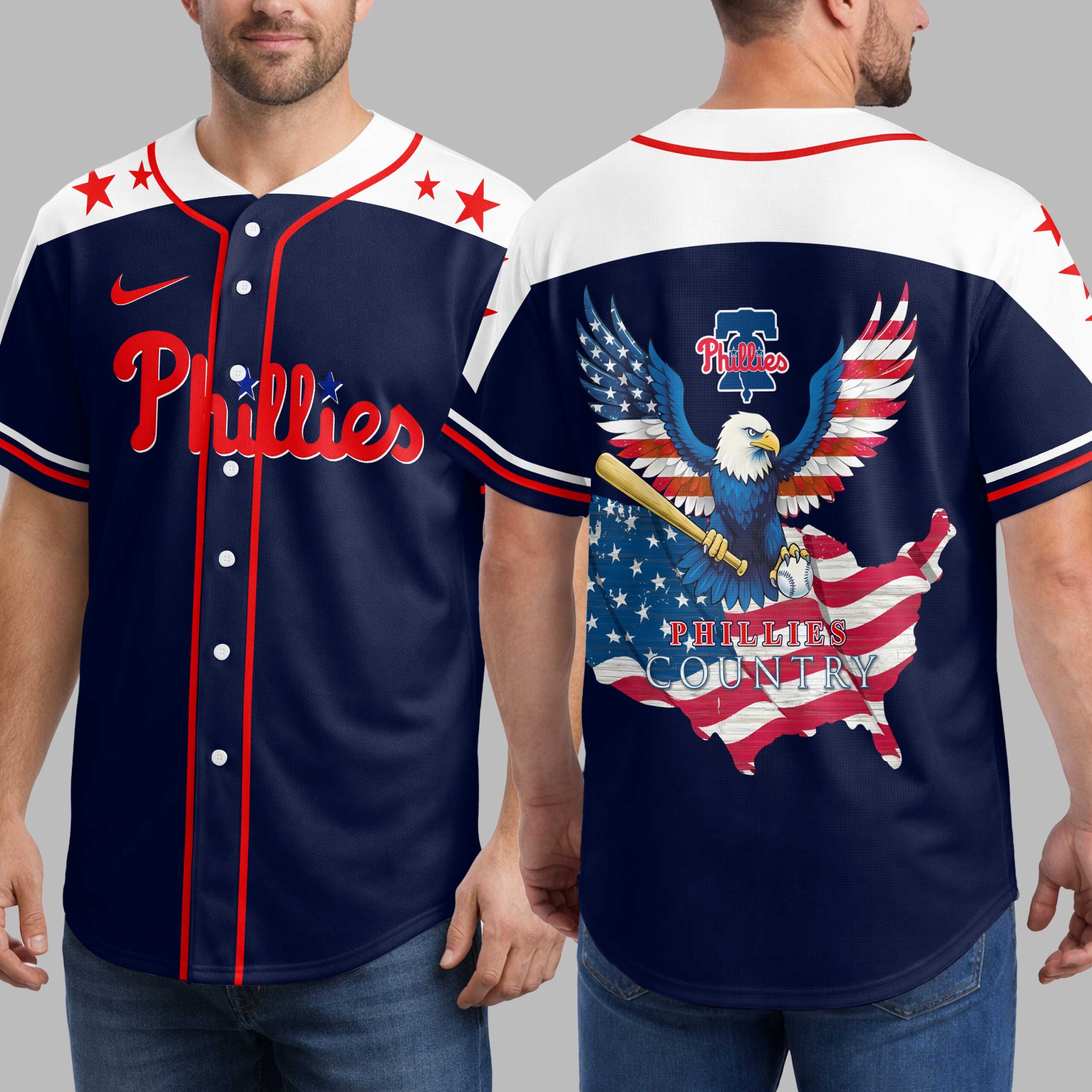 Unleash your ultimate fan spirit with this patriotic Phillies baseball jersey! This dynamic top perfectly captures your love for the Philadelphia Phillies, blending iconic team pride with a powerful display of American patriotism. It’s the ideal way to celebrate your favorite team and country in one bold statement. The front proudly features Phillies in classic red script against a deep navy blue, highlighted by crisp white shoulder panels adorned with vibrant red stars. The back truly makes an impact, showcasing a majestic bald eagle with wings spread, beautifully detailed with American flag patterns, clutching a baseball bat and ball. Below, a distressed flag-inspired map of the USA boldly declares Phillies Country, underscoring your deep roots. Whether you’re cheering from the stands, celebrating a national holiday, or gathering with friends for a tailgate, this jersey is designed for every proud Phillies fan. Wear it to game days, barbecues, or any occasion where you want to show off your passion for baseball and your patriotic heart.